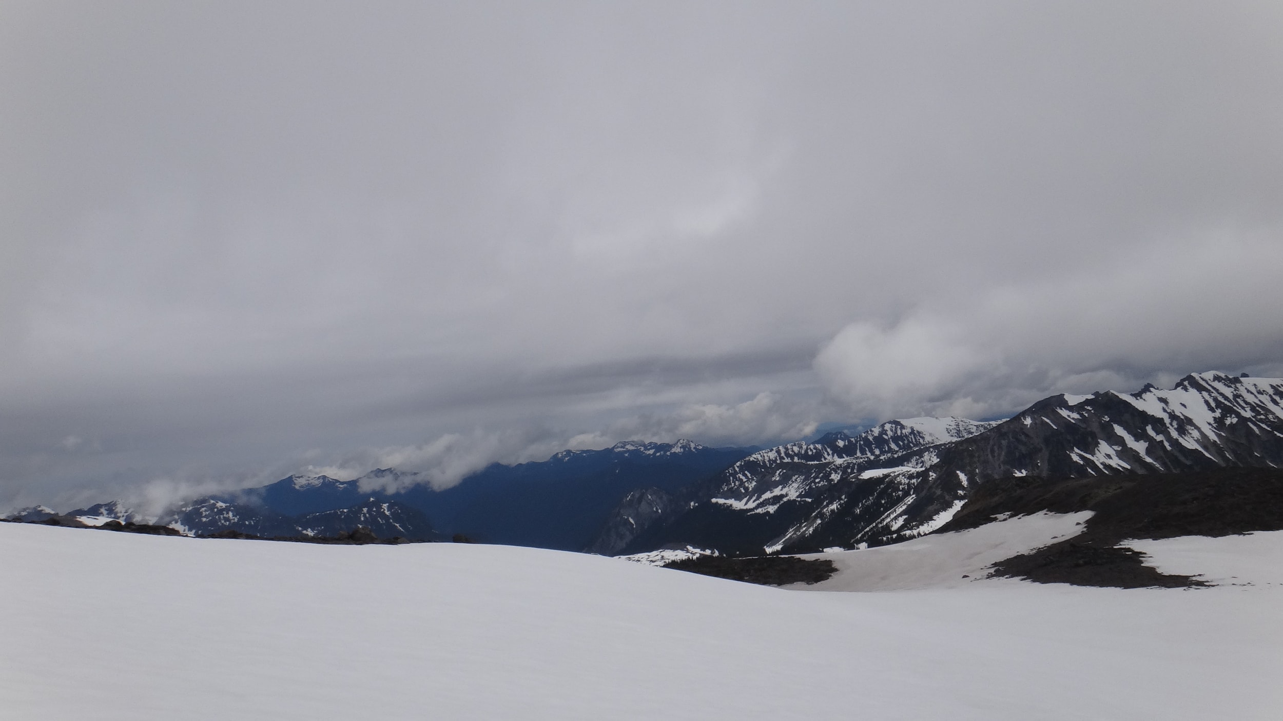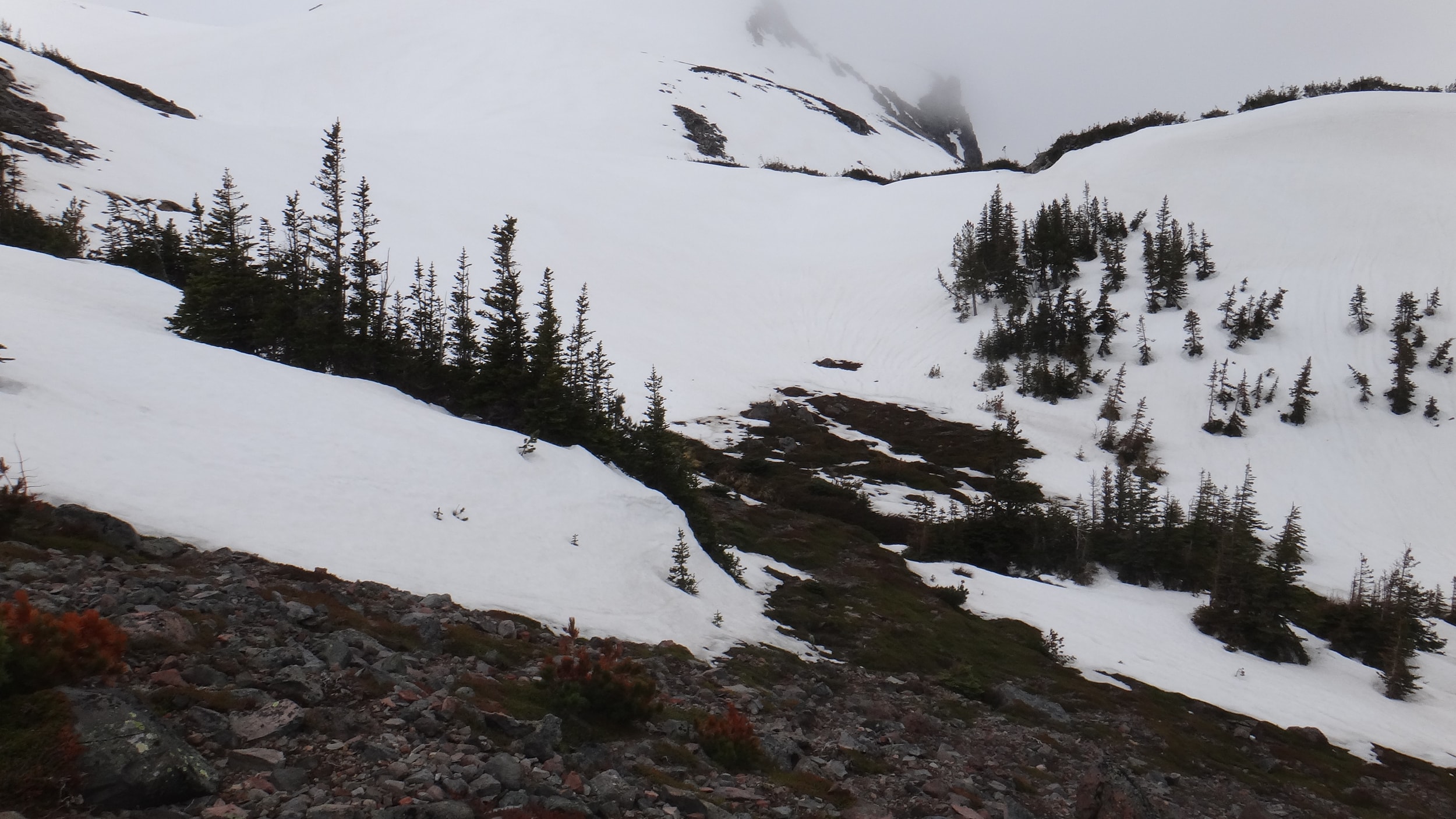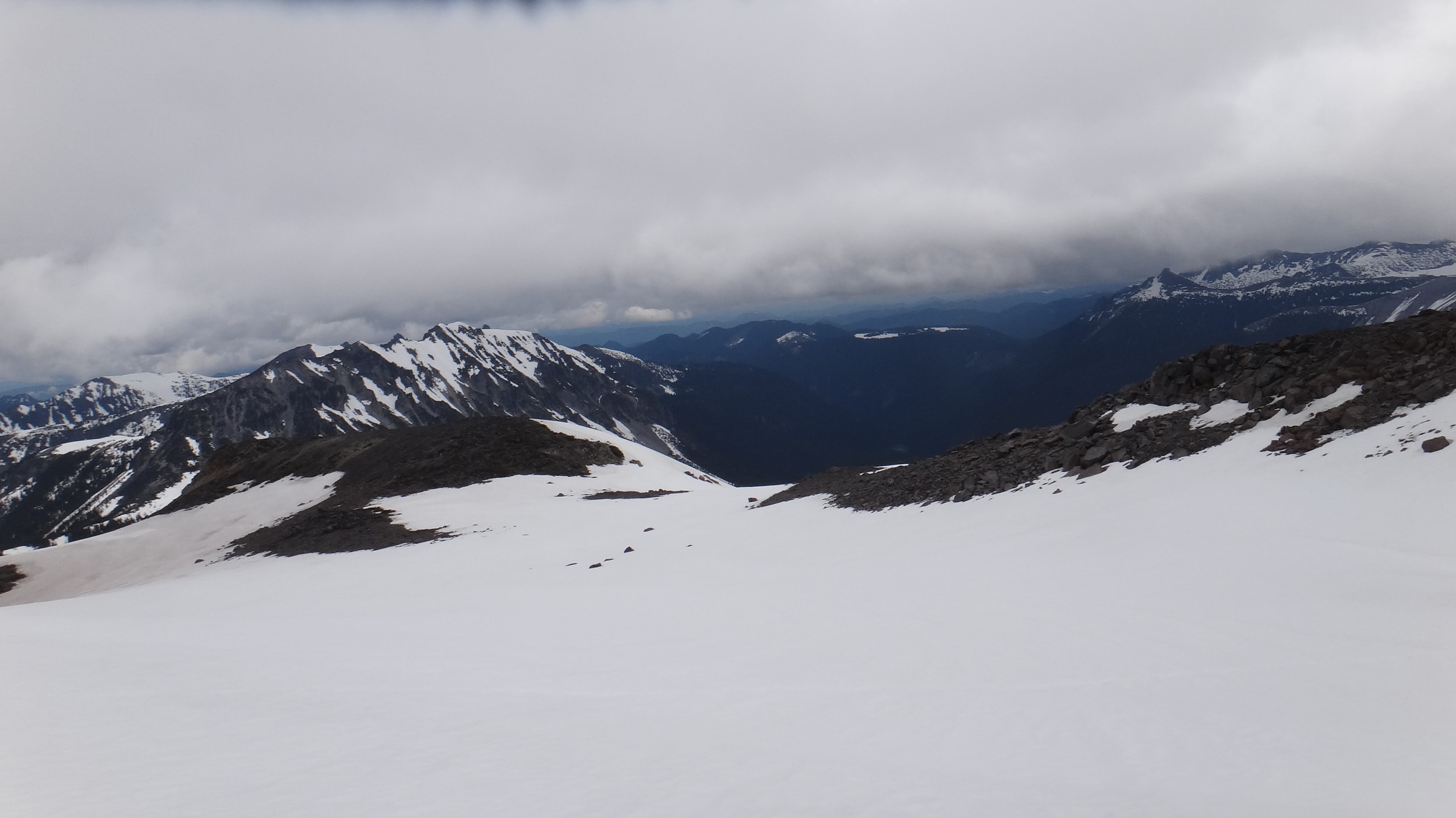 The trail proved to be extremely challenging to follow given the amount of snow still left on the trail. We did our best, but we weren’t able to find a way over the skyscraper ridge that separates Wintrop Glacier and the white river basin. This was easily passed via St Elmo pass on the way in, but that was probably 3k feet of elevation above us. This was demoralizing and we were exhaused, so we made camp for the night.