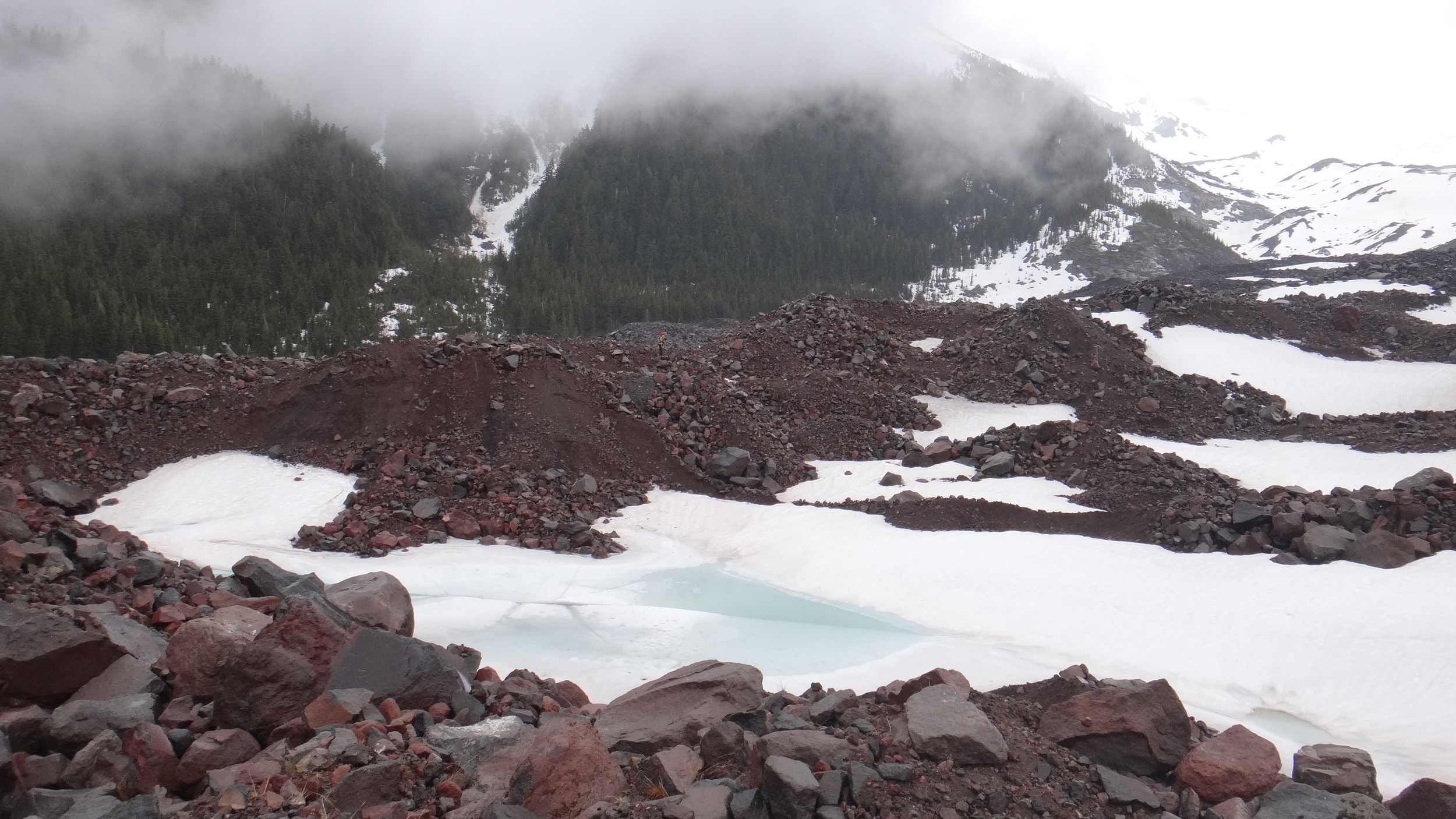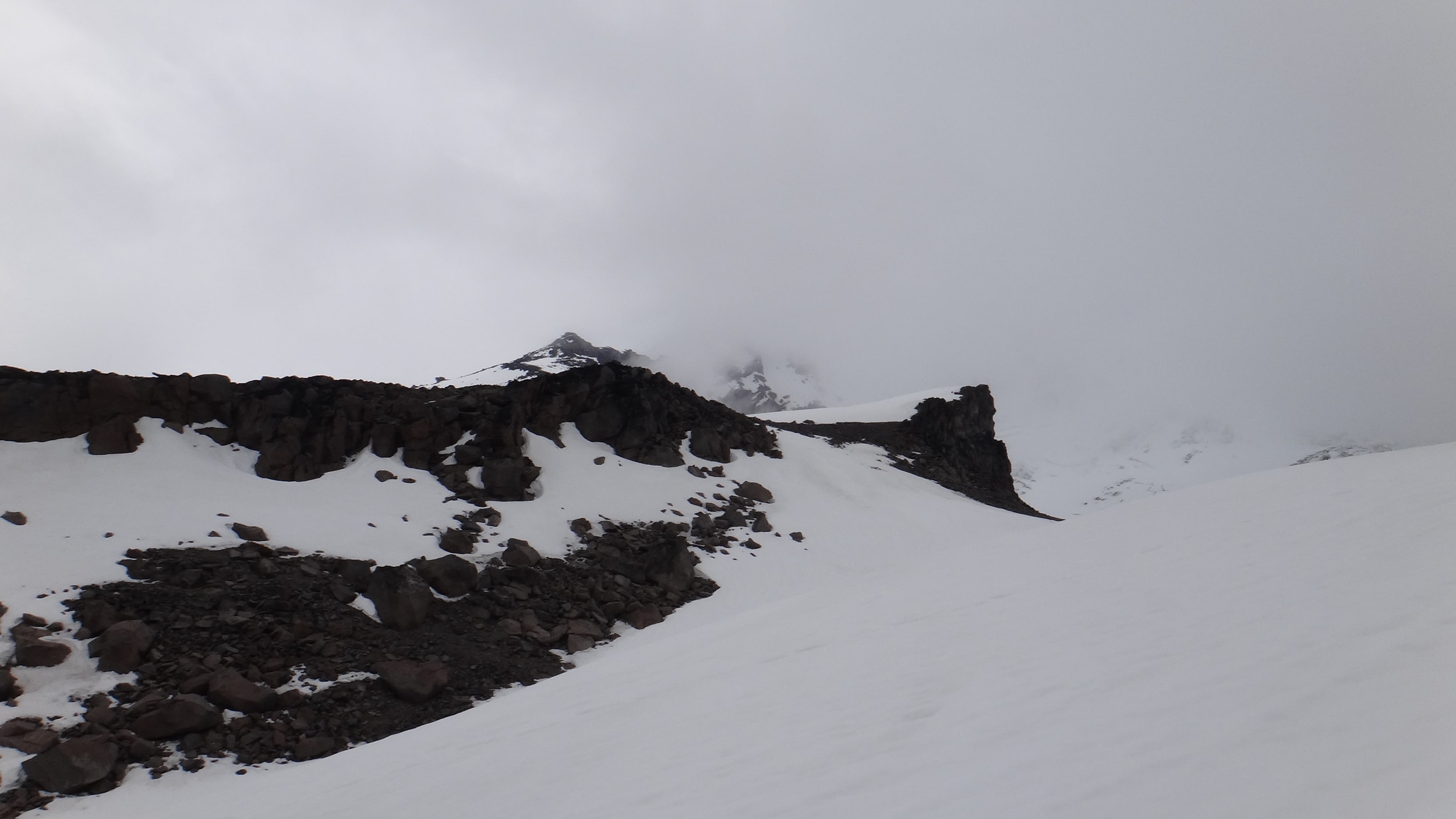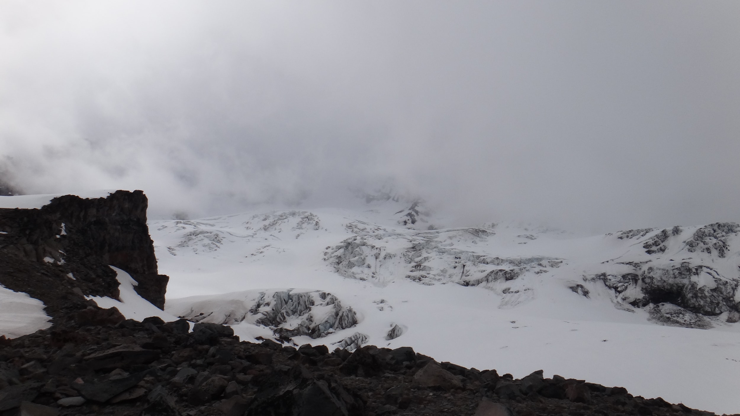 We packed up everything the next day and headed back to the Winthrop glacier to make the 3k feet ascent back to St Elmo pass. It was slow going, but as we gained elevation the rain turned into snow and that helped a bit.