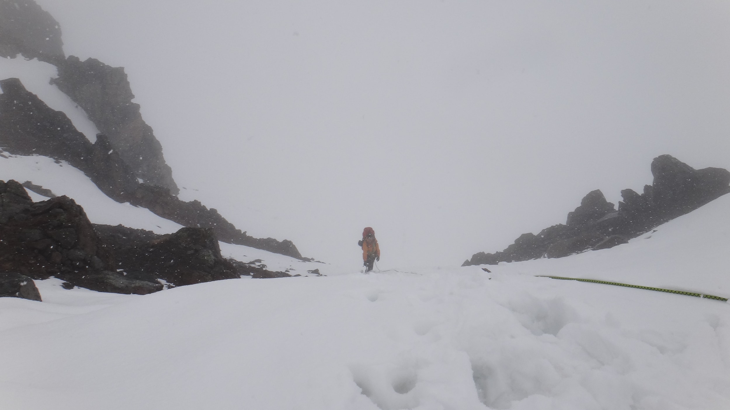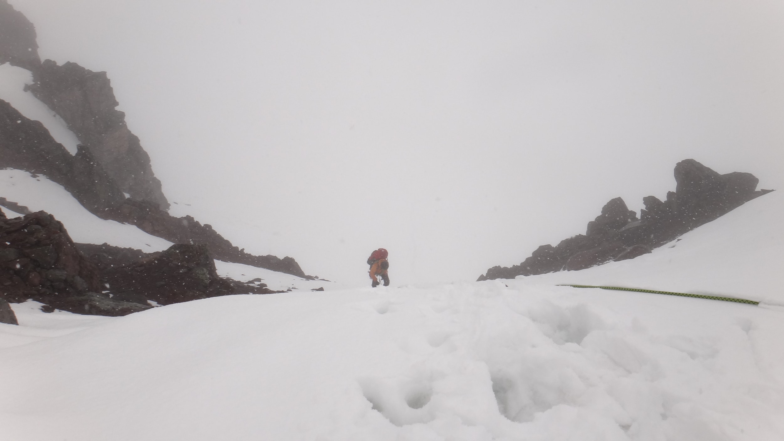 It was near white out by the time we made it back to St Elmo pass and we ascended. Kyle had made a makeshift brace for his knee out of a few pieces of webbing and a pole and Mark and I had taken most of his weight off in the hopes that we could get back in one piece.