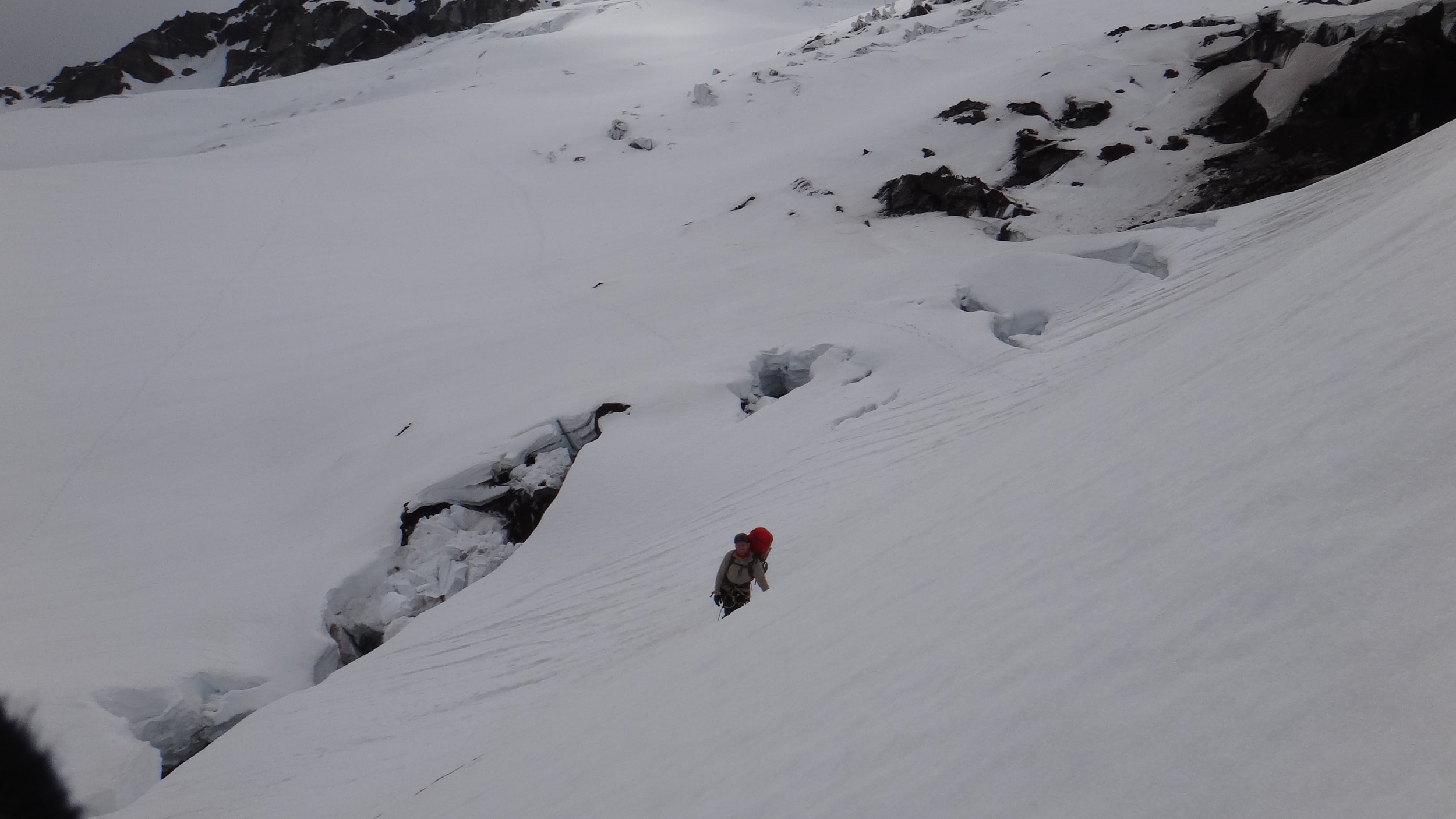 The rest of the day was spent traversing across 3 glaciers - the Winthrop Glacier, the Curtis Glacier, and the Carbon Glacier. This was another fail - as we were trying to maintain altitude rather that dropping down to cross from the Winthrop to the curtis glacier at a lower elevation. The Curtis ridge didn’t look particularly forbidding, but it is basically impassible at the higher elevations - so we had to do some backtracking to get across the ridge.