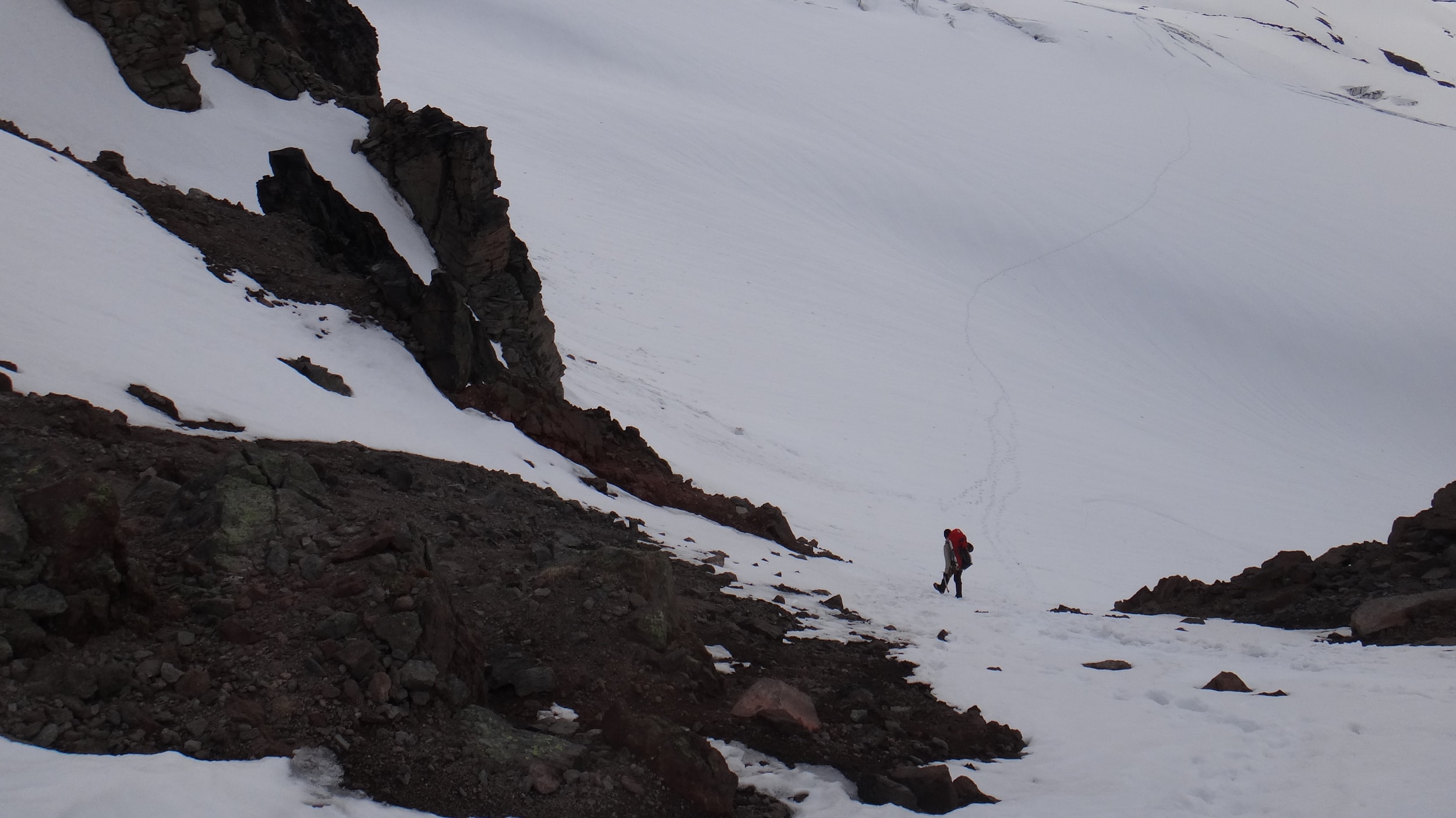 Unfortunately, there was no good way to escape from the climb at this point. We could go back across the glaciers the way we came or I had this idea of heading down and finding the Wonderland trail which would take us back to White River directly. We opted for the Wonderland trail route and dropped down off the glacier