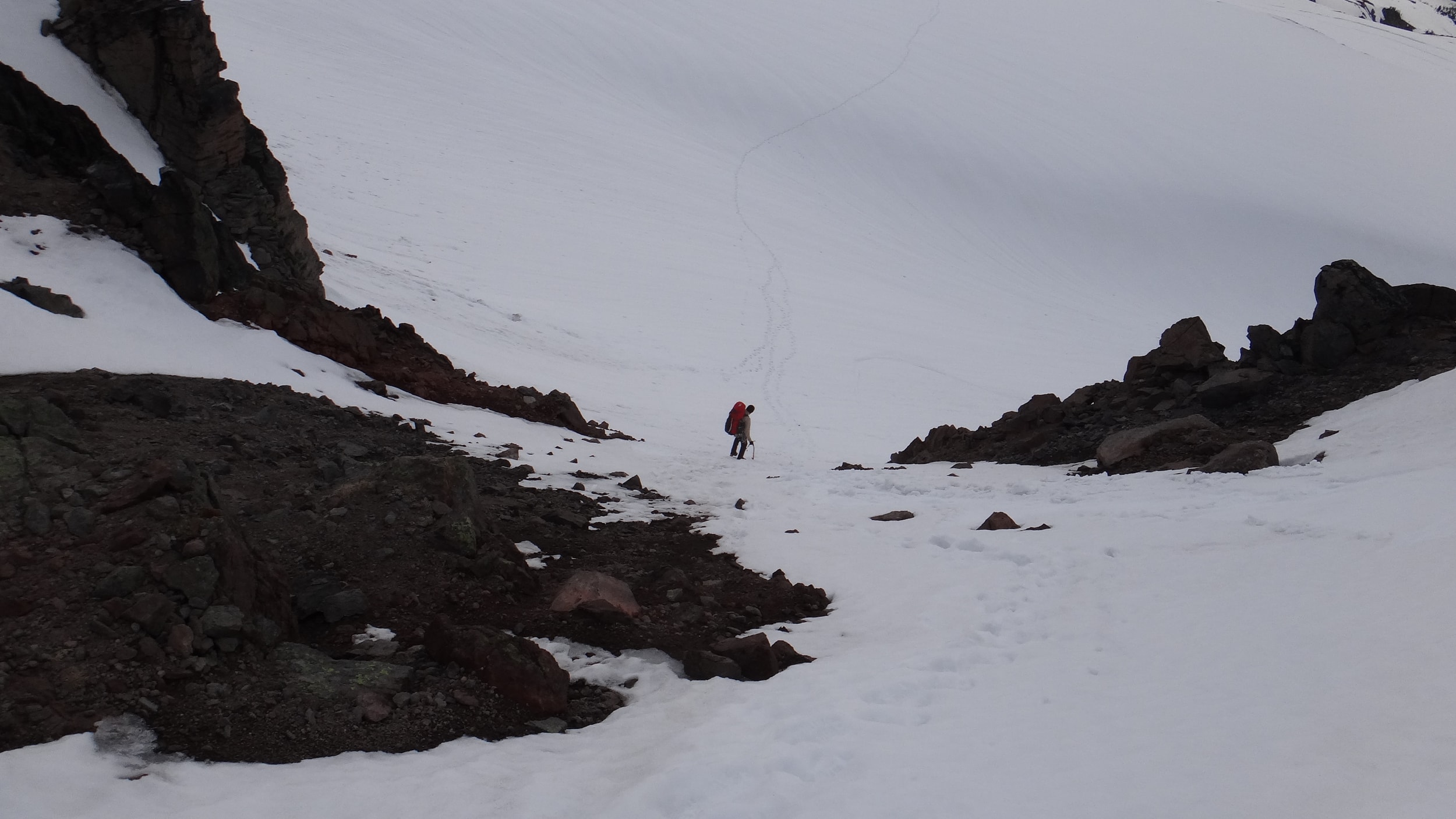 We got our glacier setup all worked out and we made our way down St Elmo pass. Despite our exhaustion, this part of the trip is amazing and you can really see how big/rough this mountain is. This got the adrenaline pumping and we started to feel a lot better.