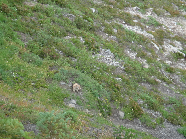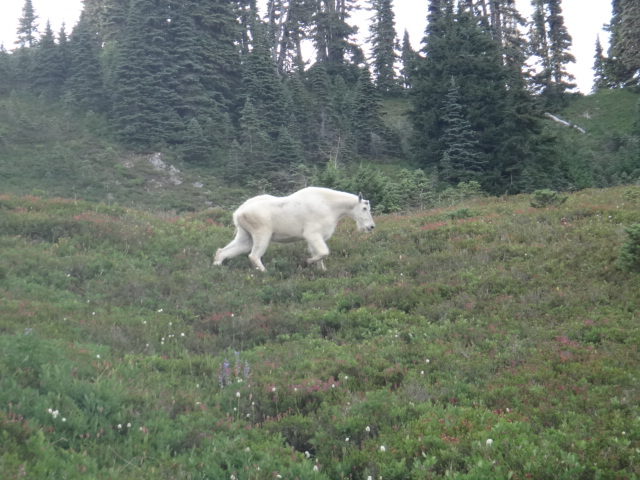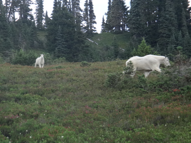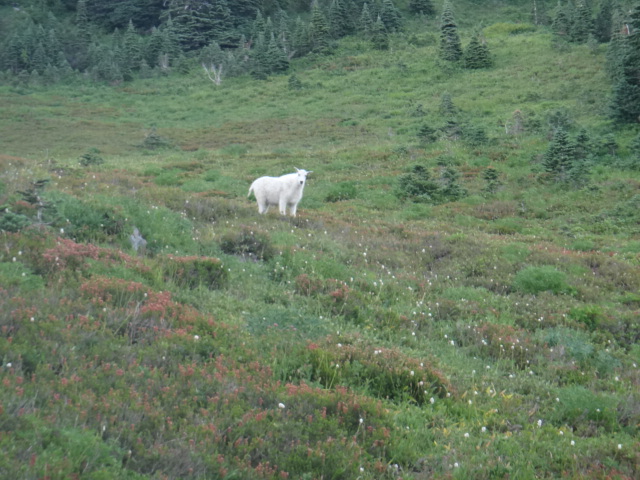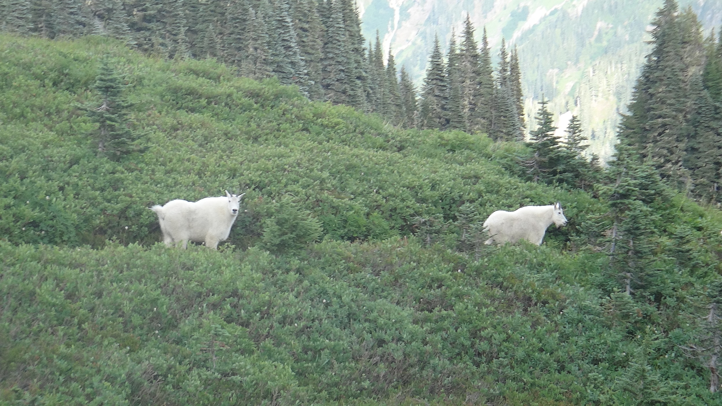 And right before we made the drop down into Cat Basin, a small family of mountain goats passed by. I had been told these were pretty agressive - they are not native to the area and there isn’t enough salt here for them - but they weren’t particularly agressive with me. I banged my hiking stick on a rock and they kept their distance. I basically followed them down into Cat Basin - unfortunately, I had decided to take my bag down to the camp first and come back to help Angela - so she missed them…