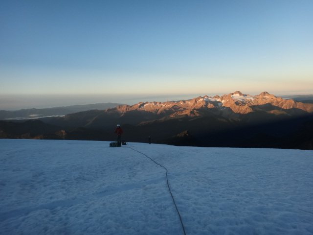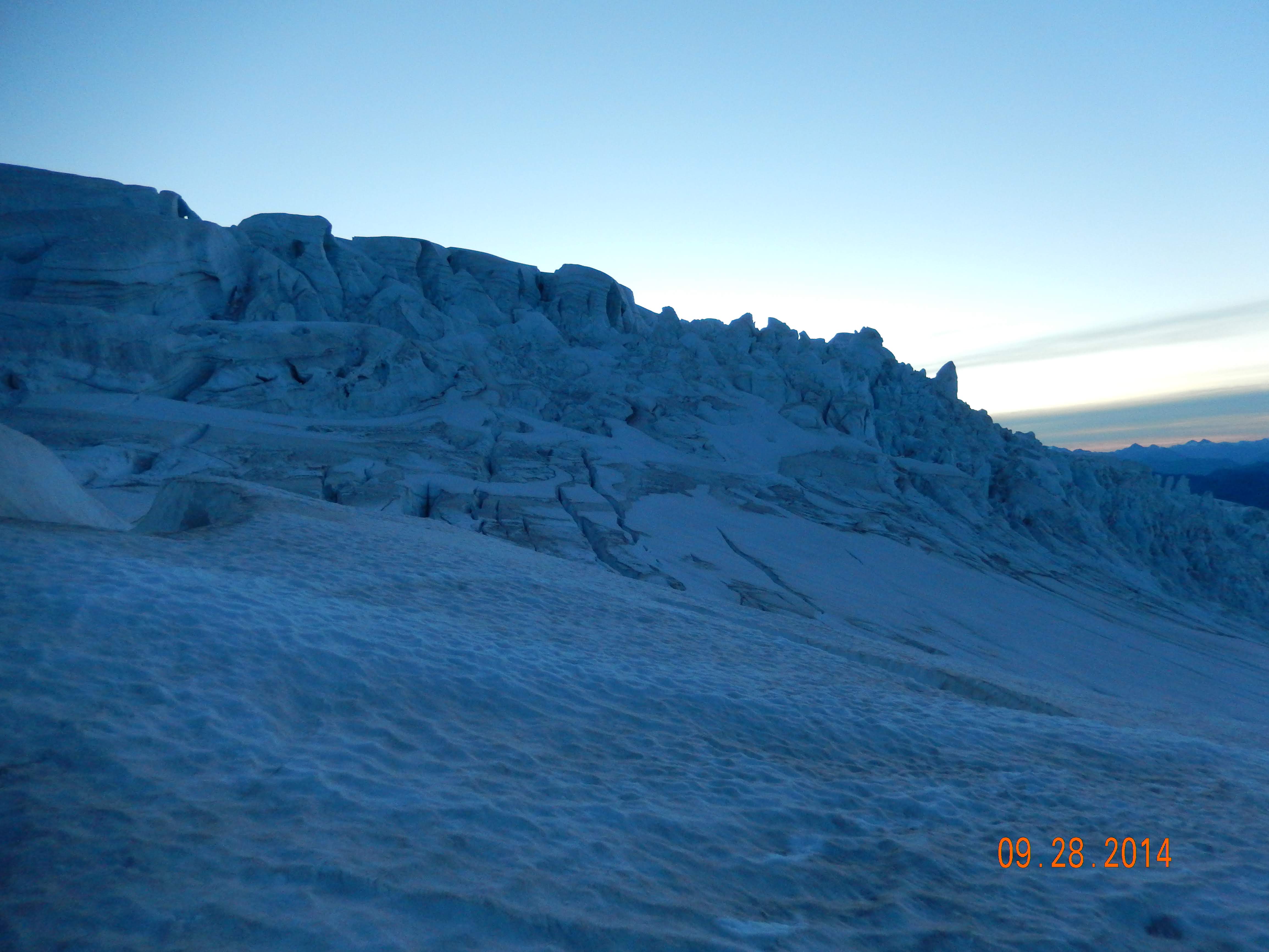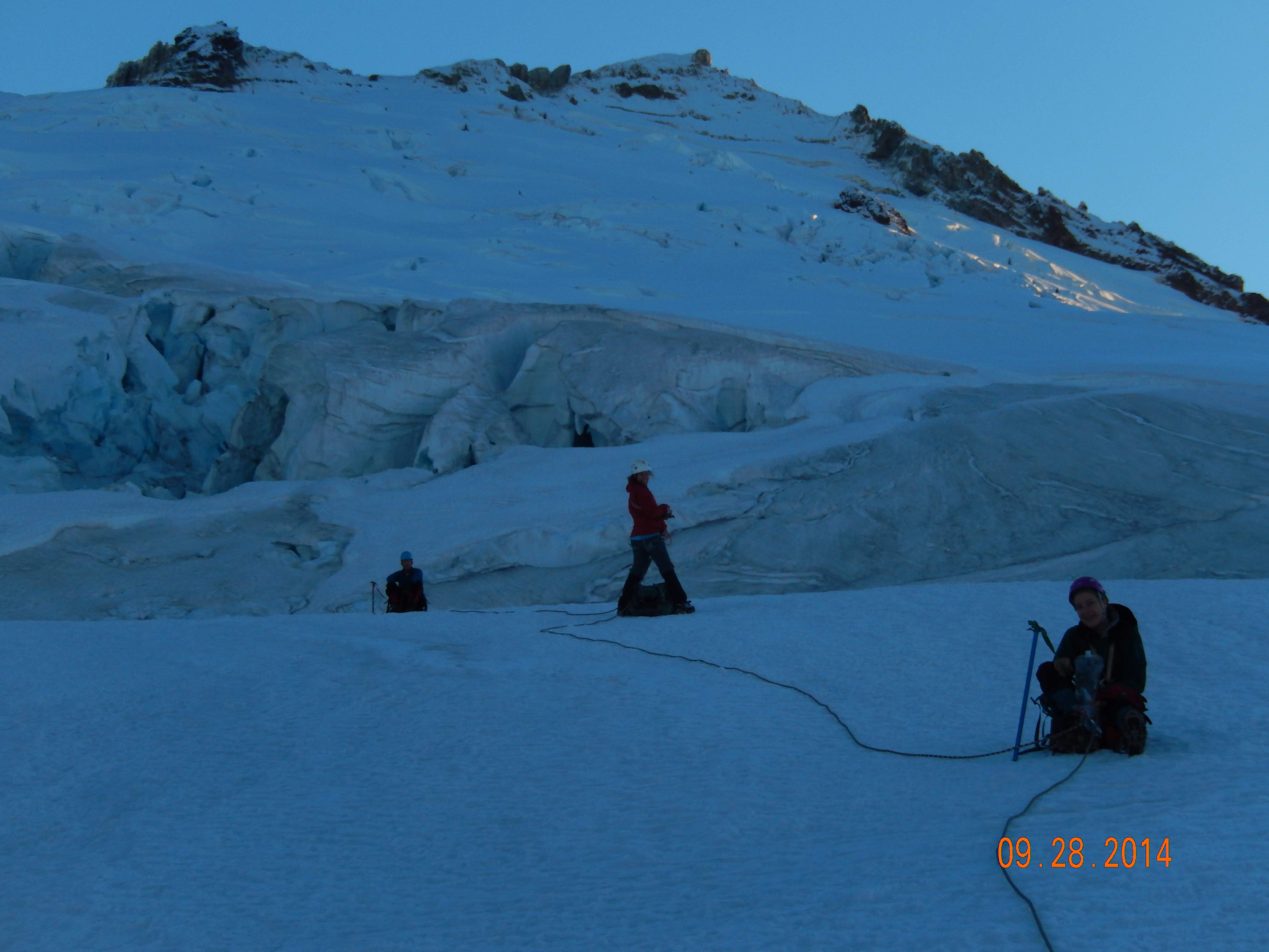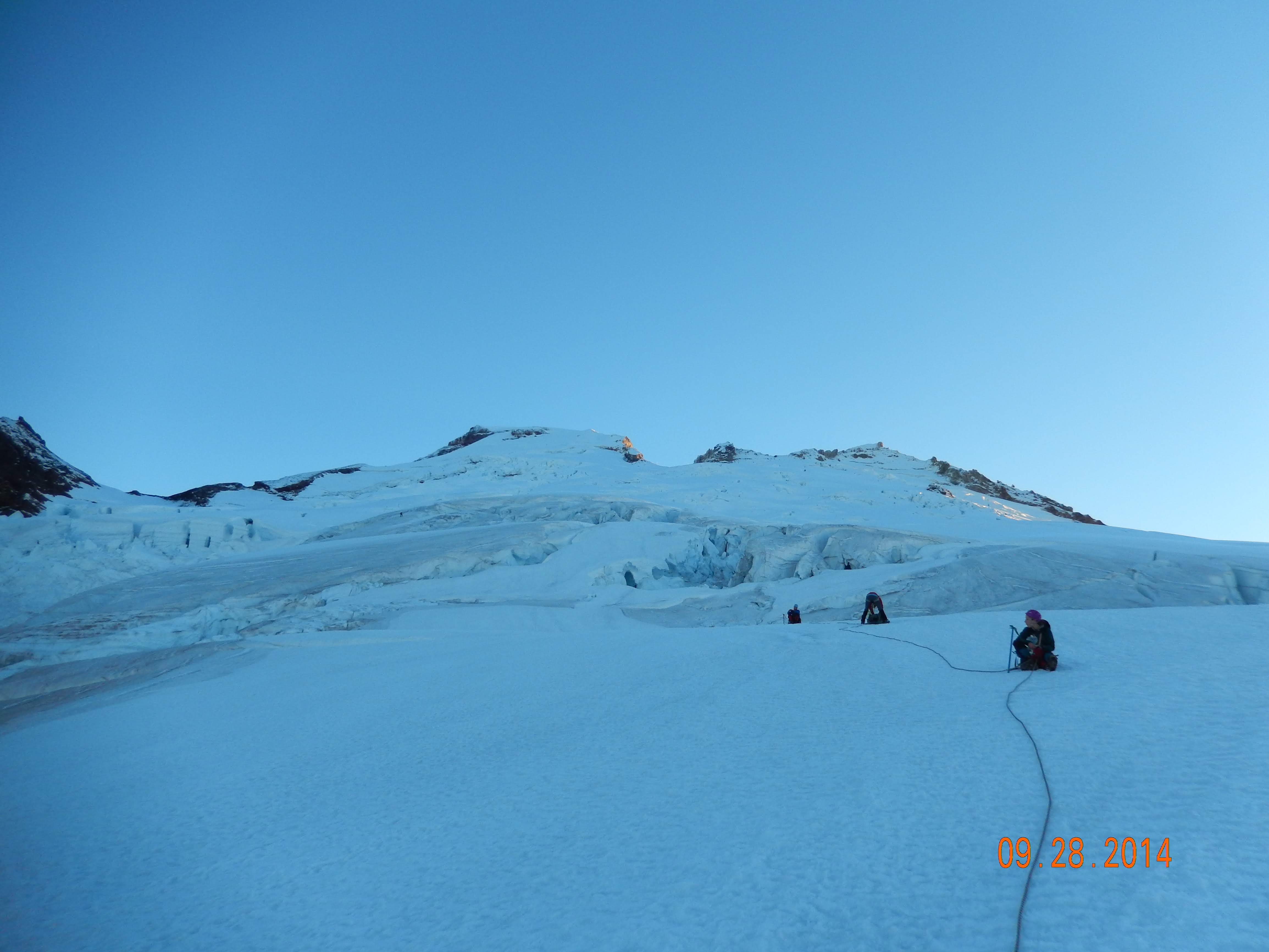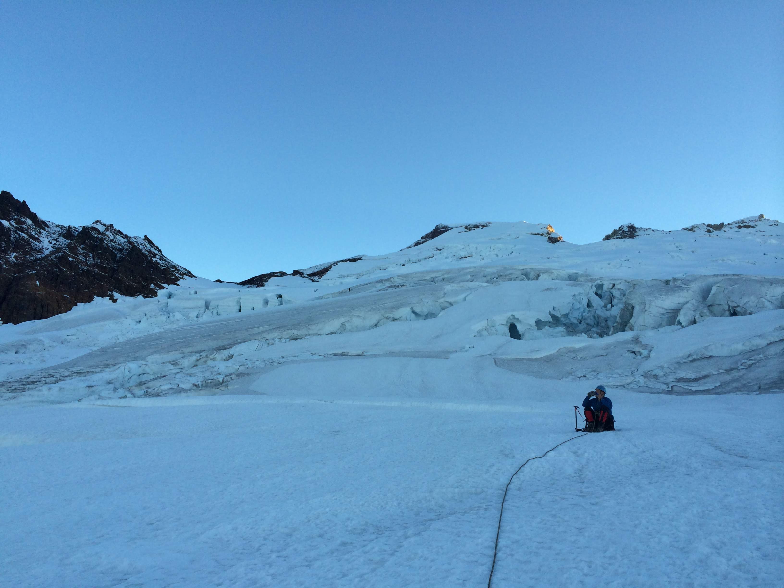 We stumbled out of camp at like 3a and made our way to the glacier. We go to the glacier right around sunrise and got ourselves put together. This is where things got interesting. We had just gotten all of our gear put together and were about to start, when a random guy just walked past us. He gave us a good morning and how do you do, and then just started walking up the glacier by himself. We all did a doubletake and questioned our sanity - did we just see a ghost or a halucination?