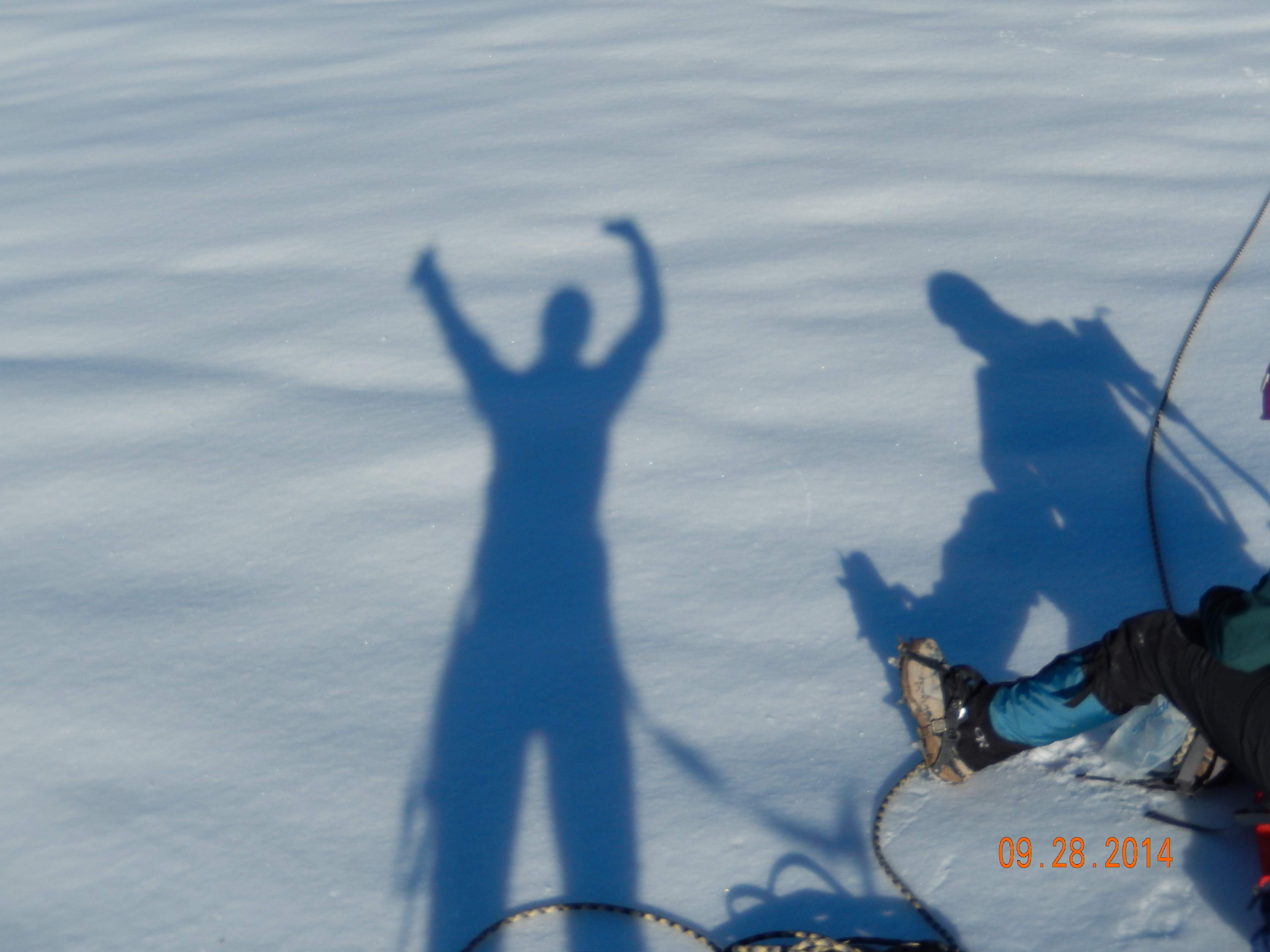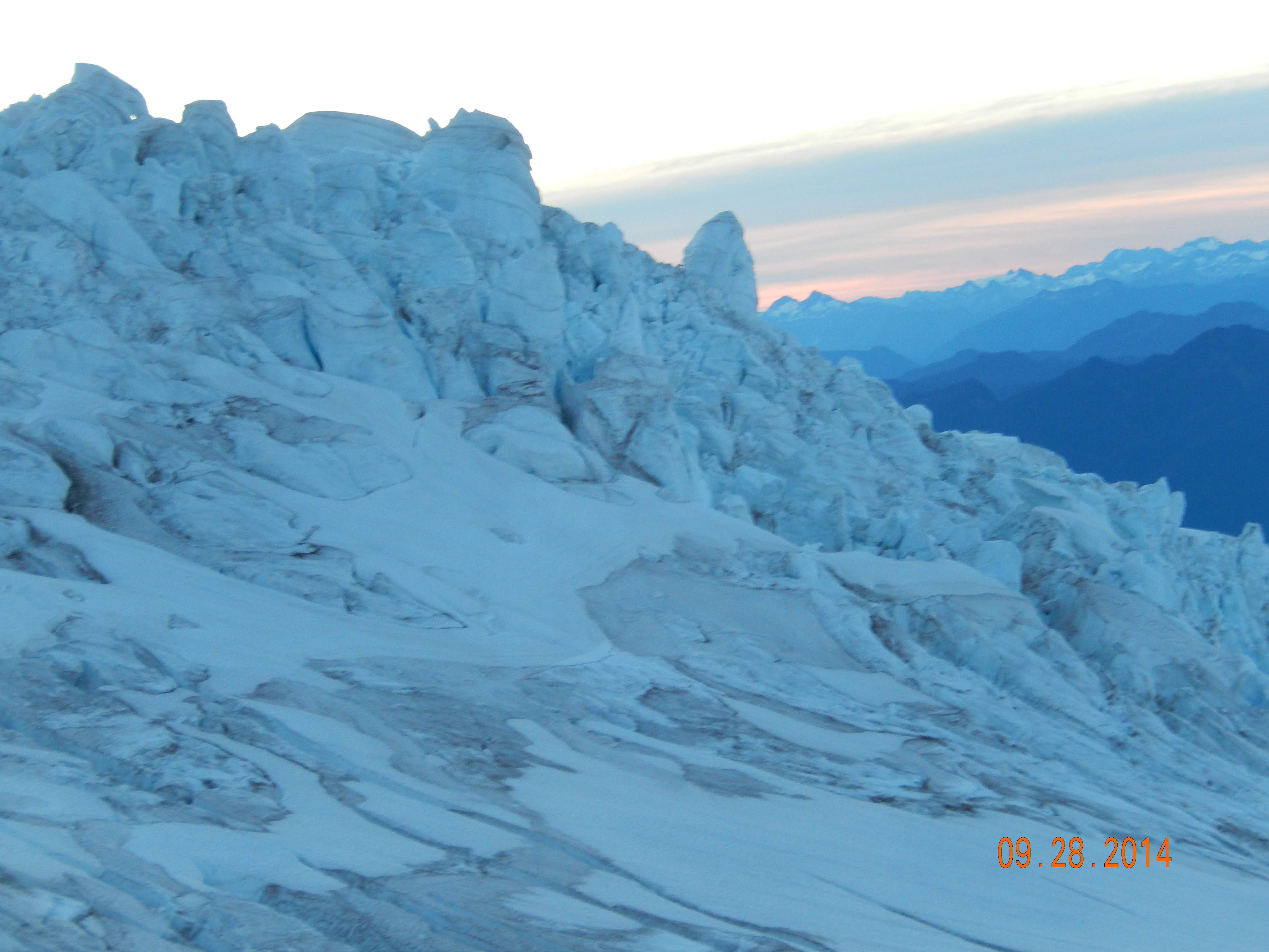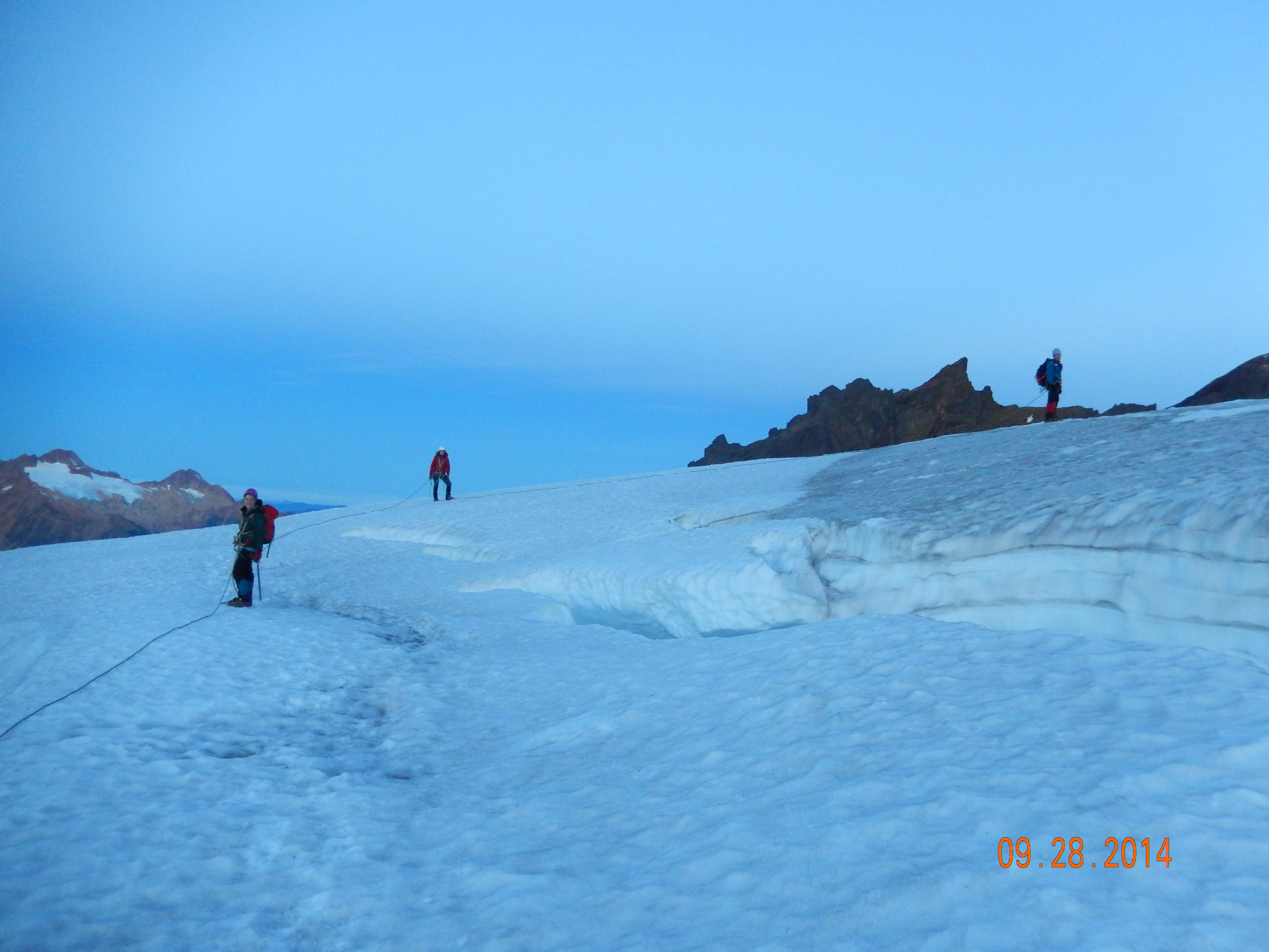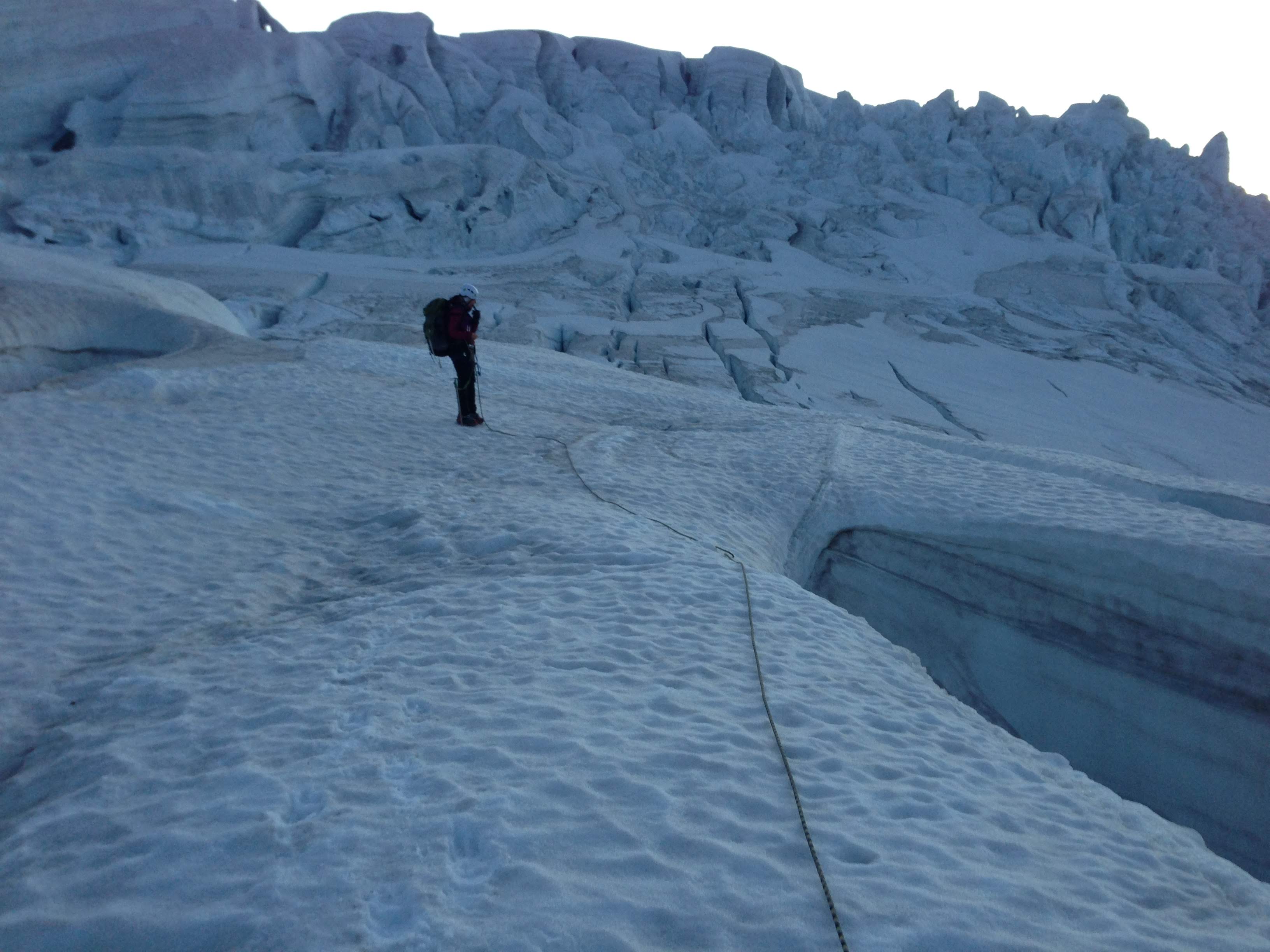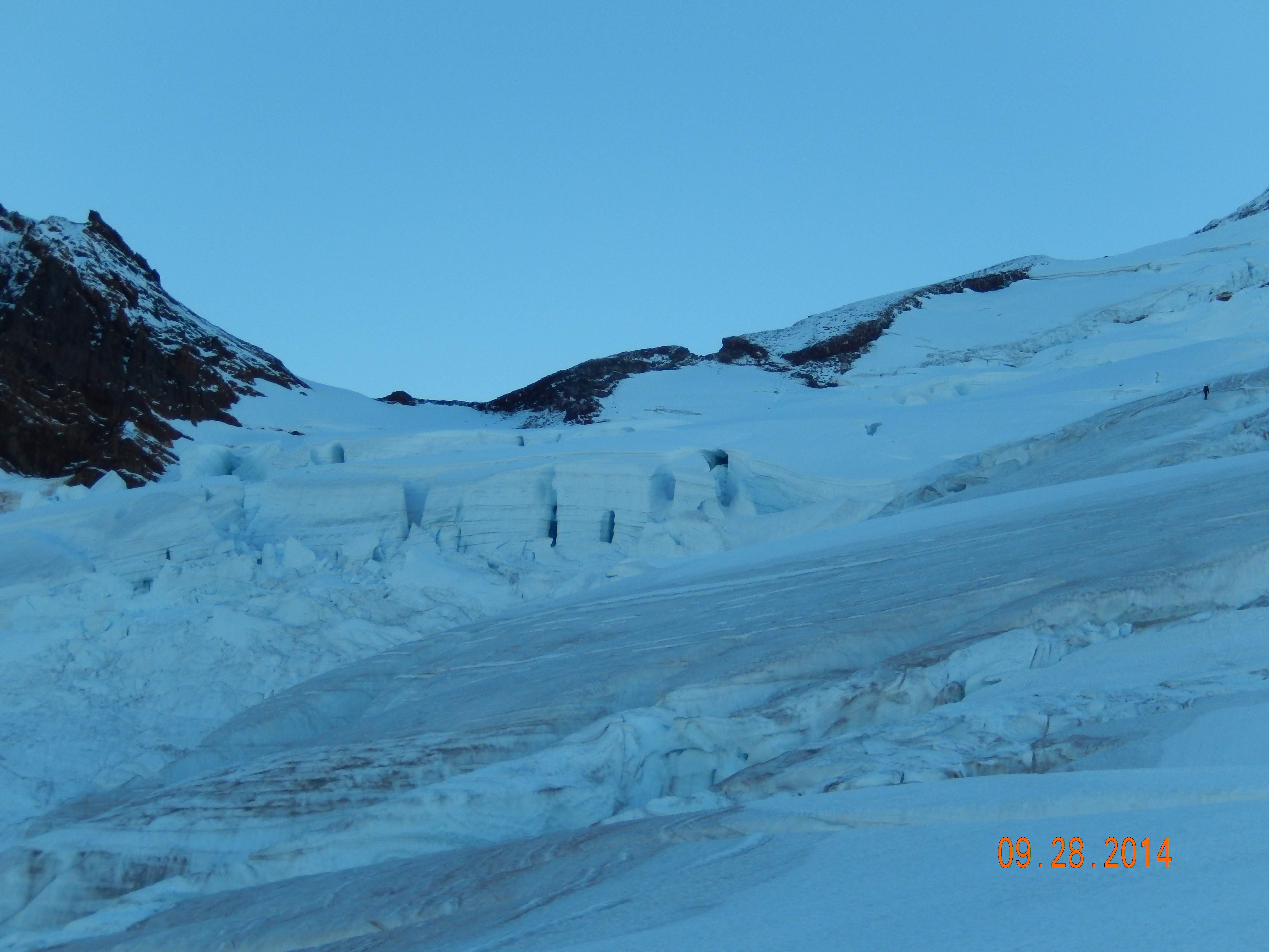 We stumbled out of camp at like 3a and made our way to the glacier. We go to the glacier right around sunrise and got ourselves put together. This is where things got interesting. We had just gotten all of our gear put together and were about to start, when a random guy just walked past us. He gave us a good morning and how do you do, and then just started walking up the glacier by himself. We all did a doubletake and questioned our sanity - did we just see a ghost or a halucination?