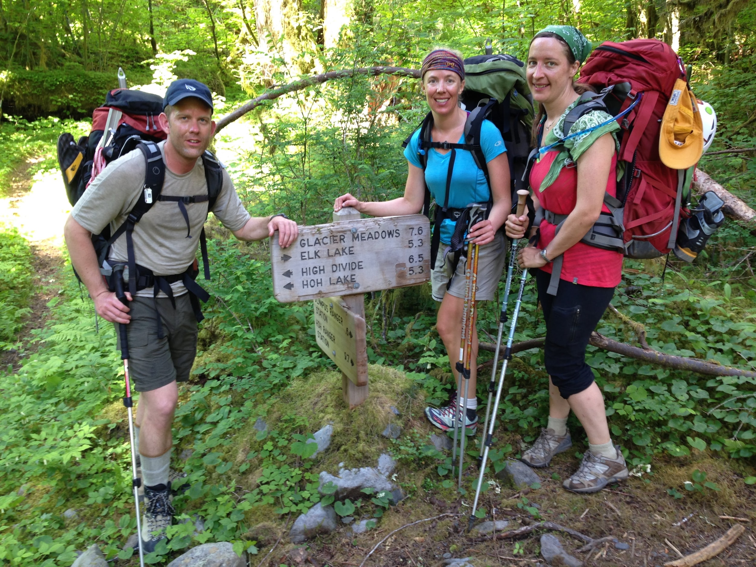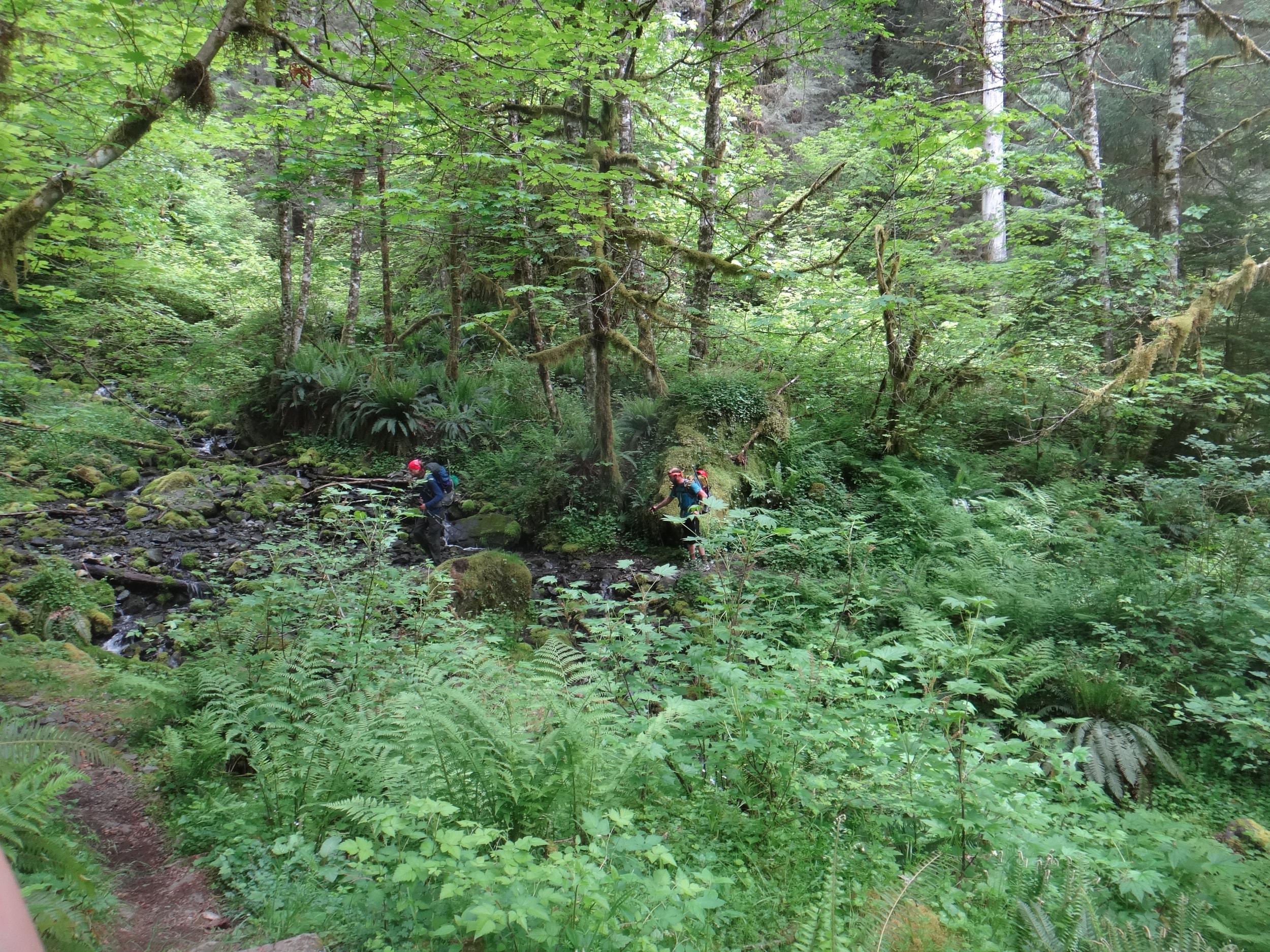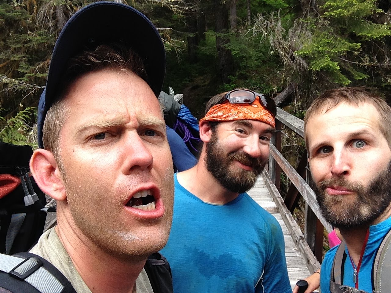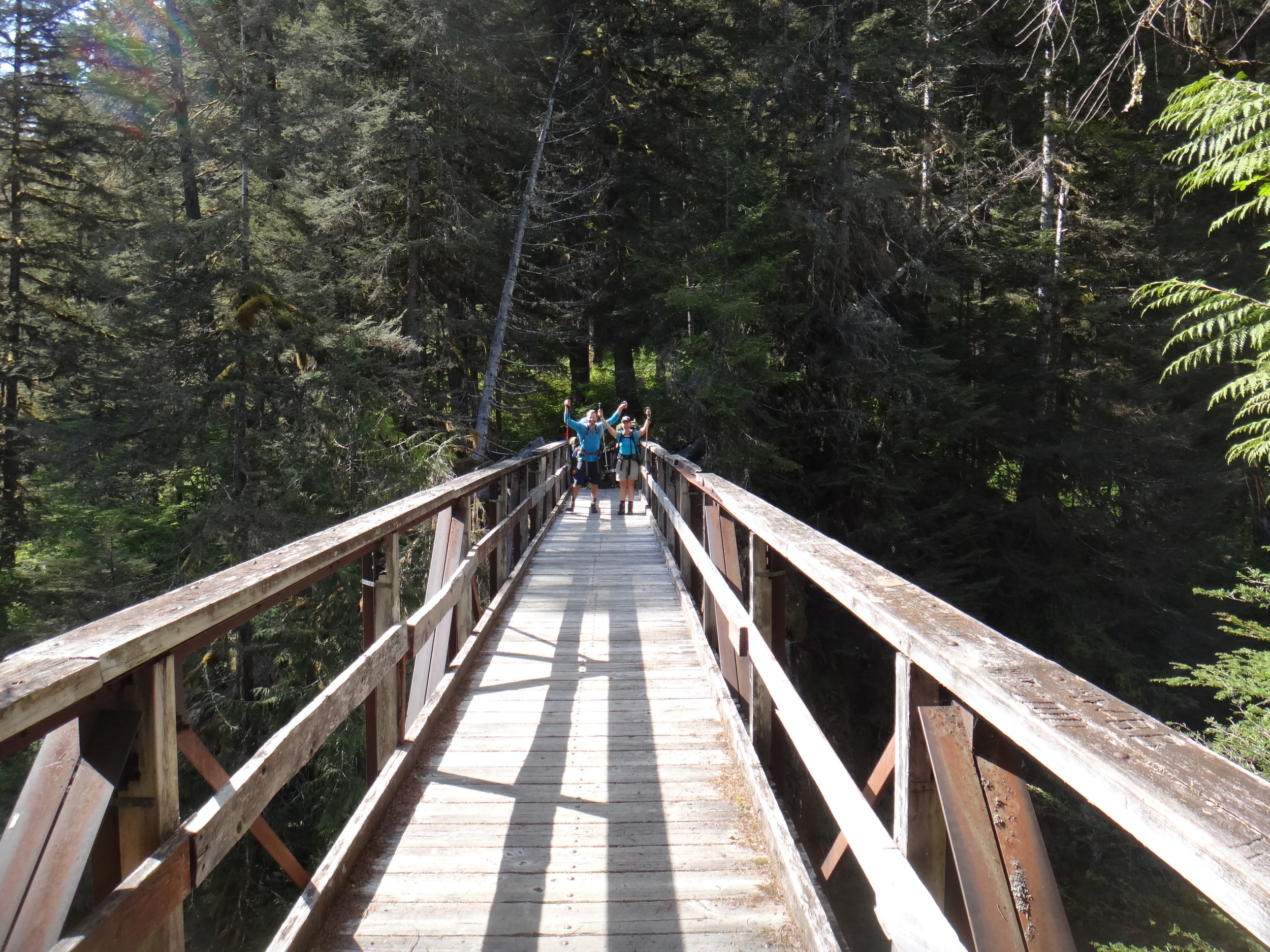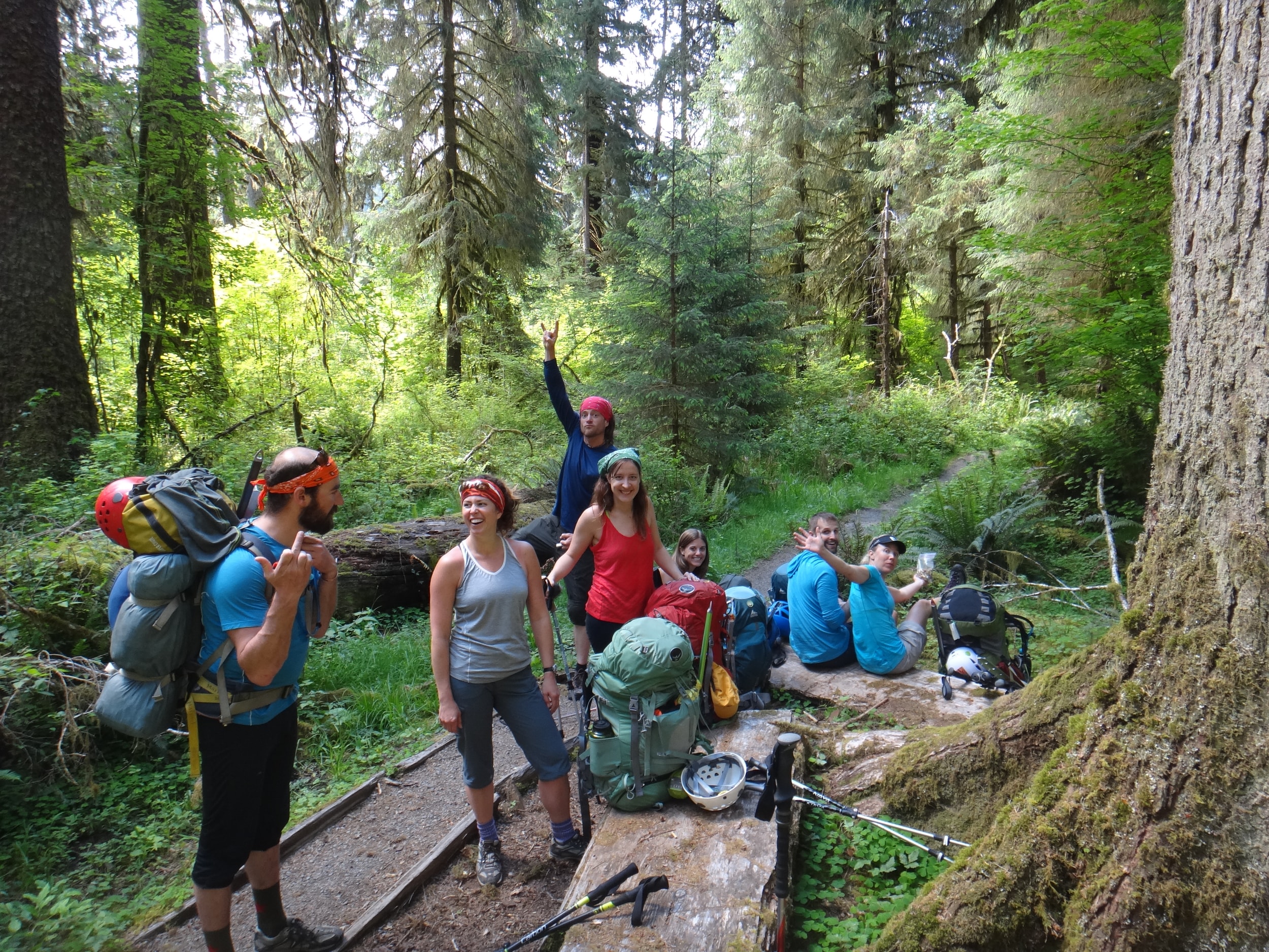 Then we started the very long approach - 18 miles from the parking lot to the campsite just past glacier meadows. We had a good time with it, but this was a long trip… The first 10 miles was in solid rainforest surrounded by some dense growth. I love this type of hiking but not all of us did. We saw some wildlife along the way - a small family of deer around mile 5 - and there were some interesting bridges/waterfalls along the way that we all really enjoyed.