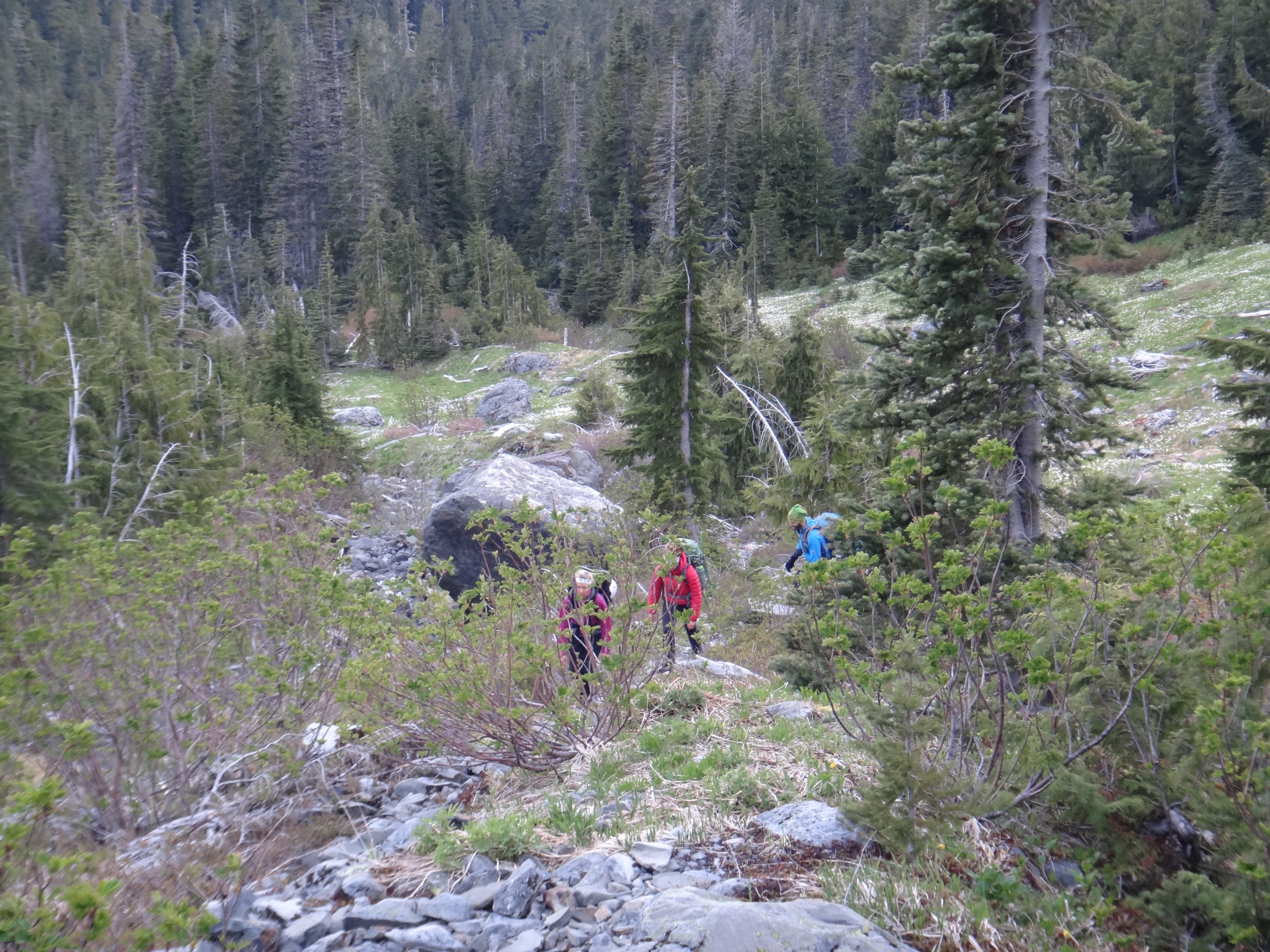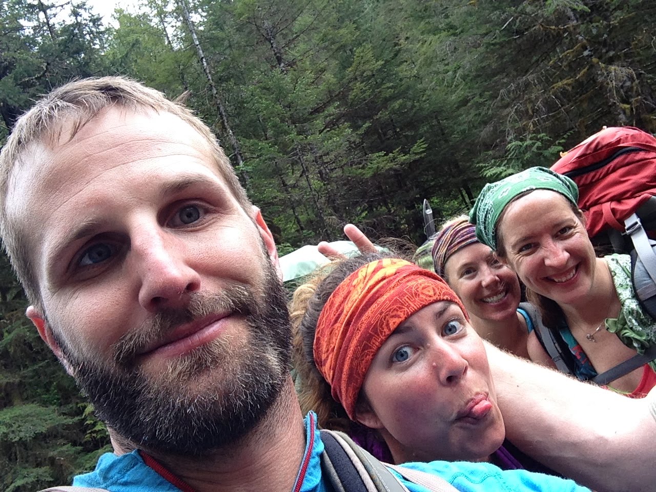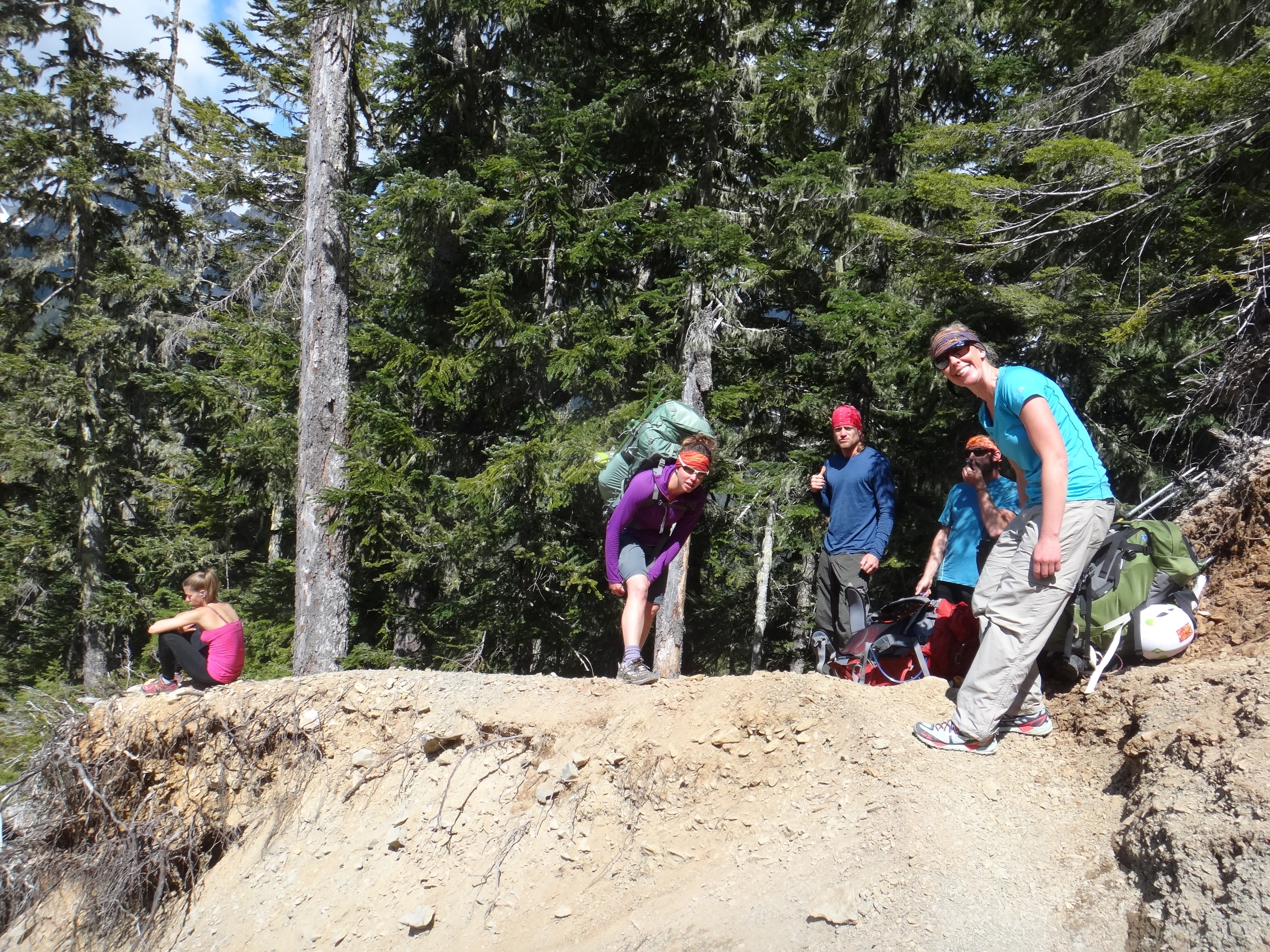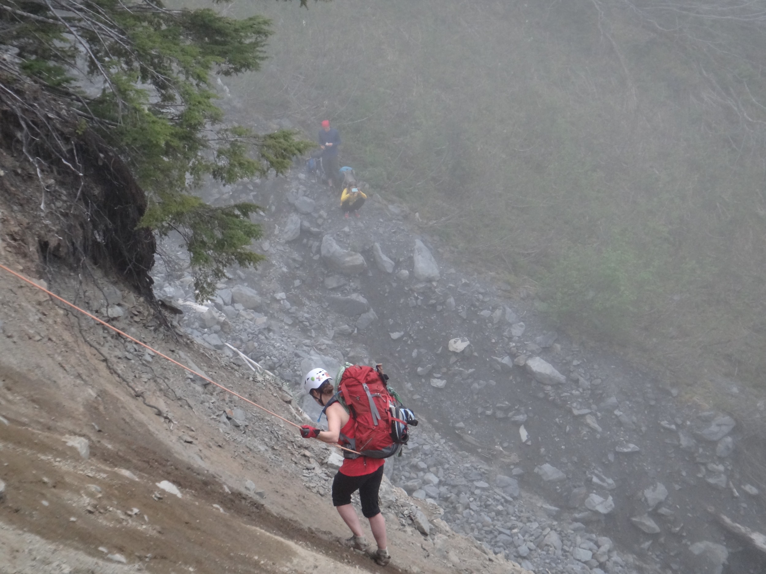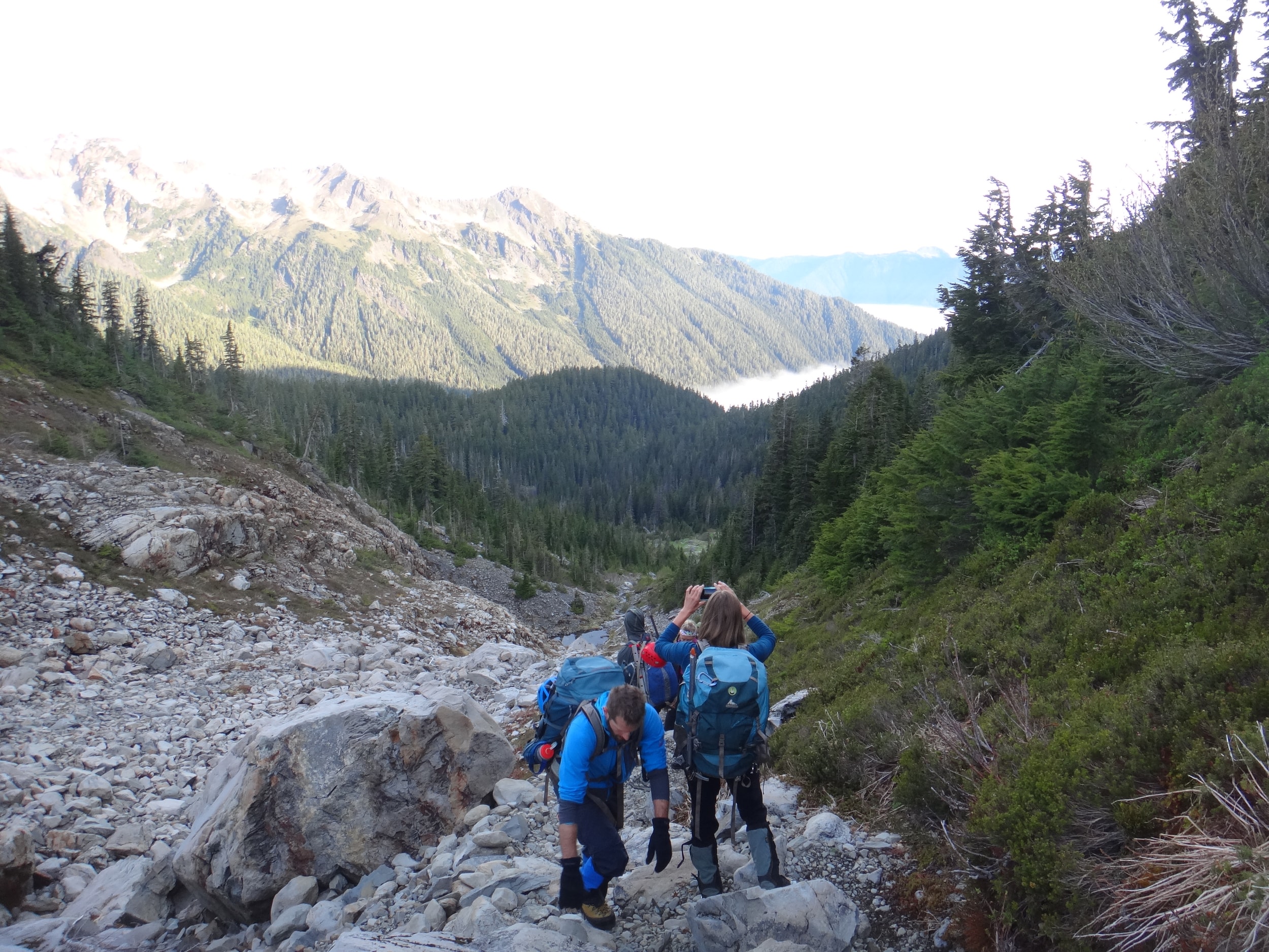Then we started the very long approach - 18 miles from the parking lot to the campsite just past glacier meadows. We had a good time with it, but this was a long trip… The first 10 miles was in solid rainforest surrounded by some dense growth. I love this type of hiking but not all of us did. We saw some wildlife along the way - a small family of deer around mile 5 - and there were some interesting bridges/waterfalls along the way that we all really enjoyed.