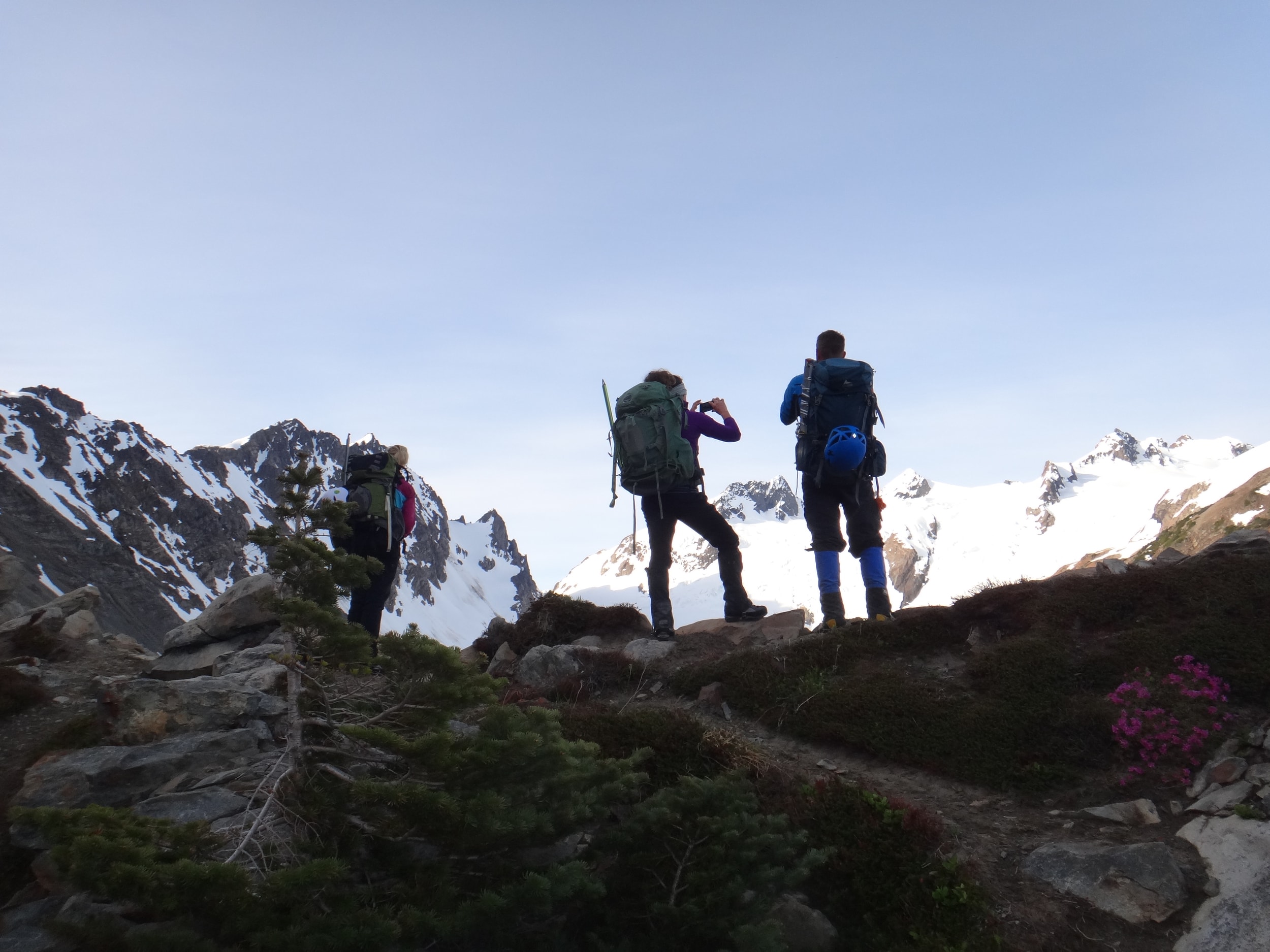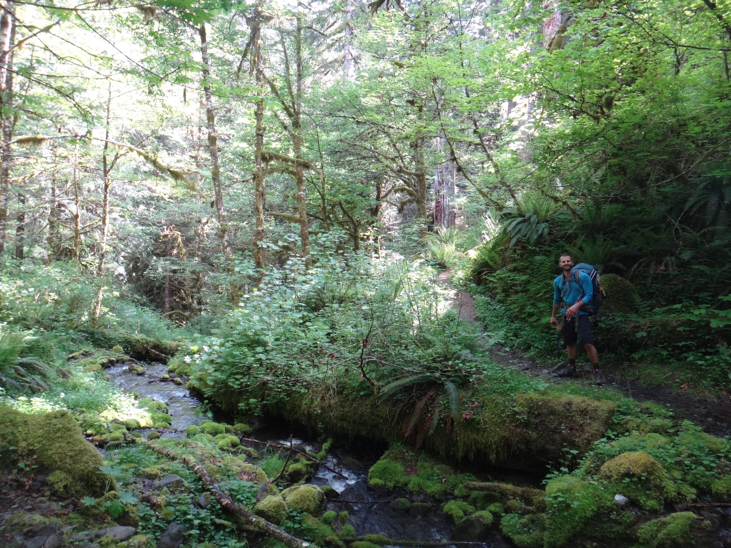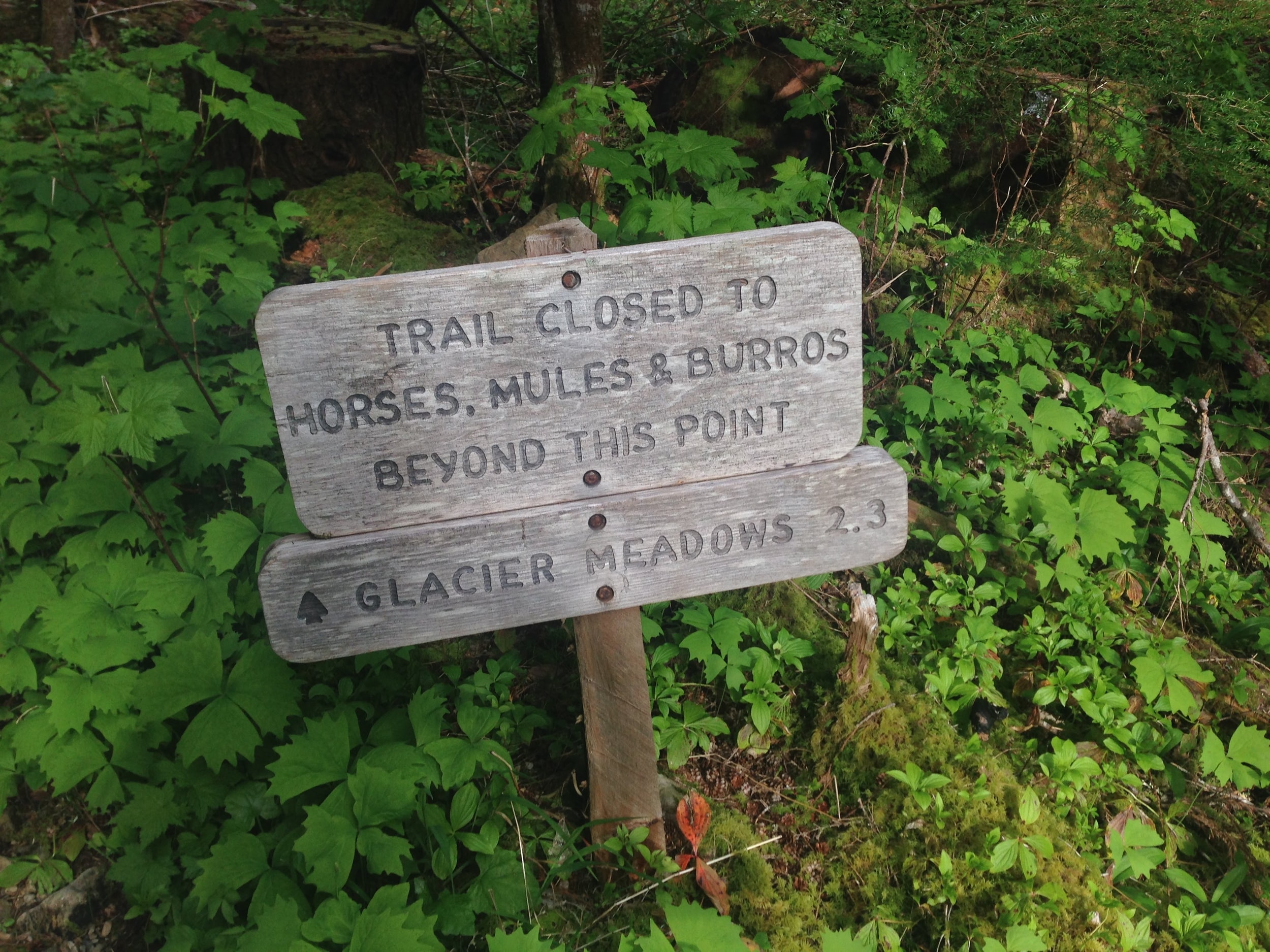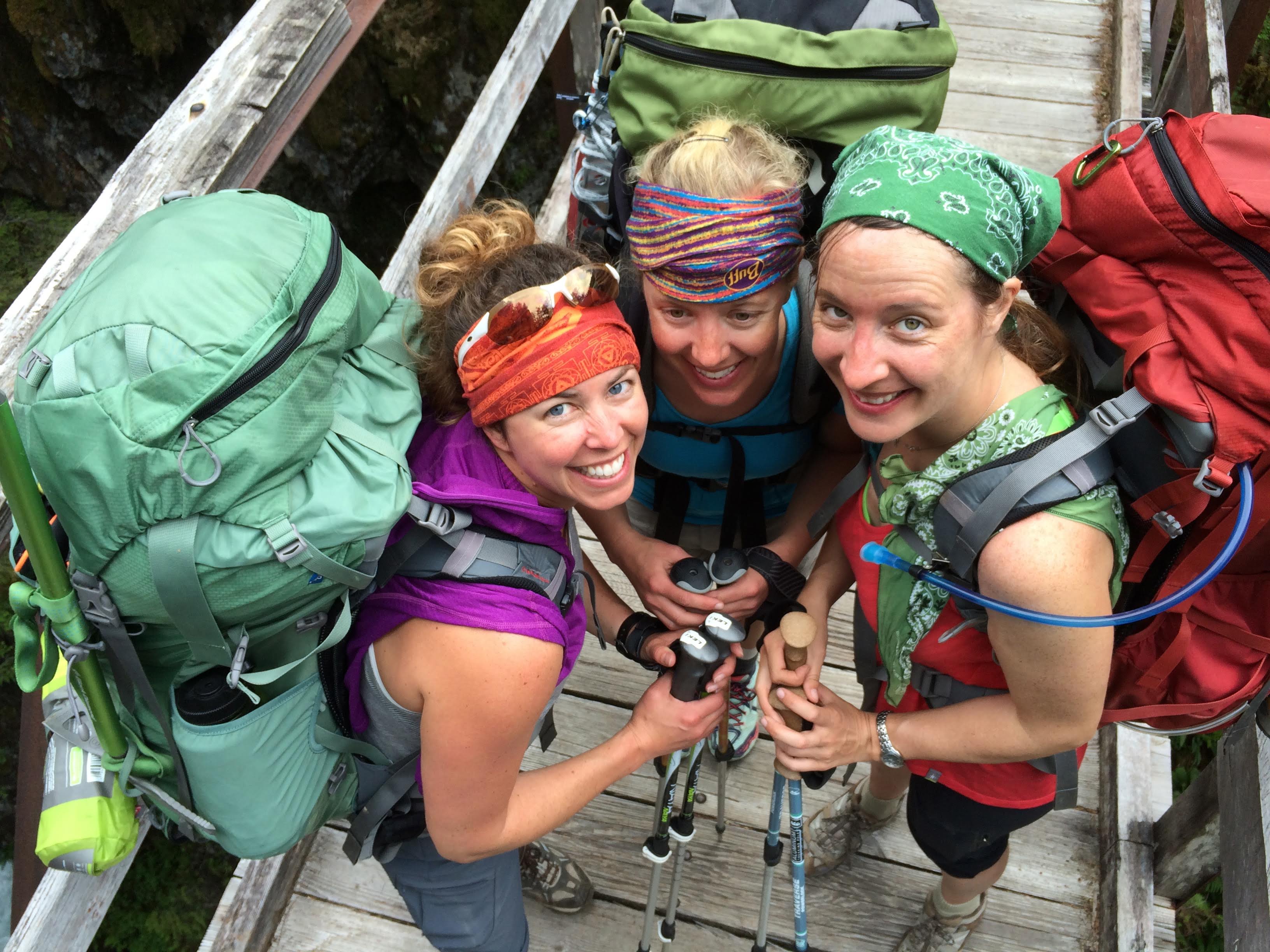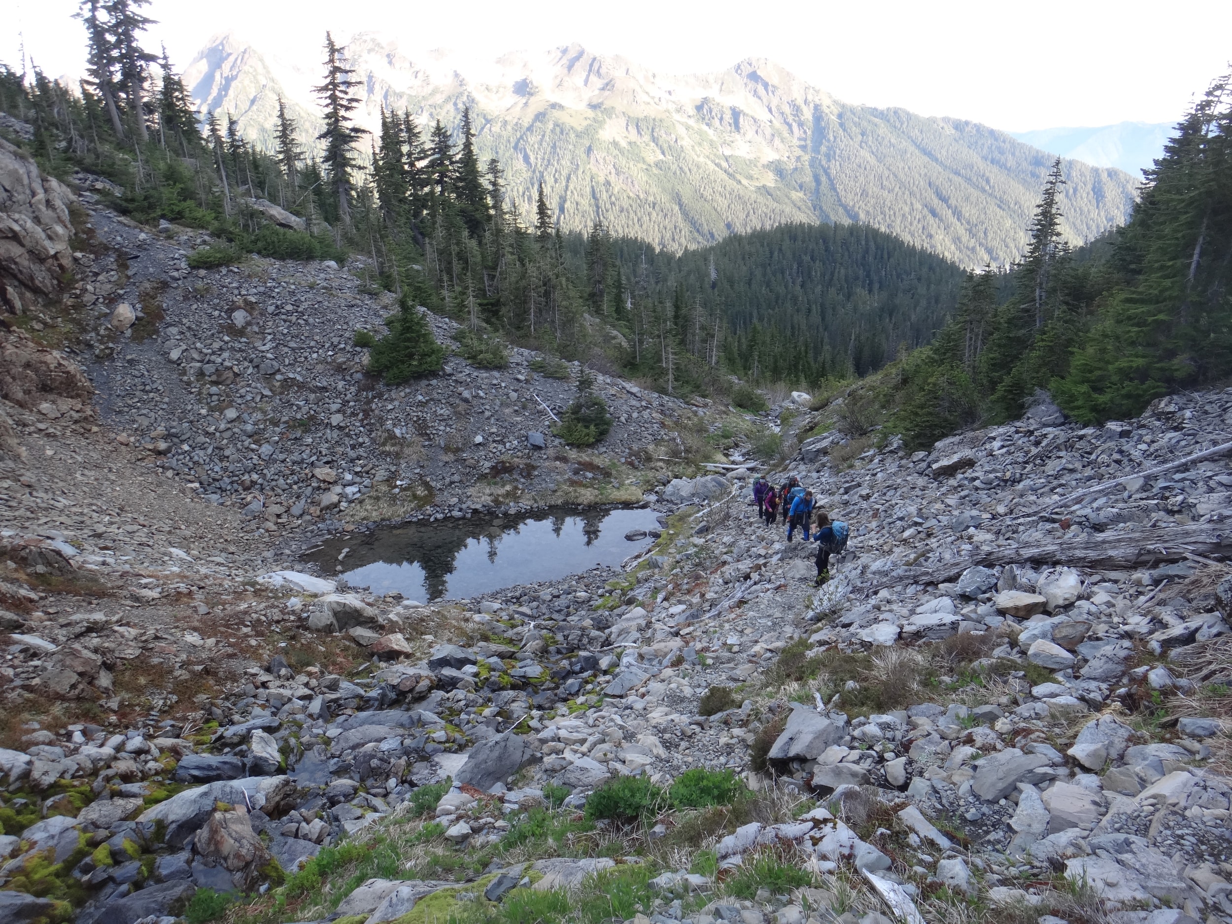 Then we started the very long approach - 18 miles from the parking lot to the campsite just past glacier meadows. We had a good time with it, but this was a long trip… The first 10 miles was in solid rainforest surrounded by some dense growth. I love this type of hiking but not all of us did. We saw some wildlife along the way - a small family of deer around mile 5 - and there were some interesting bridges/waterfalls along the way that we all really enjoyed.