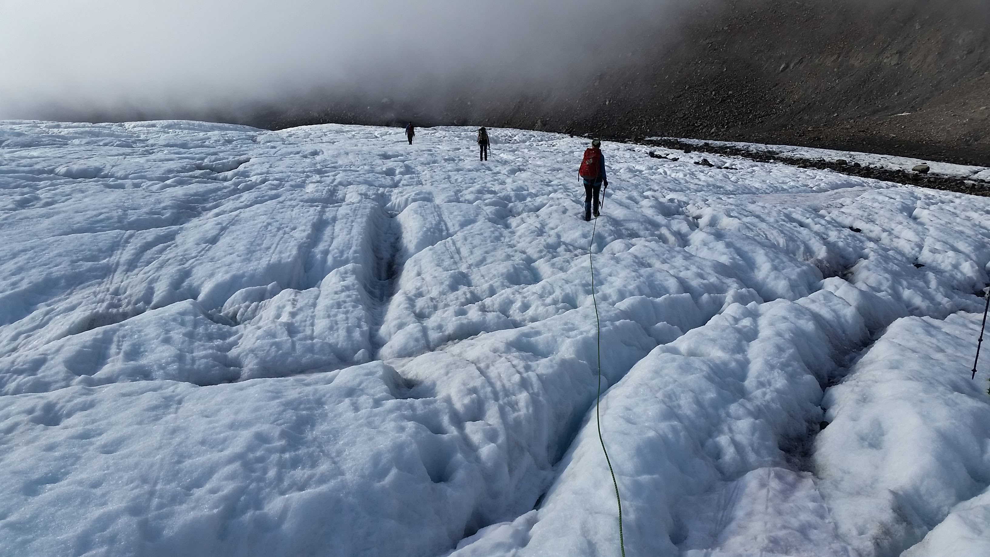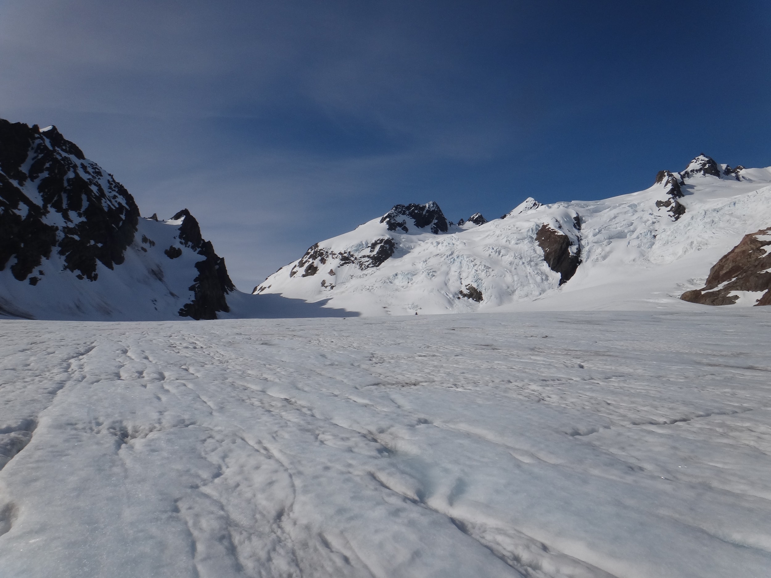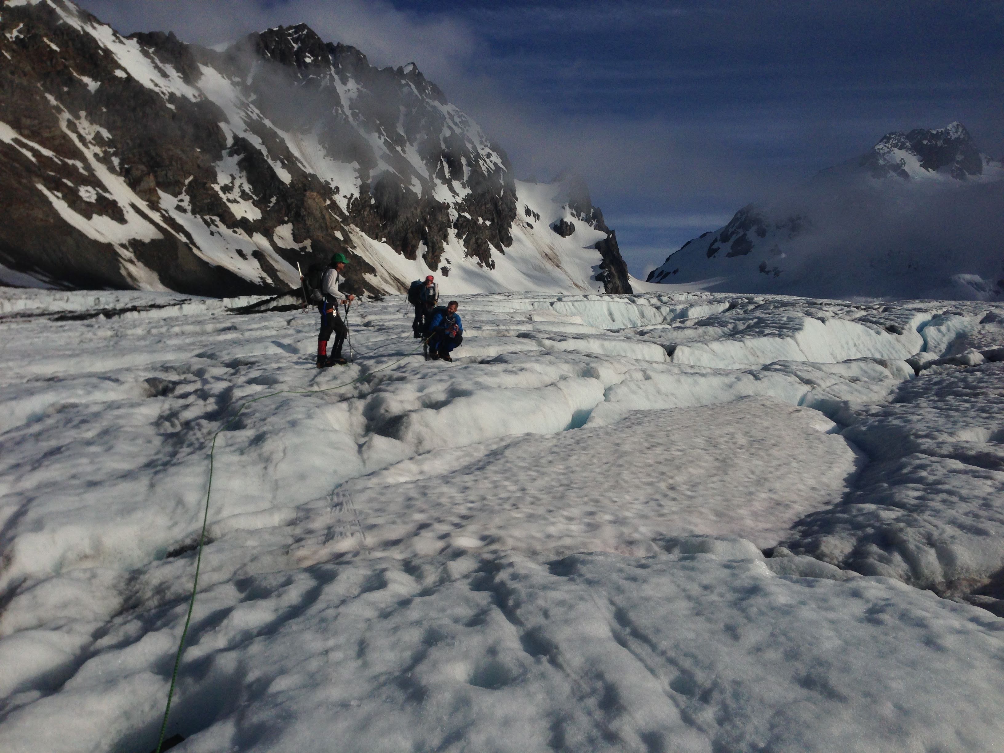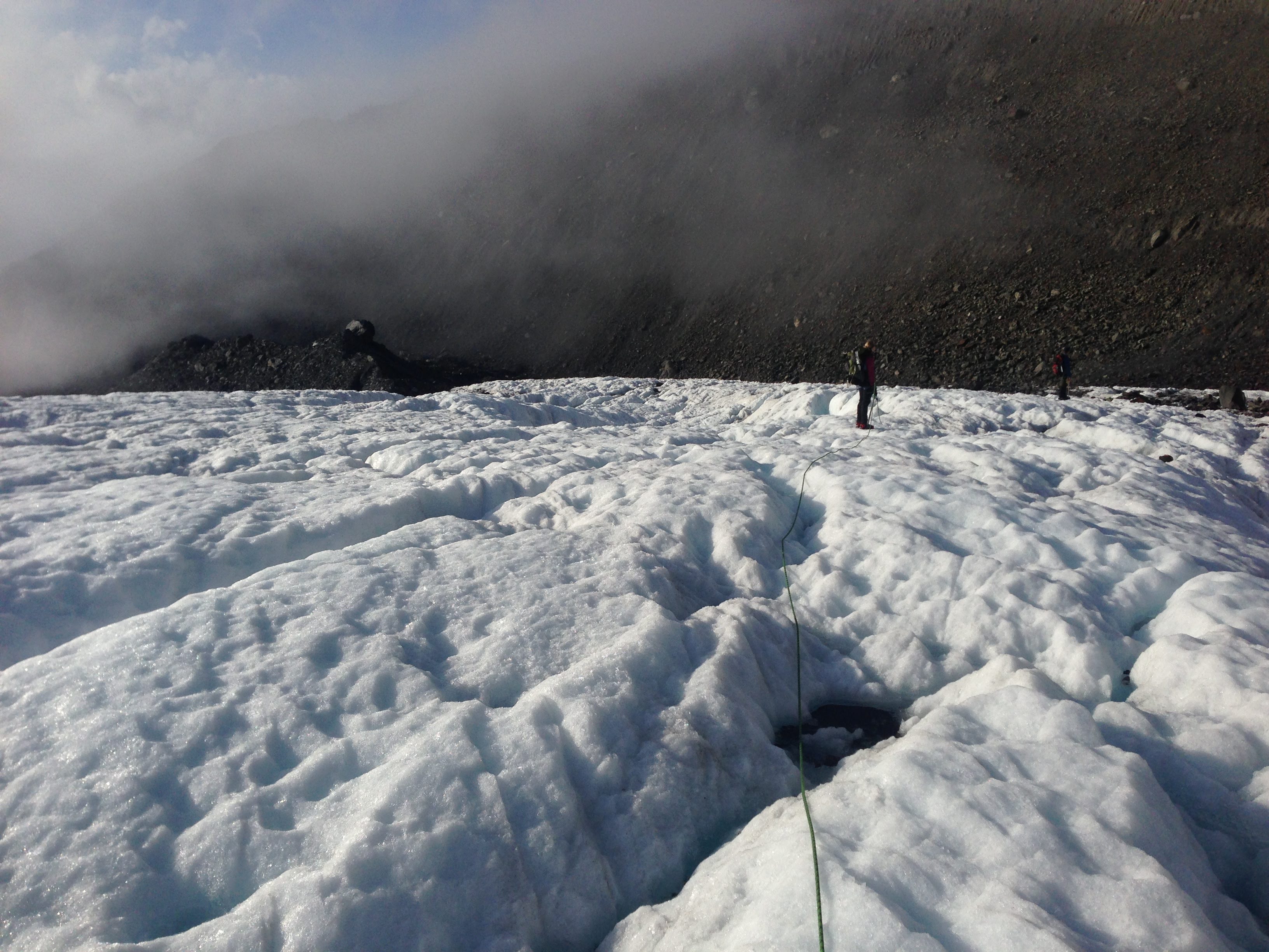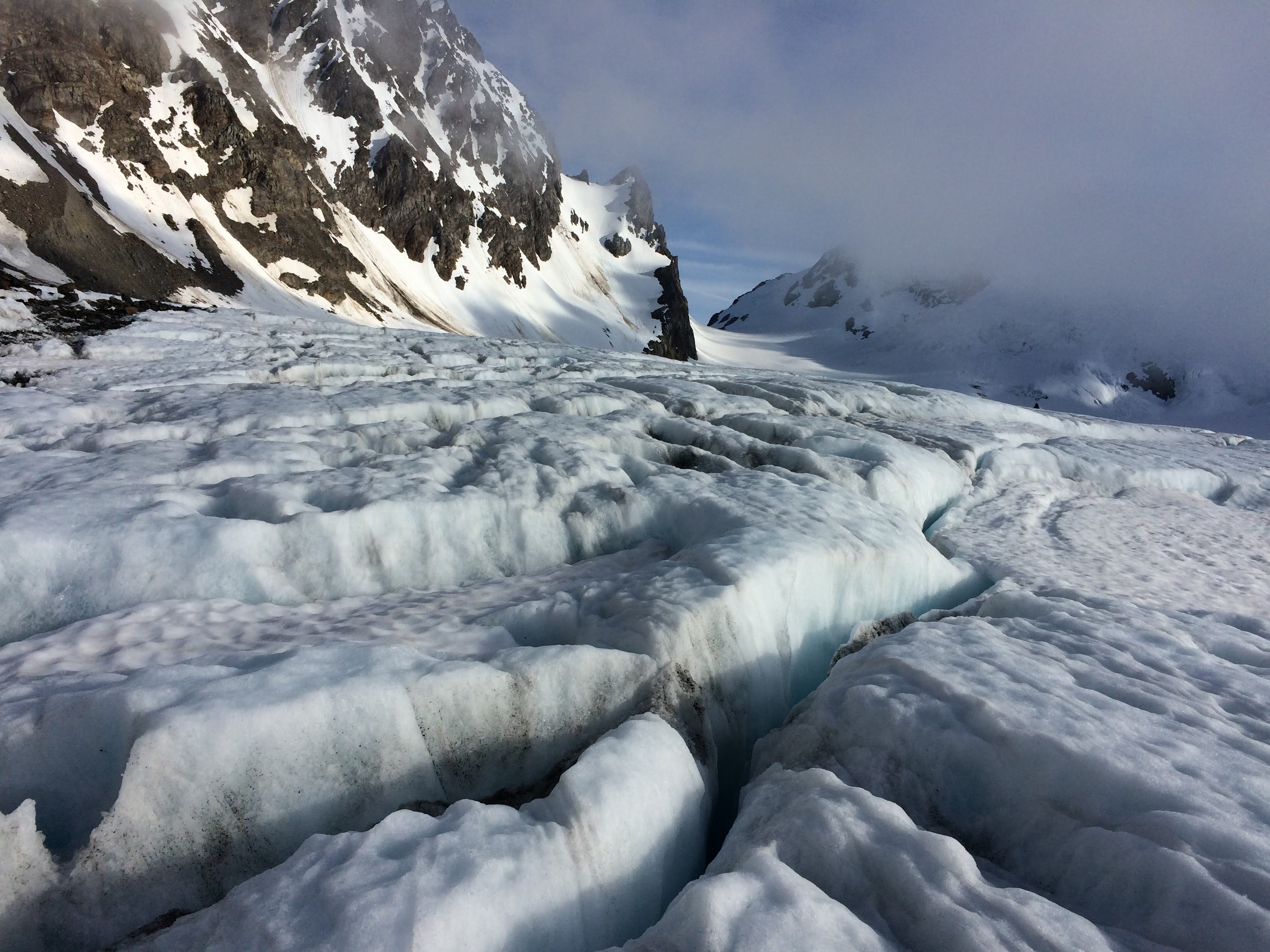 With most glaciers (and this was no exception), the first few steps onto the glacier are the hardest - the glacier is in it’s worst state of melt with lots of small crevasses and the like. Usually it’s pretty short lived, but it was probably a quarter mile of this type of challenging terrain before we were on sold glacier again.