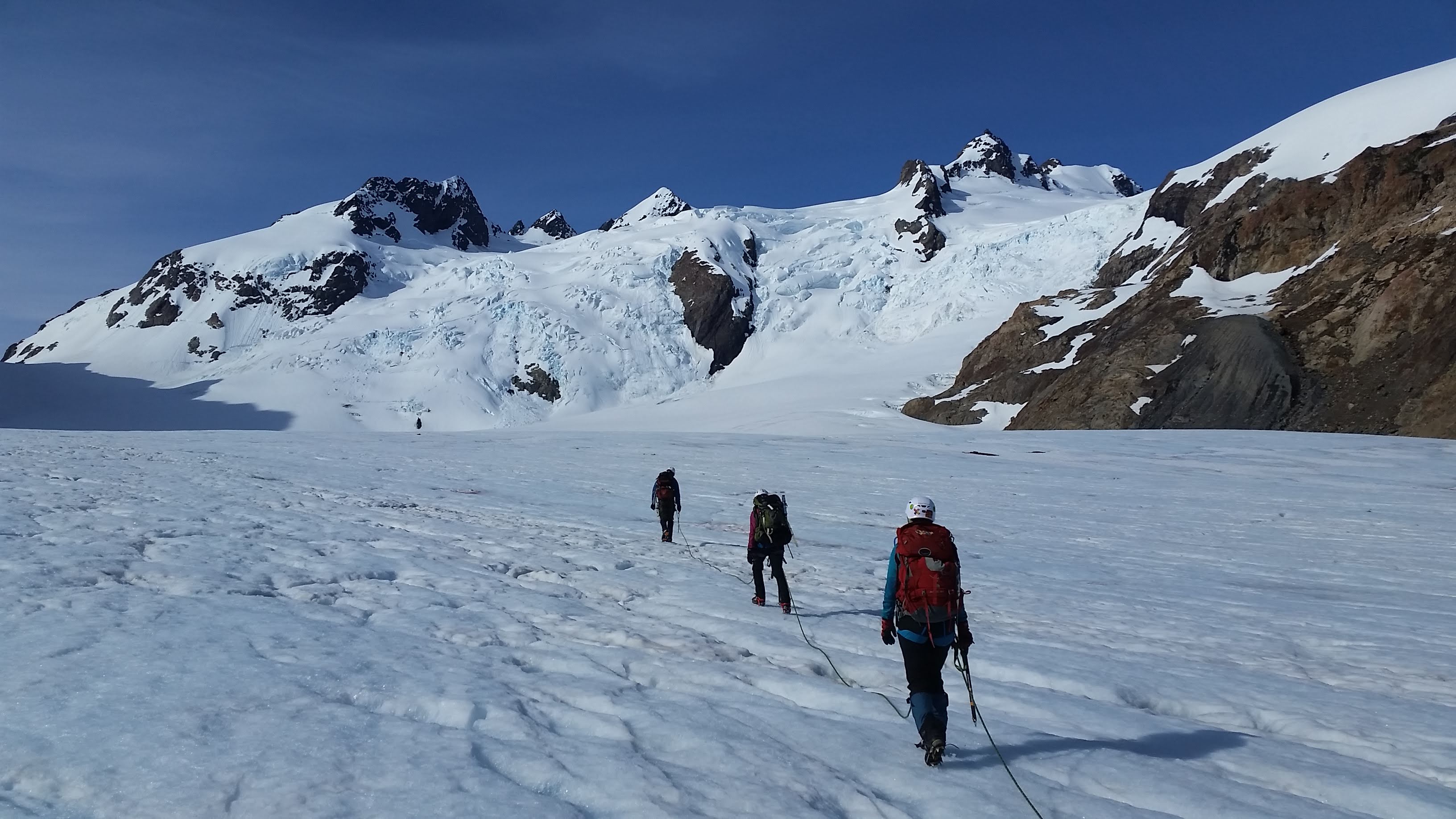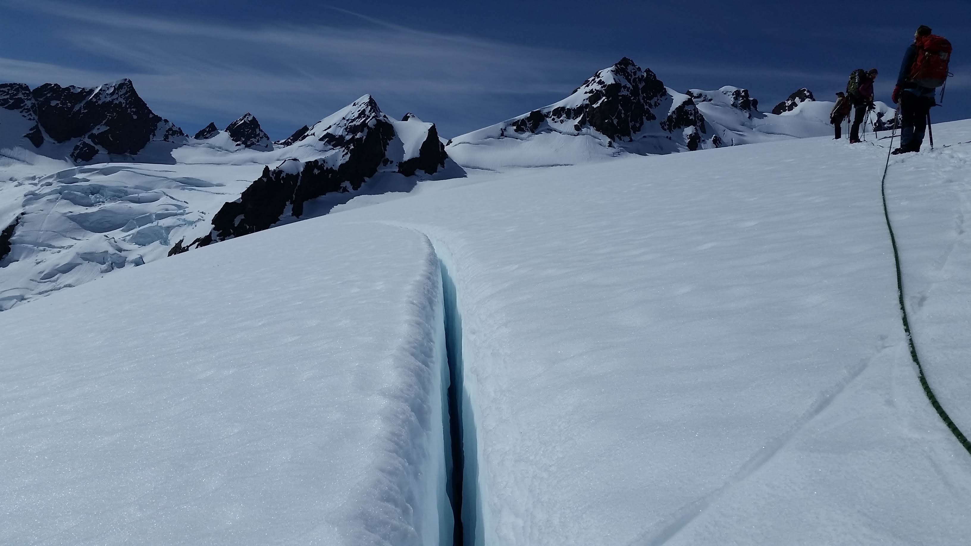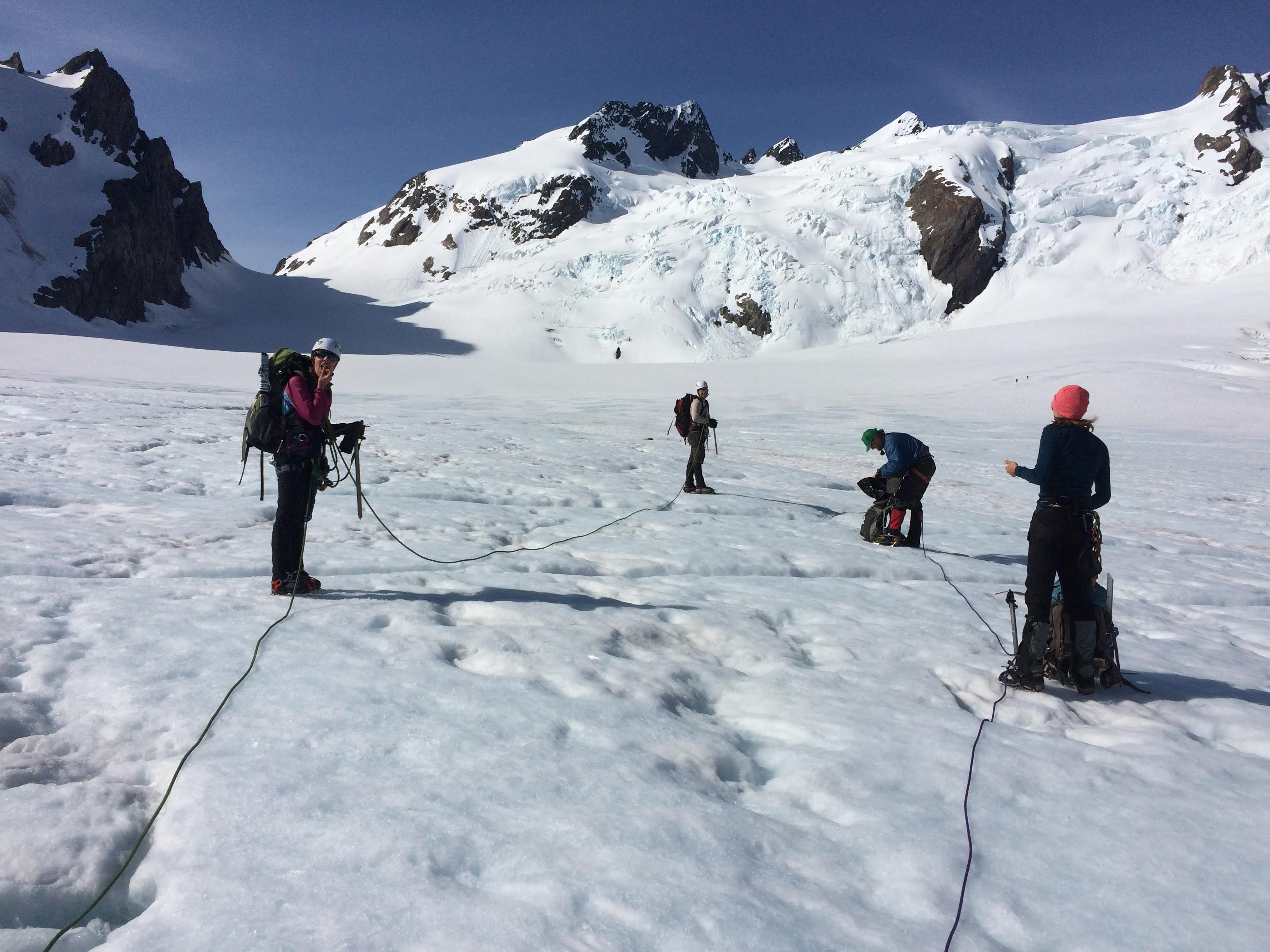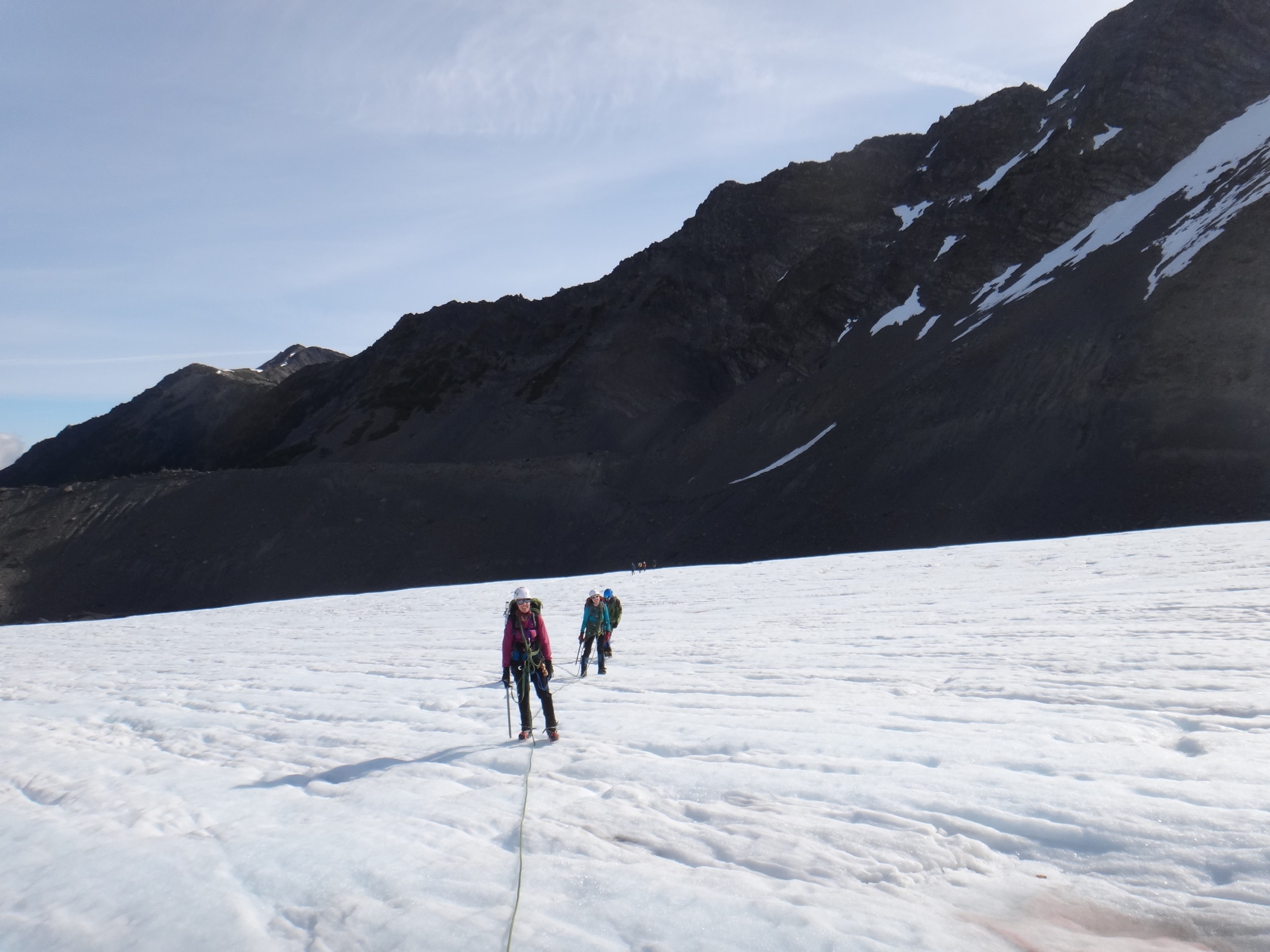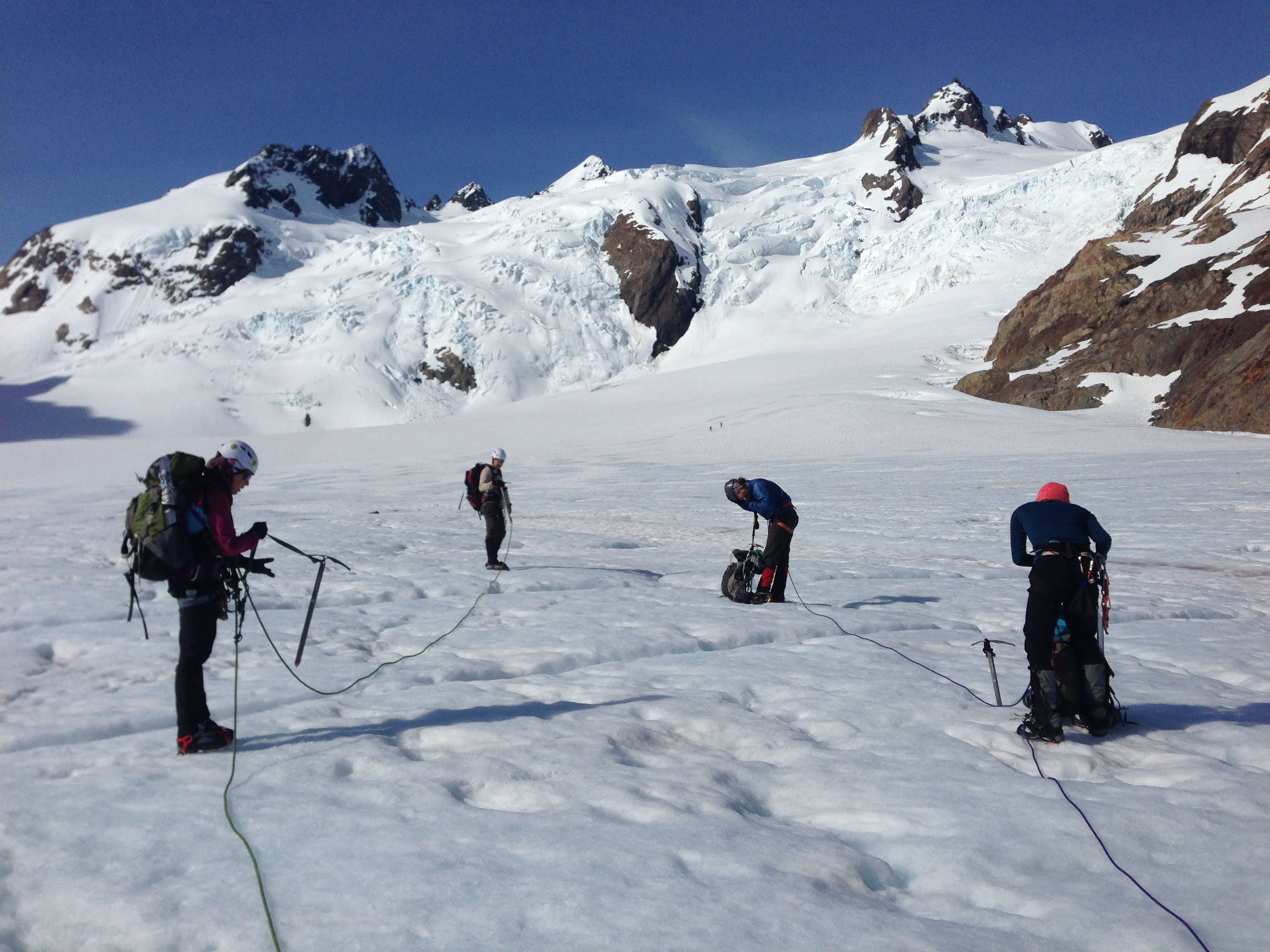 With most glaciers (and this was no exception), the first few steps onto the glacier are the hardest - the glacier is in it’s worst state of melt with lots of small crevasses and the like. Usually it’s pretty short lived, but it was probably a quarter mile of this type of challenging terrain before we were on sold glacier again.