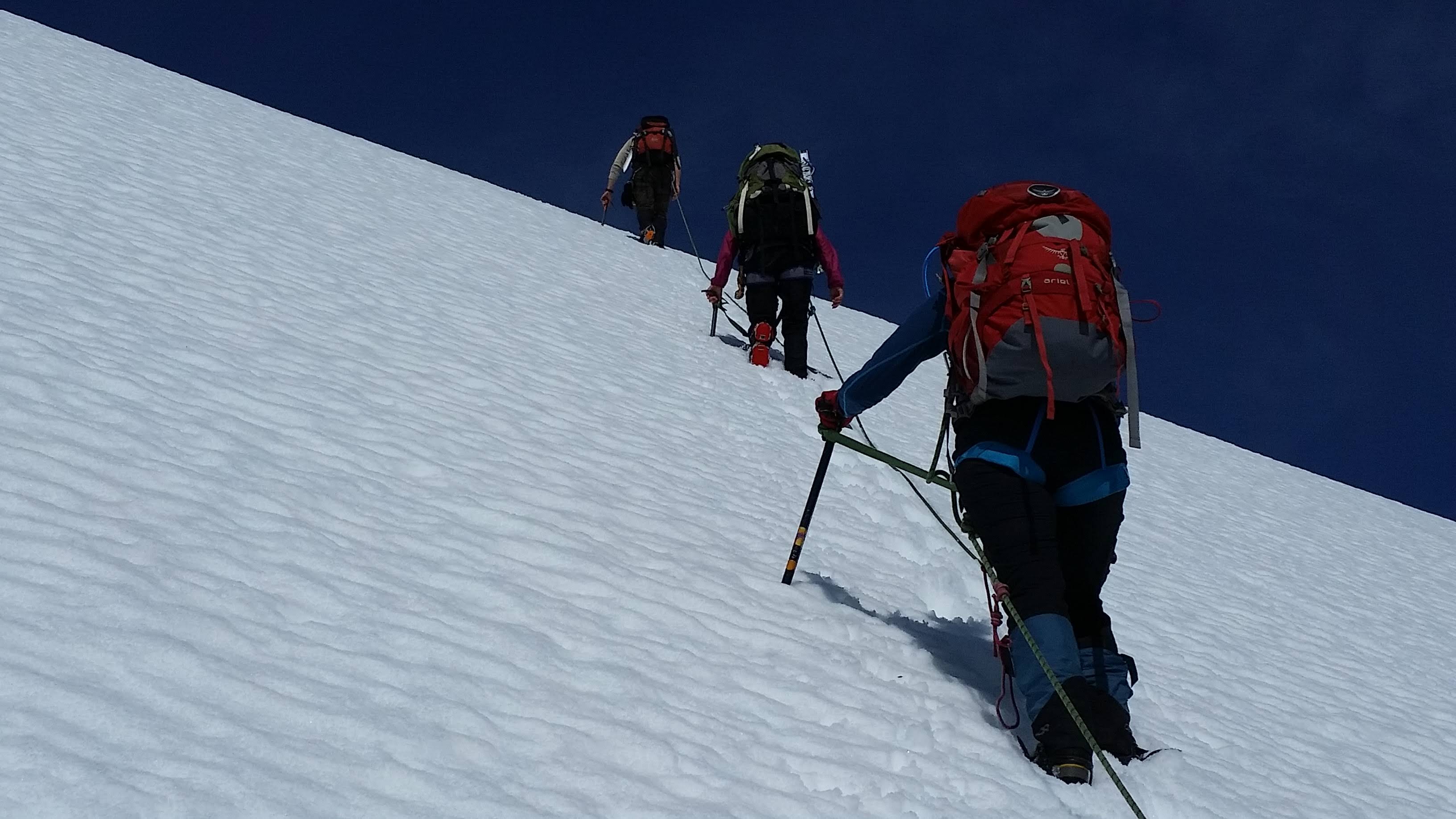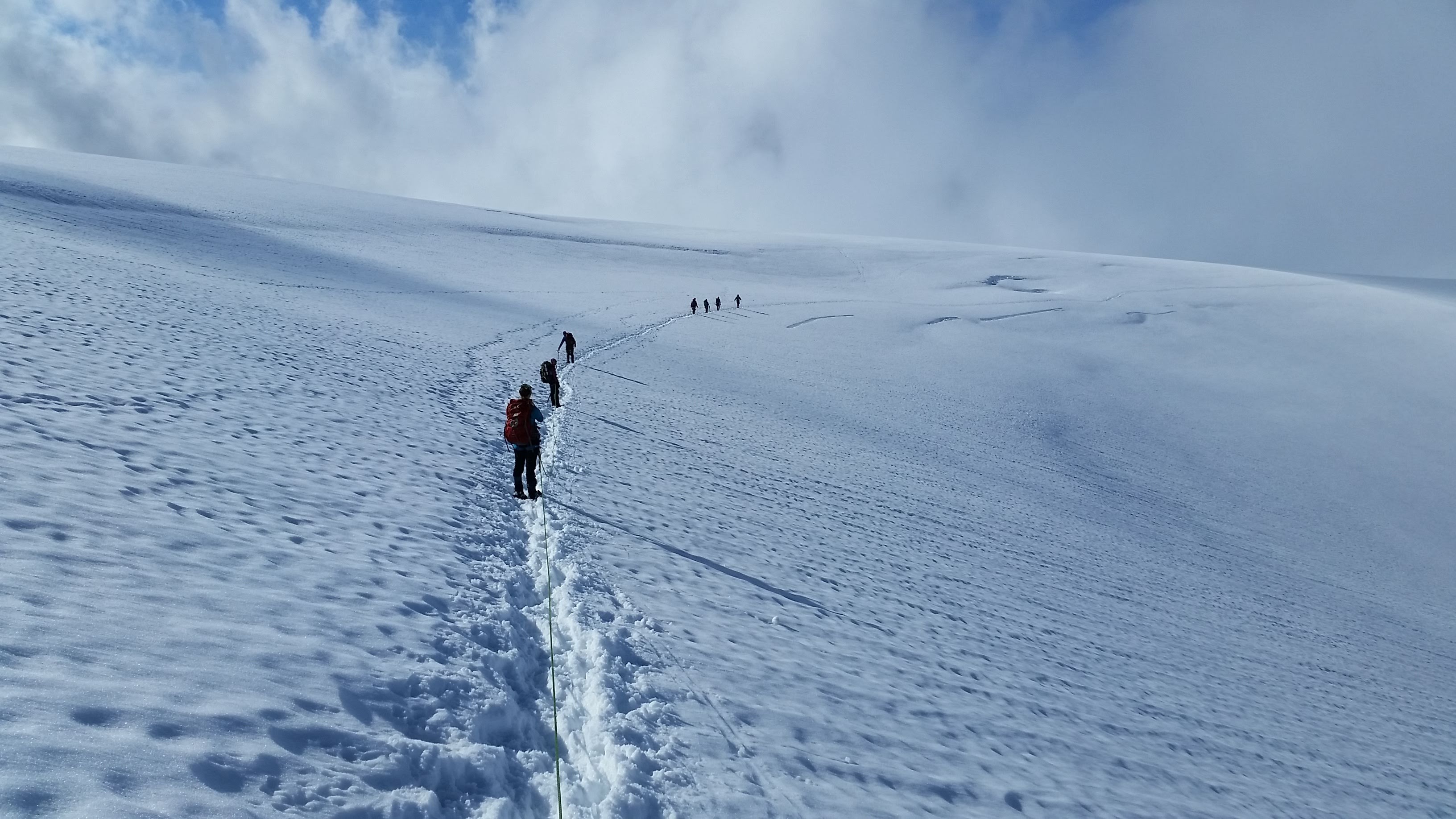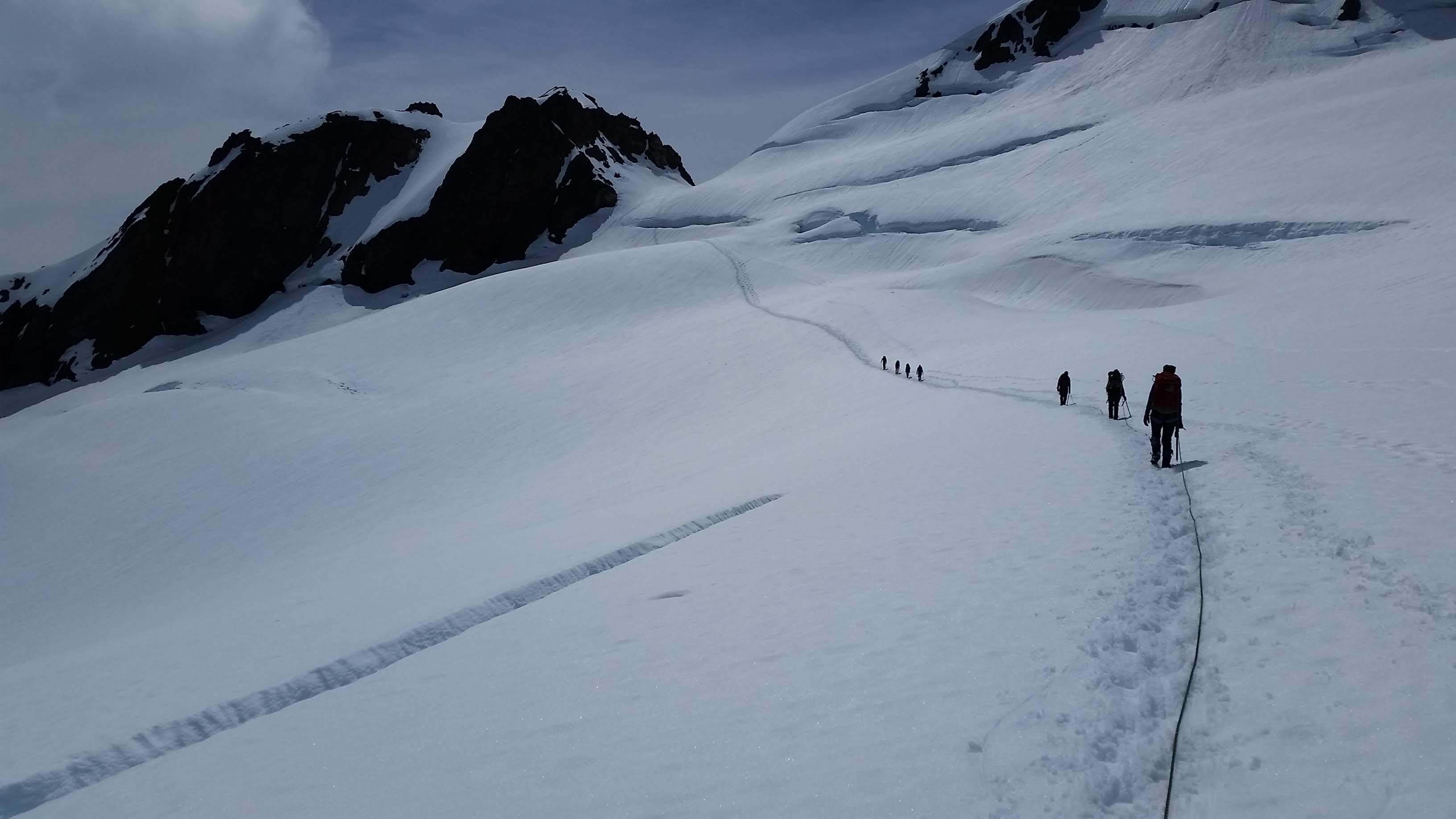 And just like that, the flat part was over and we had arrived at the meat of the climb. We had about 5000 feet to climb today and we spent the next hours climbing it. The Blue Glacier has a kind of right hand screw to it, so we just sort of wrapped around the mountain - always looking to the right to see the summit. As with most climbs, climbing up steep snow get the psych going and this is when it really gets to be fun!