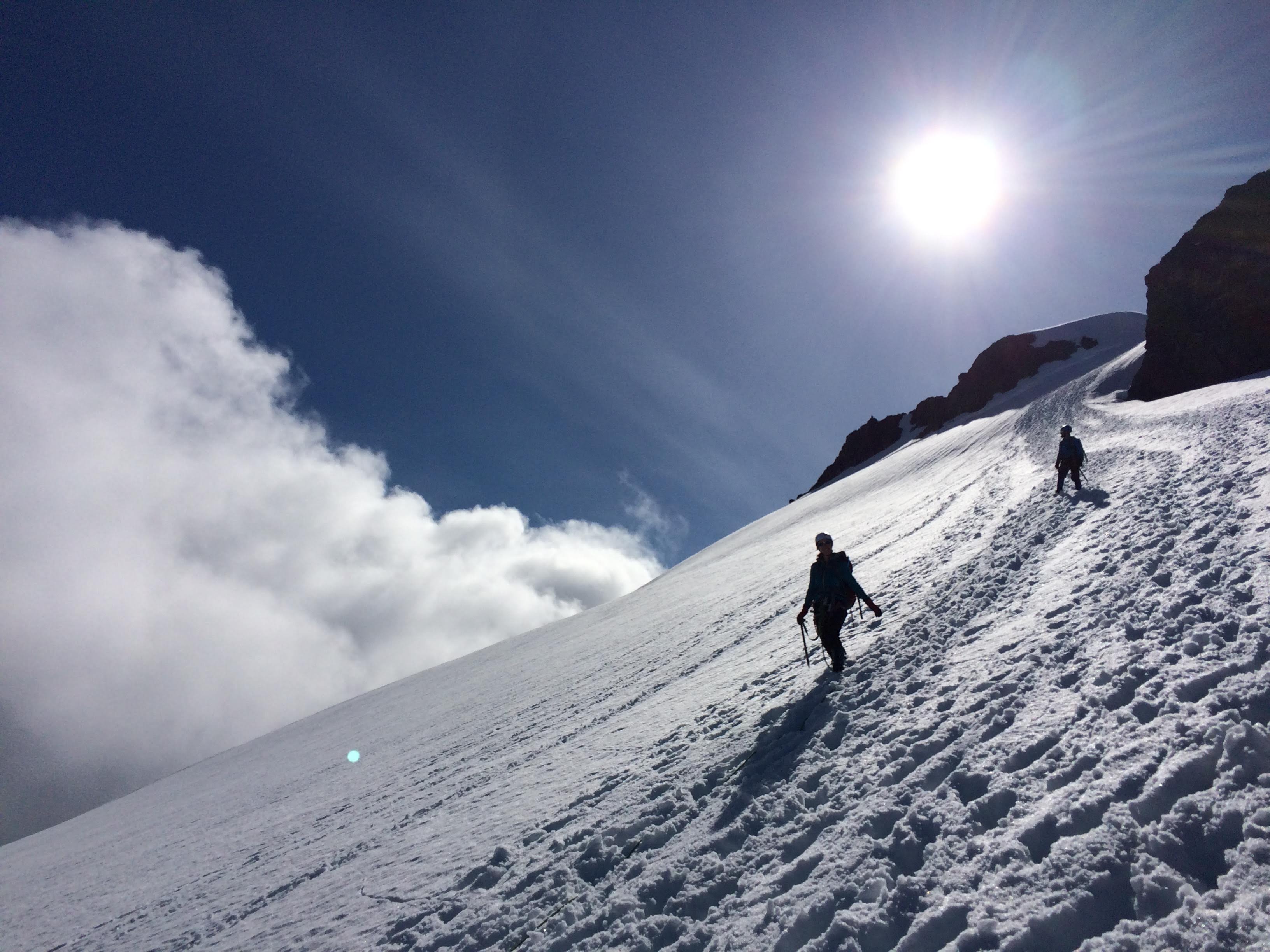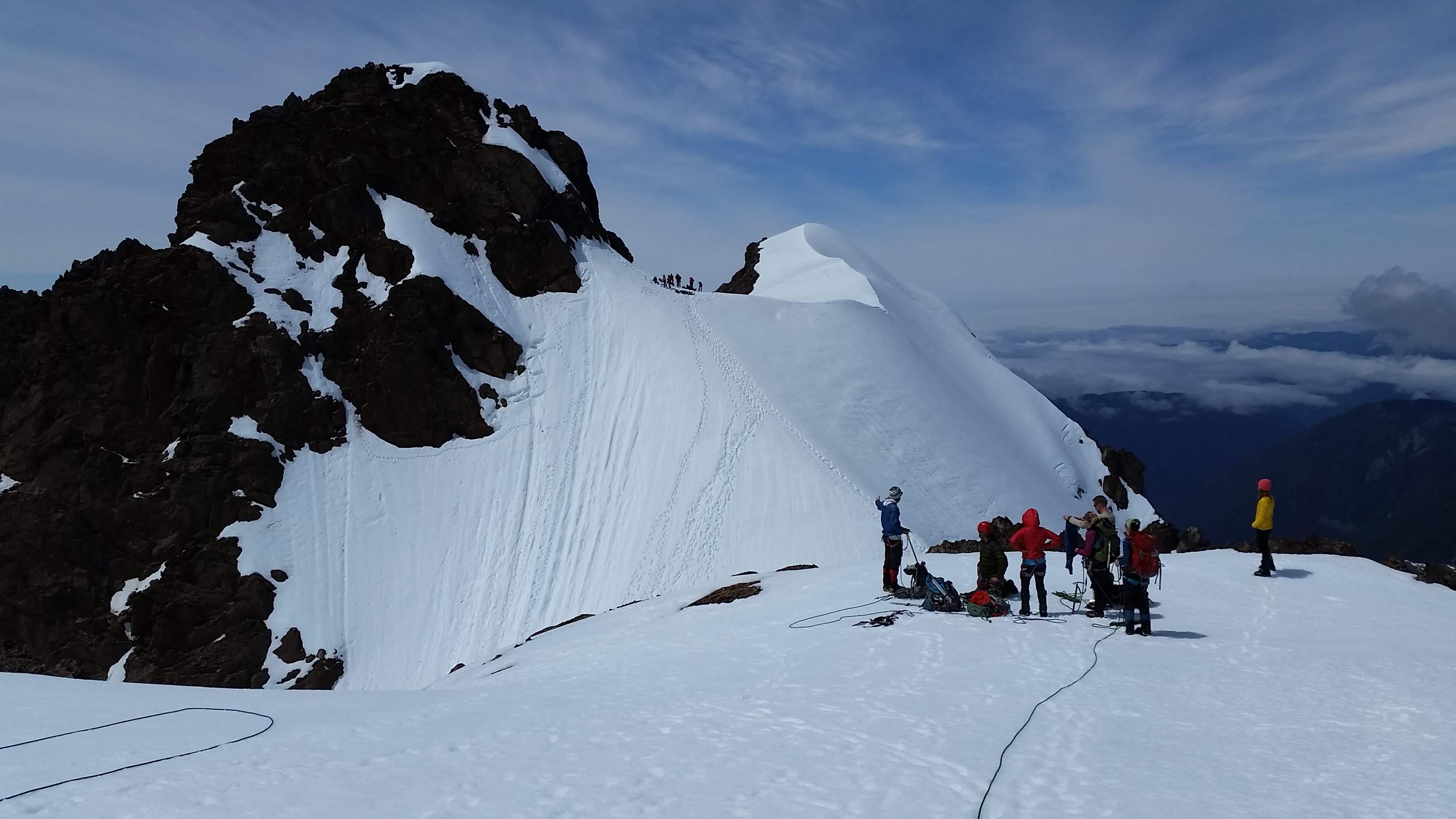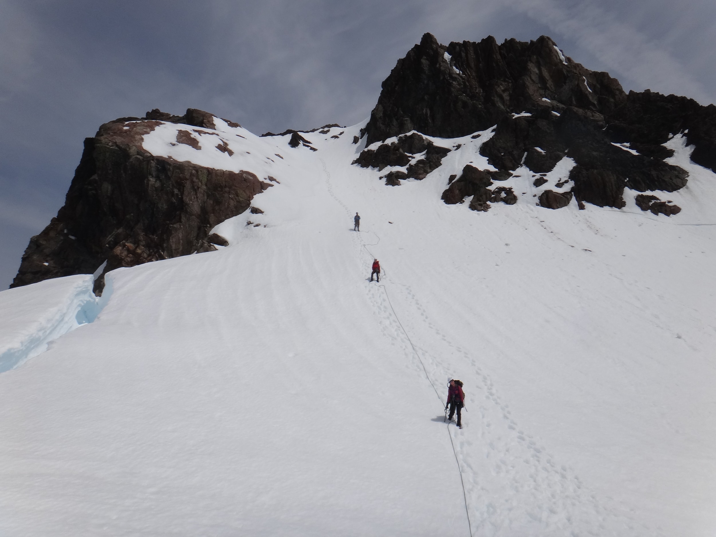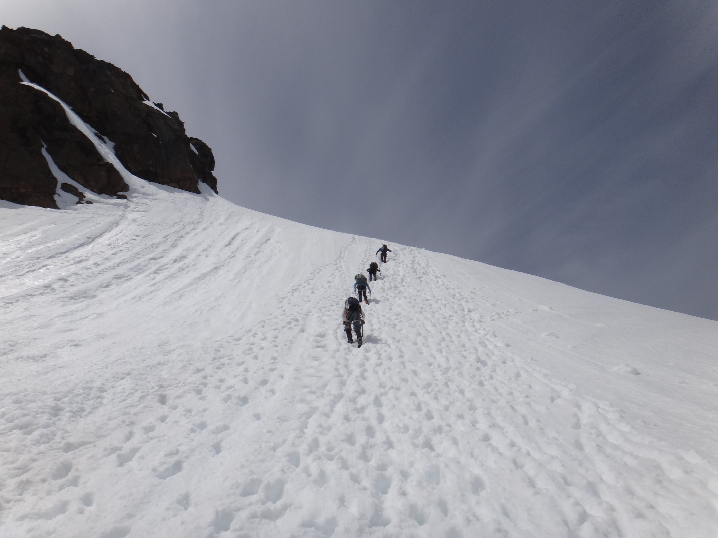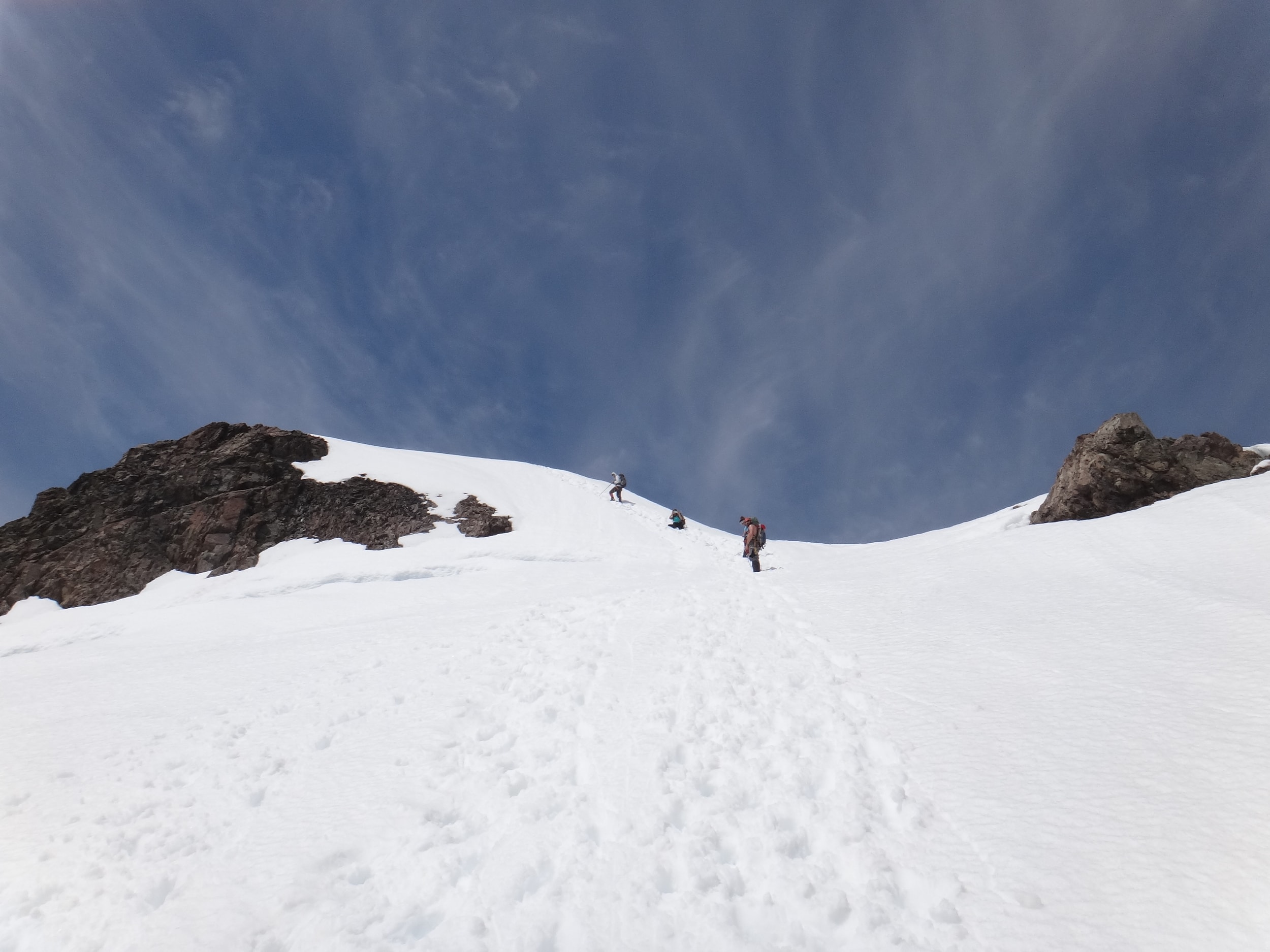 The final approach was a steep down followed immediately by a steep uphill to a flat spot just before the summit. The summit itself is a 300 or so foot high rock outcropping that requires some technical rock climbing to reach the actual summit - but more on that later. For now, this was the last big push on the glacier before something new