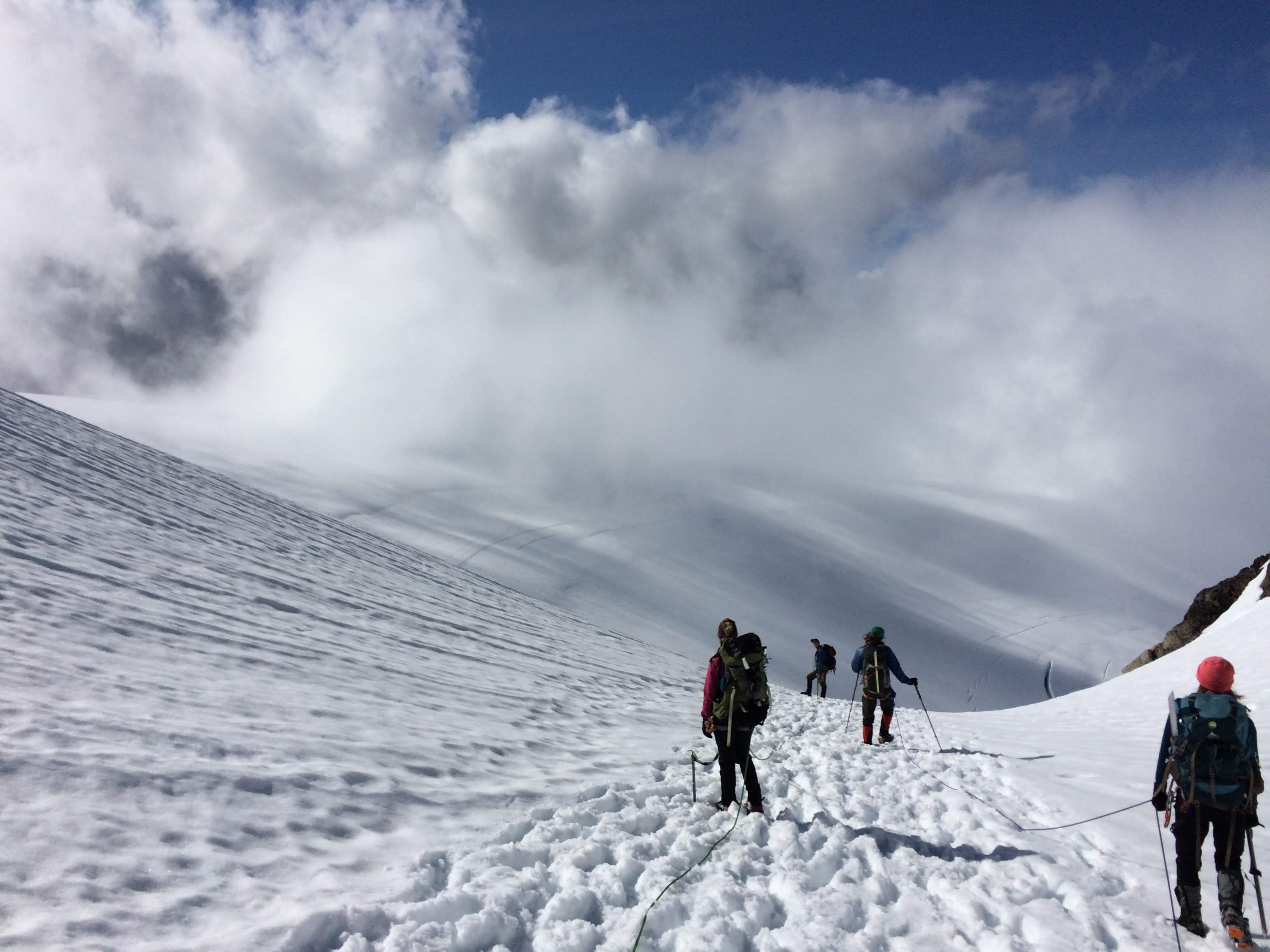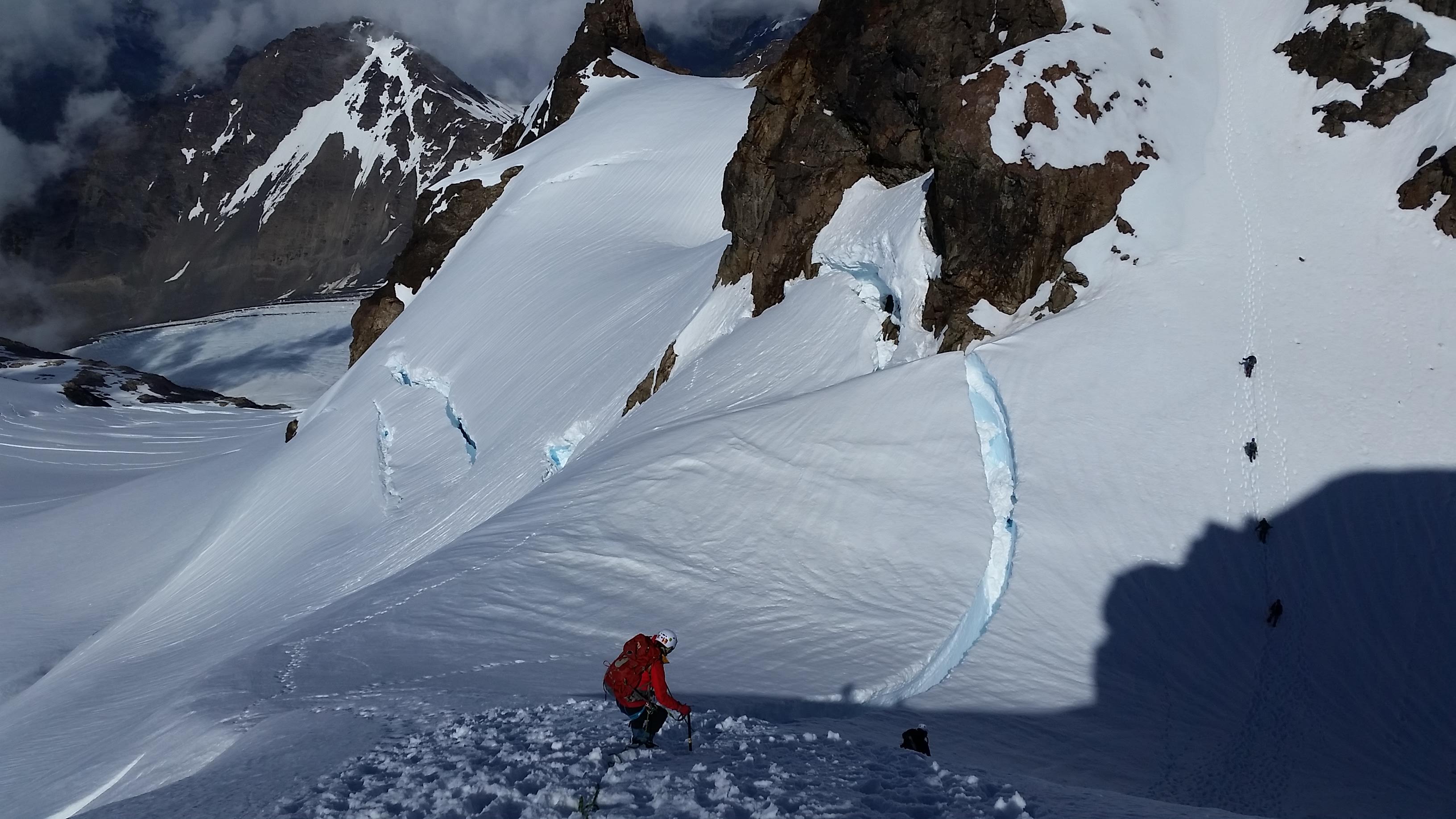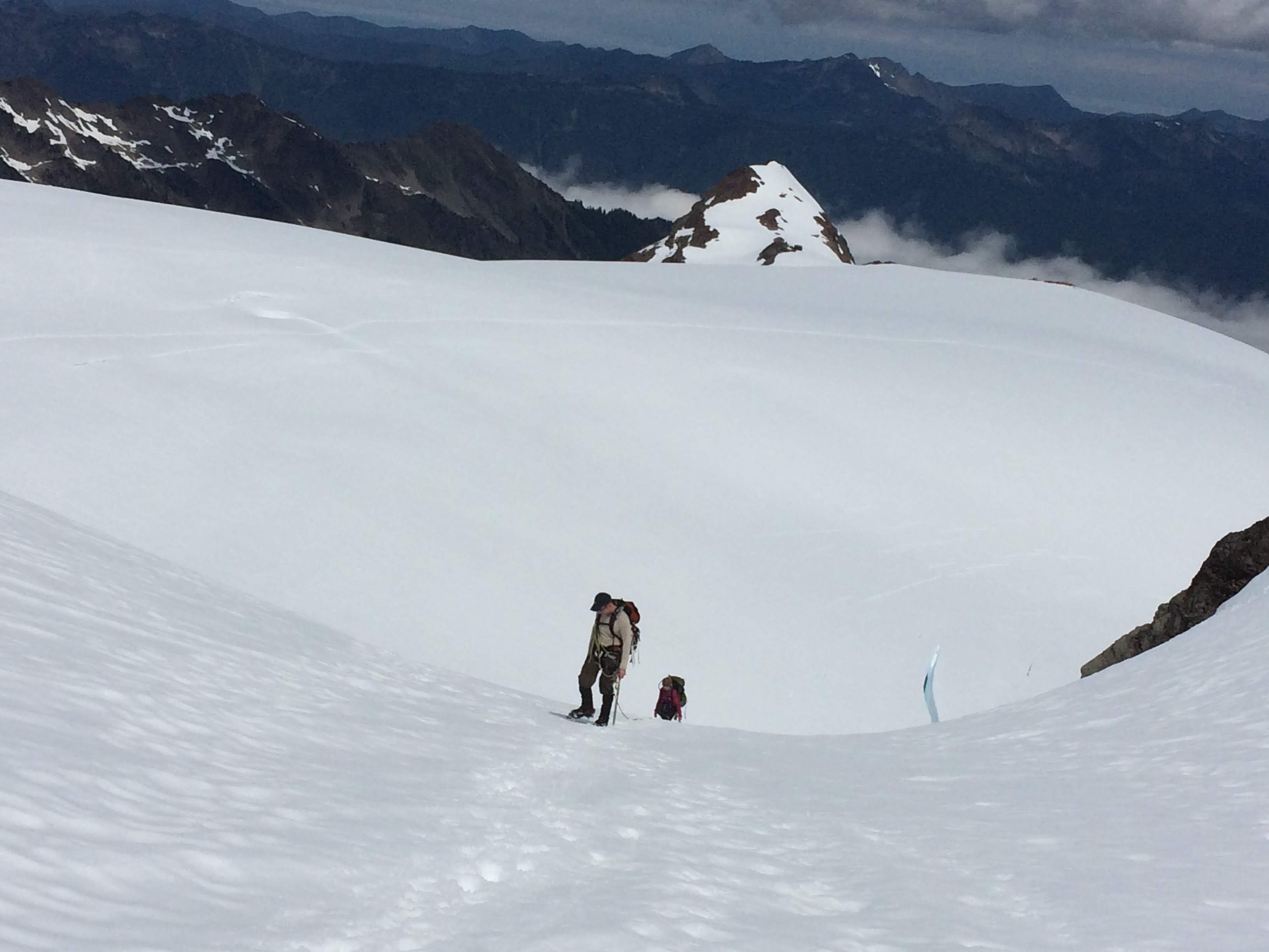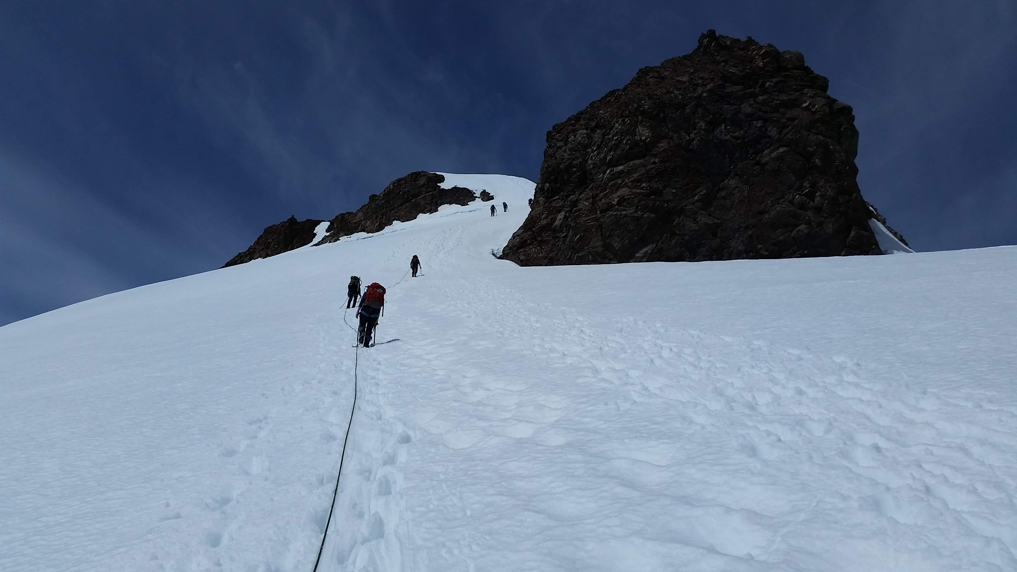 The final approach was a steep down followed immediately by a steep uphill to a flat spot just before the summit. The summit itself is a 300 or so foot high rock outcropping that requires some technical rock climbing to reach the actual summit - but more on that later. For now, this was the last big push on the glacier before something new