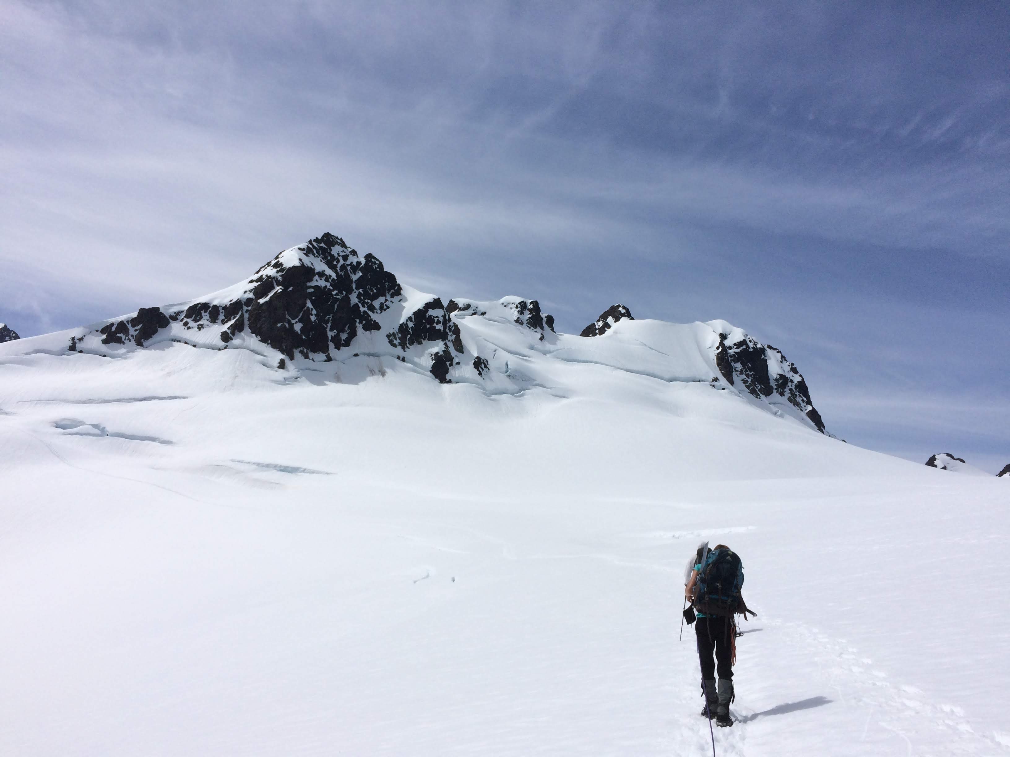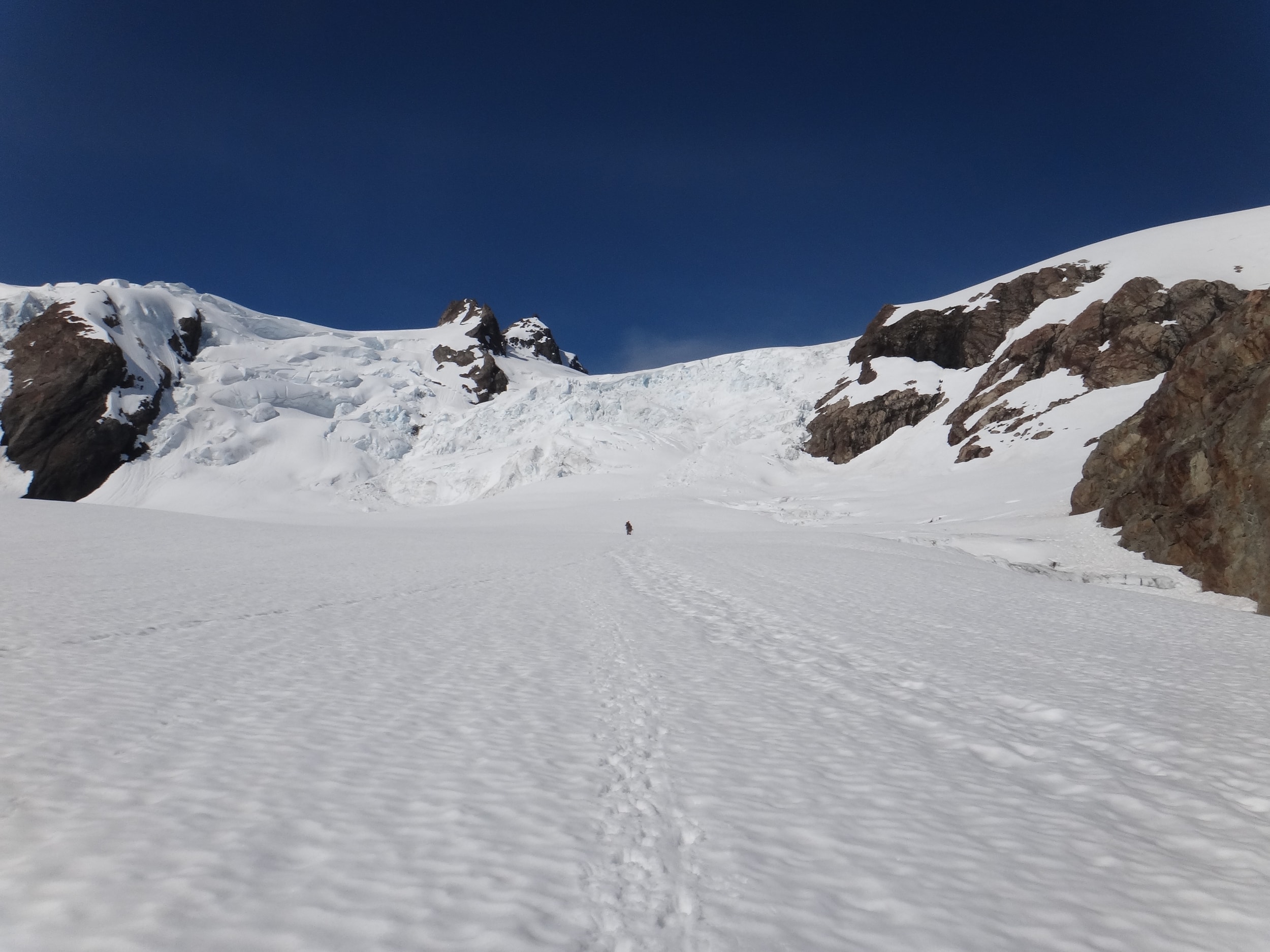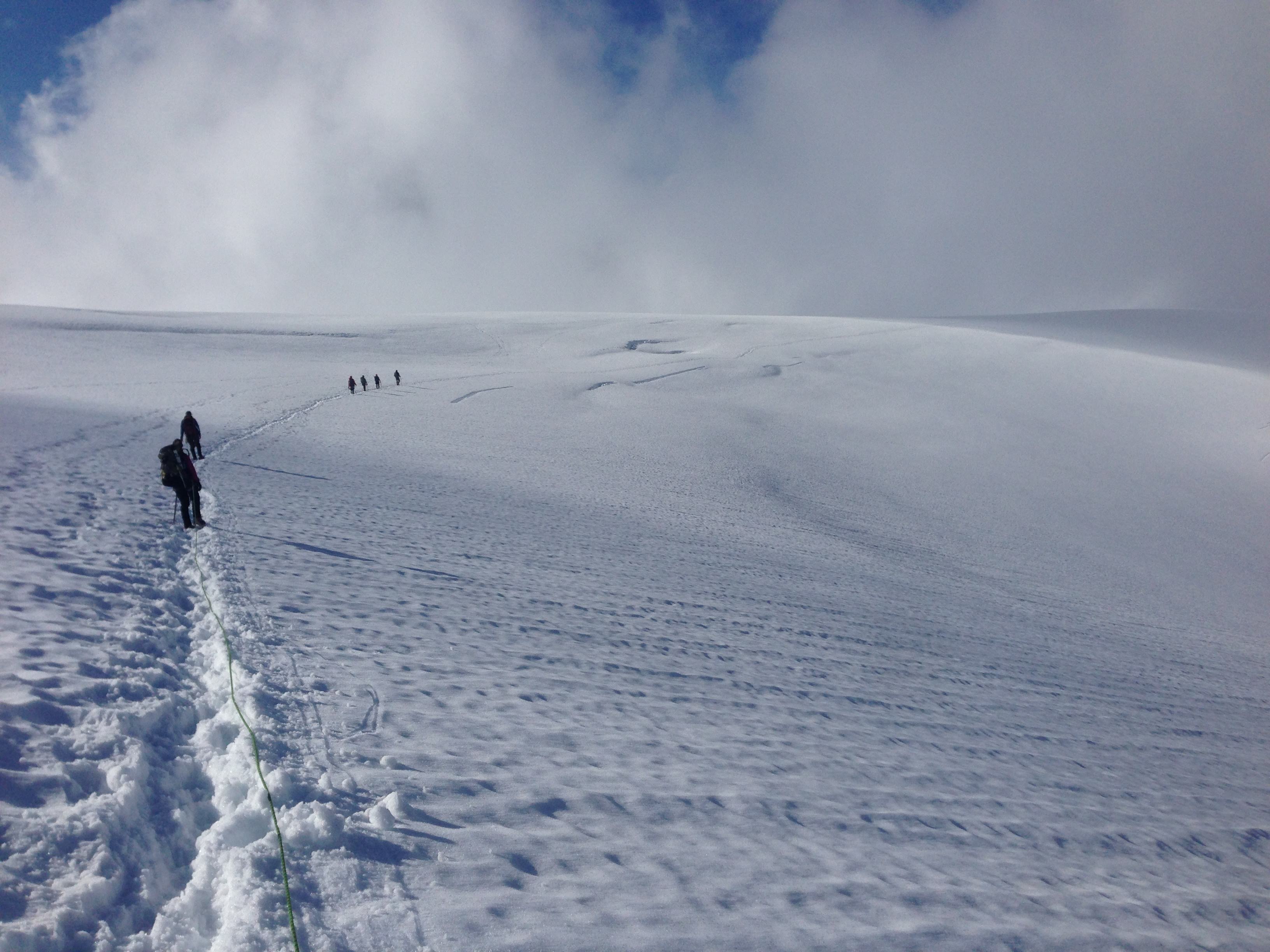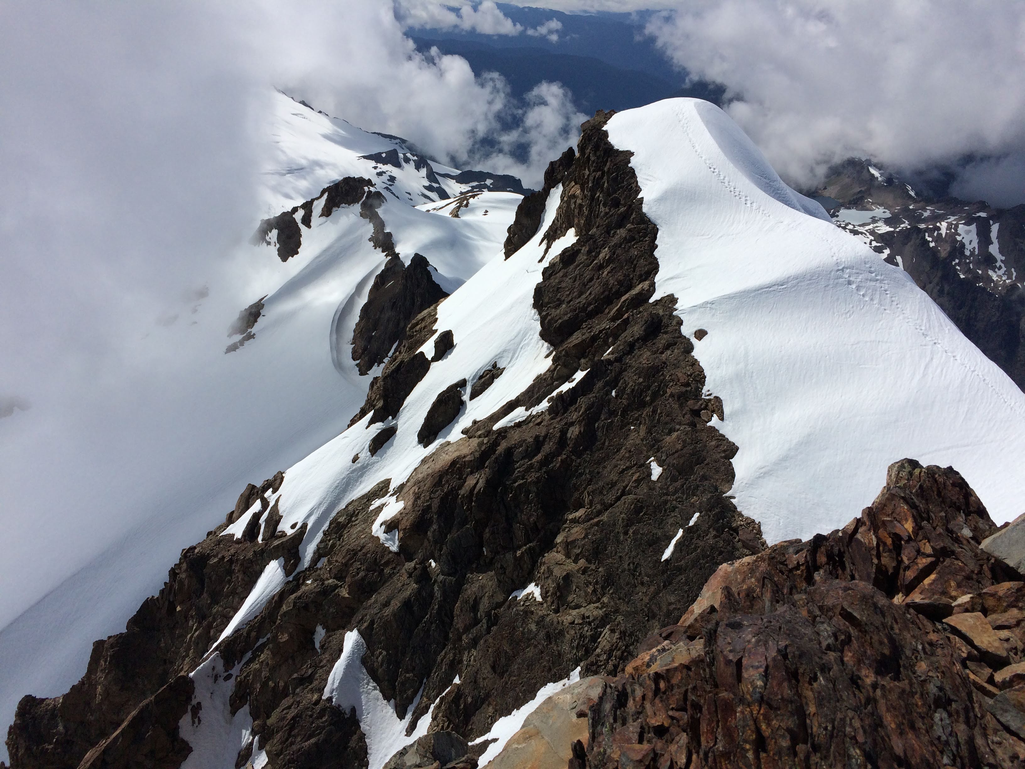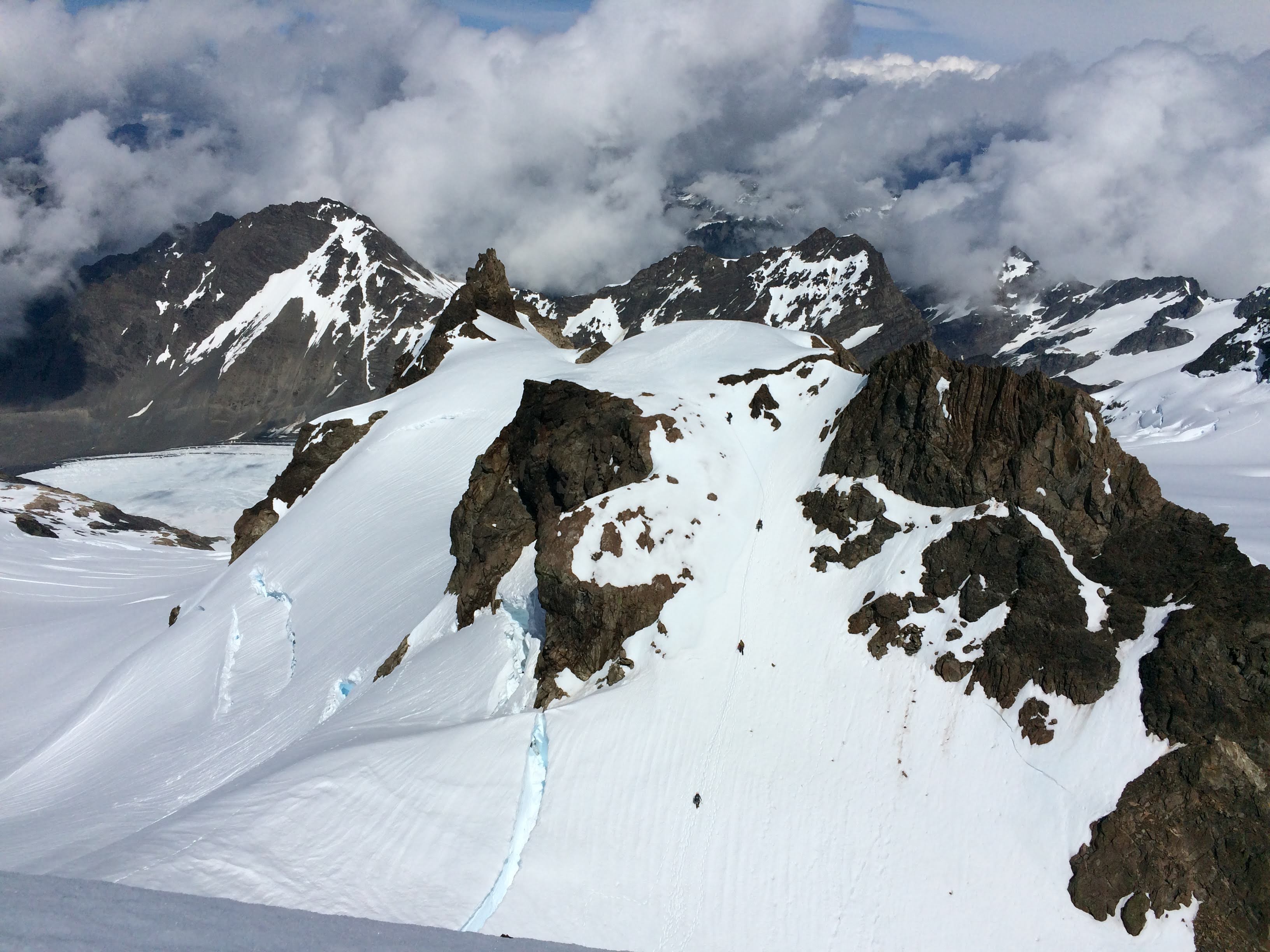 The final approach was a steep down followed immediately by a steep uphill to a flat spot just before the summit. The summit itself is a 300 or so foot high rock outcropping that requires some technical rock climbing to reach the actual summit - but more on that later. For now, this was the last big push on the glacier before something new