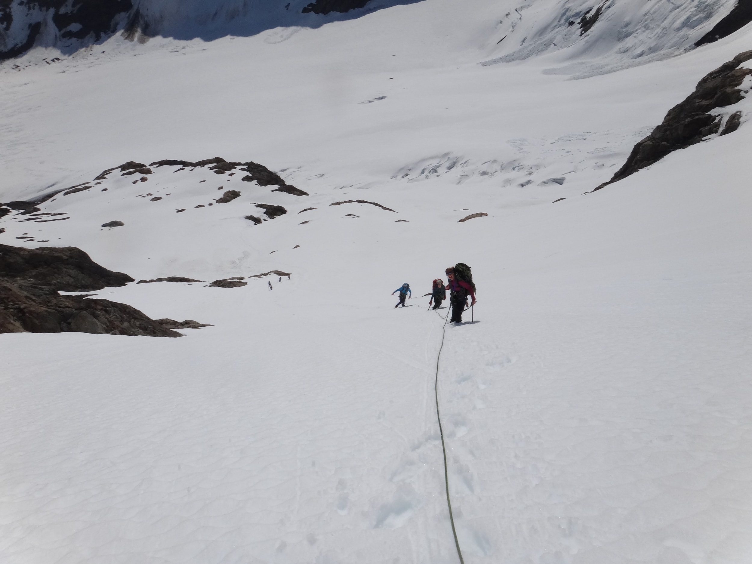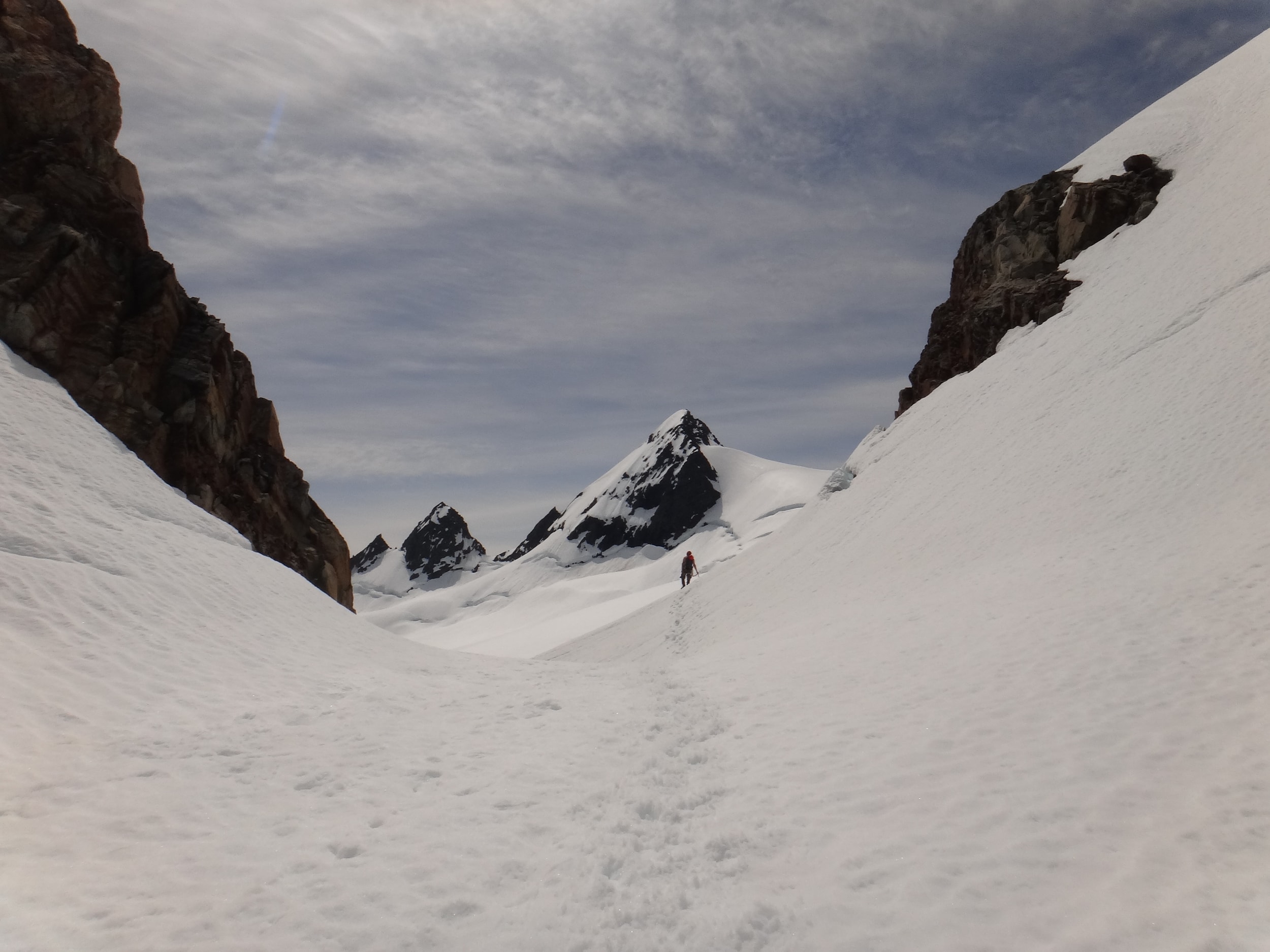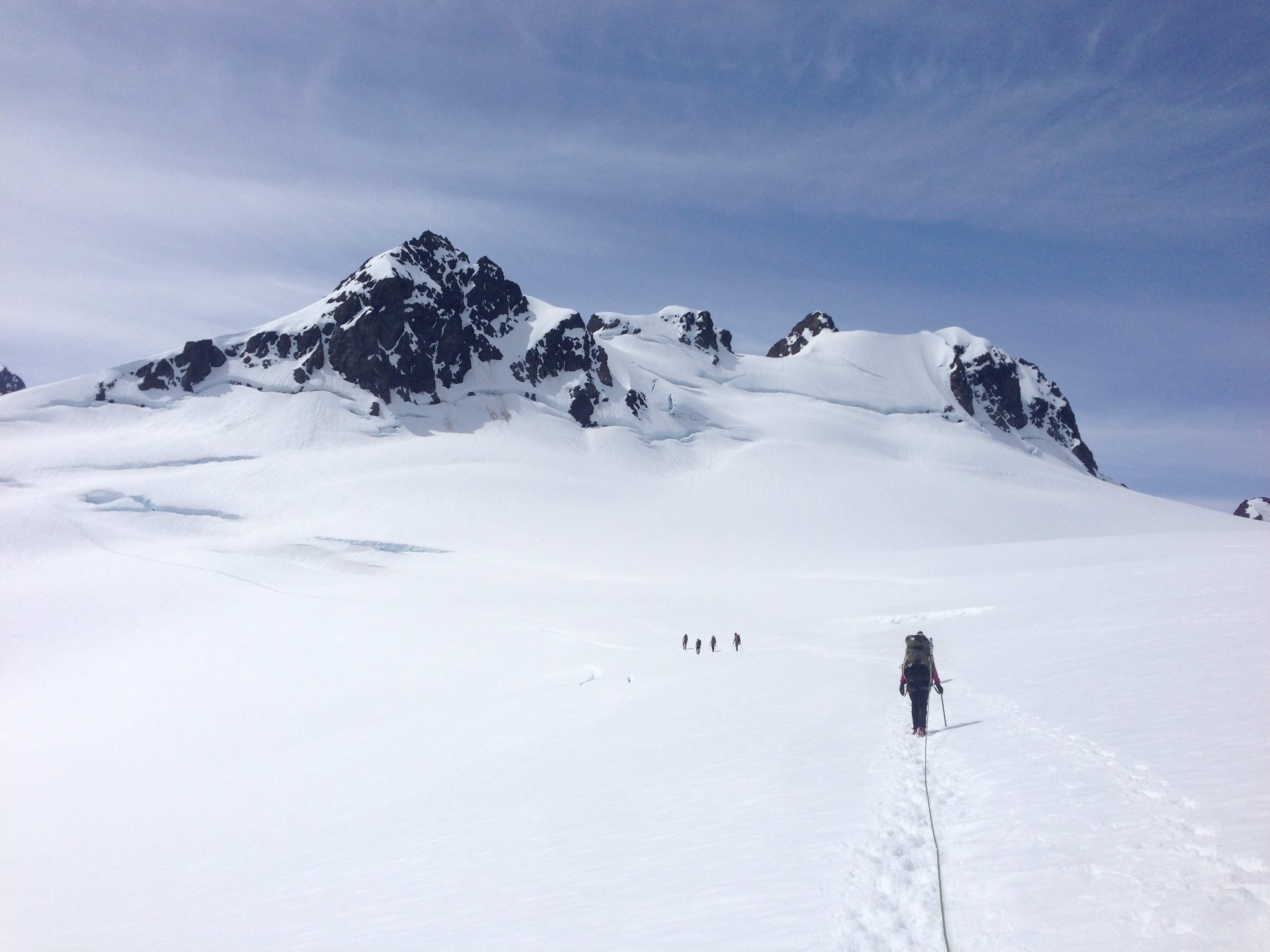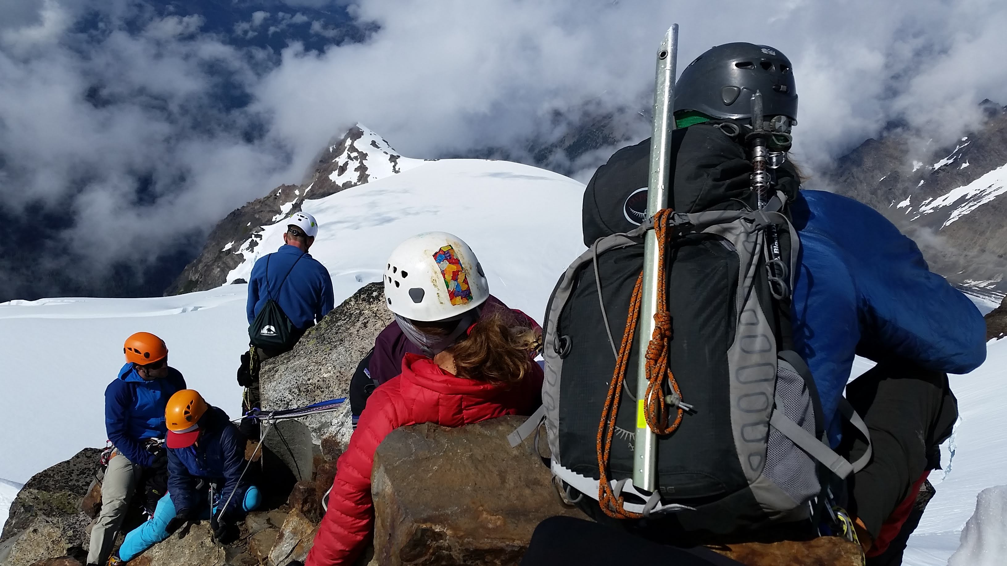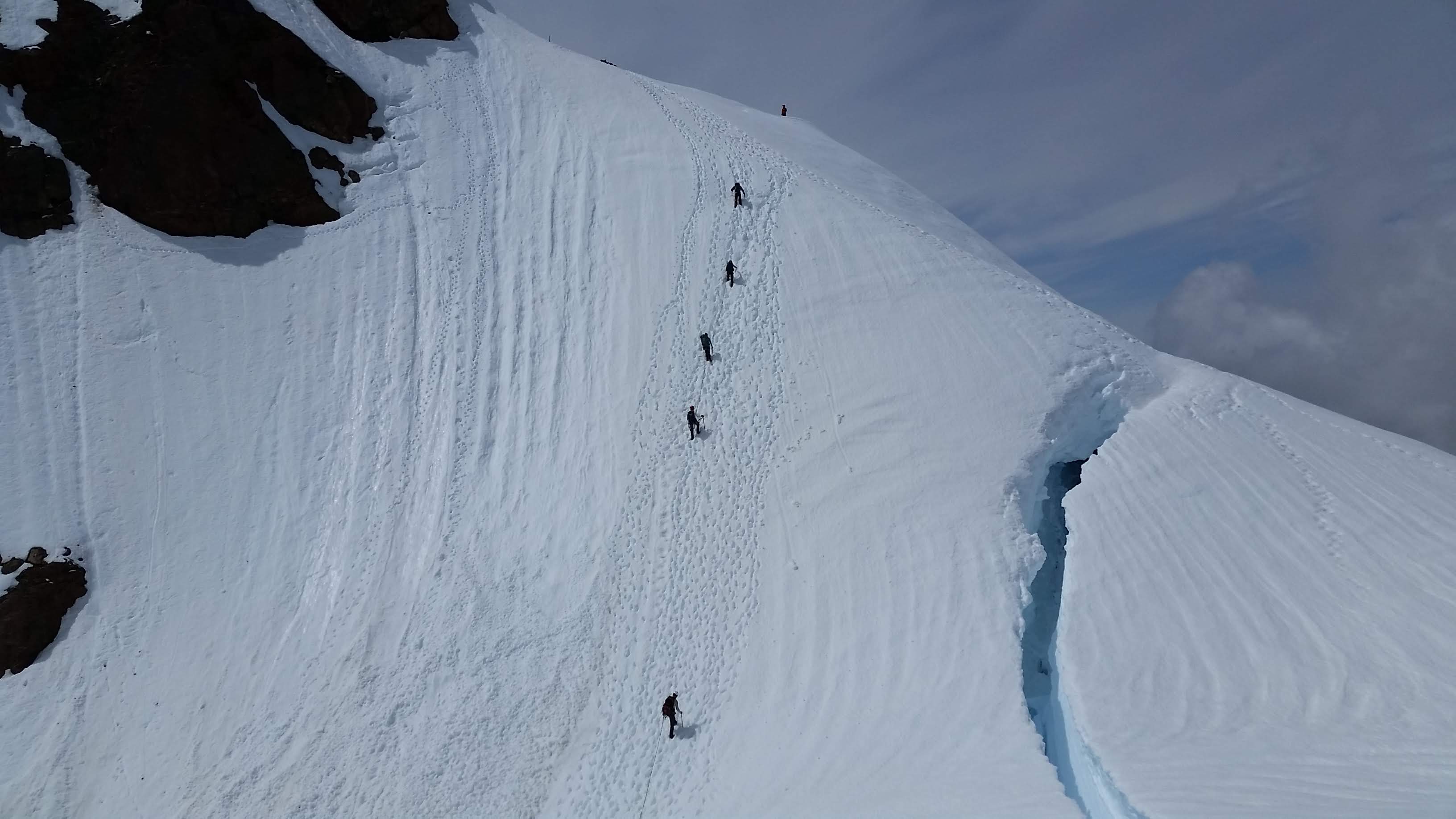 The final approach was a steep down followed immediately by a steep uphill to a flat spot just before the summit. The summit itself is a 300 or so foot high rock outcropping that requires some technical rock climbing to reach the actual summit - but more on that later. For now, this was the last big push on the glacier before something new