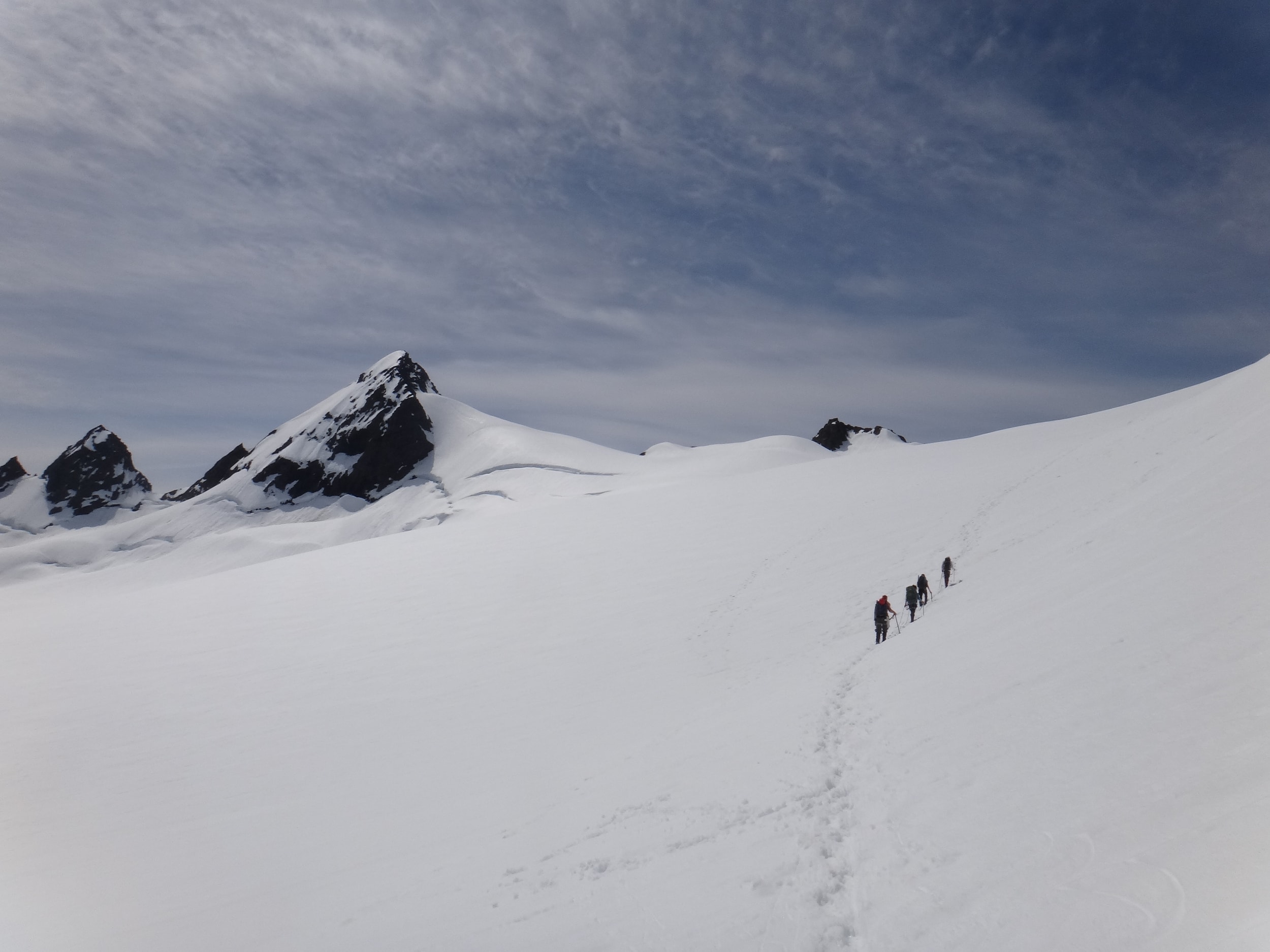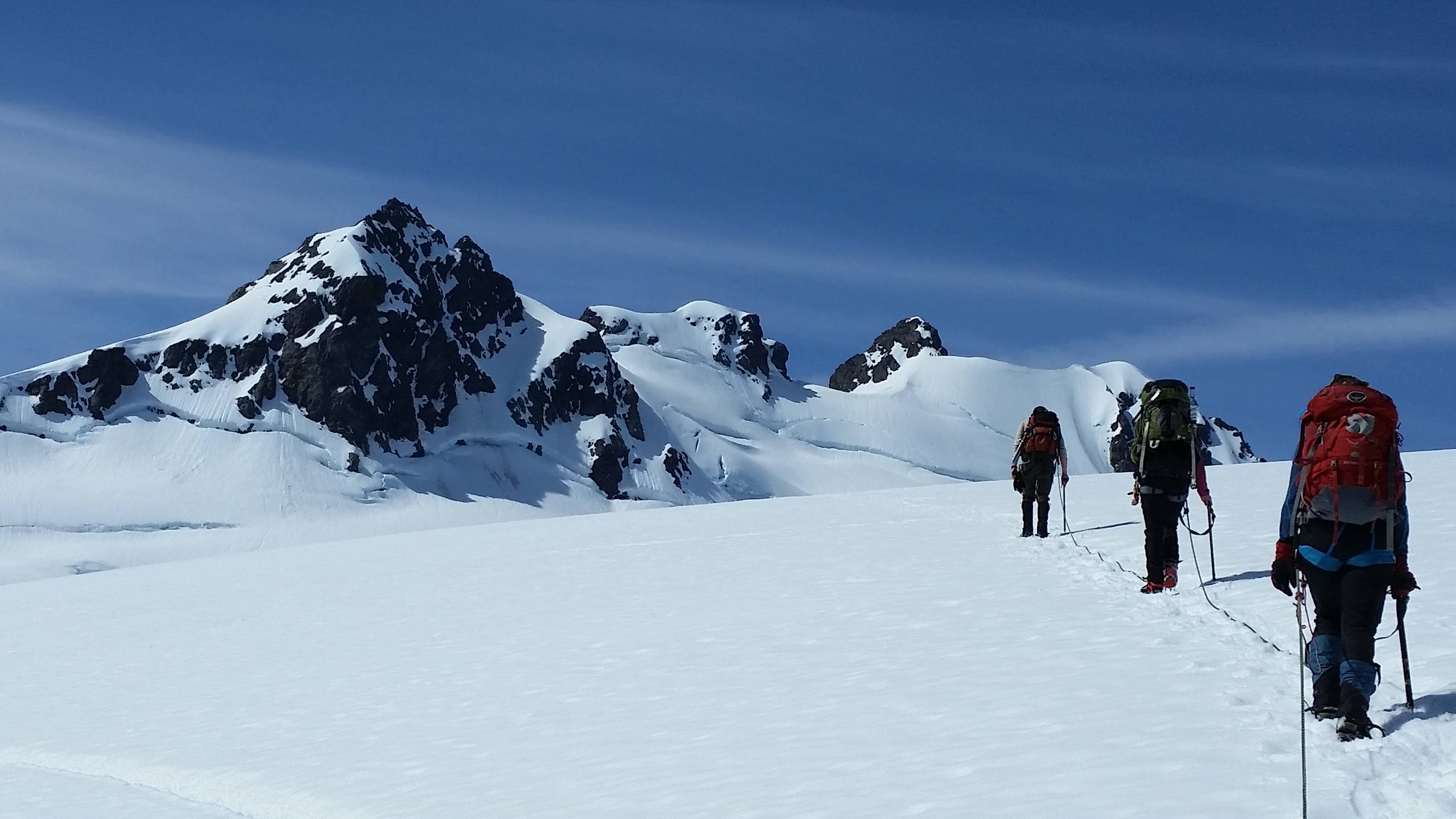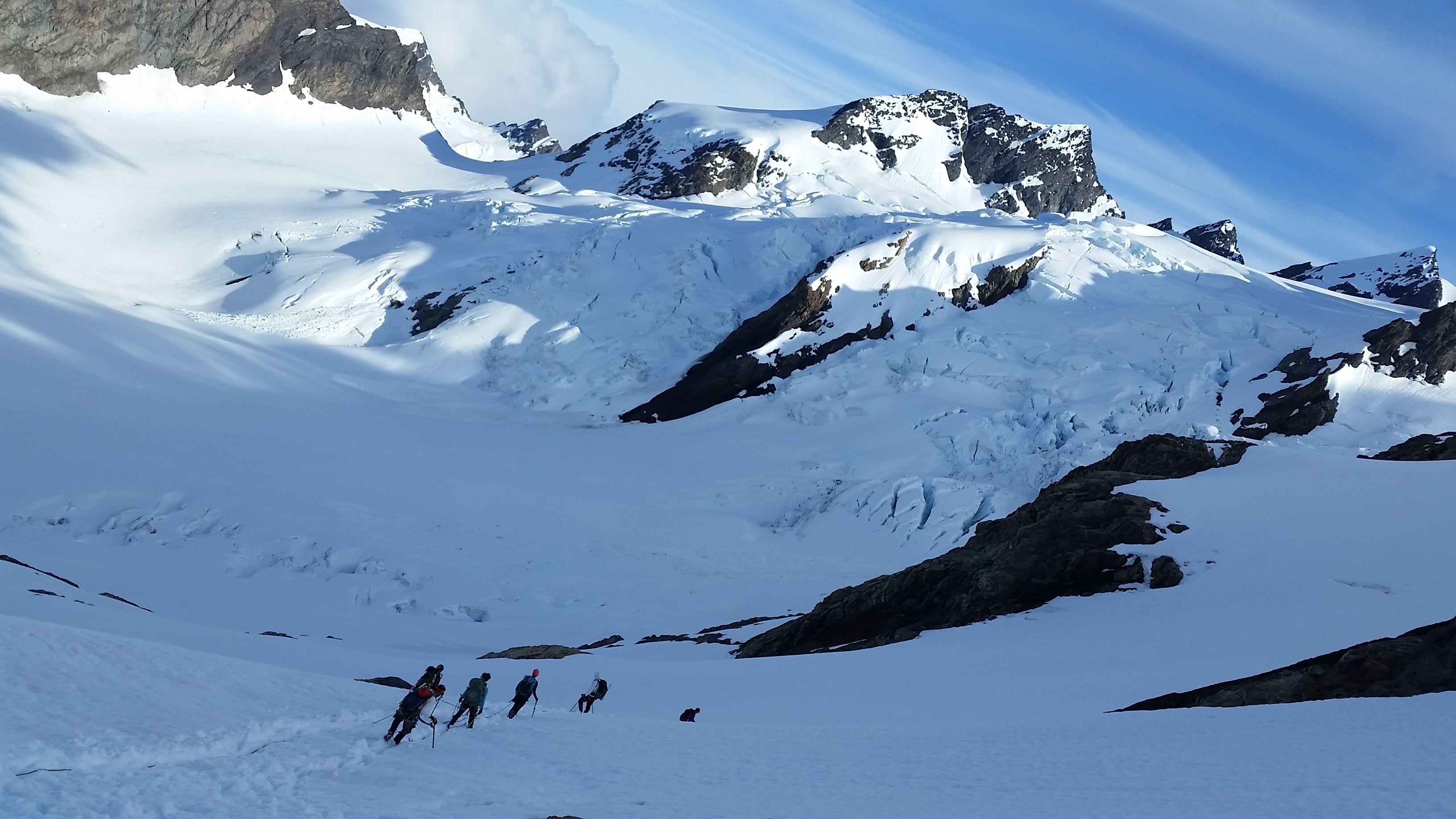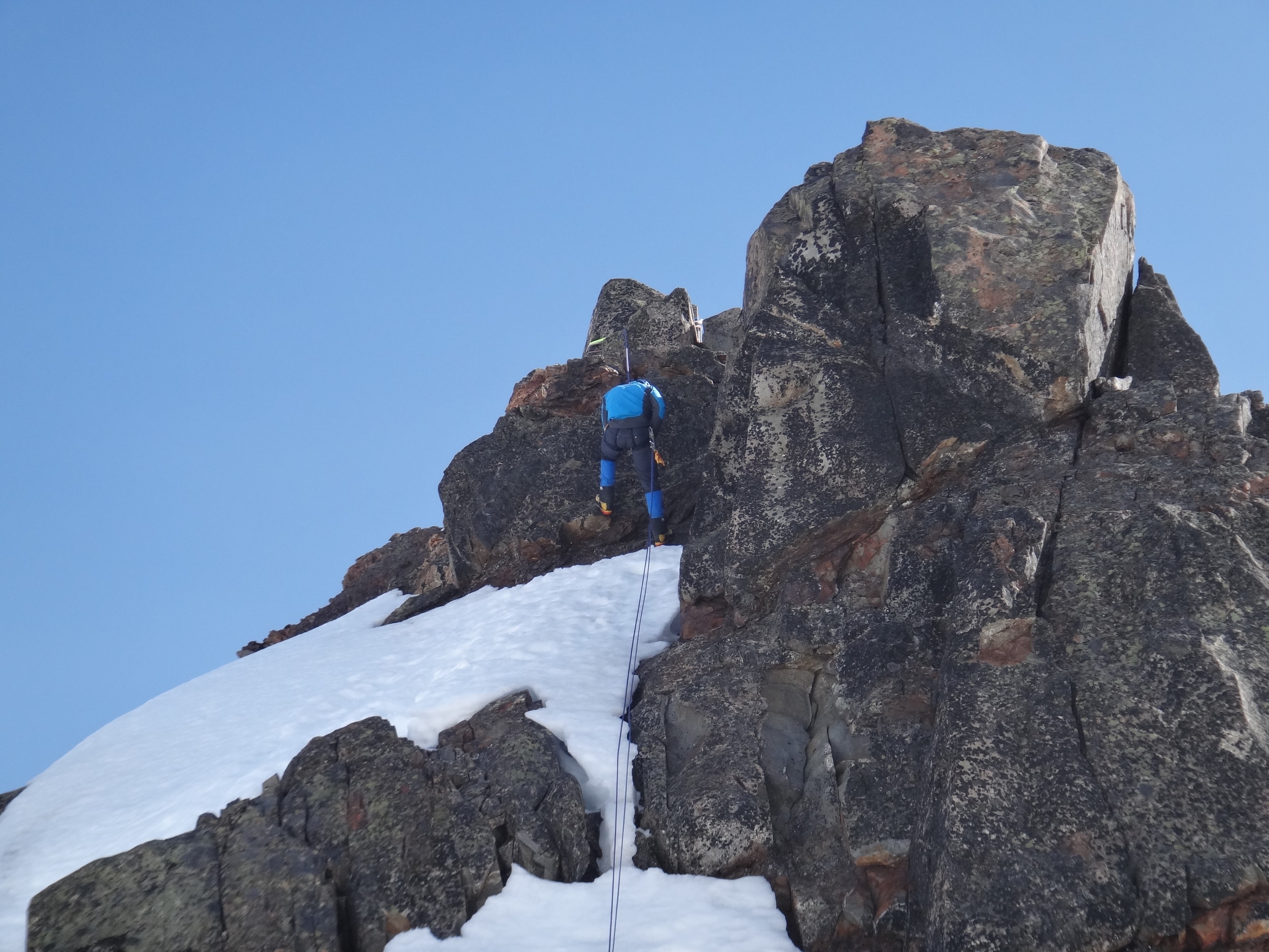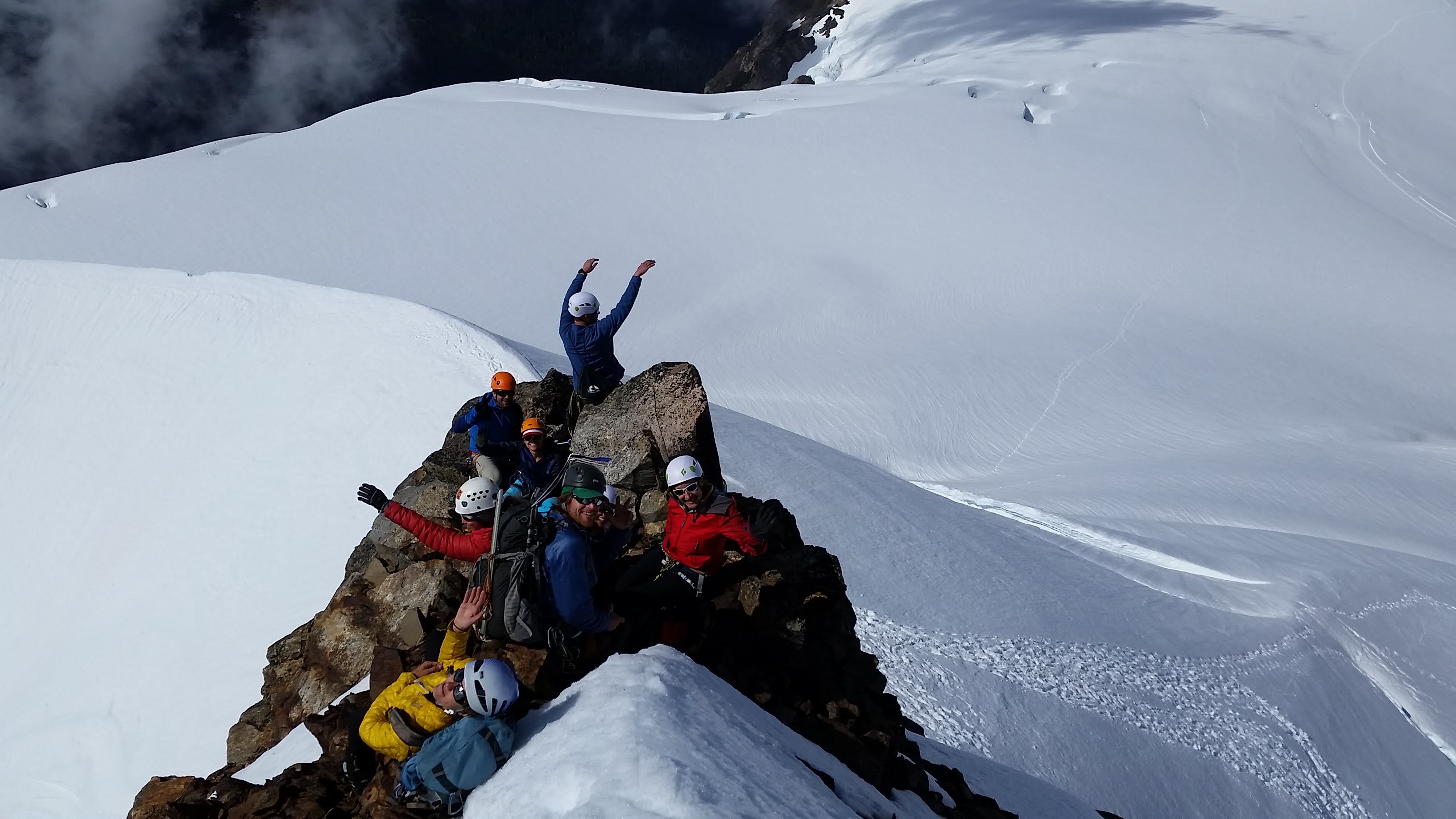 The final approach was a steep down followed immediately by a steep uphill to a flat spot just before the summit. The summit itself is a 300 or so foot high rock outcropping that requires some technical rock climbing to reach the actual summit - but more on that later. For now, this was the last big push on the glacier before something new