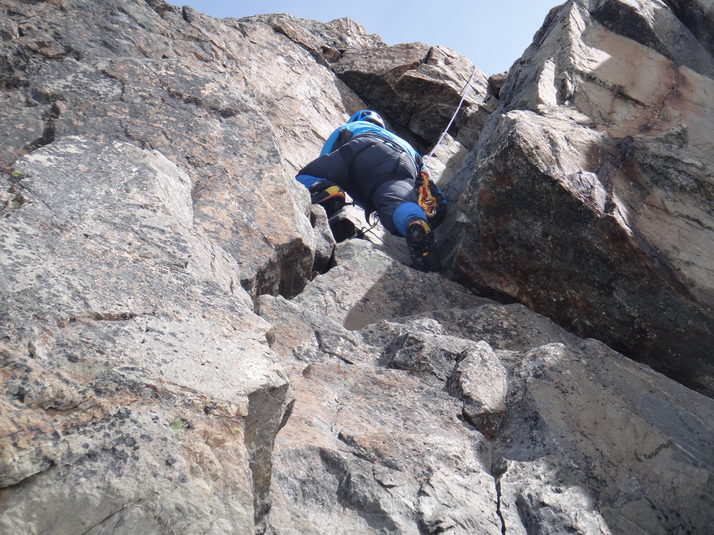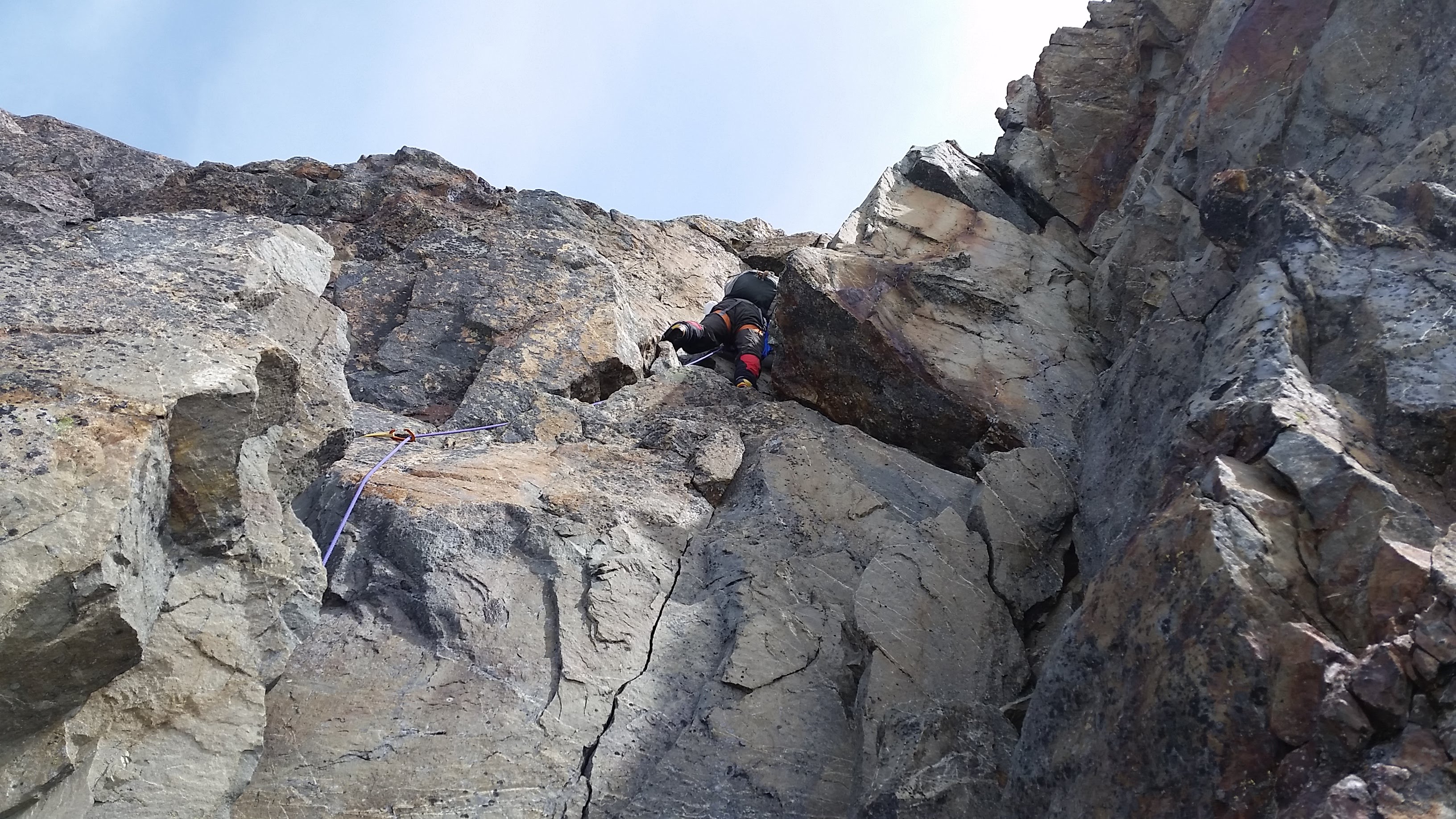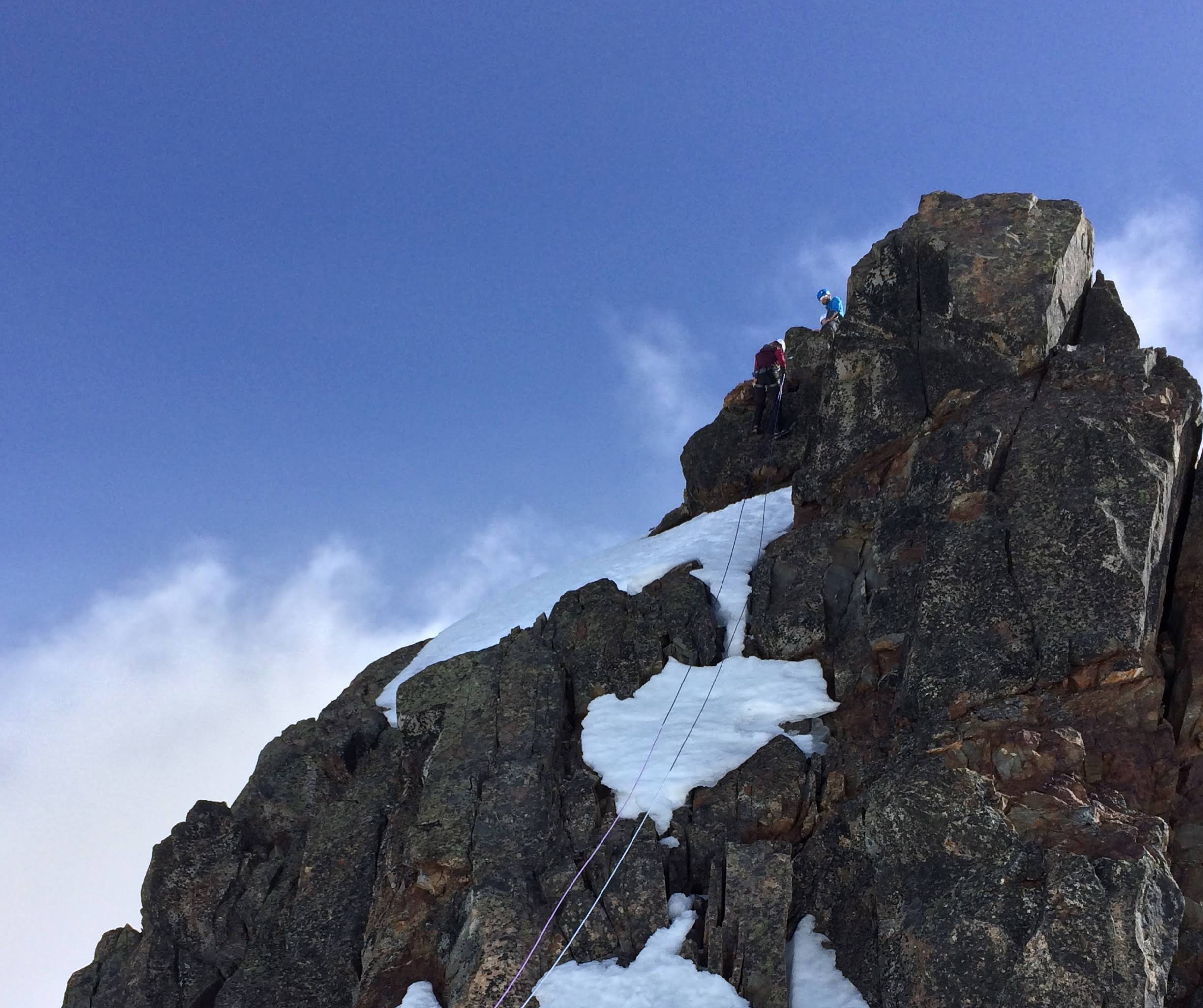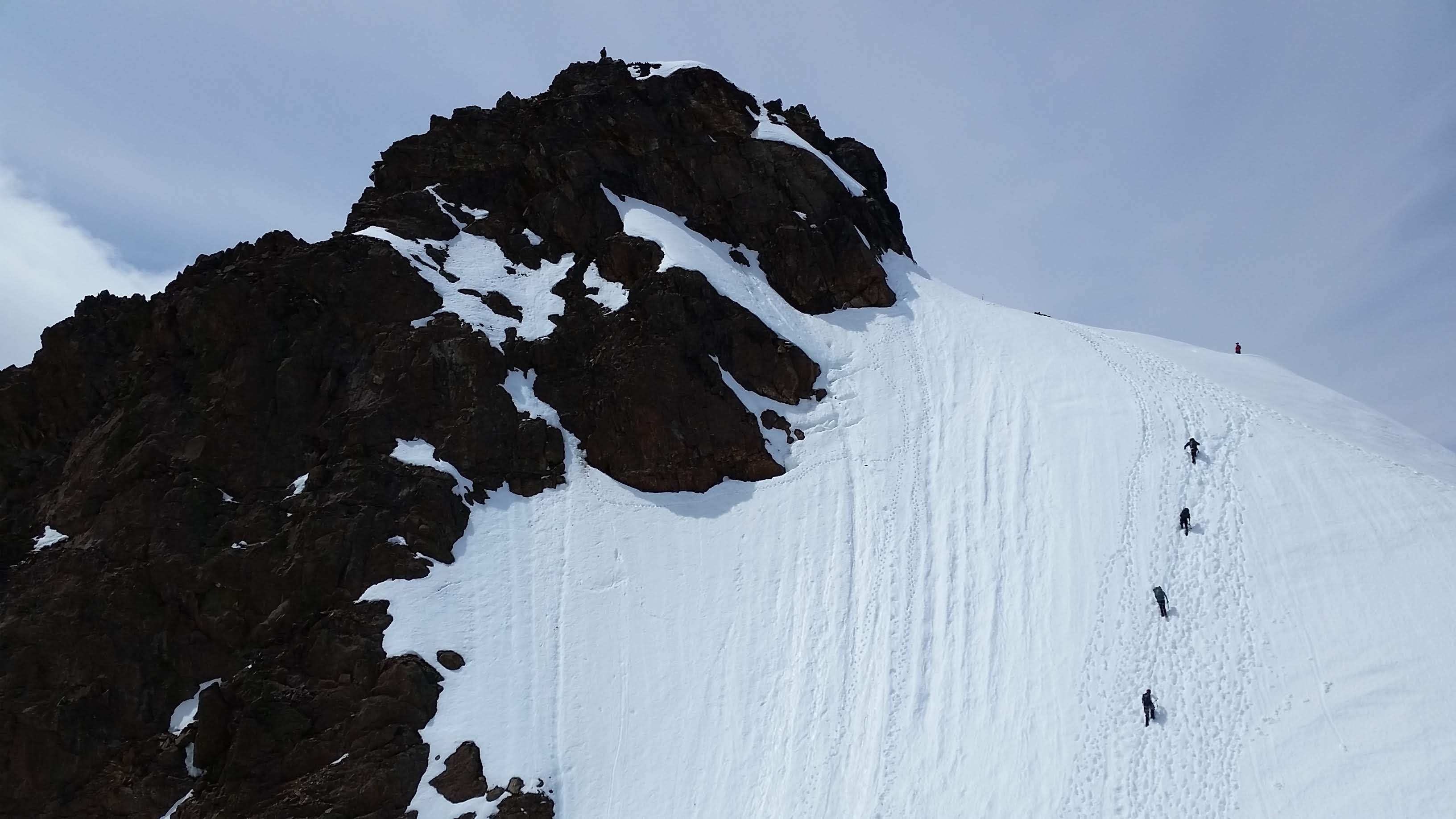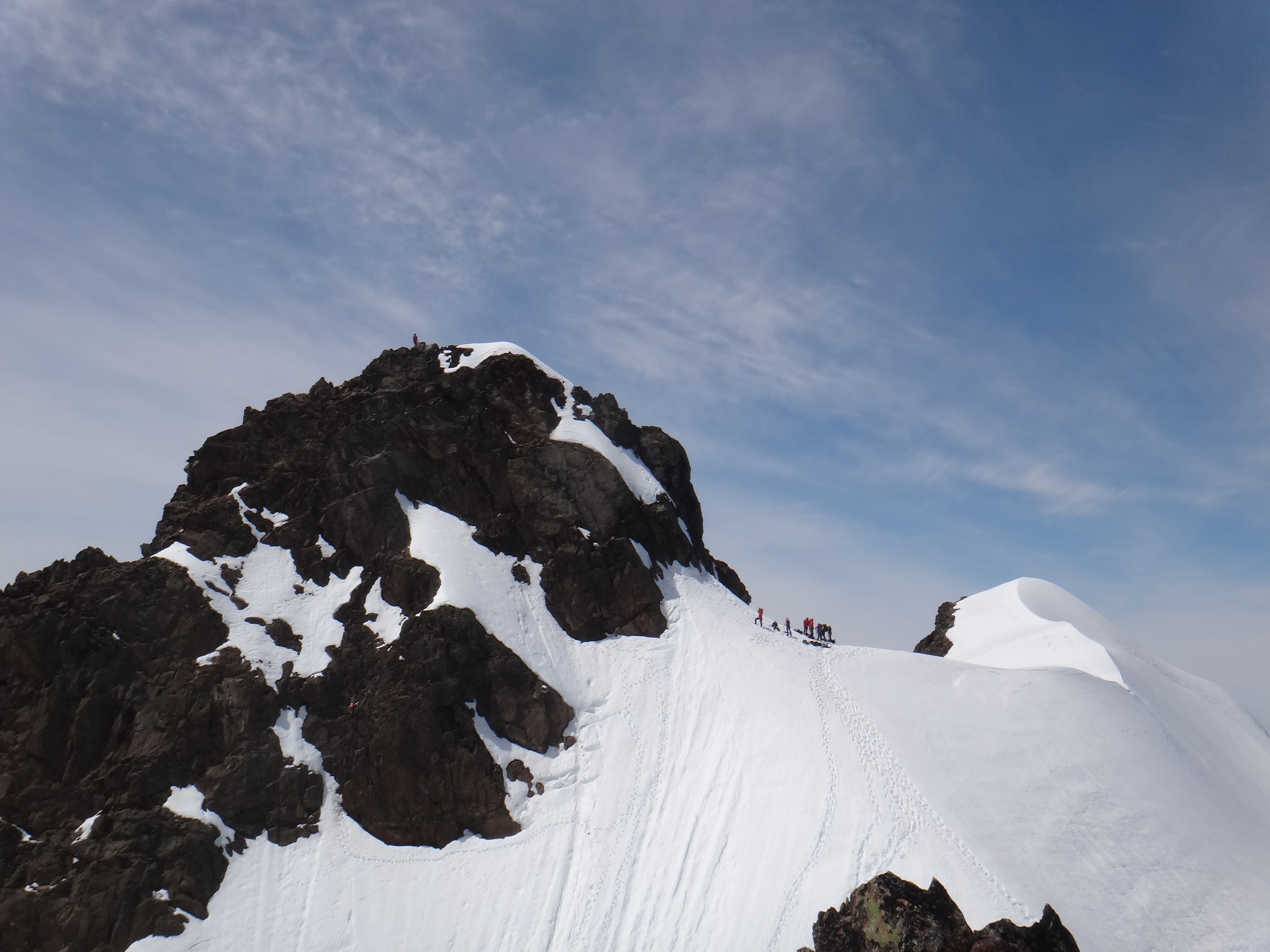 The long corkscrew ends with a peak that’s directly opposite from the summit, with a deep canyon in between. It’s a bit of a bummer, because you are just slightly below the summit in terms of elevation, but you have about 500 feet of down and then back up again to do before you get there. On the other hand, it’s amazing to see the summit from this angle - There was one other climbing group on the mountain today and we got to watch them make their final approach and start the final rock climb to the summit. So, we decided this would be a good spot to take a rest and enjoy the view before we made our final push to the summit.
