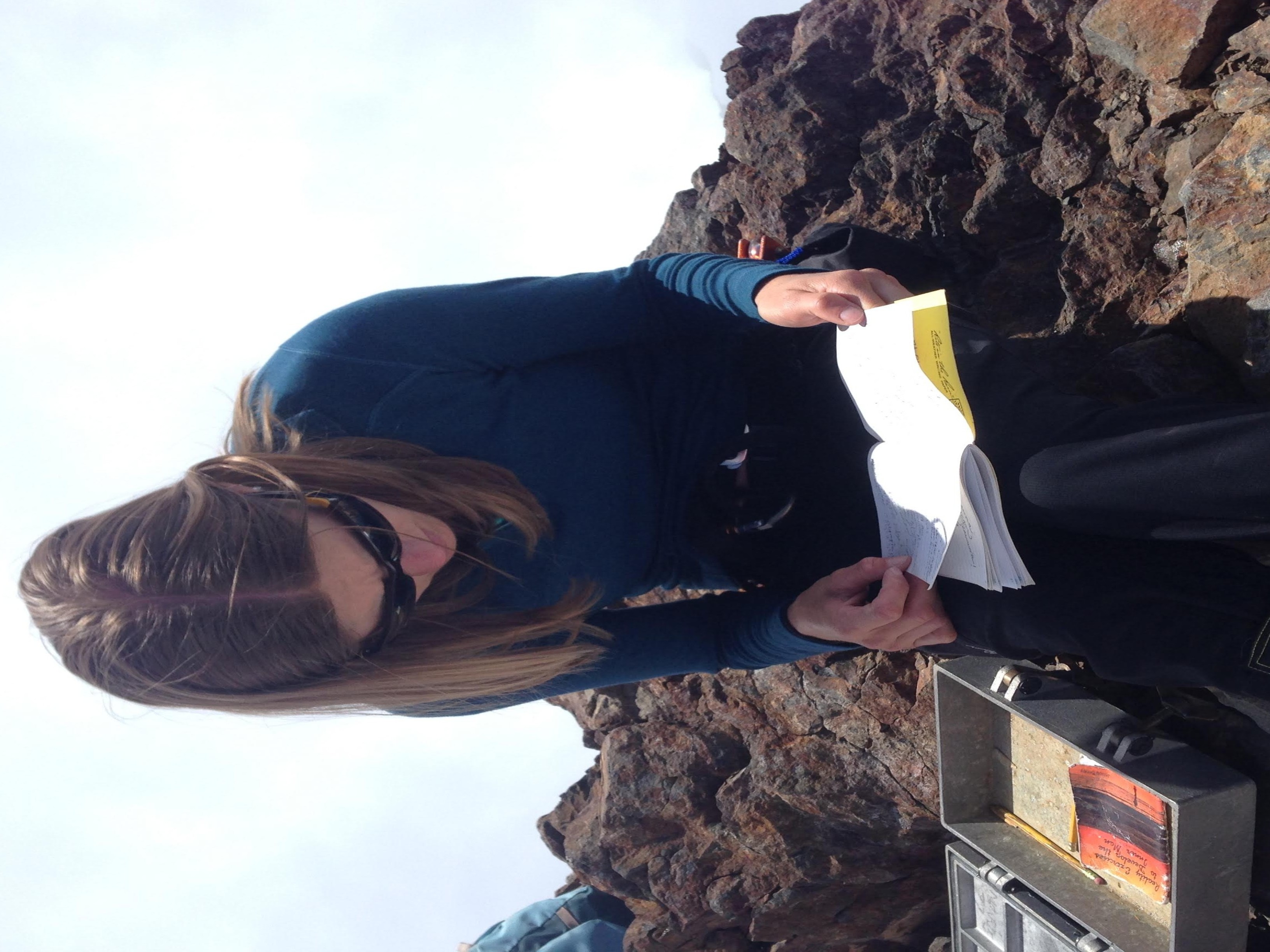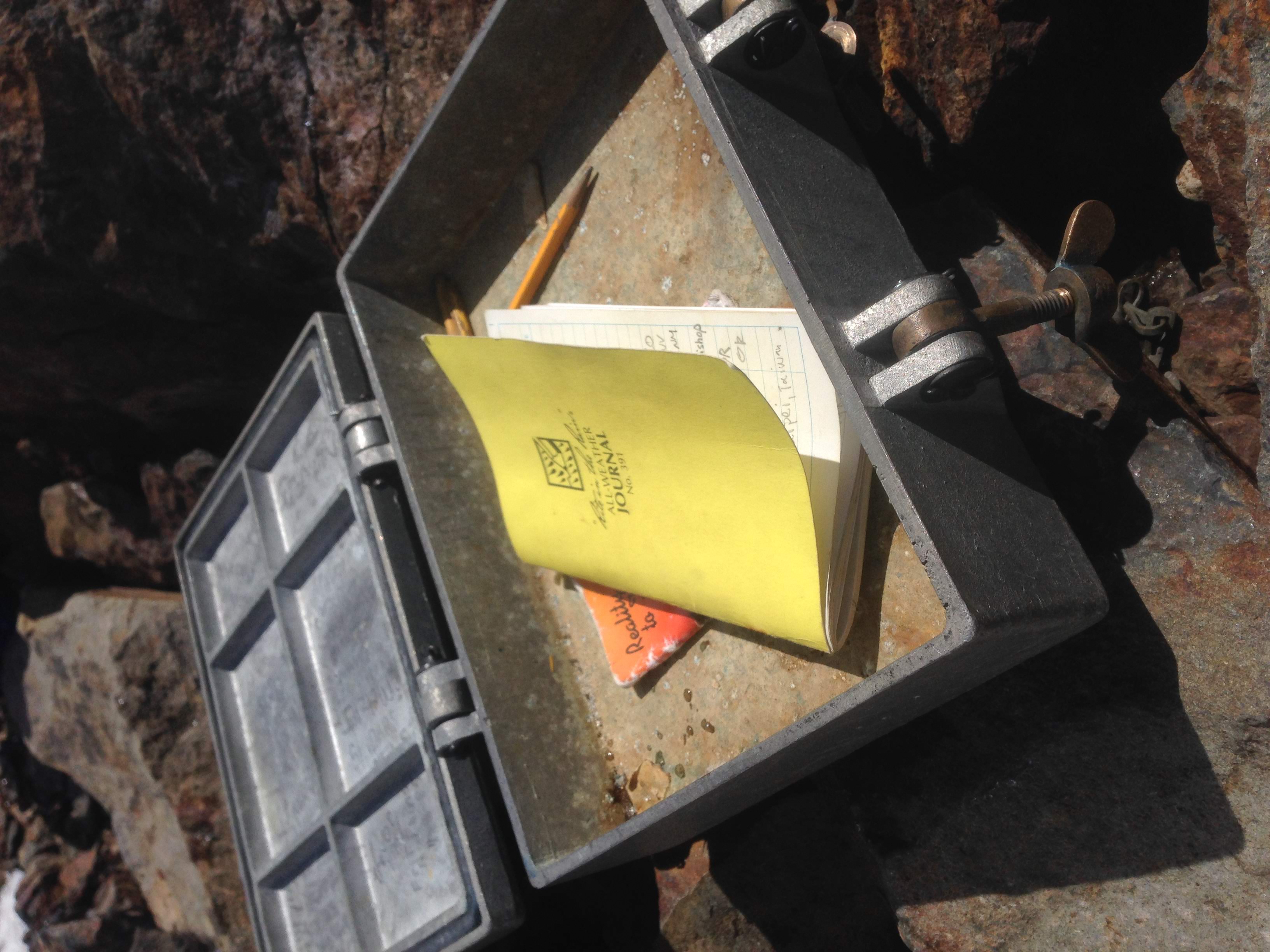 There is was a USGS tag on the summit and a small case with a summit log in it for us to sign. Team Tiny Tent! Stacia spend a few minutes reading some of the other entries for us - so many different walks of life…