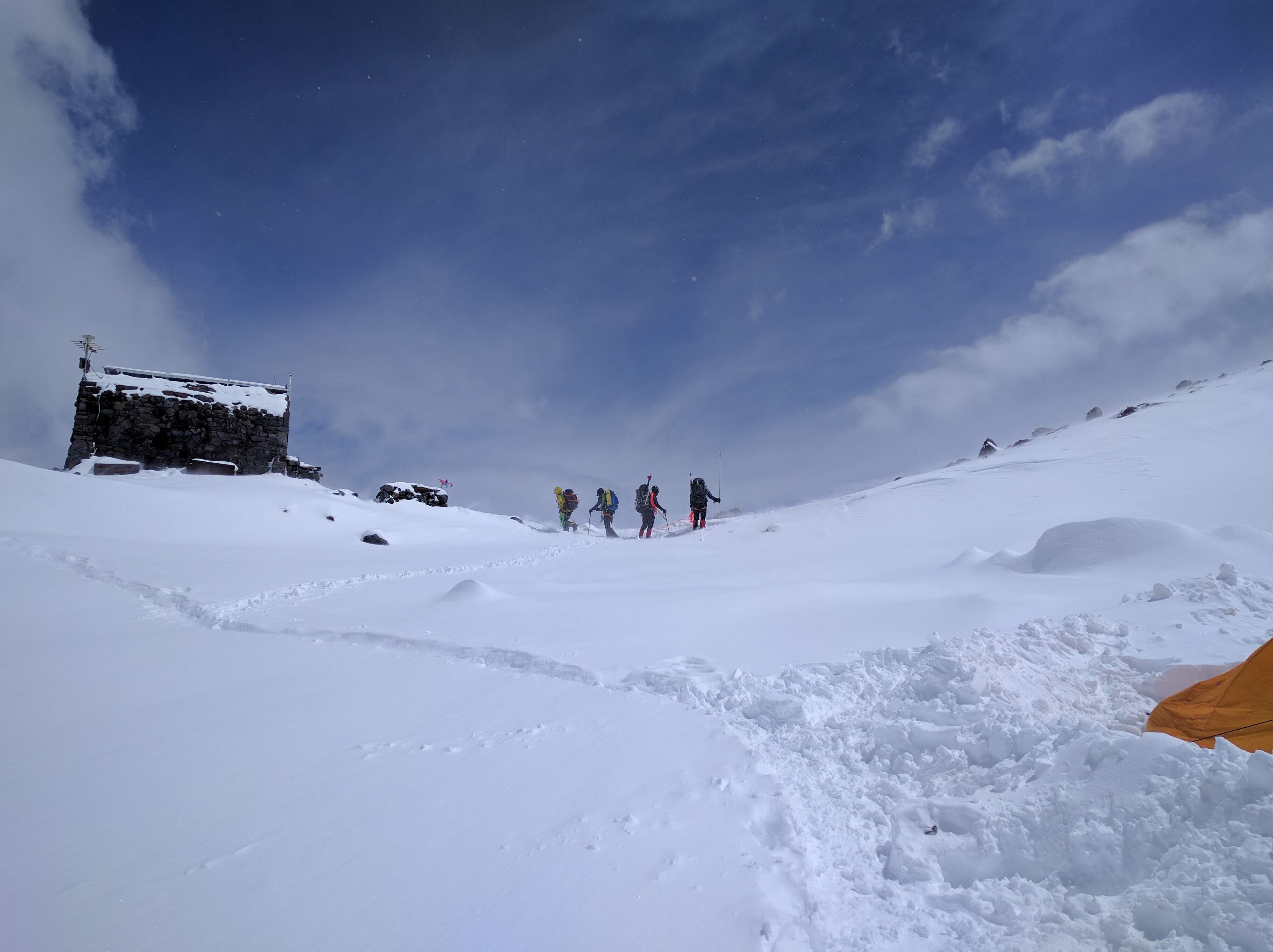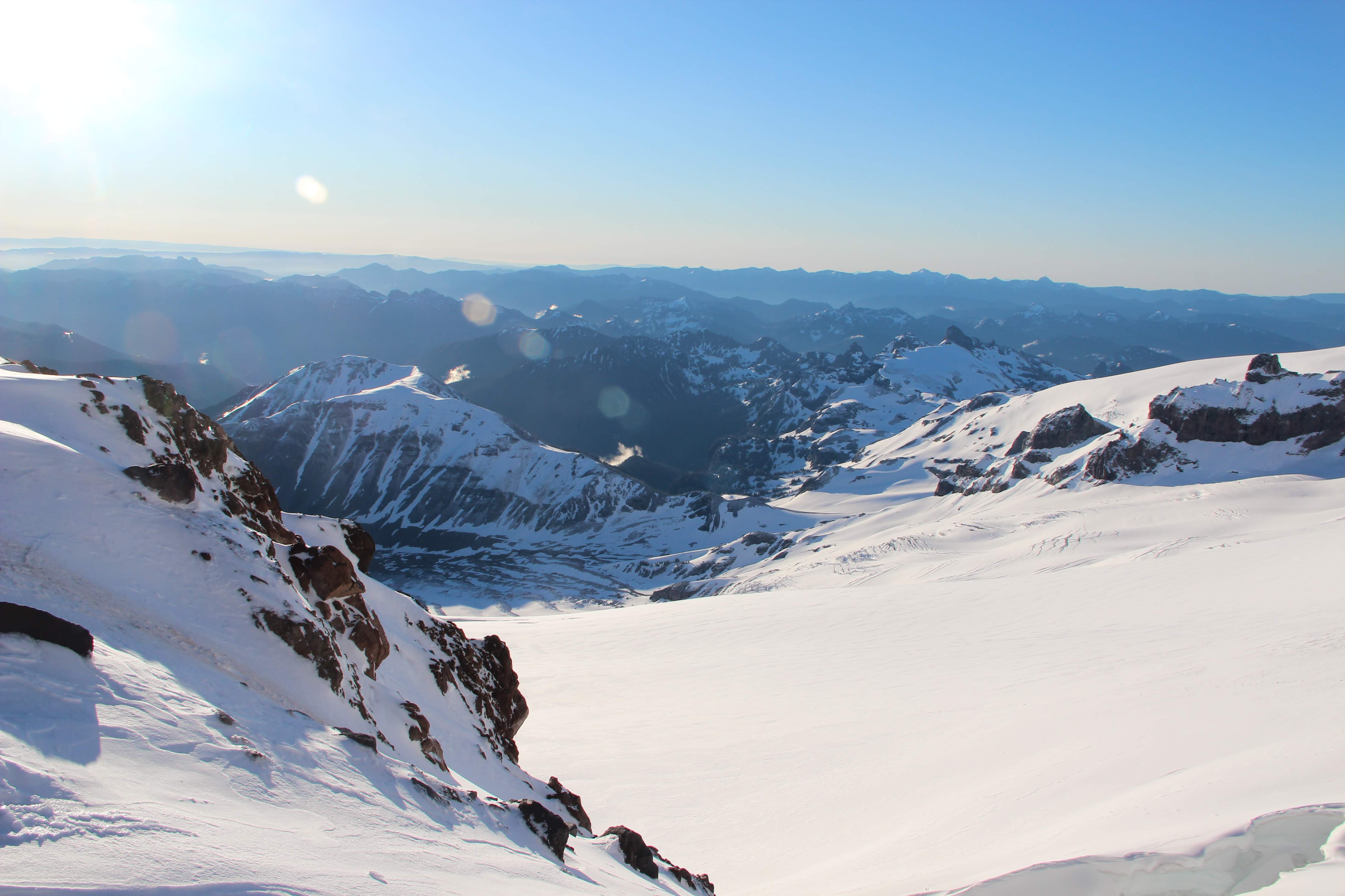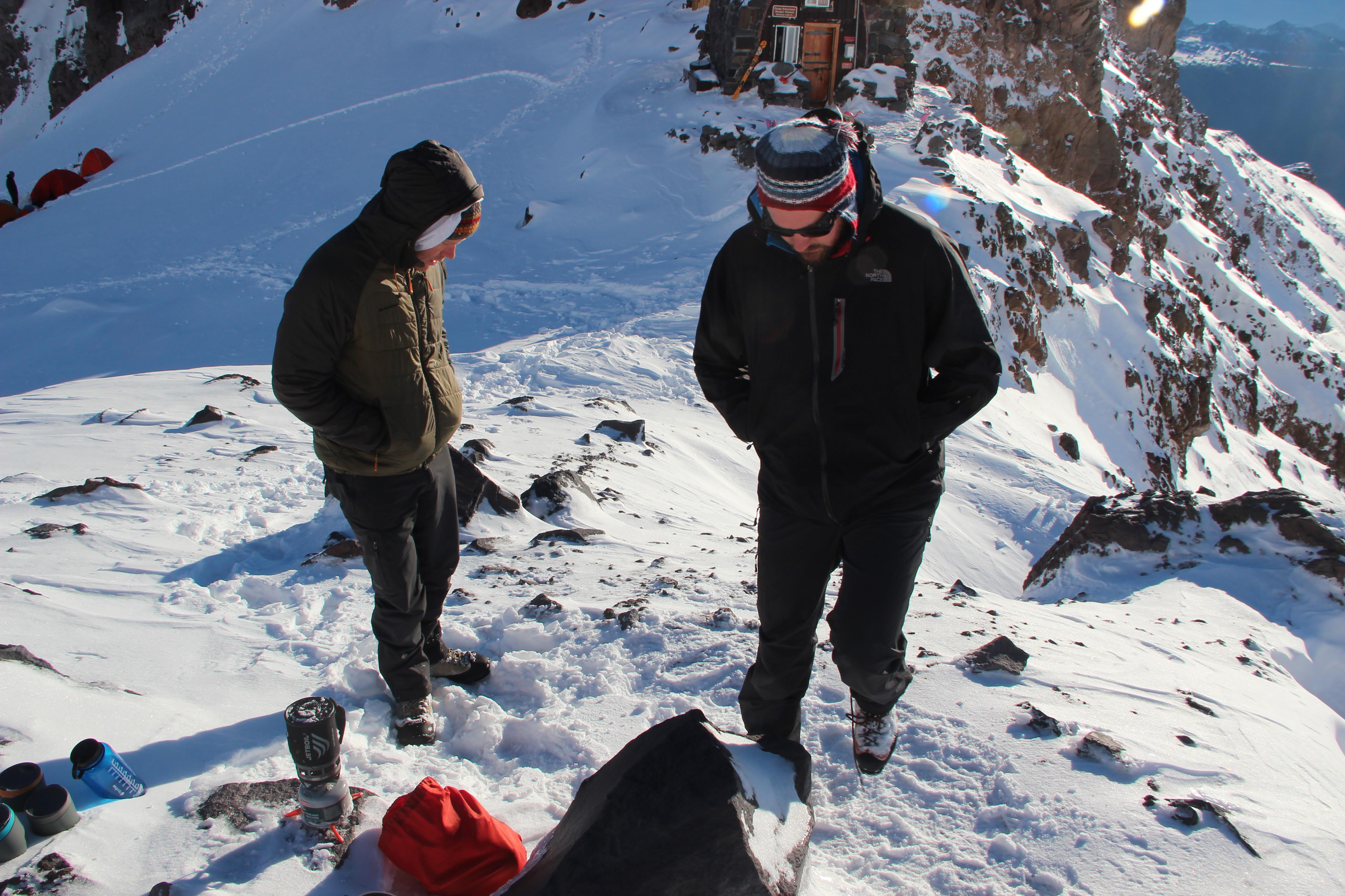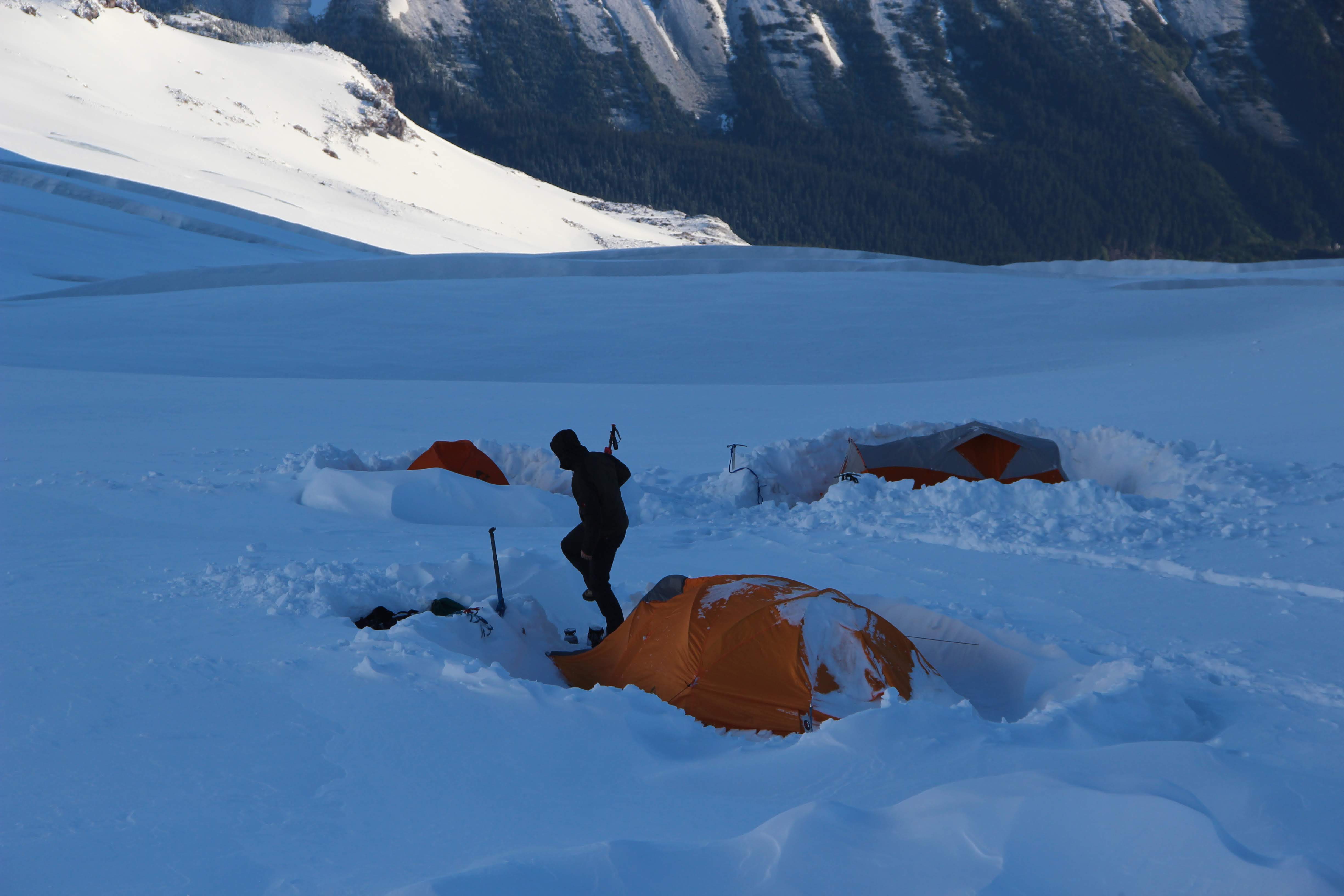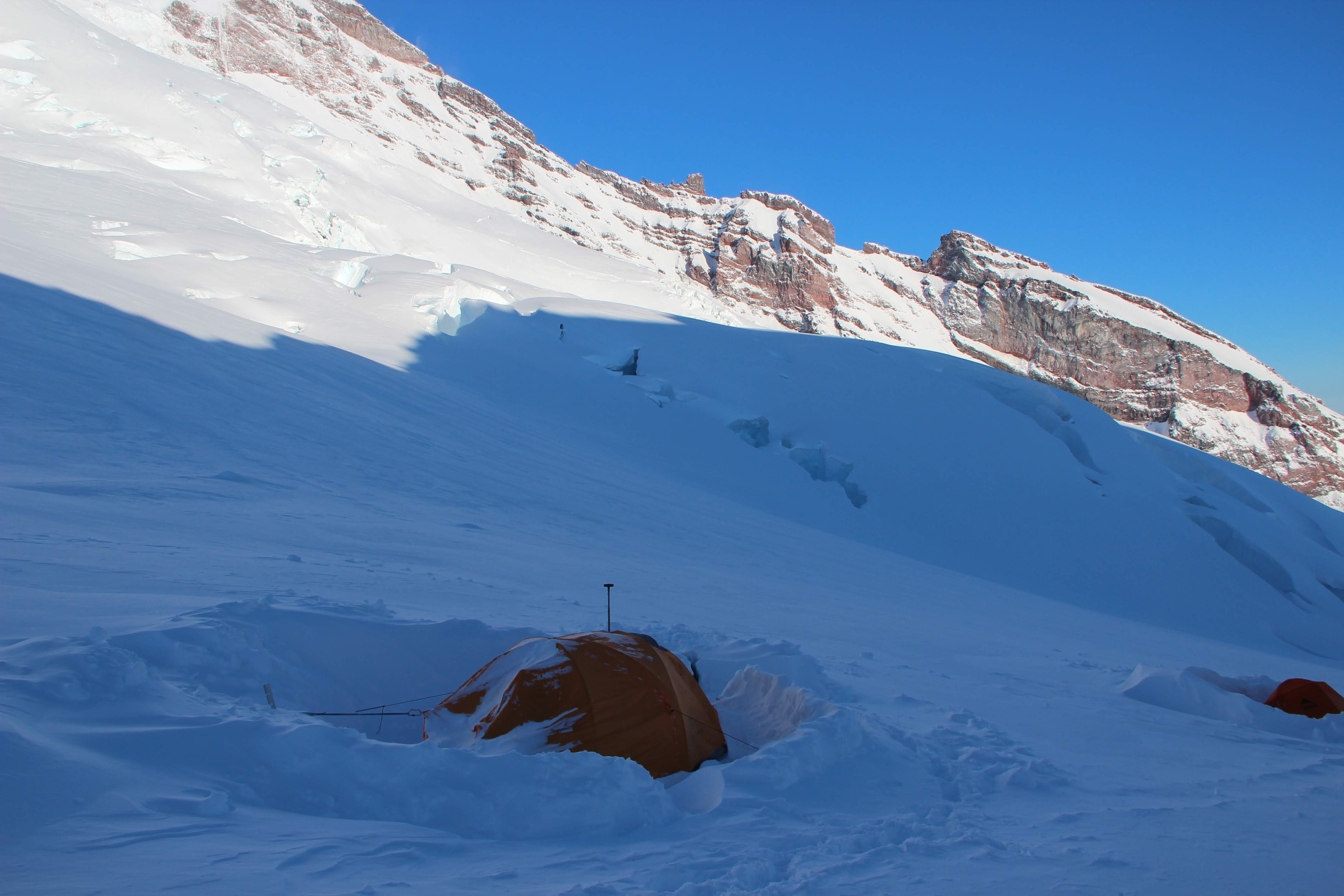 We took a look up at the summit approach the next morning and it was pretty obvious this wasn’t happening. We considered for a moment hanging around til the next day to see if the sun would harden things, but we had flurries comming in in the afternoon and decided to head on down. We watched one team make an attempt, but they barely made it to the start of the Emmons climb. The ranger told us it would probably be 2-3 days for things to settle before it was worth making an attempt - and then did a nod towards the team that made the morning attempt…