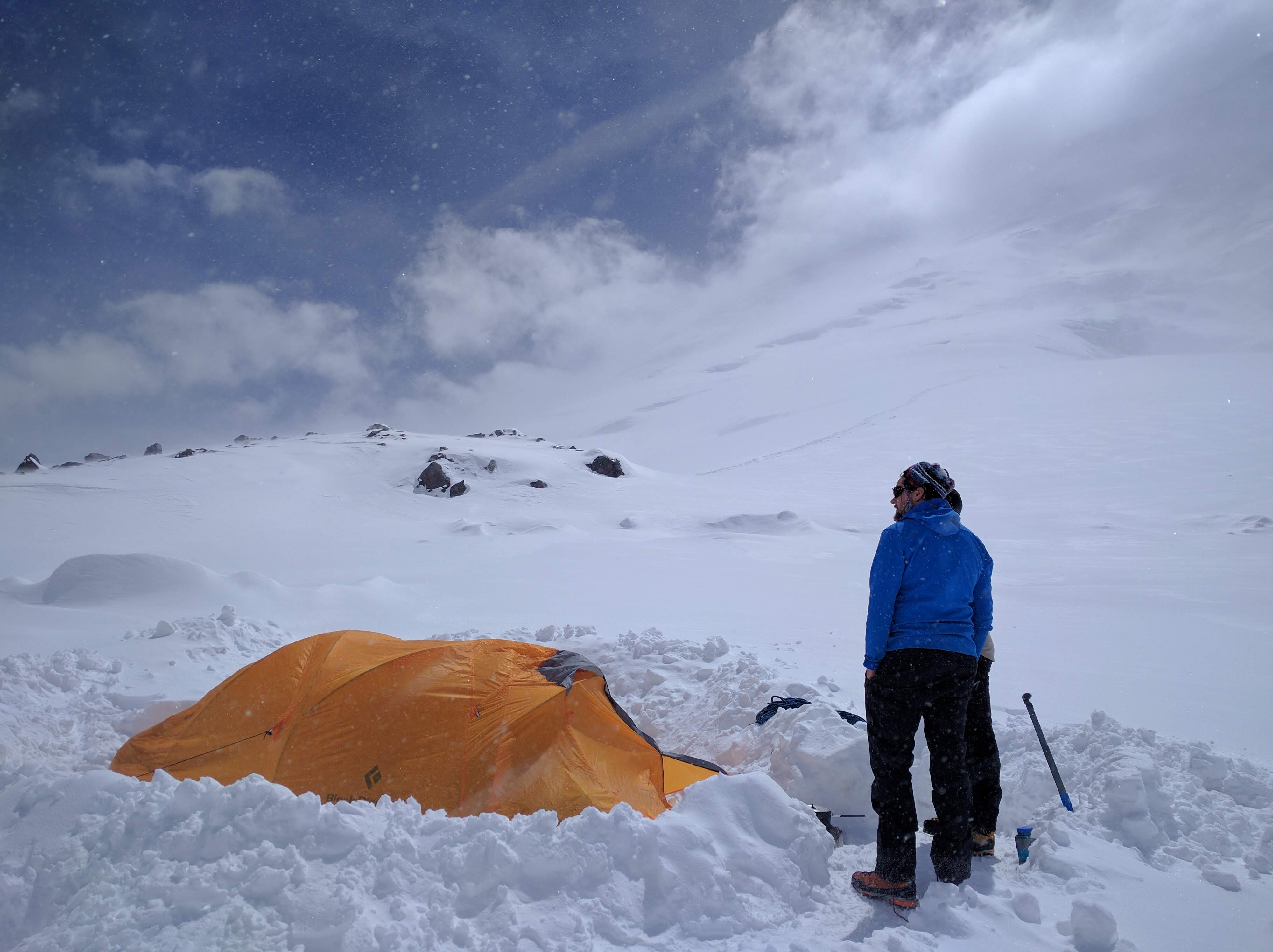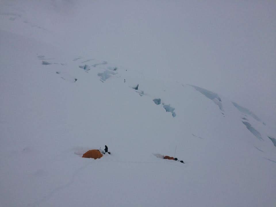 About 2 hours after that, we were in a whiteout and the snow was becoming increasingly hard to travel through - we were punching through every other step and wasting a ton of energy getting through the powder. The last half mile or so into camp was tough - Mark was in the lead and he was getting smoked as we finally got up on camp. The cravasses were preatty open, surprising with how early it was in the year, so we had to make a pretty big detour before we were finally able to circle in and get to camp. We quickly setup camp, as the snow started to come in harder and harder. '