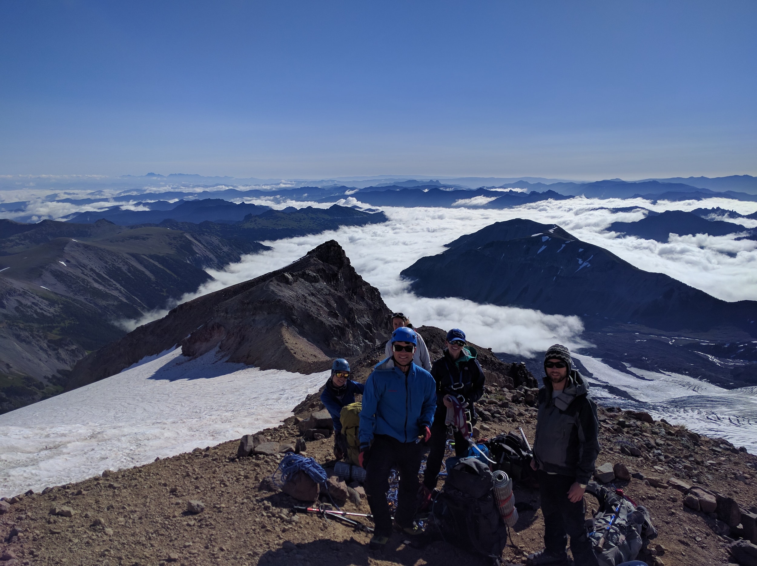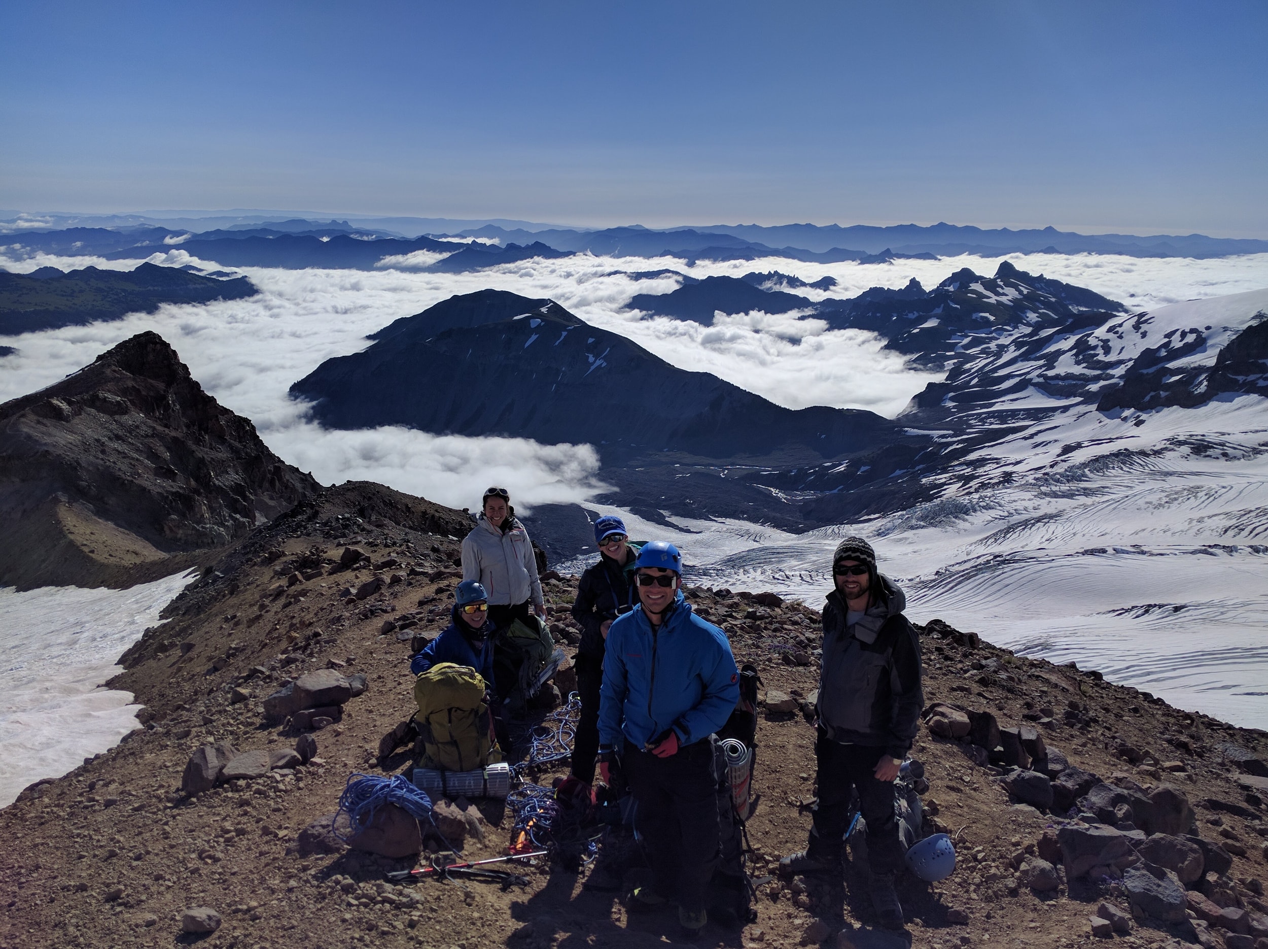 The trip involved a whole crew of folks - including my wife and I, my cousin Sean and his wife, and my brother. Everyone flew in on a Thursday and we headed up to camp on Friday, heading up the Edmonds-Winthrop route again. The first part of the climb was pretty standard - sunny morning and we made quick progress up to the point where we rope up and drop down onto the glacier. We had done a few training hikes, which was good - everyone was strong and in good spirits.