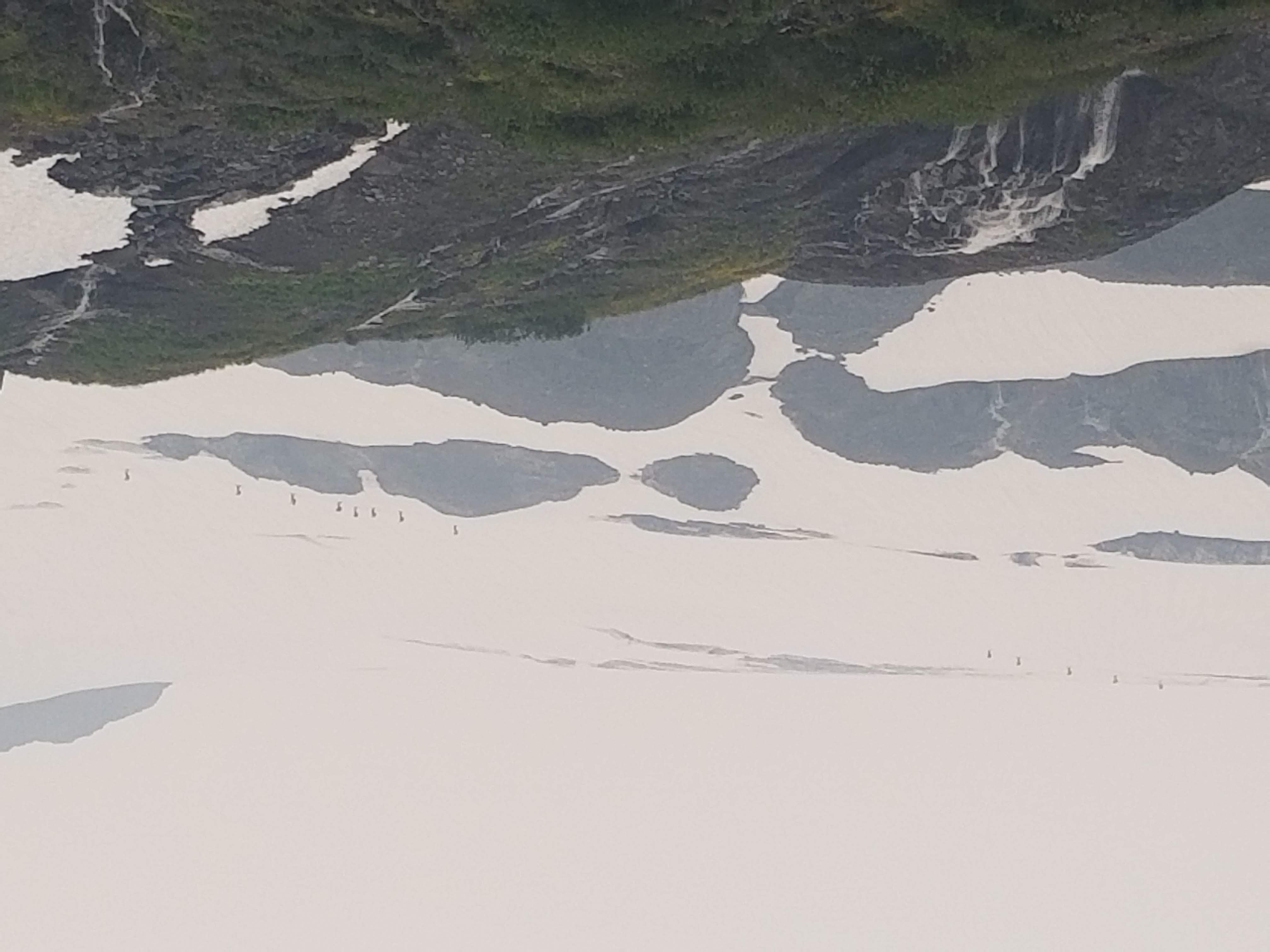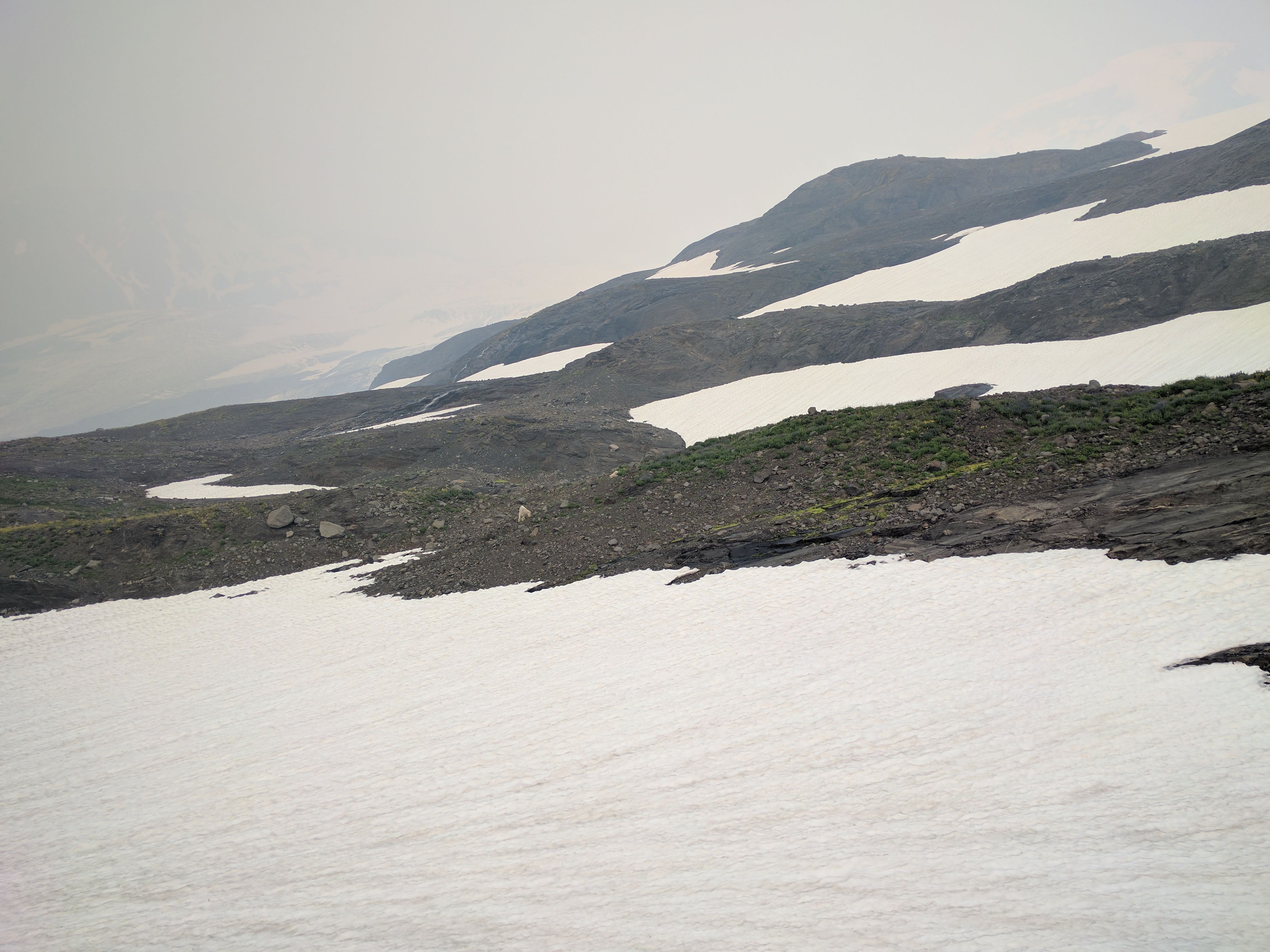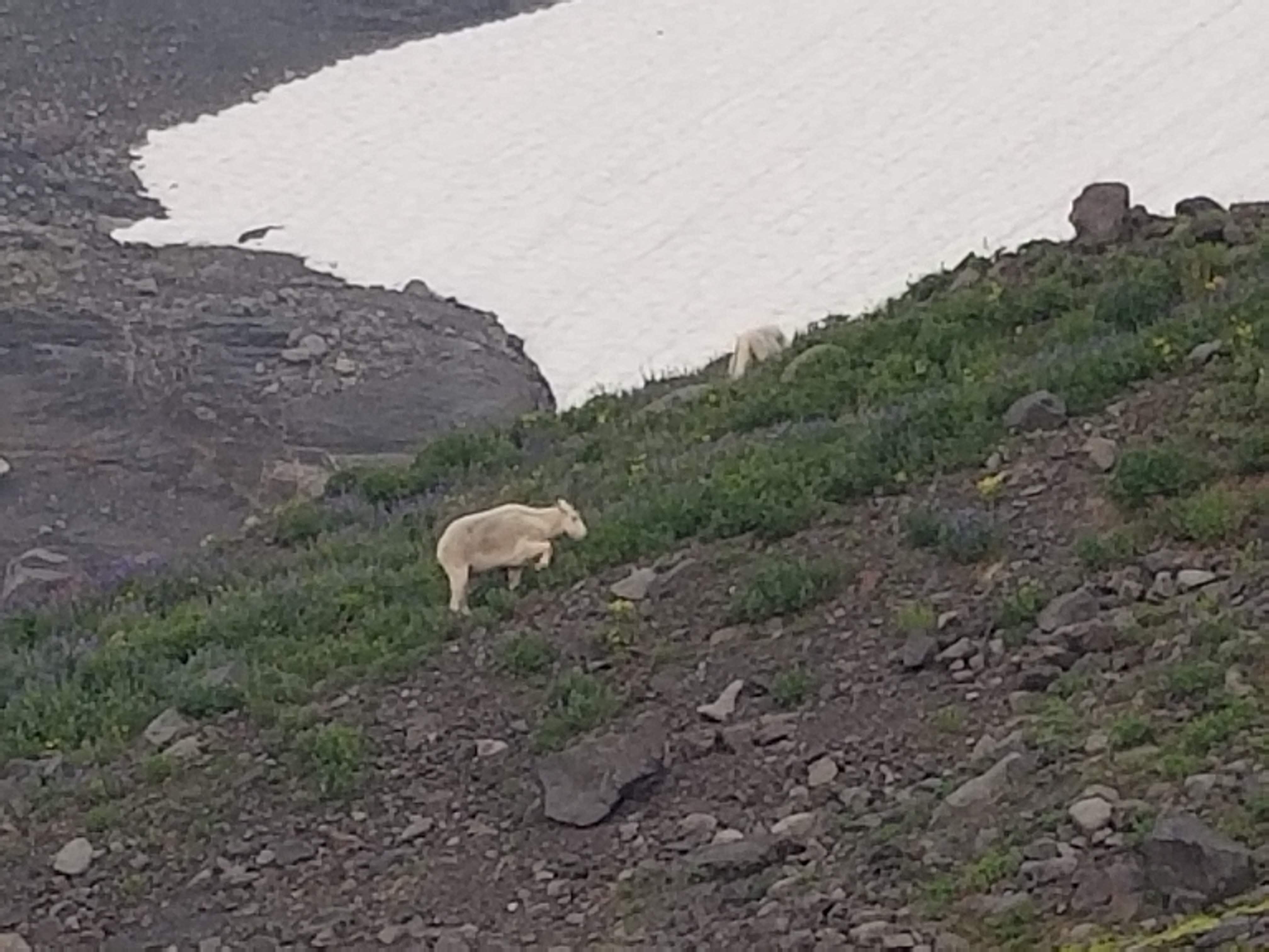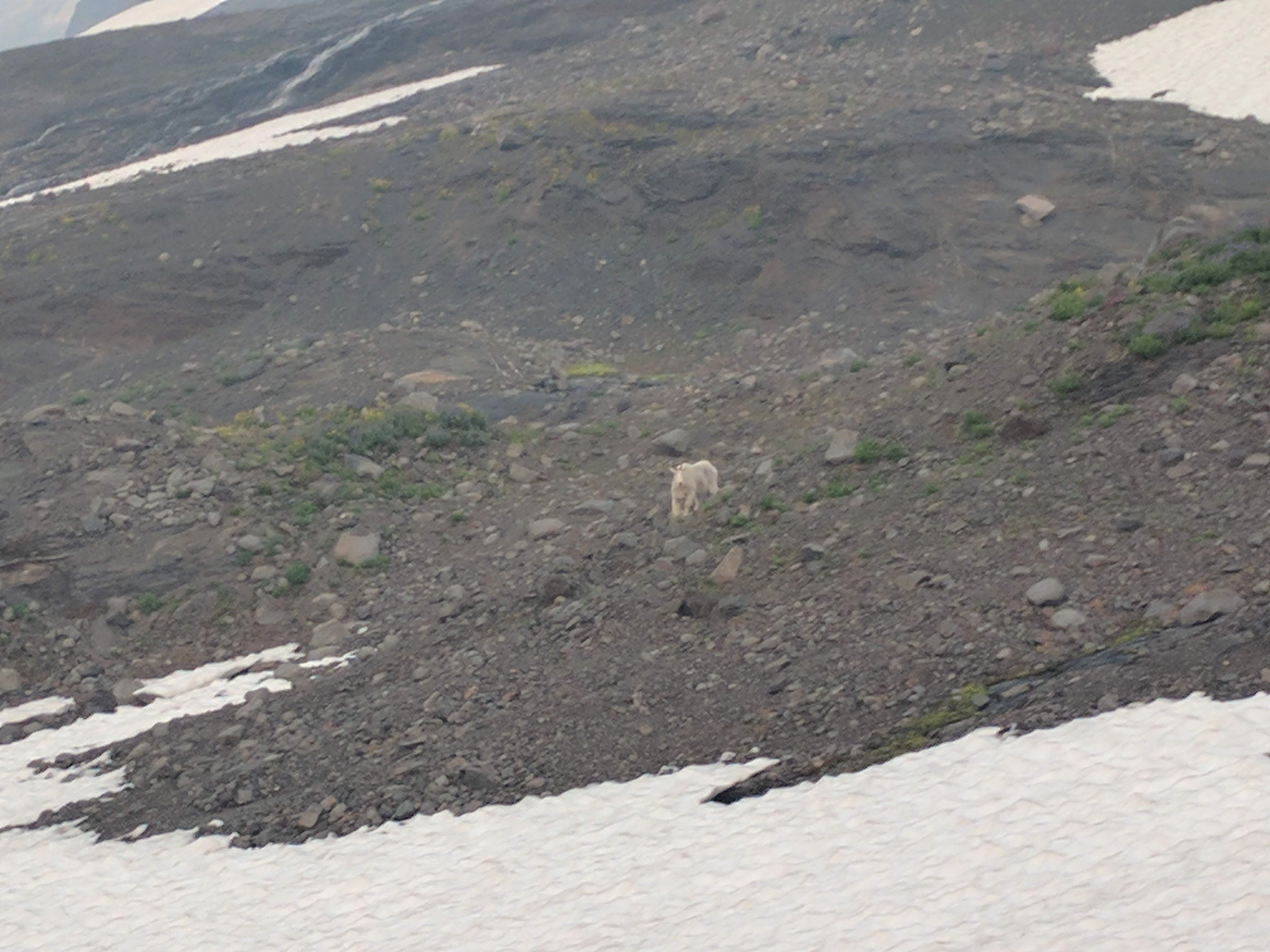 We had a few visitors for dinner - 3 moutain goats stumbled by camp, probably about a mile away. They looked like they were sort of just playing - bounding past each other and over the snow before stopping to eat for a bit.