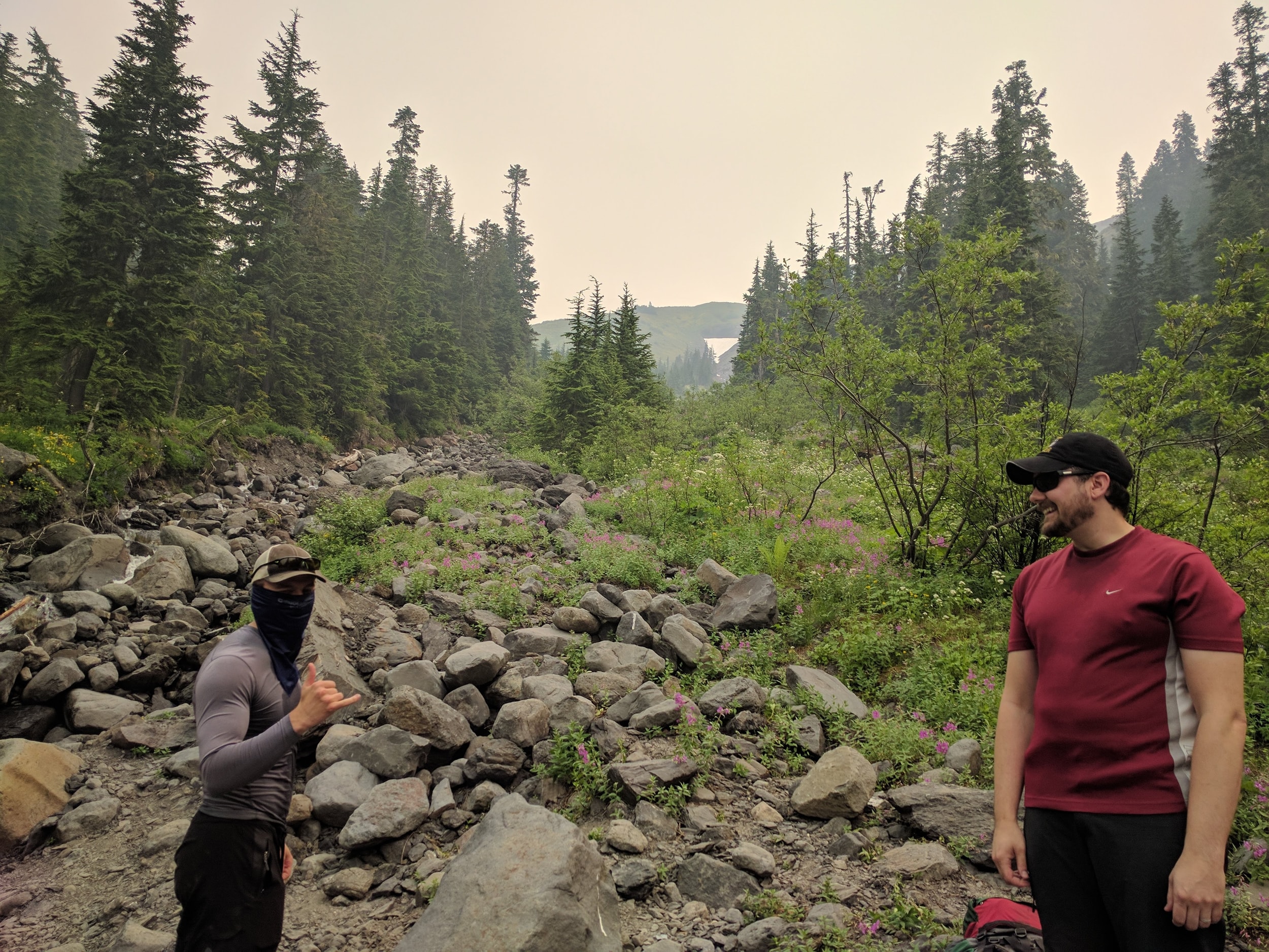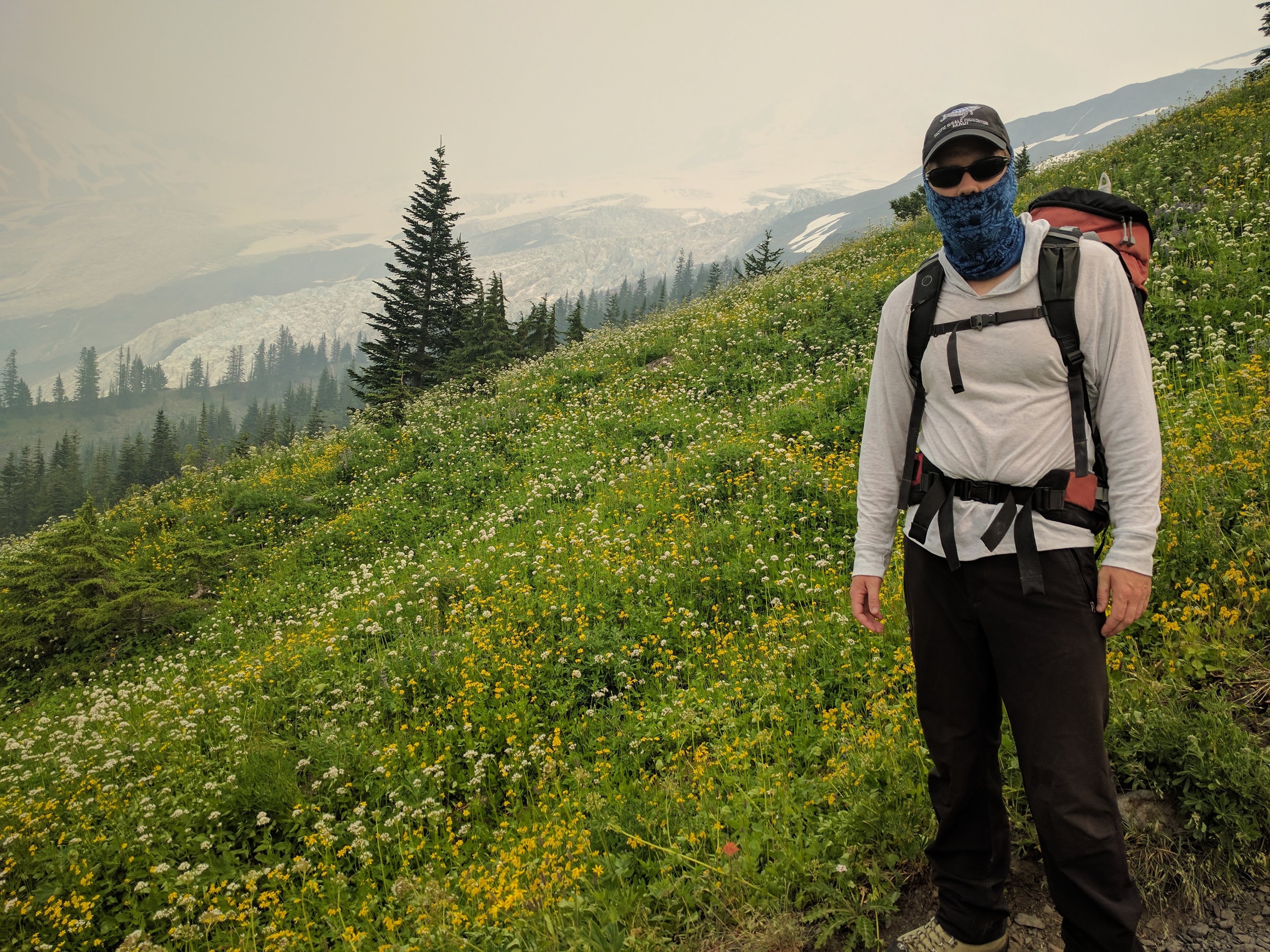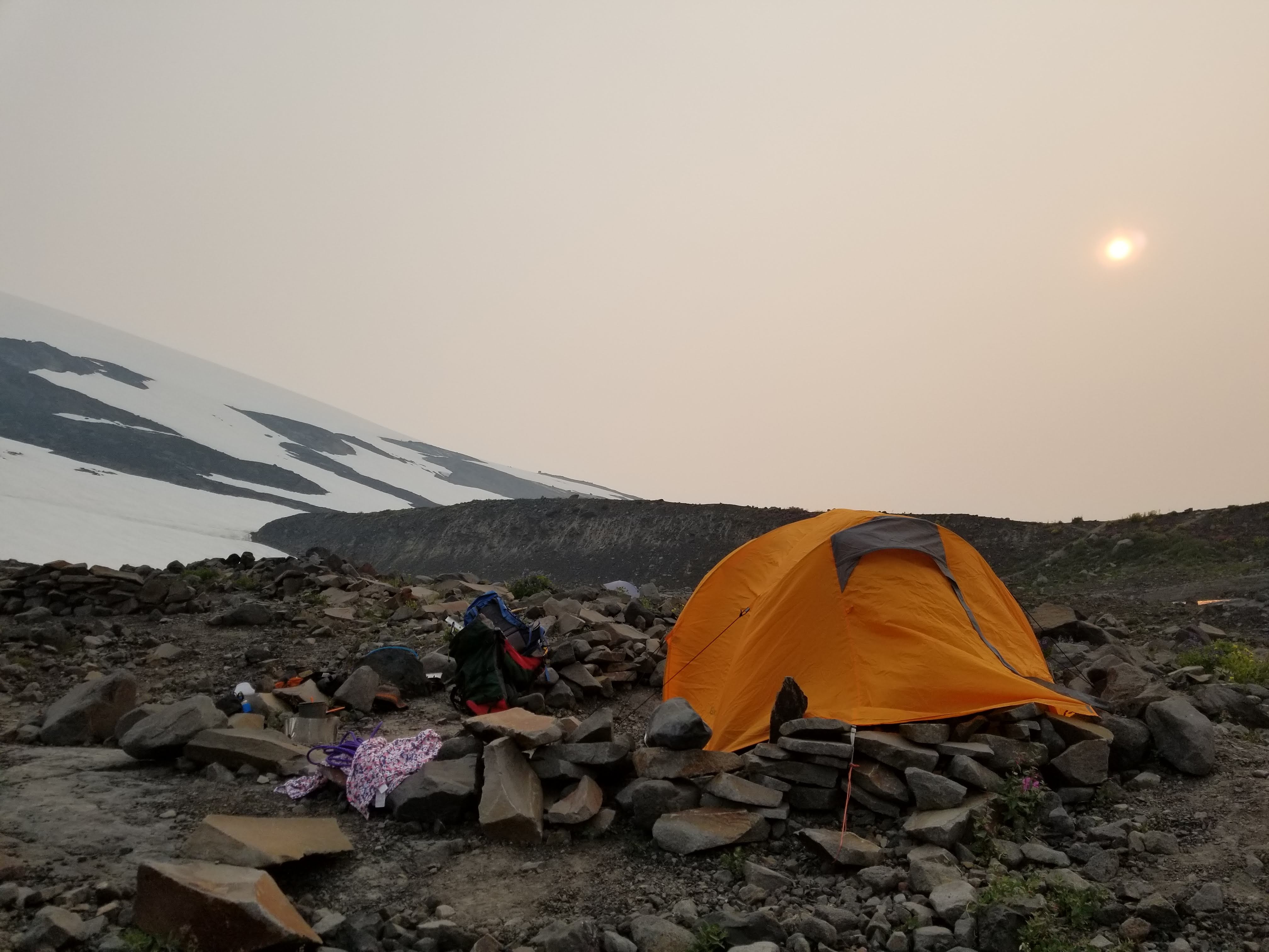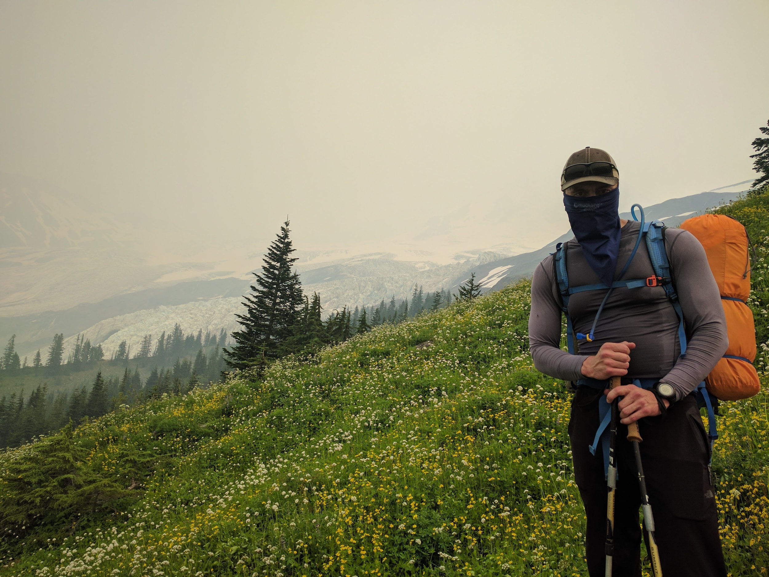 We drove up to the mountain and started our climb fairly early - 7 or 8 am - but it looked like an orange twilight because of all the smoke. The smoke had settled into the low land, so we knew this was temporary until we could get above the treeline - but it was rough for the first 5-6 miles. We had to cover our faces or we would start coughing uncontrollably.