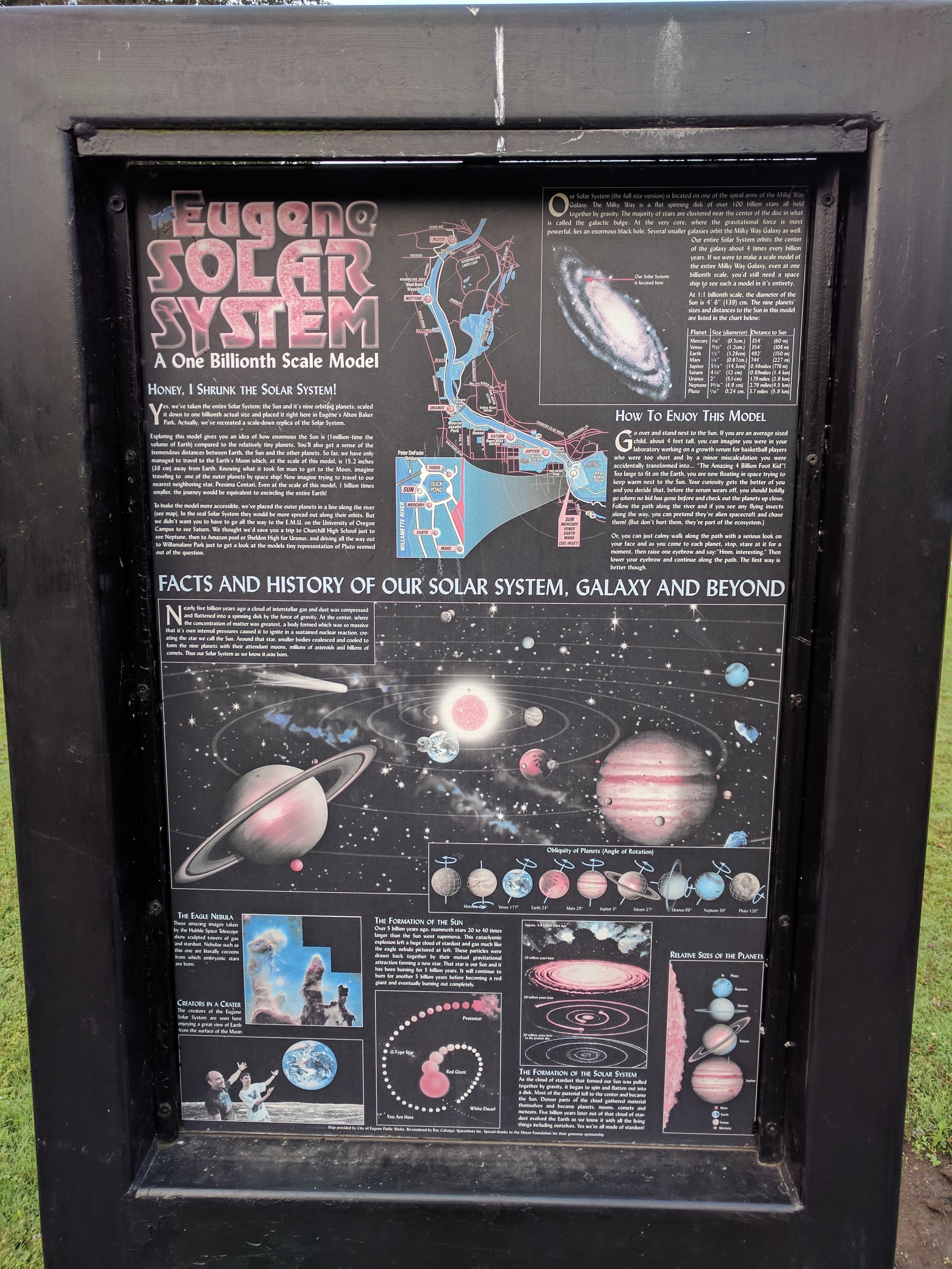 We explored around Eugene a bit when we got there - starting with a very cool idea of build a to scale model of the solar system. the sun was pretty big and the planets were small (as expected) but the distance between the planets was the most amazing part. Everything was right there until you got to Jupiter - which was a bit of a walk to get to. Pluto (which was still a planet when they made this) was over 10 miles away.