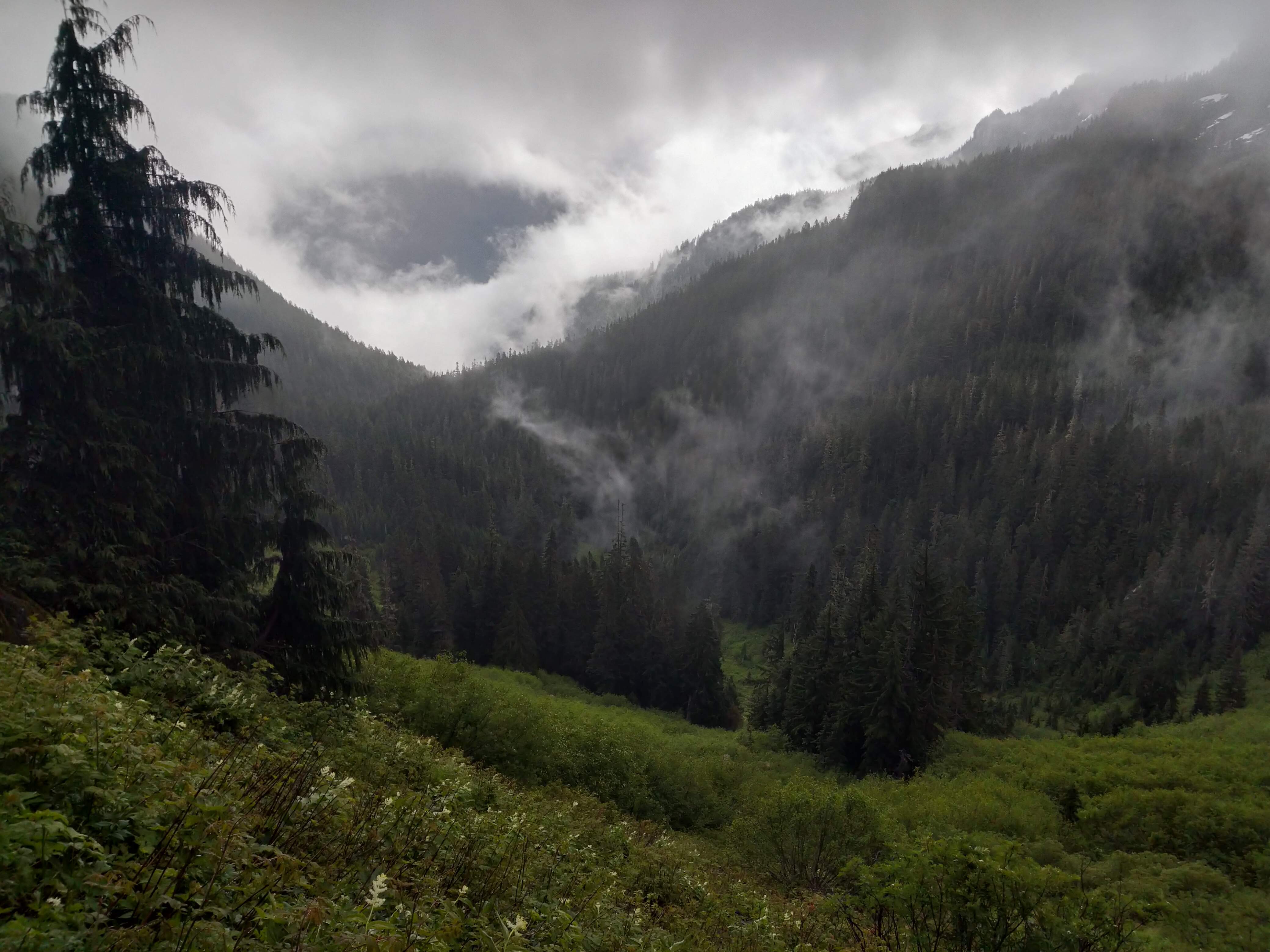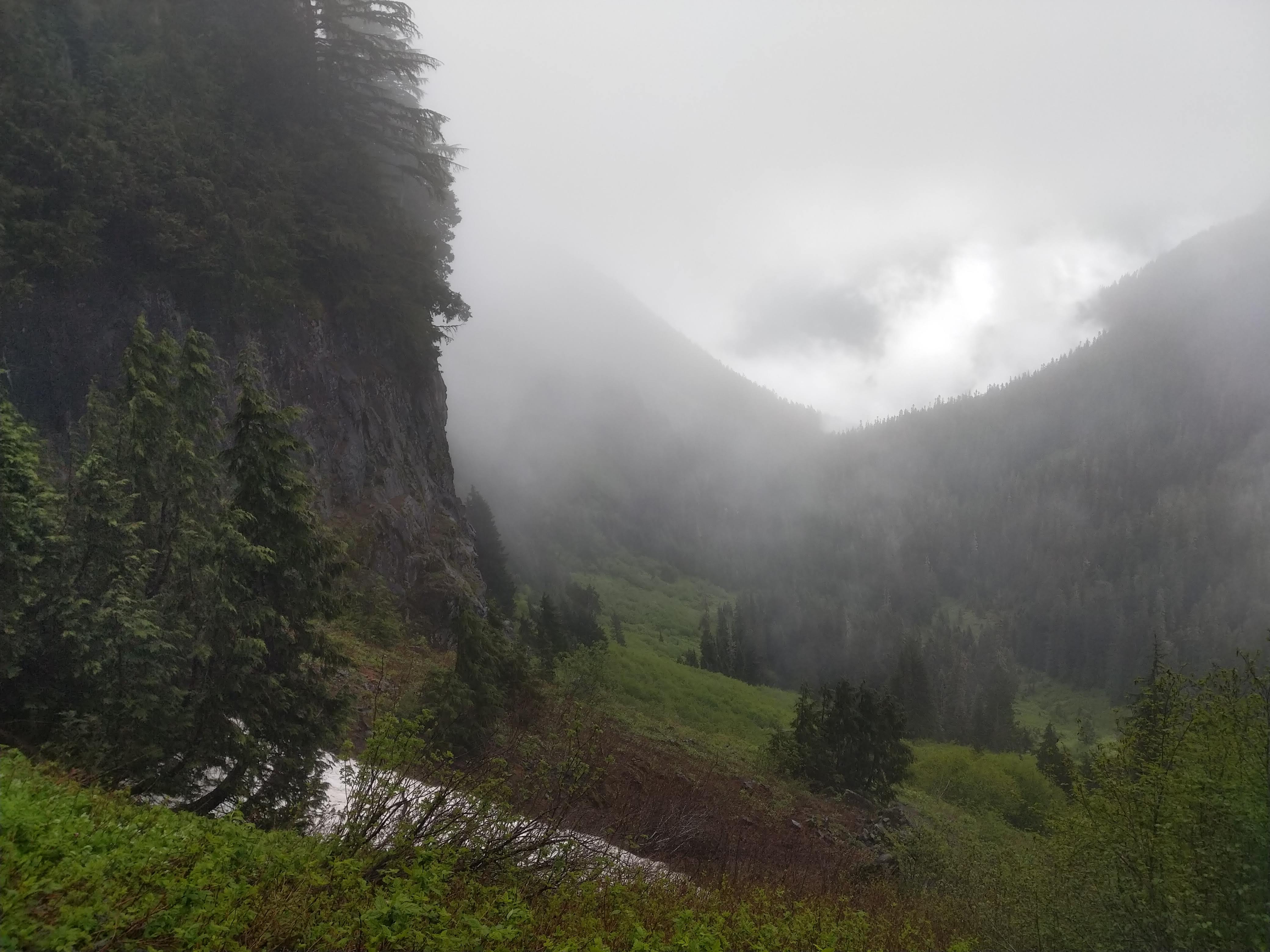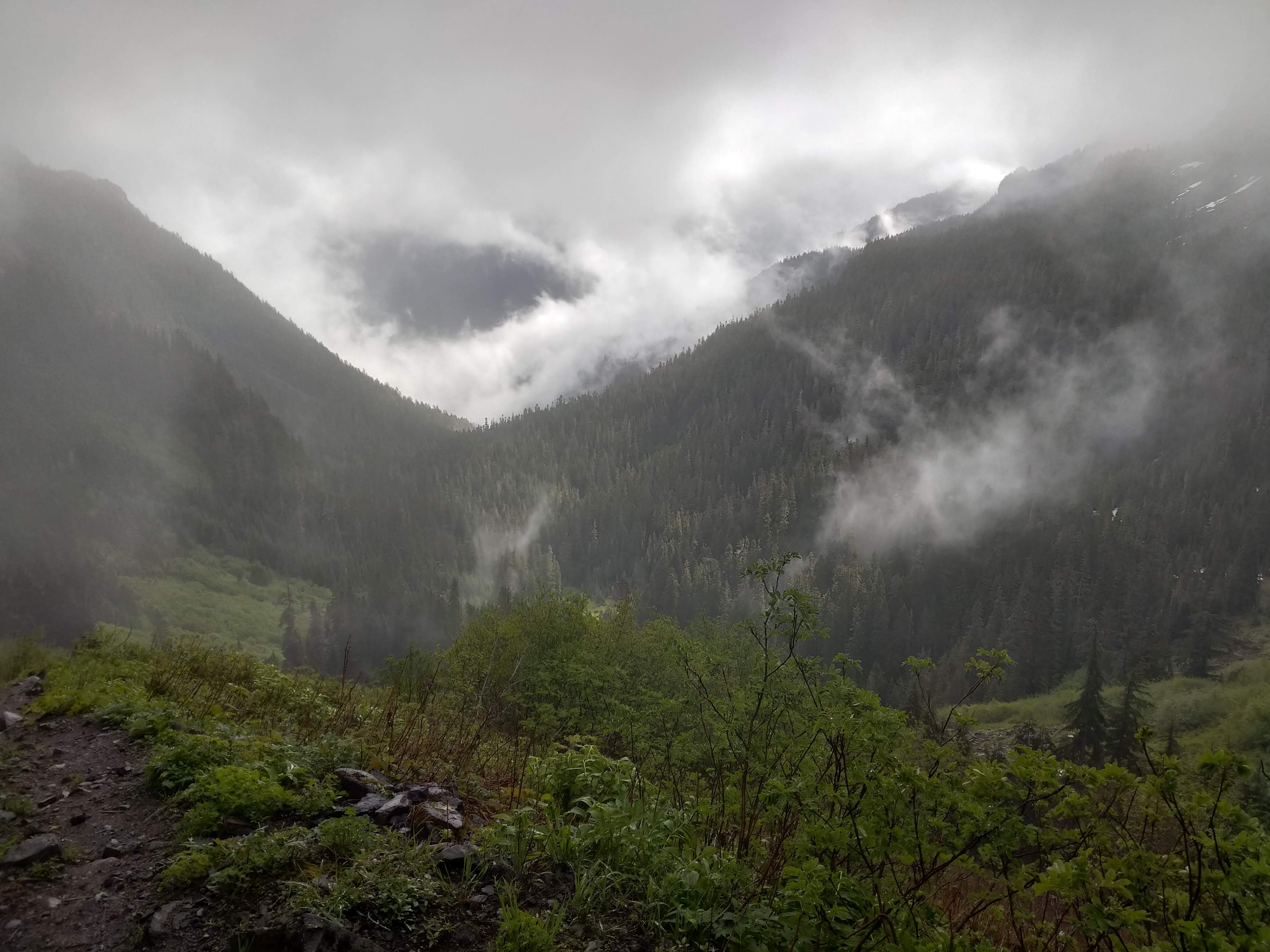 Leaving the N Puyallup river valley, we started our long uphill all the way to golden lakes. It started raining on this section and picked up so it was raining in earnest throughout the rest of the day. This was Angela’s low point of the trip, it rained for so long that it was basically impossible to stay dry. Combining the rain with a rough climb, I took alot less pictures on the uphill for the rest of the day. :)