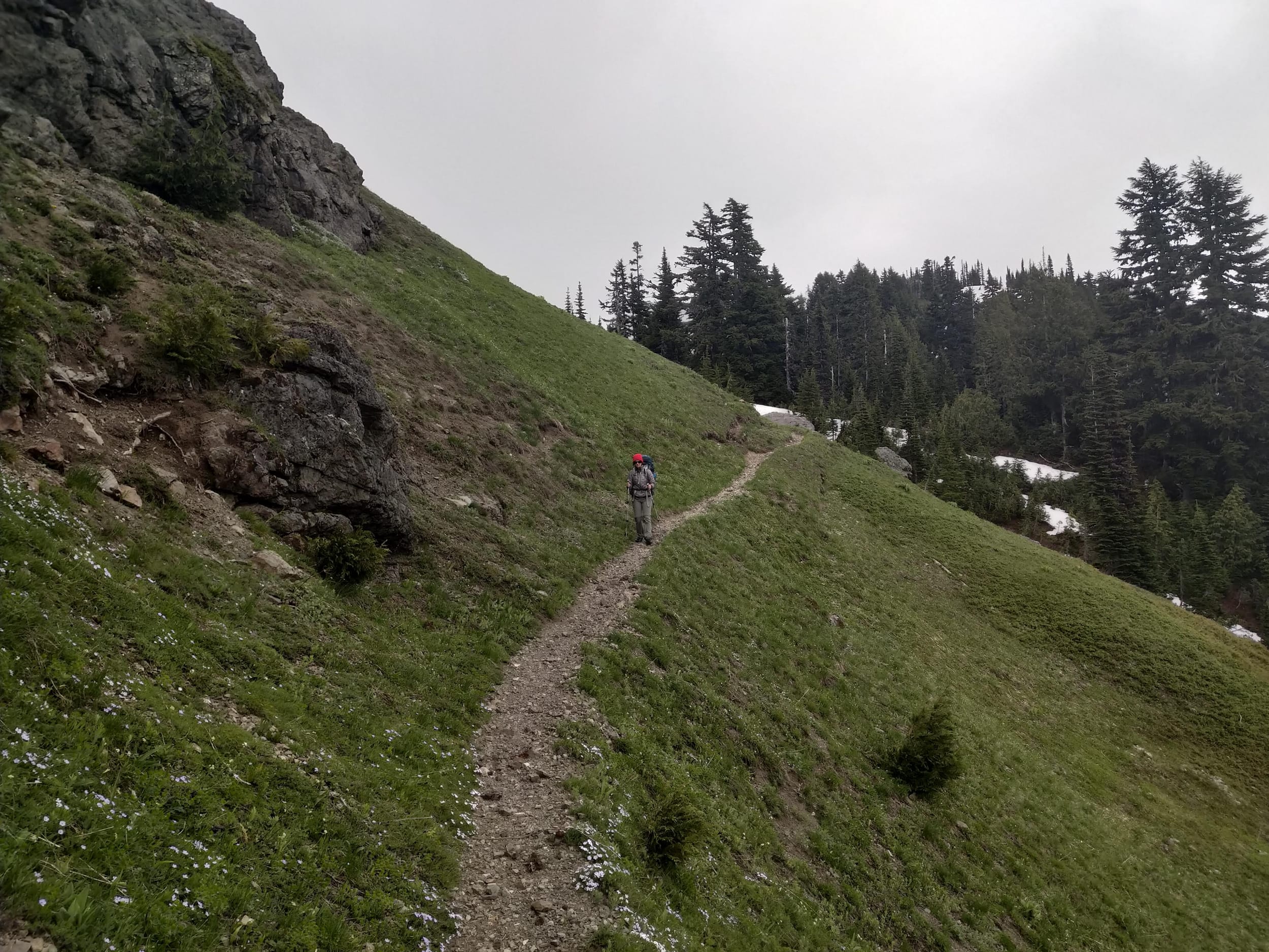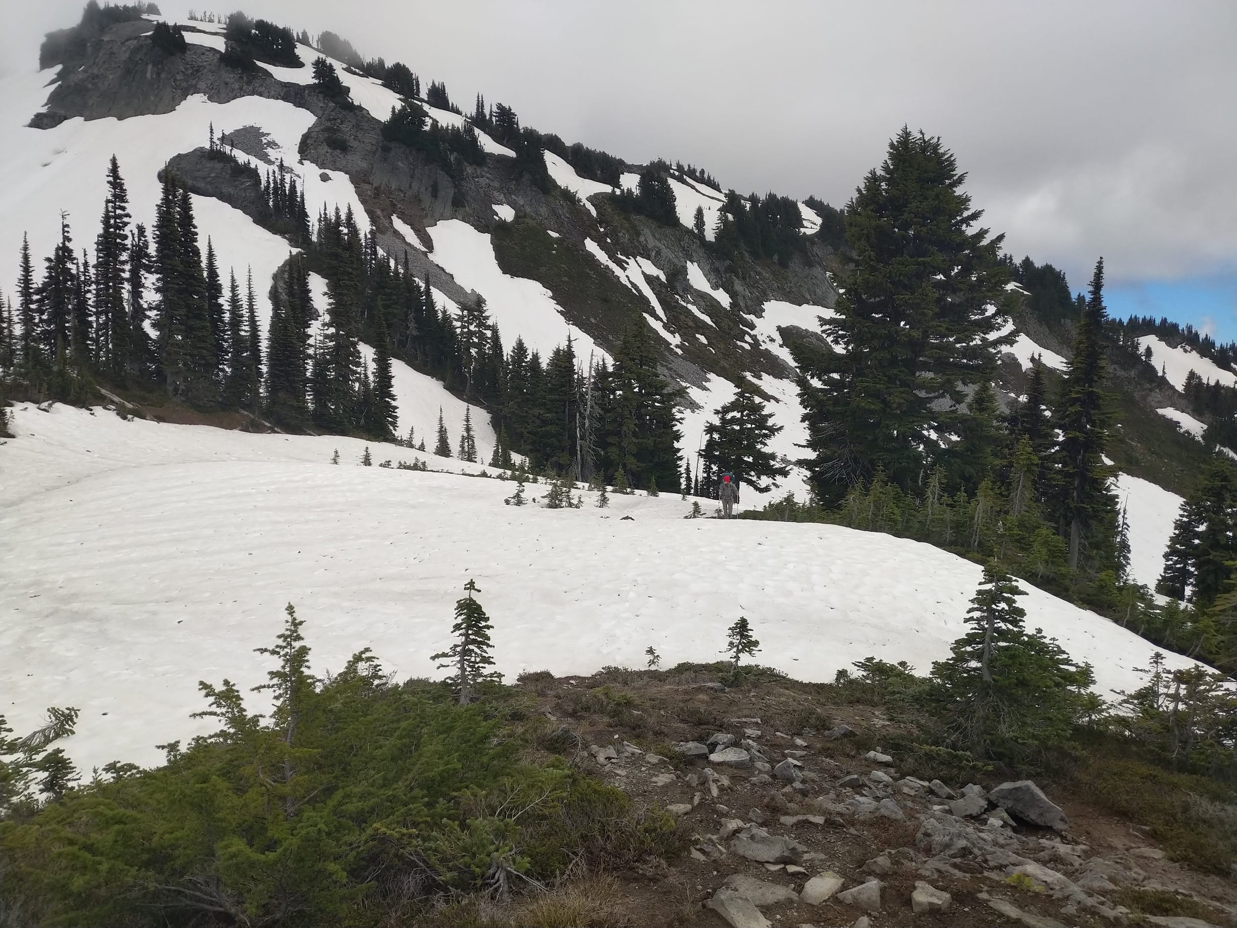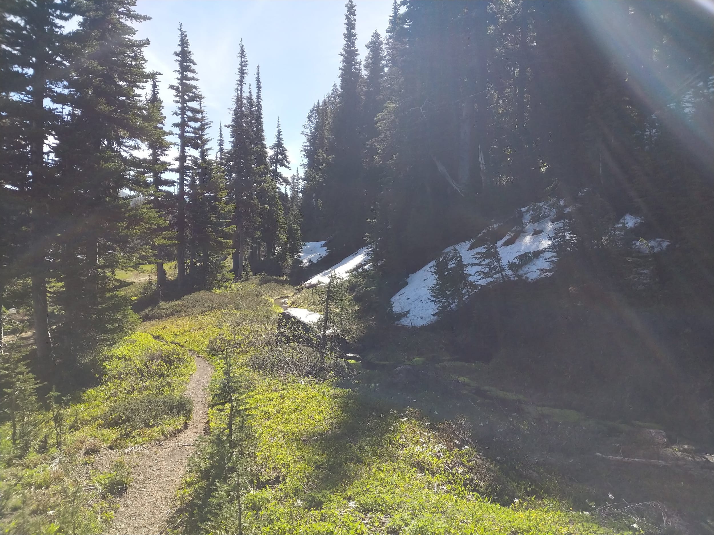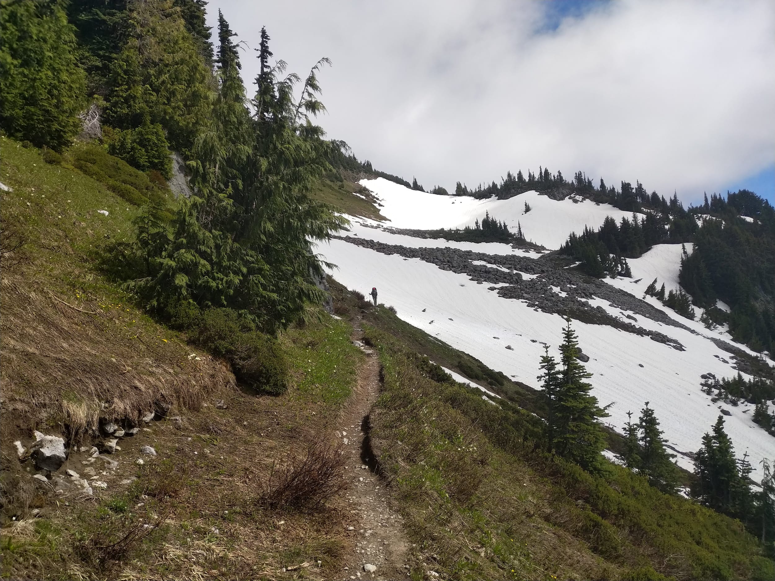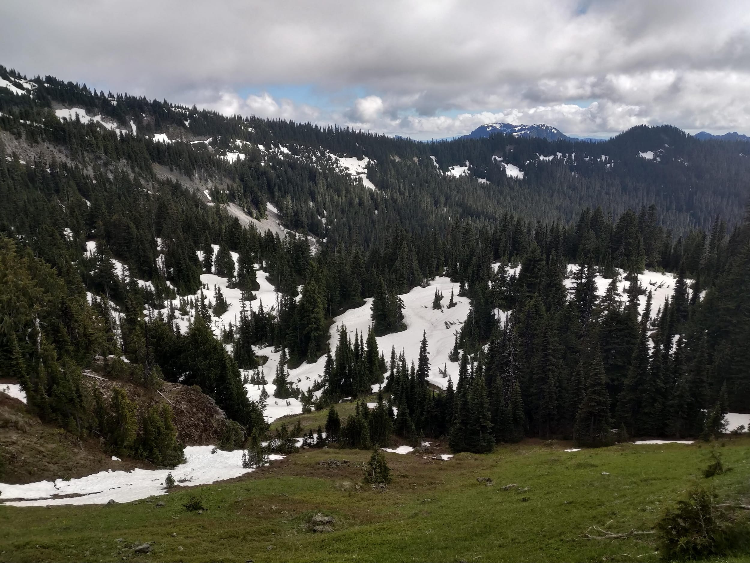 The first several miles were a slow incline - beautiful mix of dense vegetation and open sub-alpine fields and, as we went up, patchy snow.