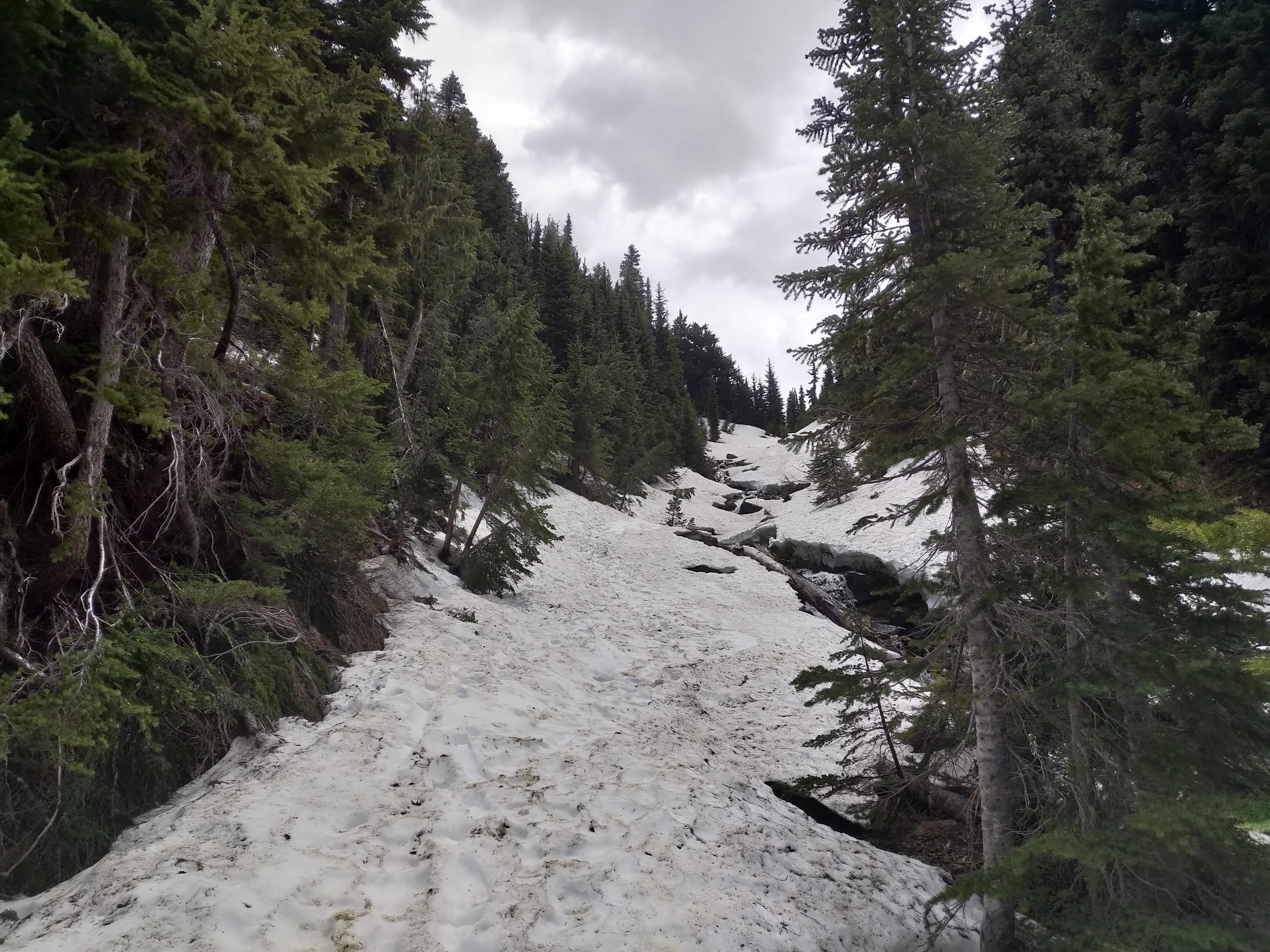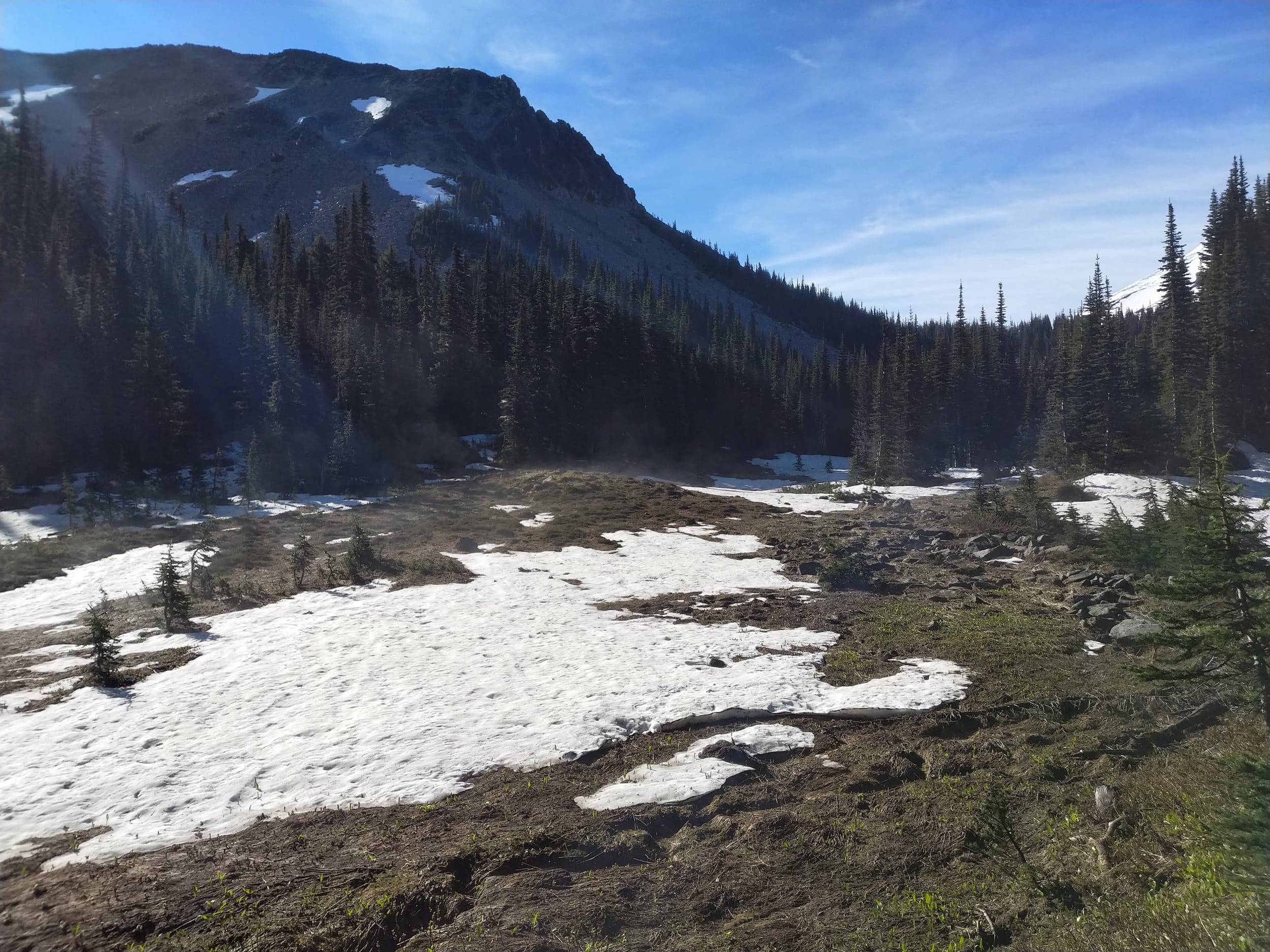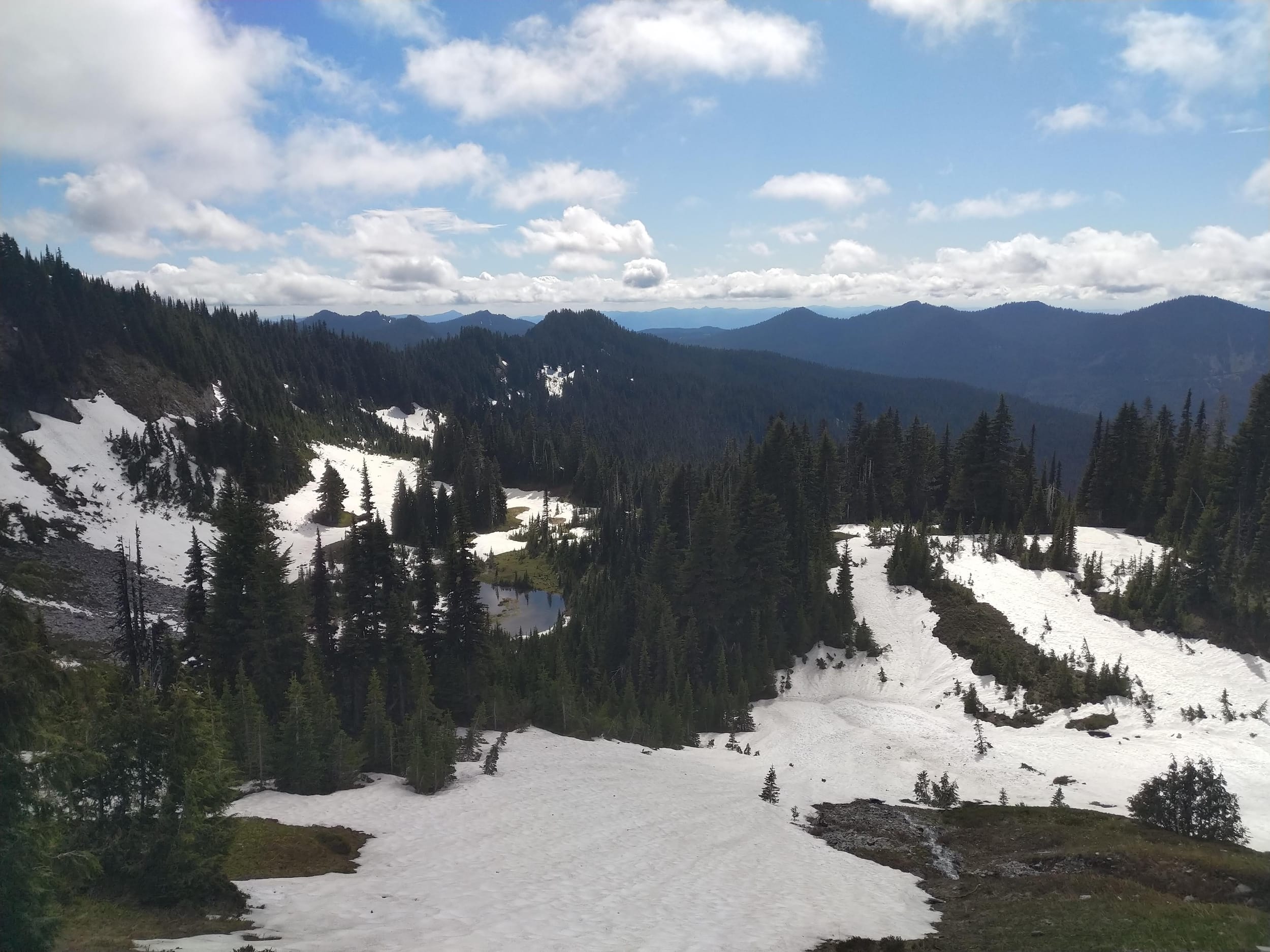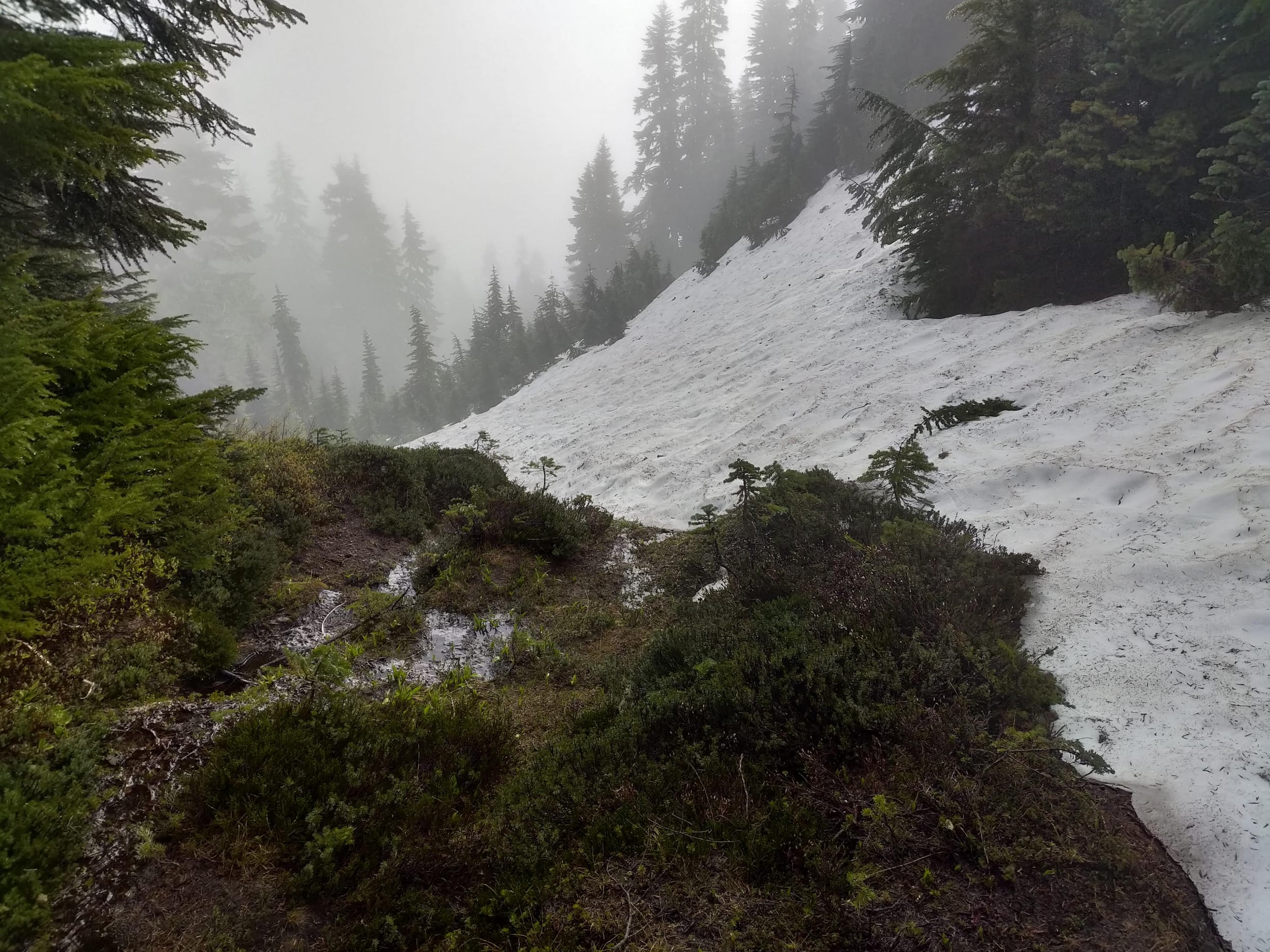 The first several miles were a slow incline - beautiful mix of dense vegetation and open sub-alpine fields and, as we went up, patchy snow.