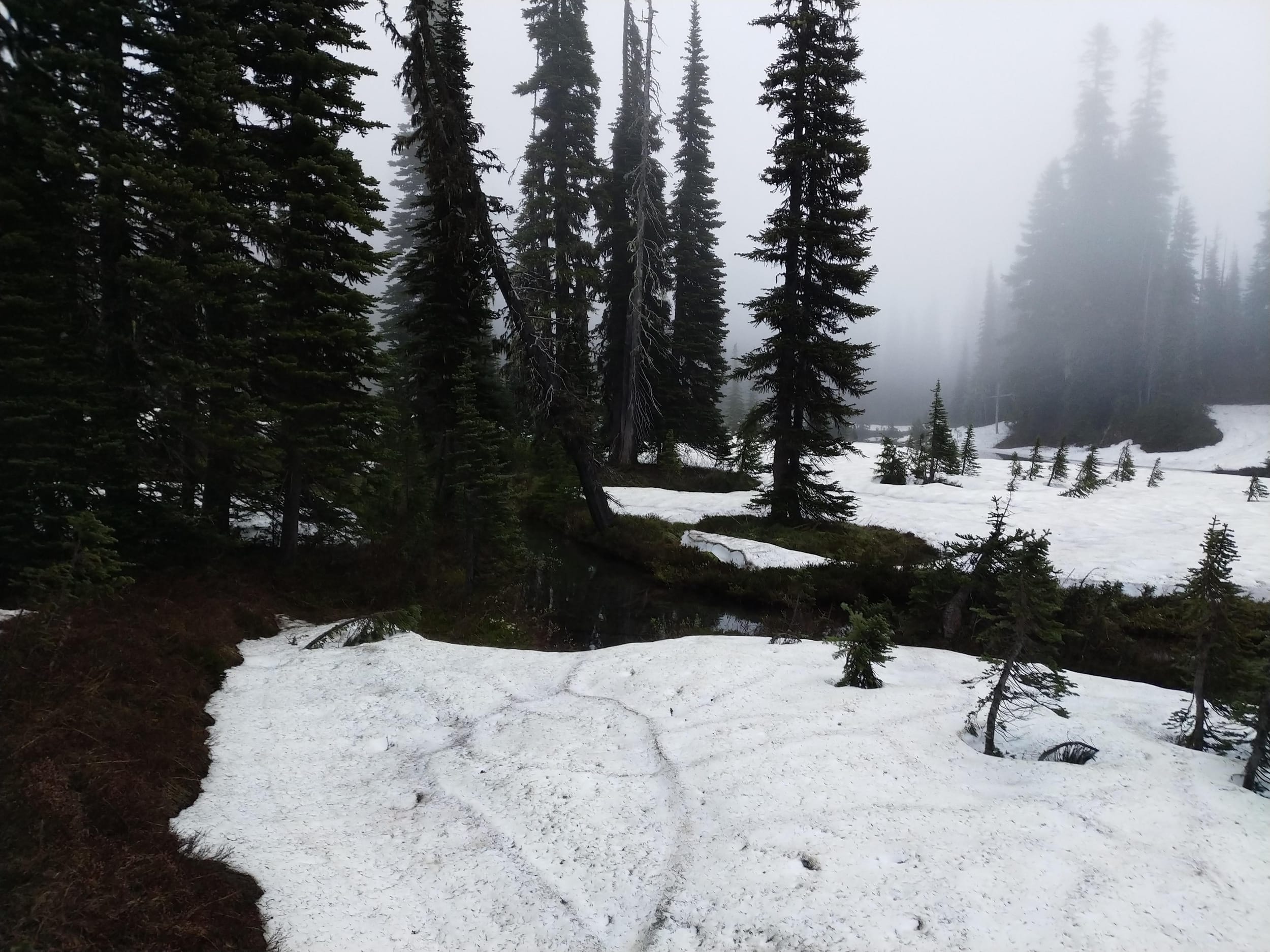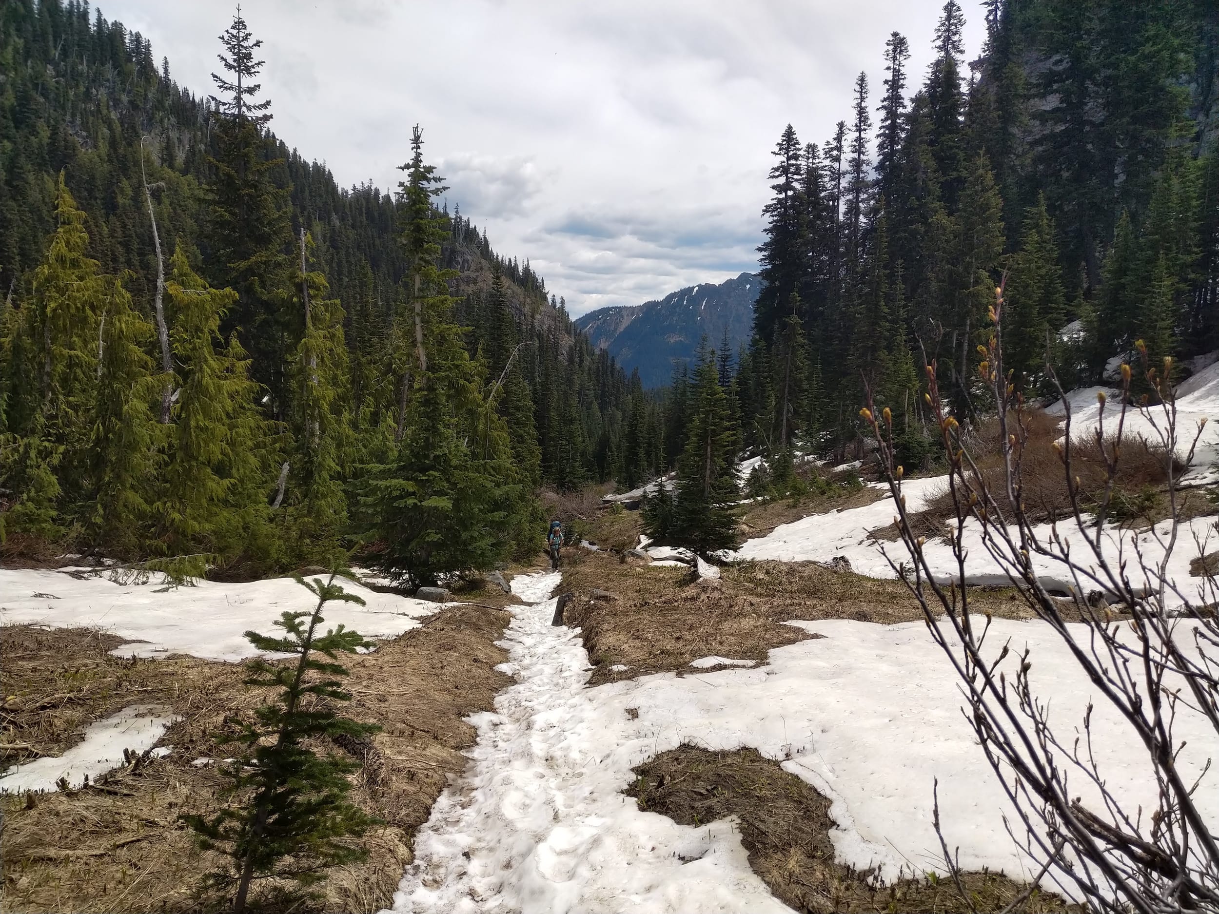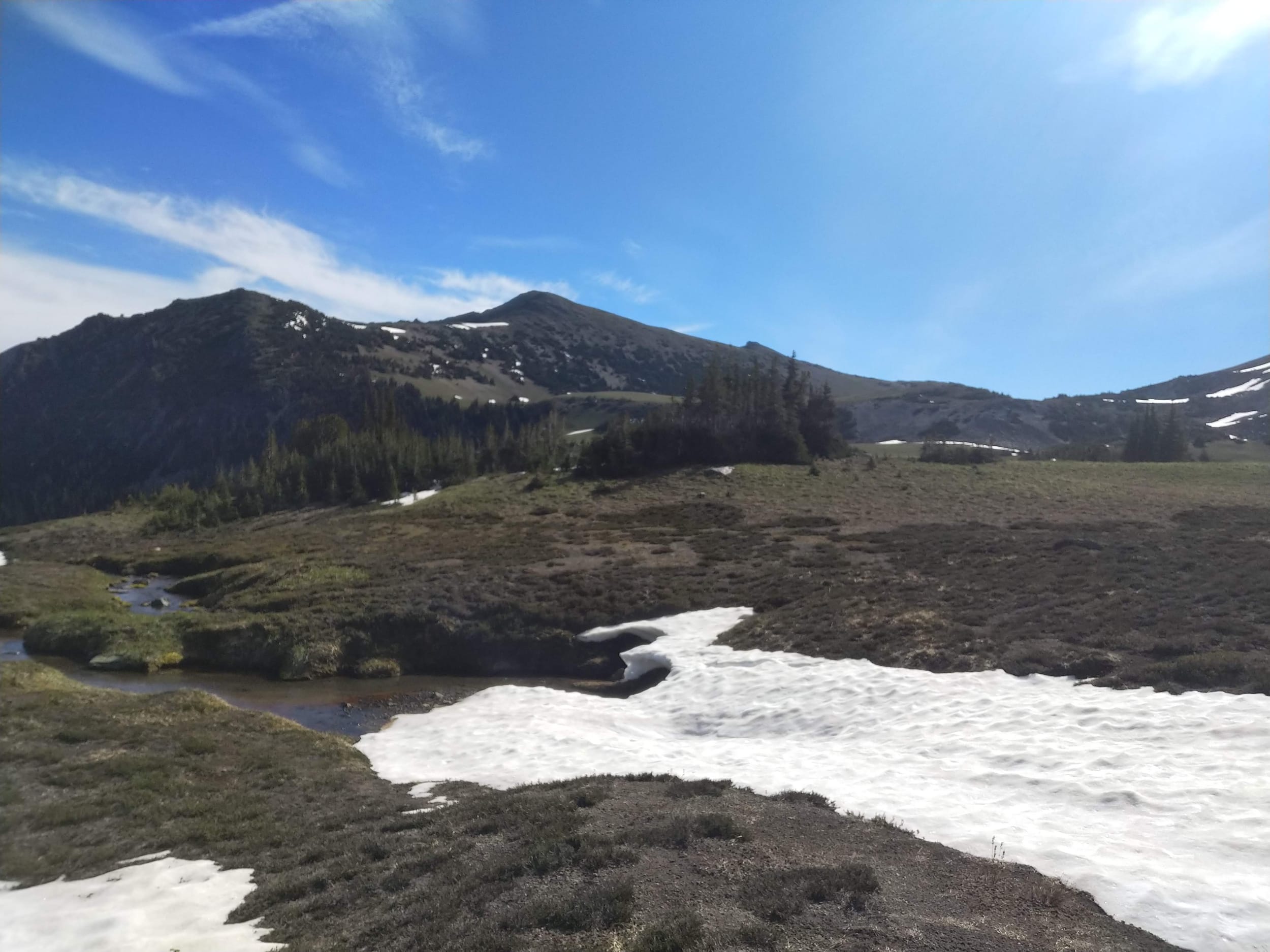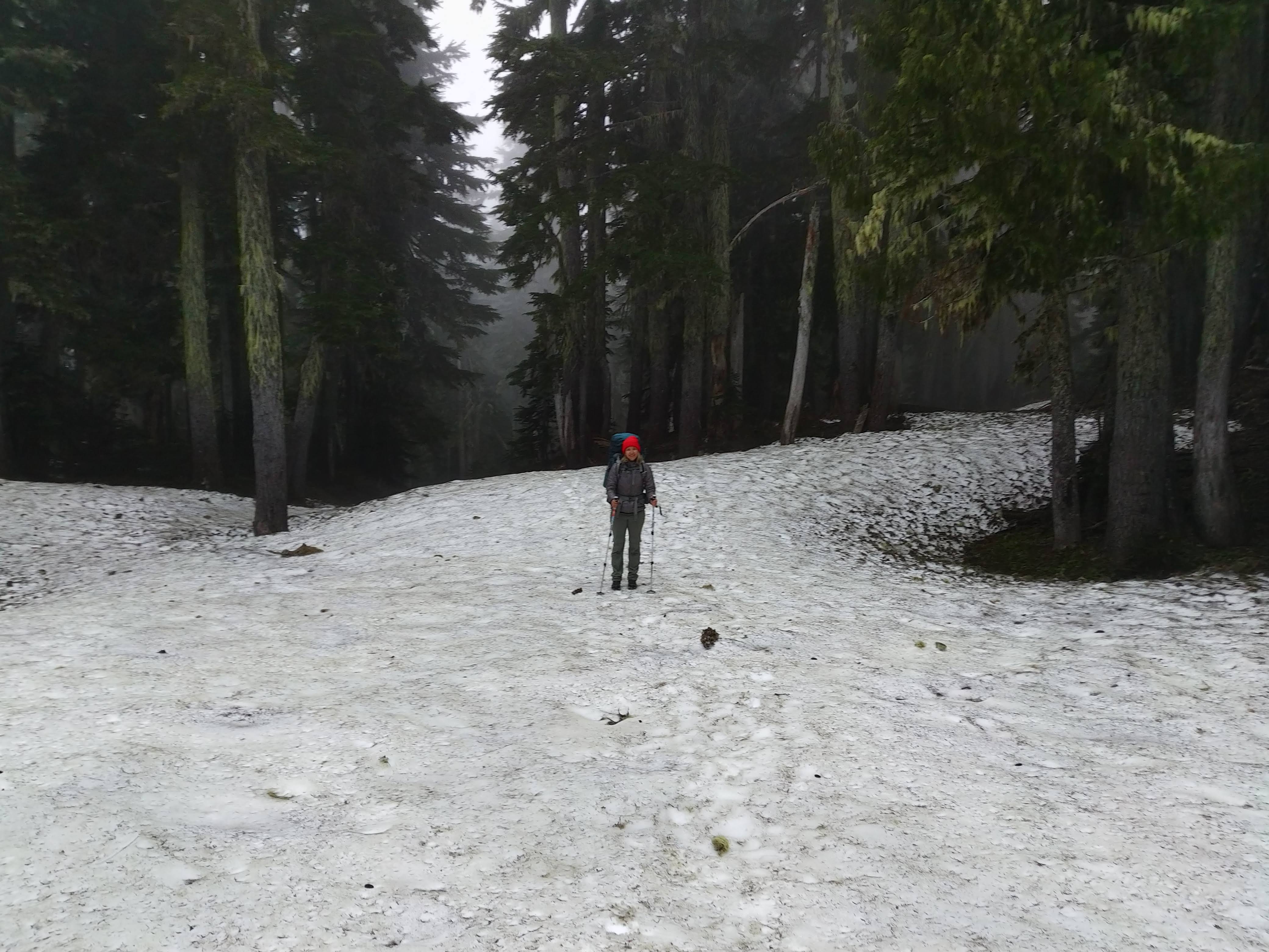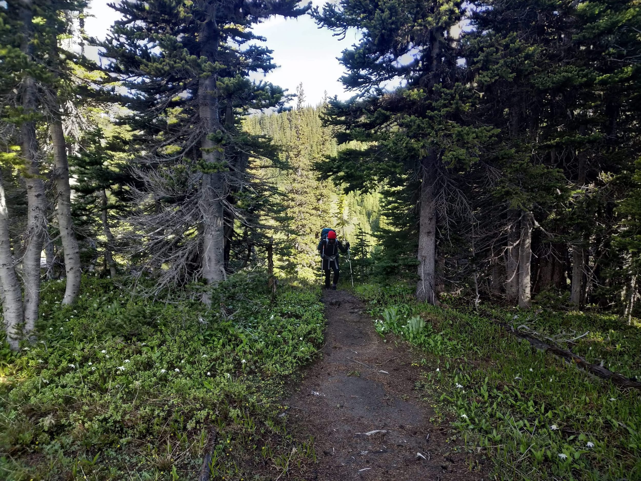 The first several miles were a slow incline - beautiful mix of dense vegetation and open sub-alpine fields and, as we went up, patchy snow.
