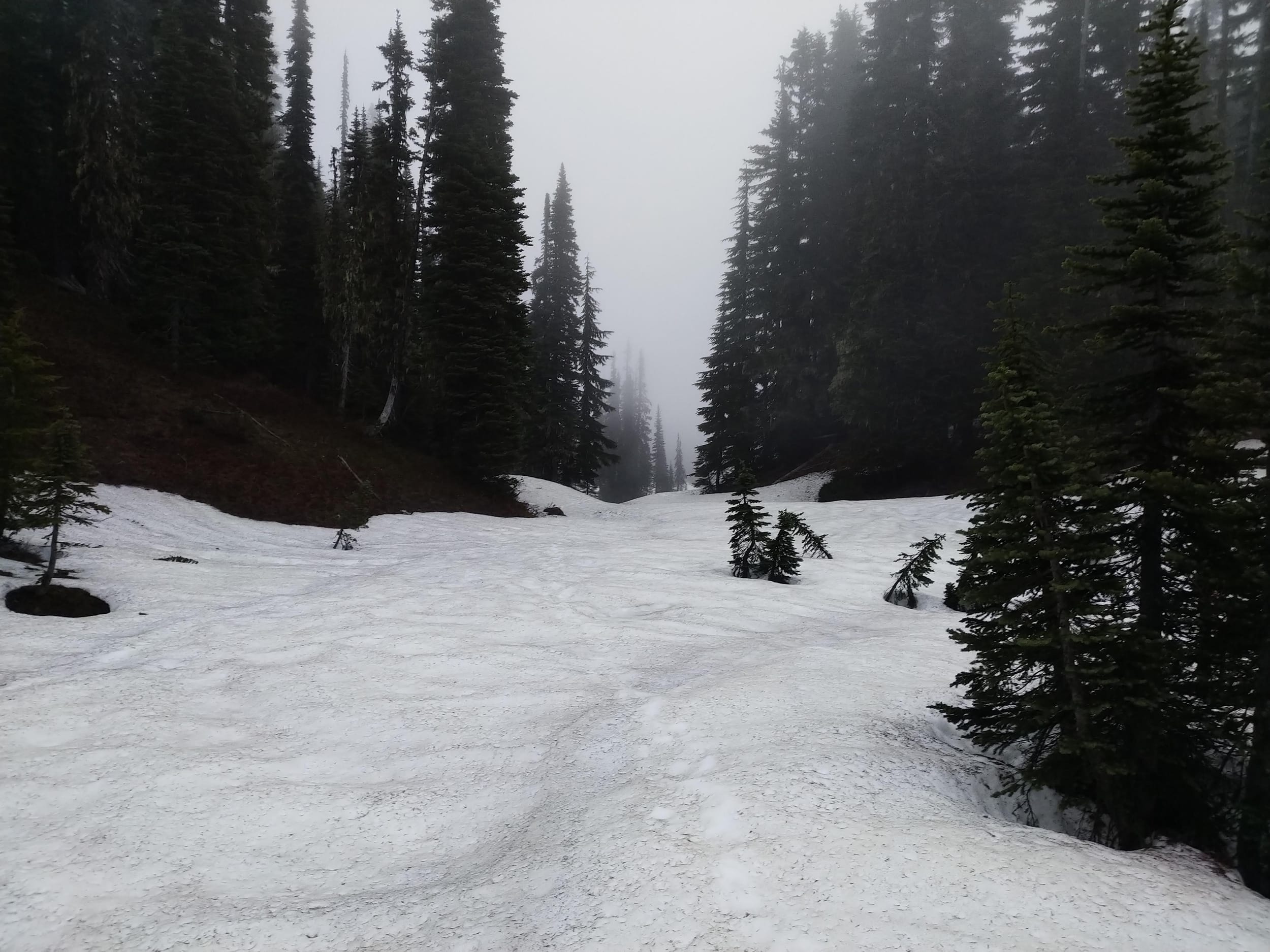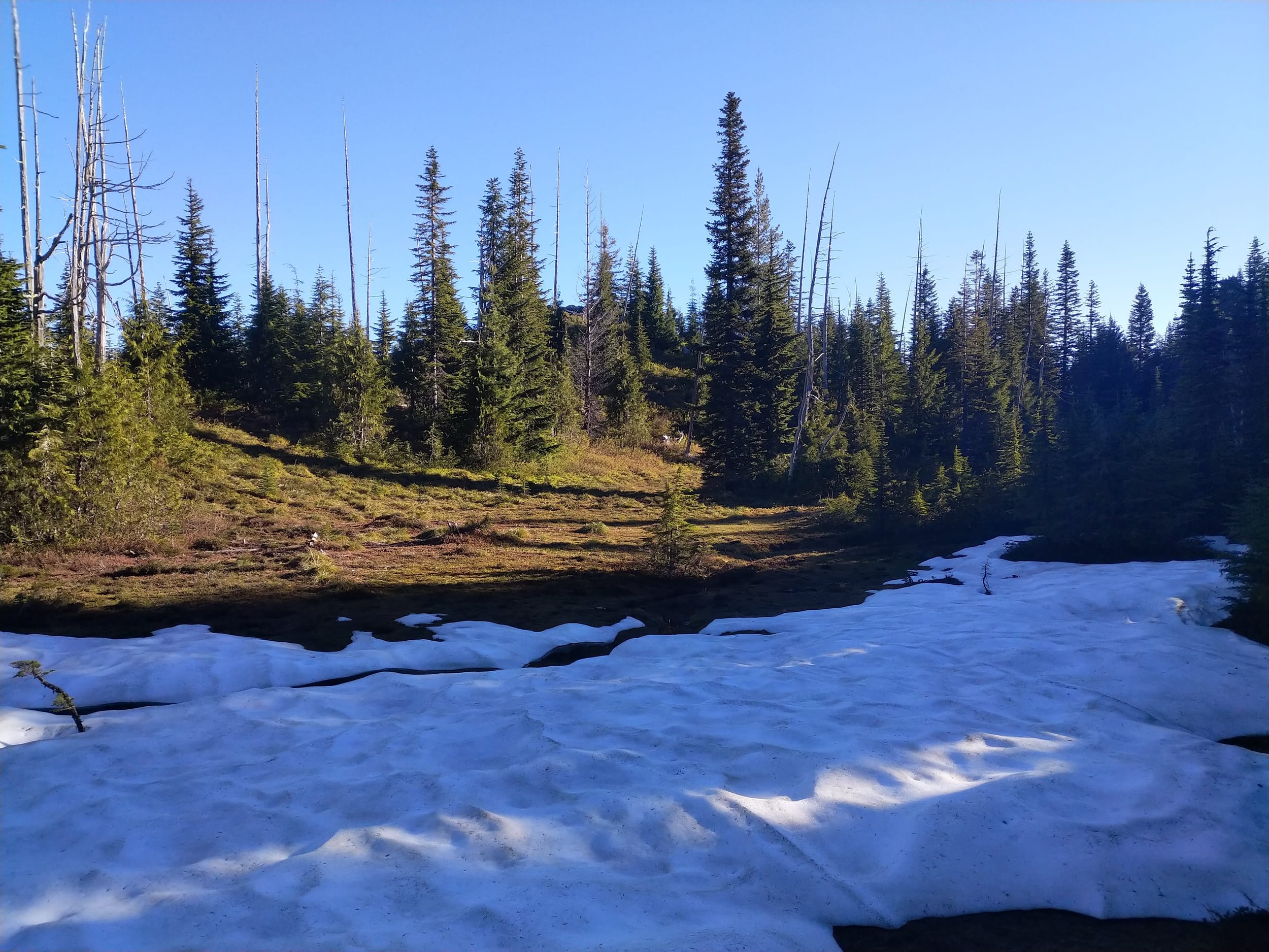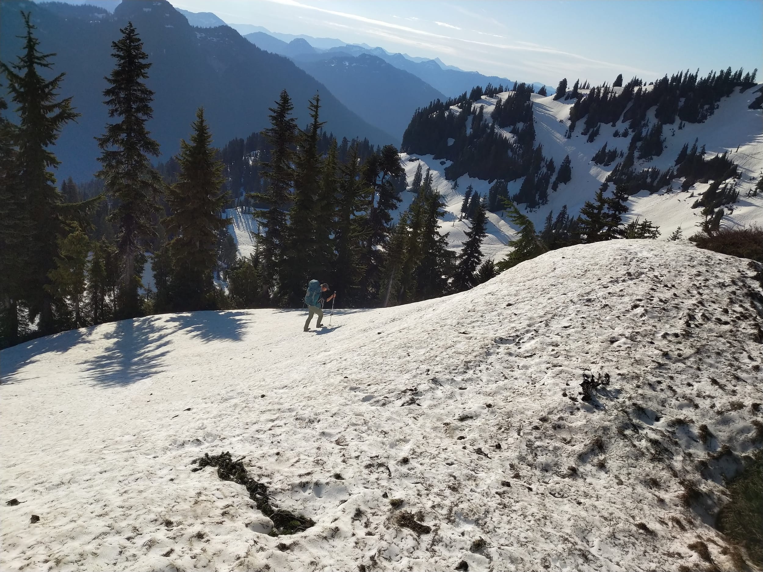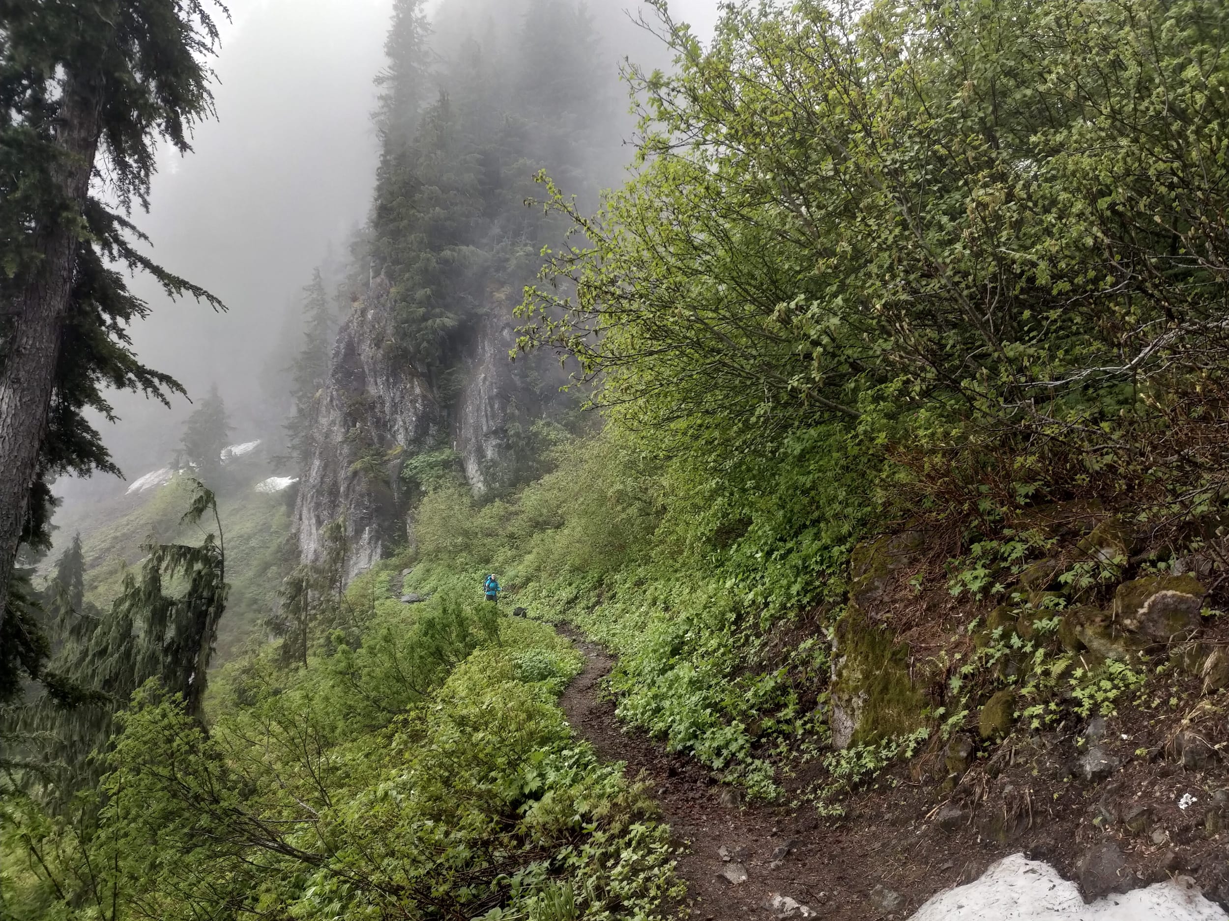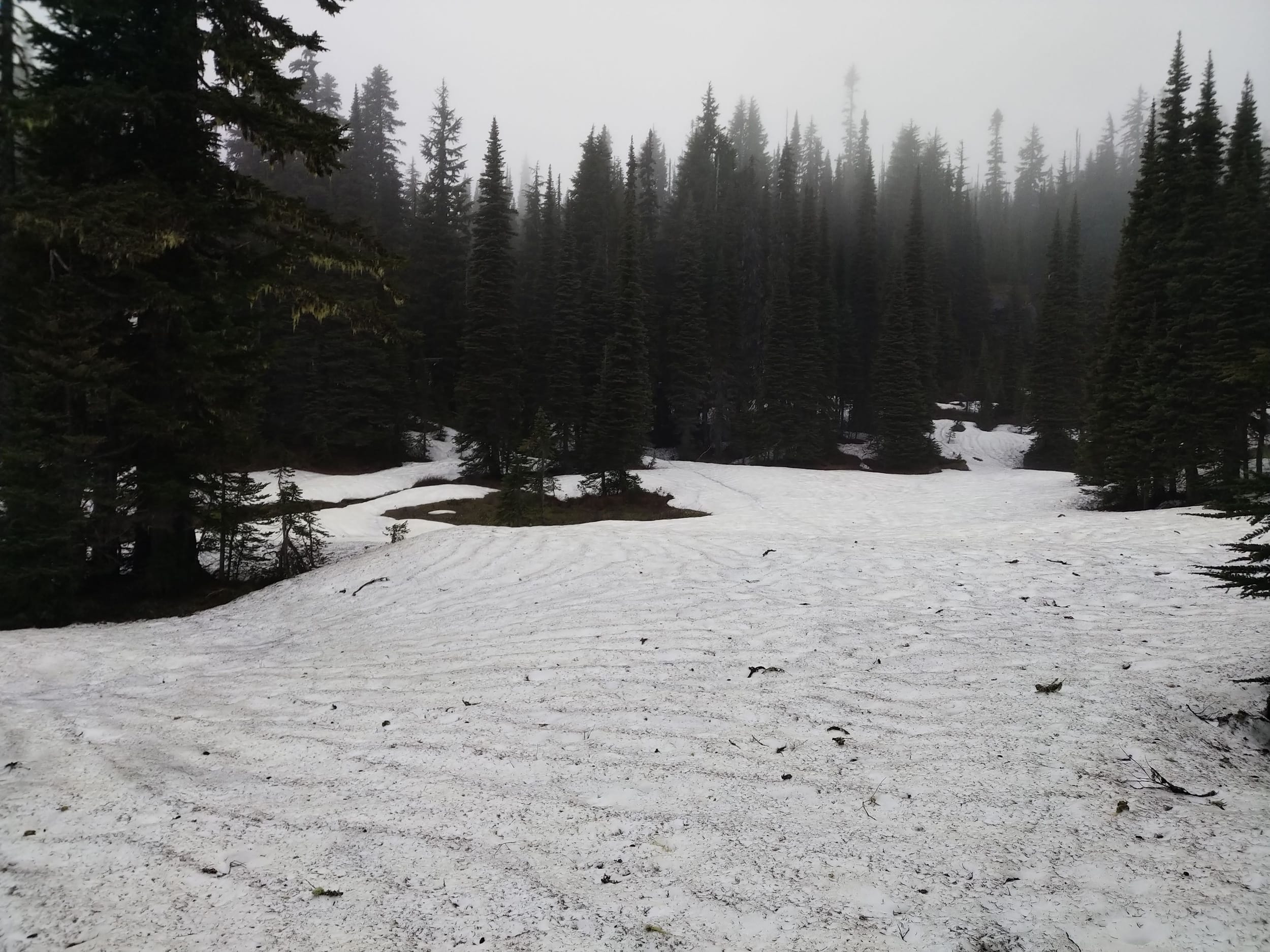 The first several miles were a slow incline - beautiful mix of dense vegetation and open sub-alpine fields and, as we went up, patchy snow.