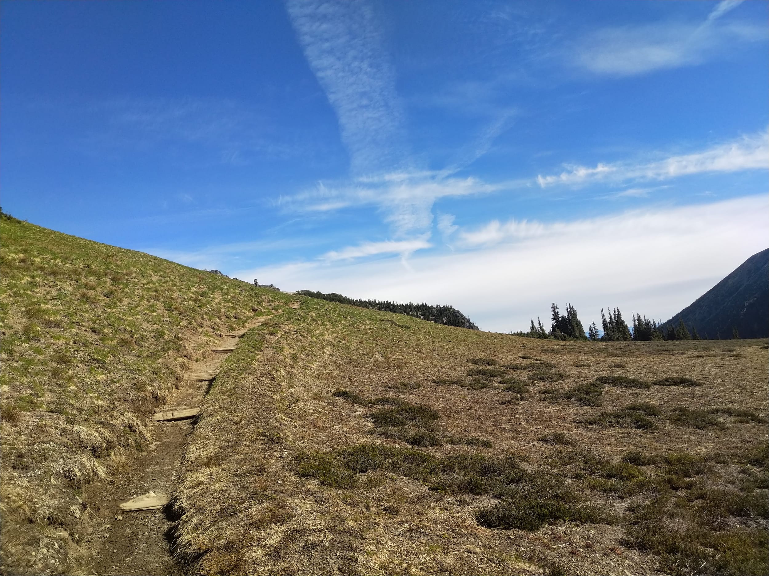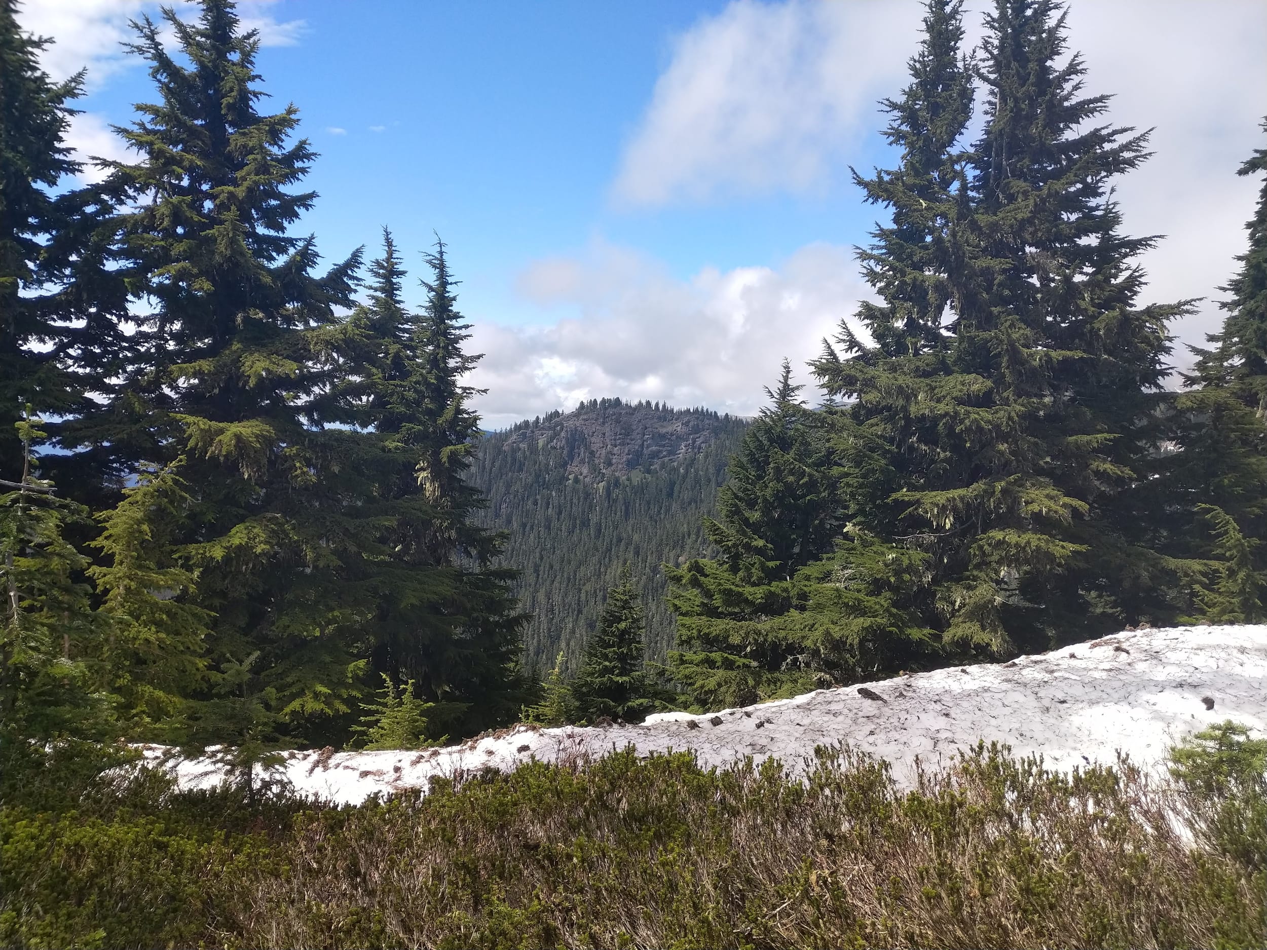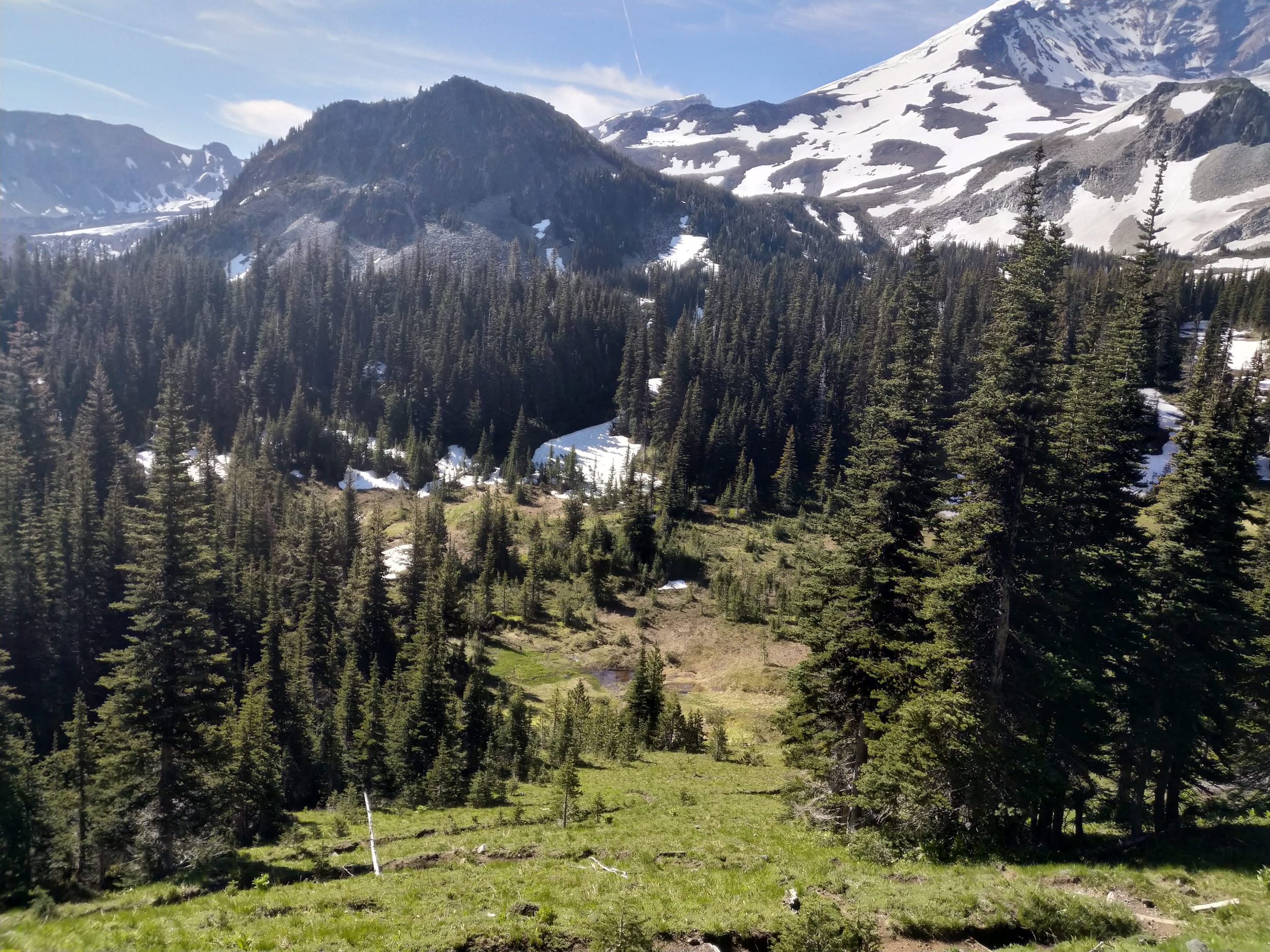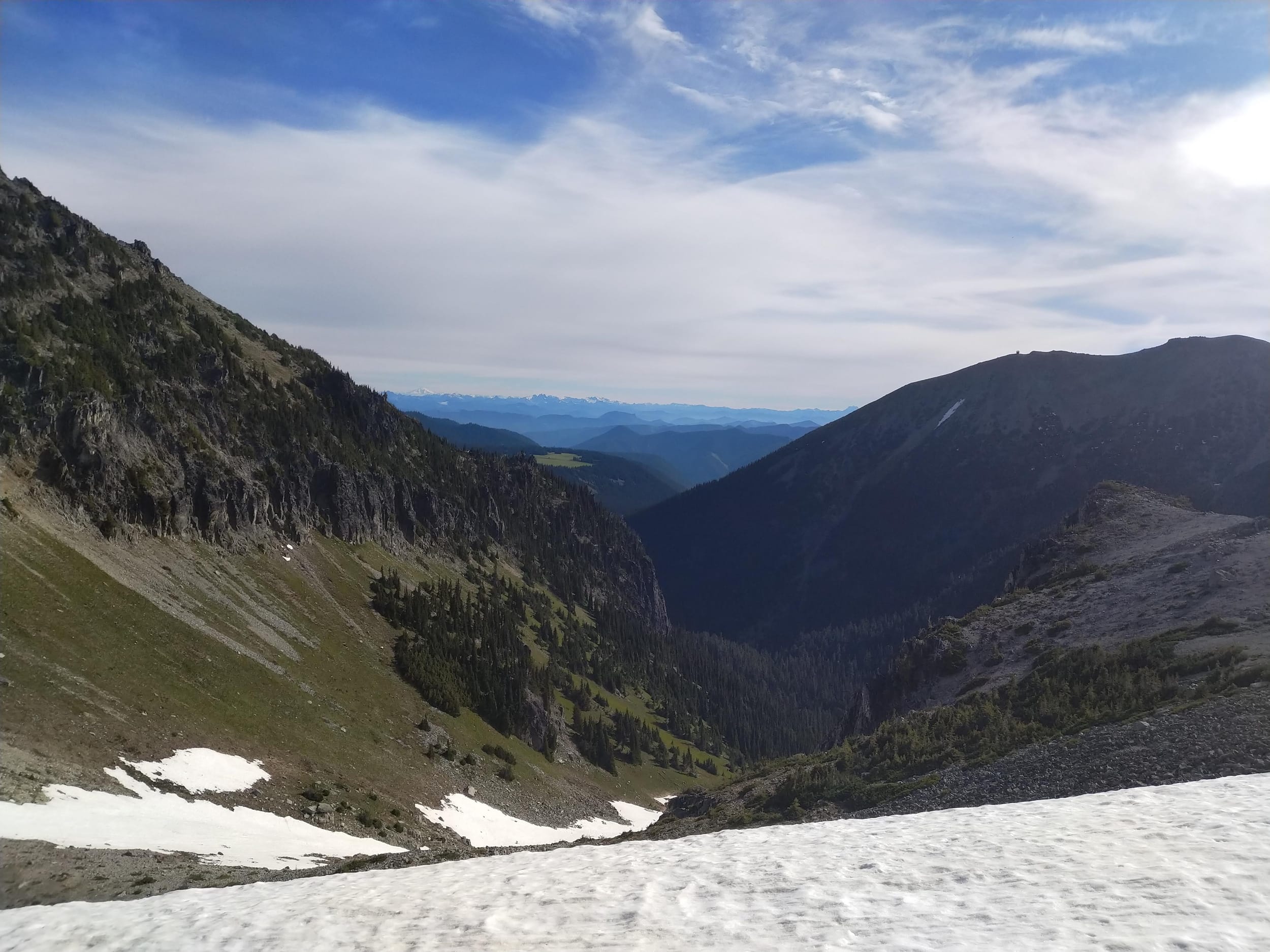 The first several miles were a slow incline - beautiful mix of dense vegetation and open sub-alpine fields and, as we went up, patchy snow.