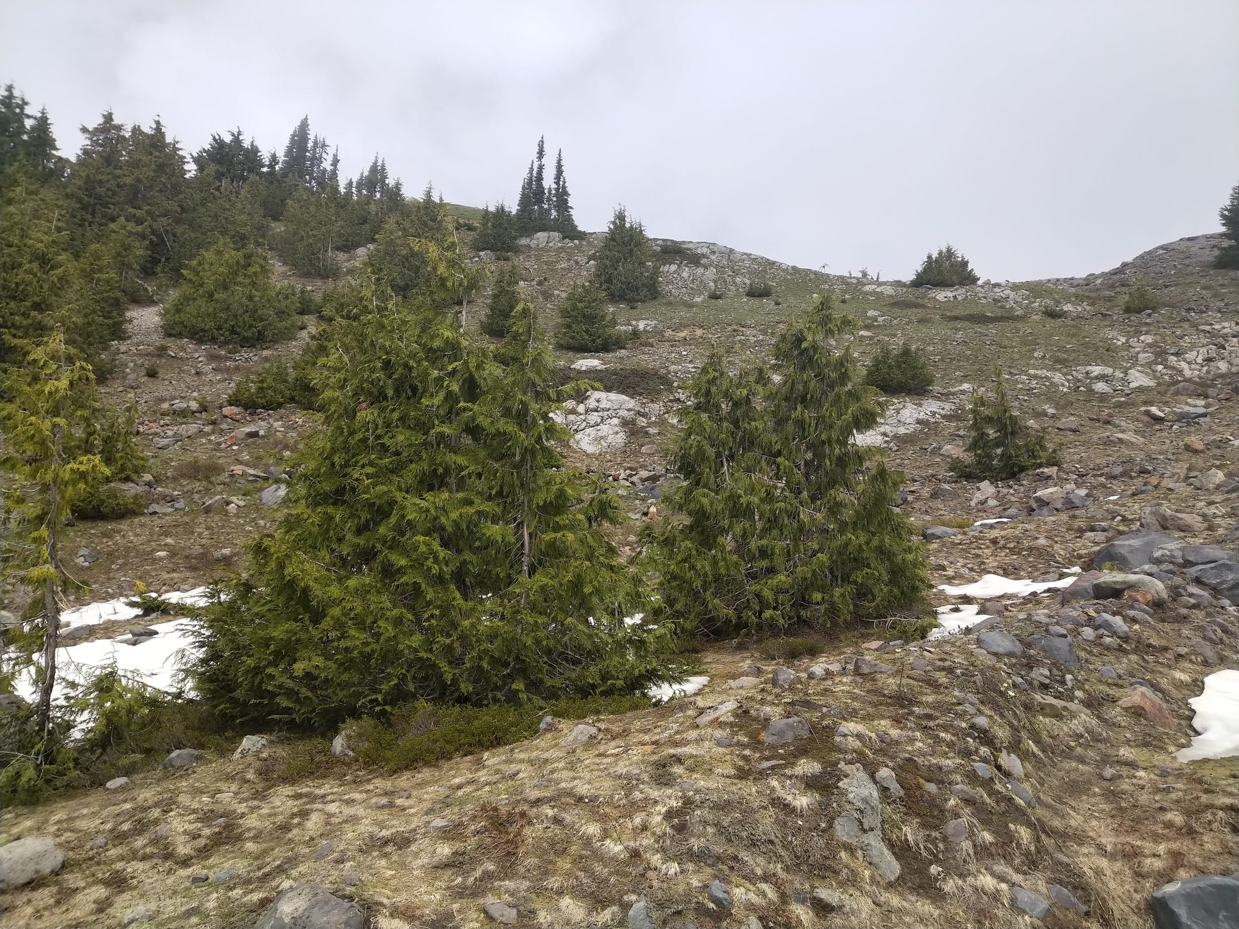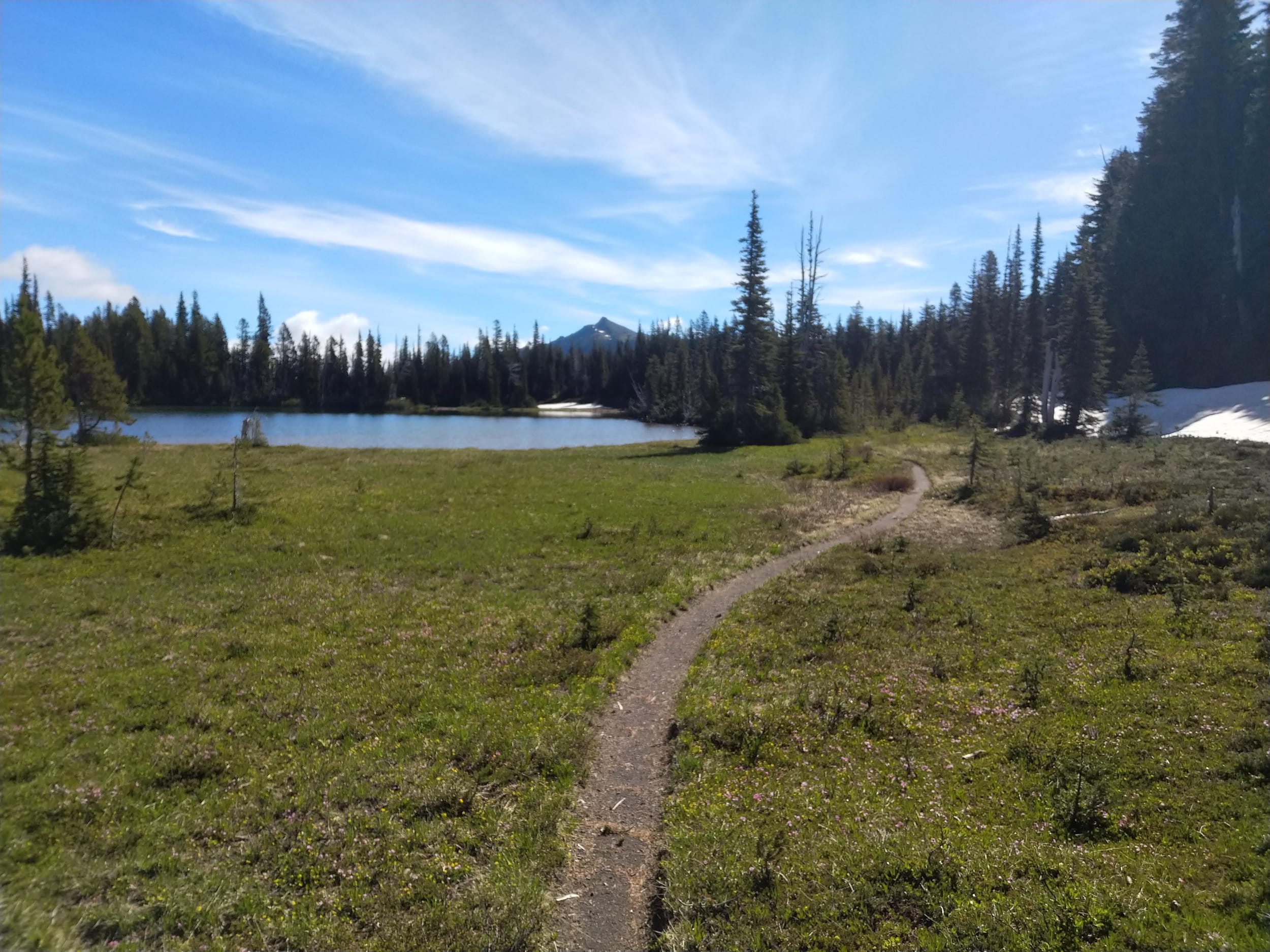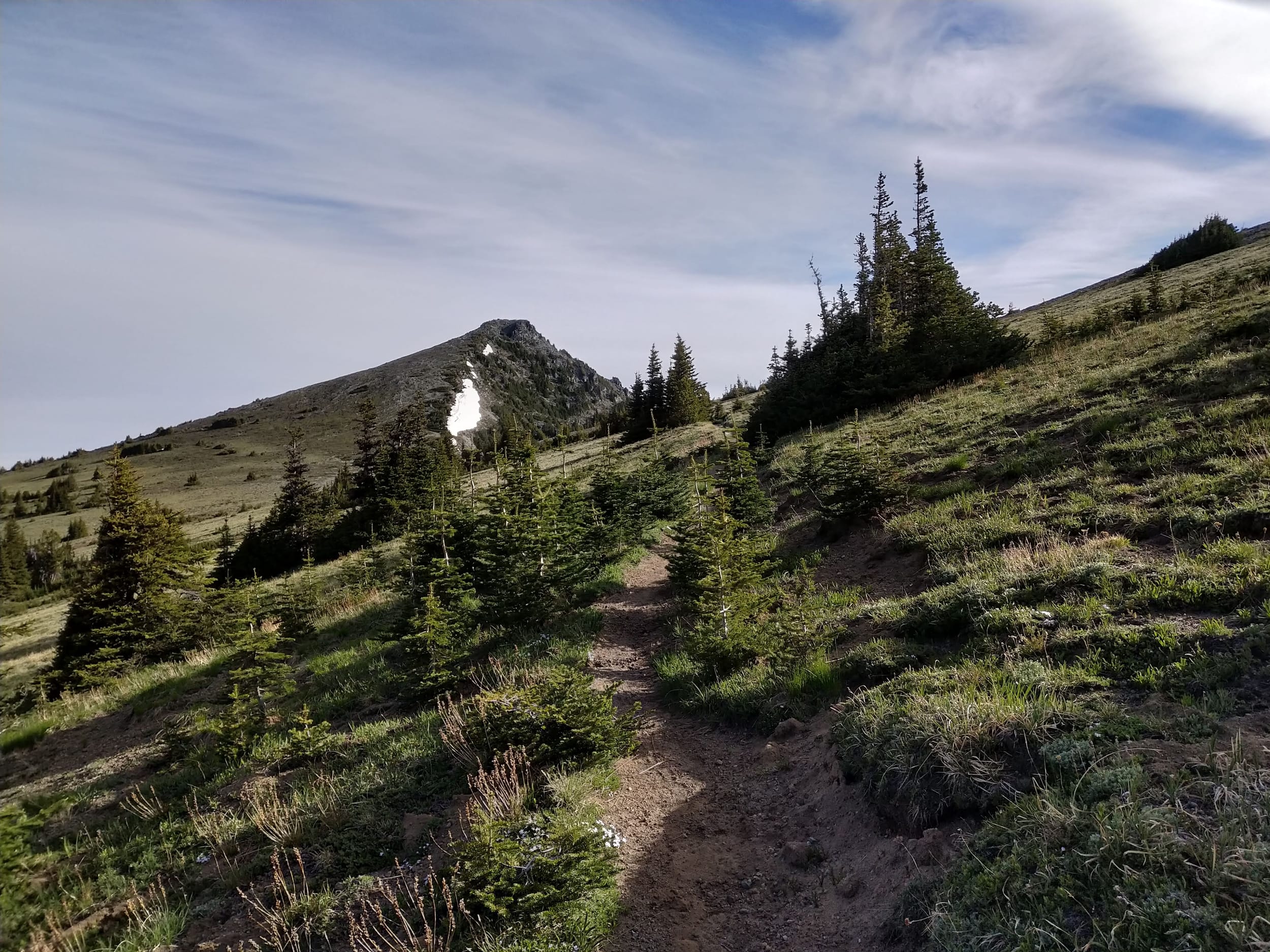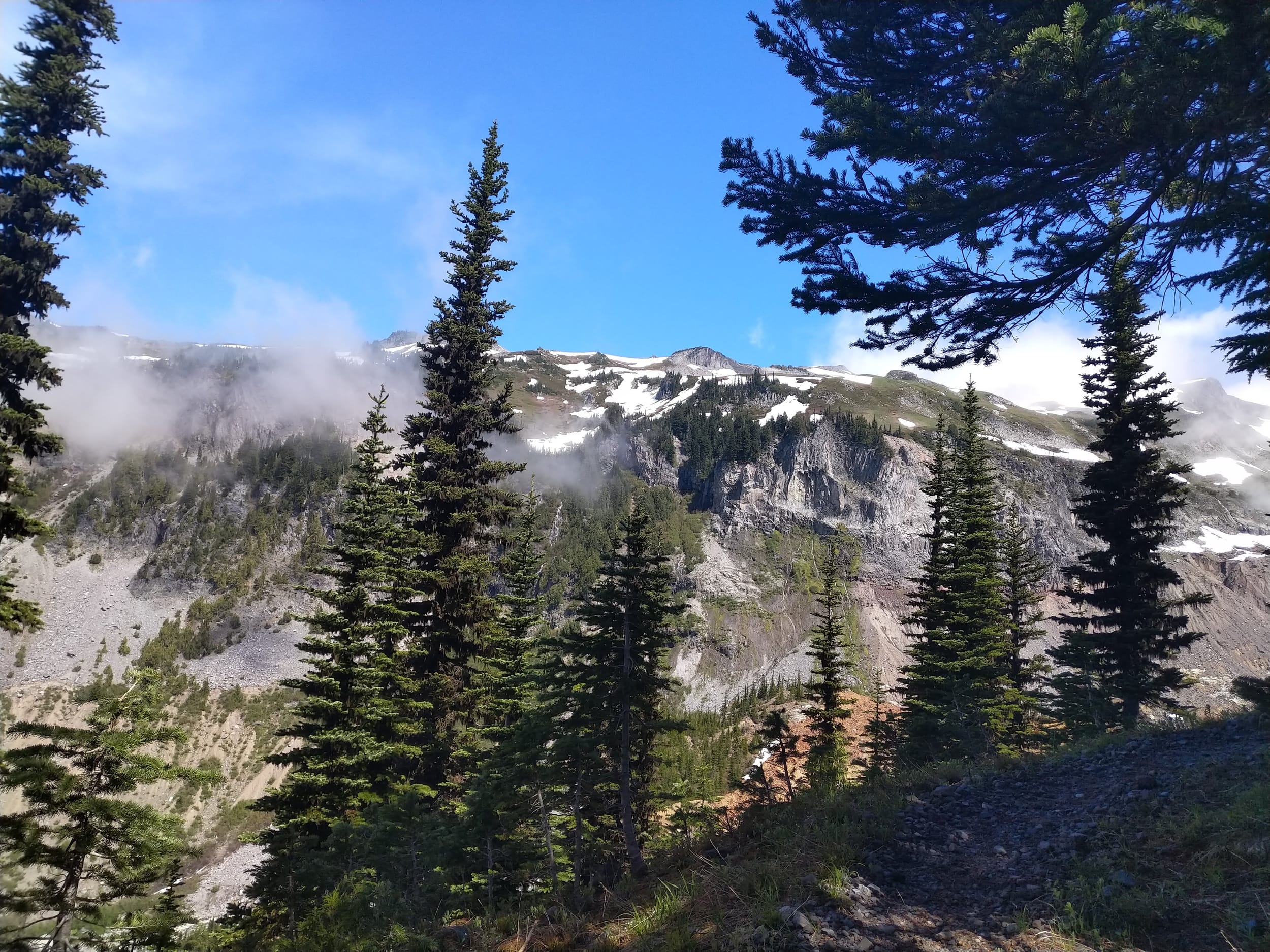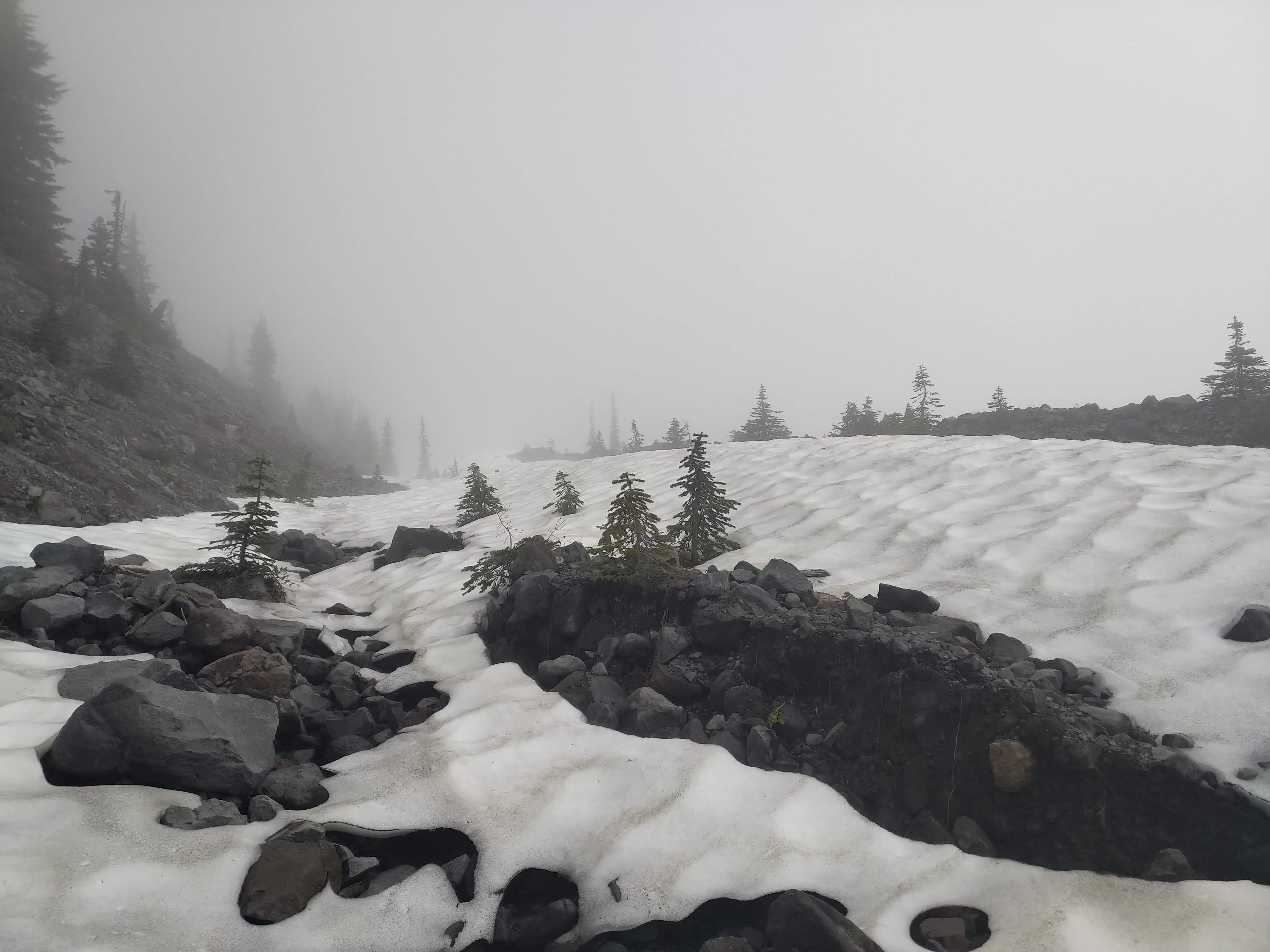 The first several miles were a slow incline - beautiful mix of dense vegetation and open sub-alpine fields and, as we went up, patchy snow.