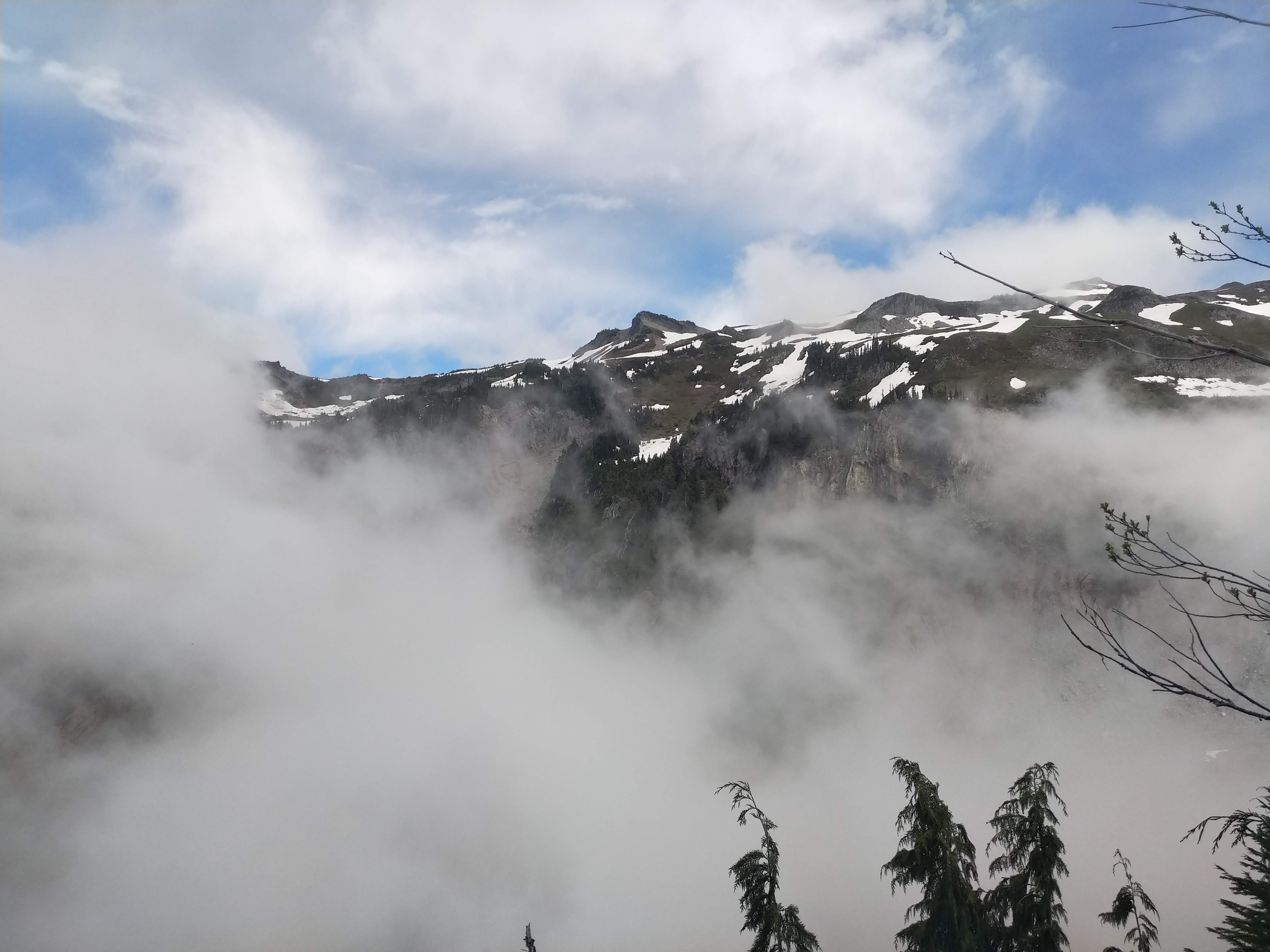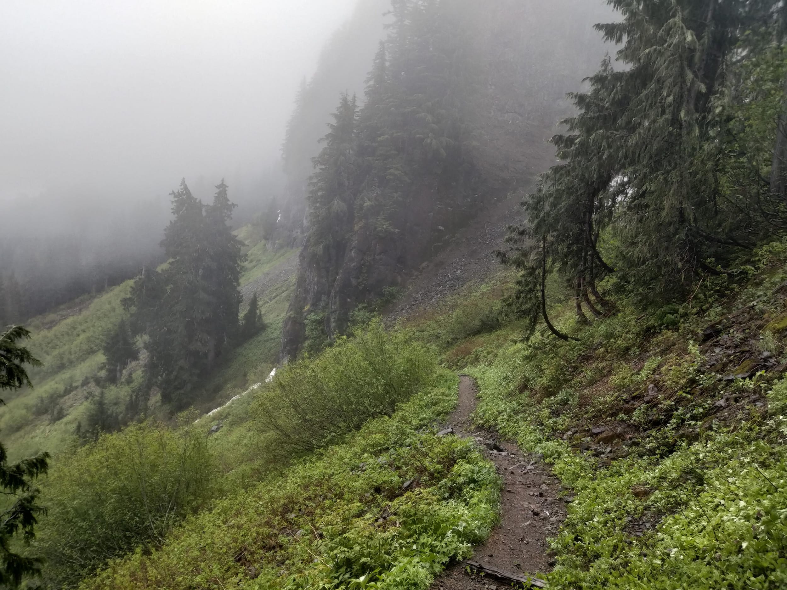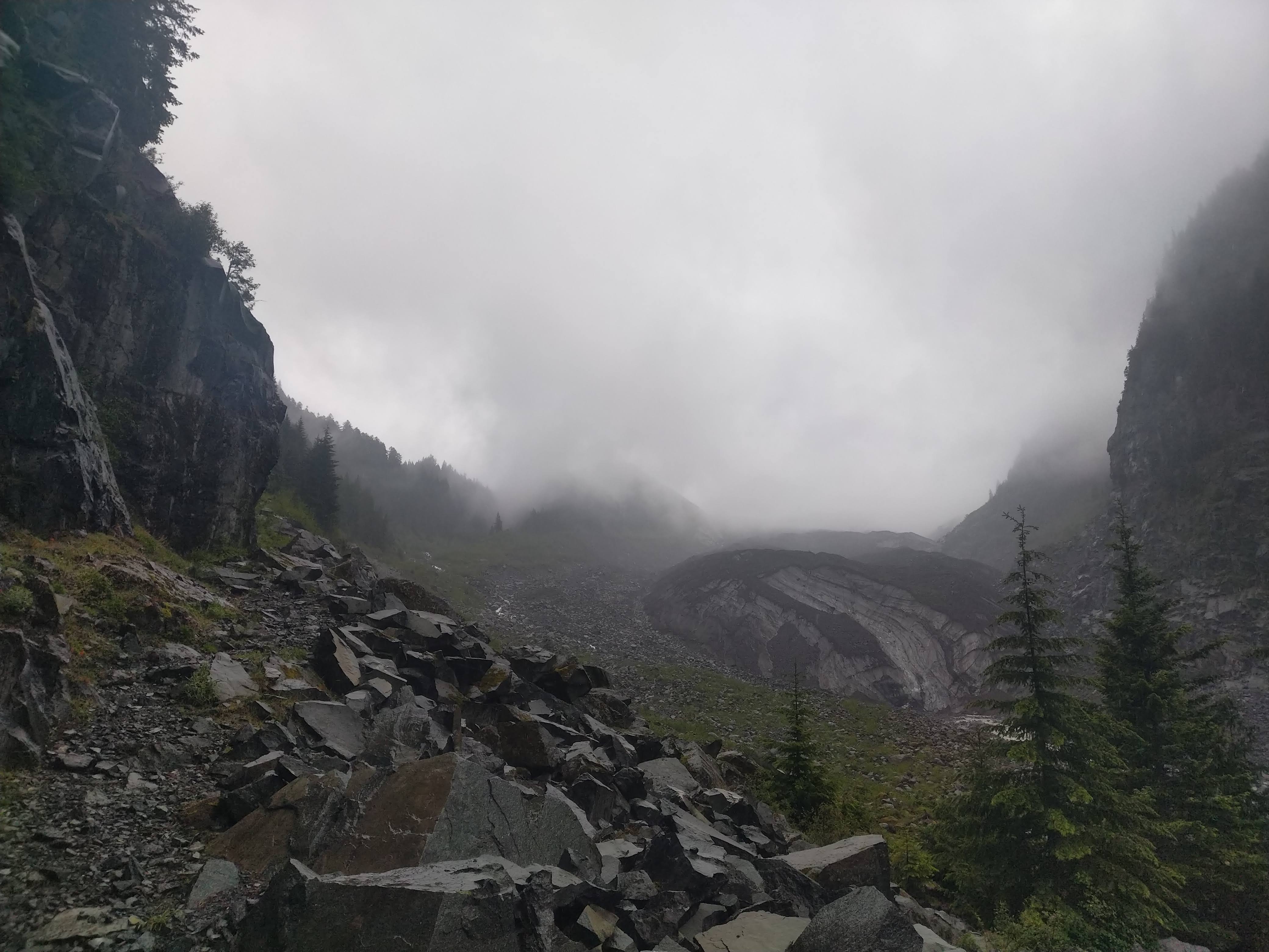 Day 8 saw the last of the 2 suspension bridges and ended at the most epic campsite of the trip at carbon glacier. We also had our Jurassic Park morning - with thick fog and rocky cliffs made you feel like you were in prehistoric times. I think I took the most pictures this day, so hopefully I can narrate them well after so many years. We had two options for how to proceed here - either Spray park or Ipsut pass. Spray park tends to have a lot of snow pack early in the season, and having seen a lot of snow this year we though Spray park might be challenging (or even impassible). Later in the season, Spray park is the place to go for wildflowers - so we made a mental note to return in a future year (we haven’t done it yet, but hopefuly soon!