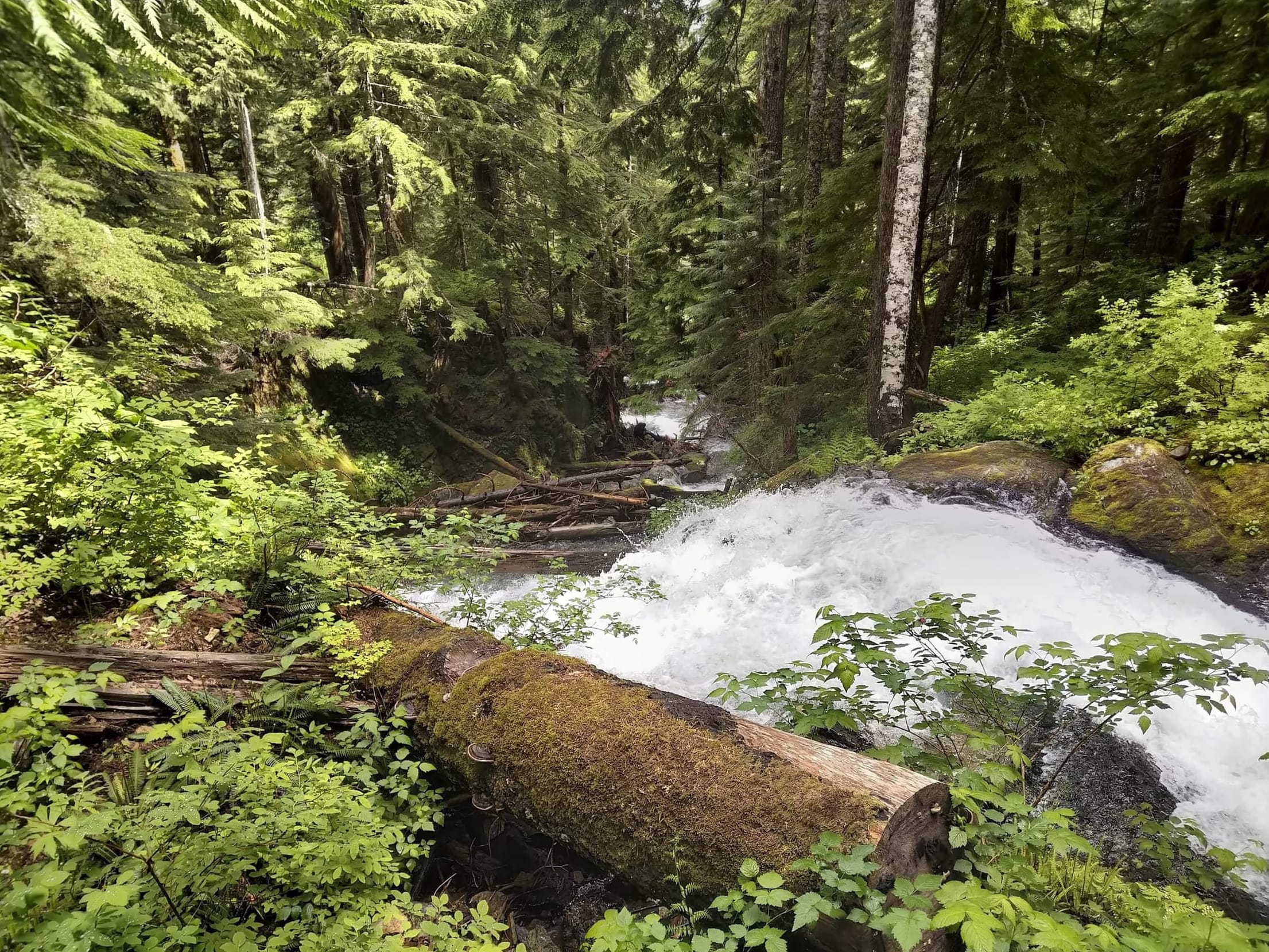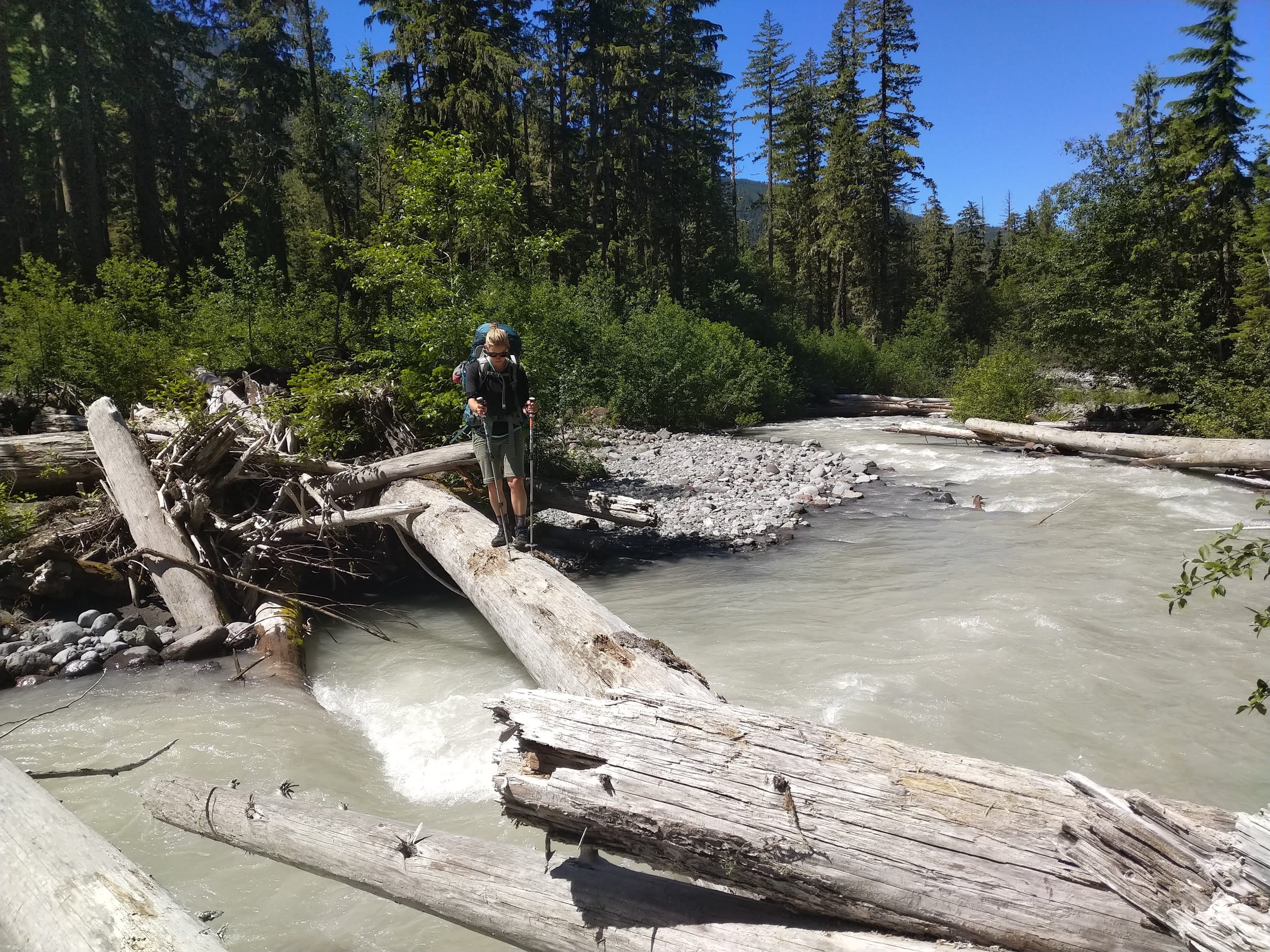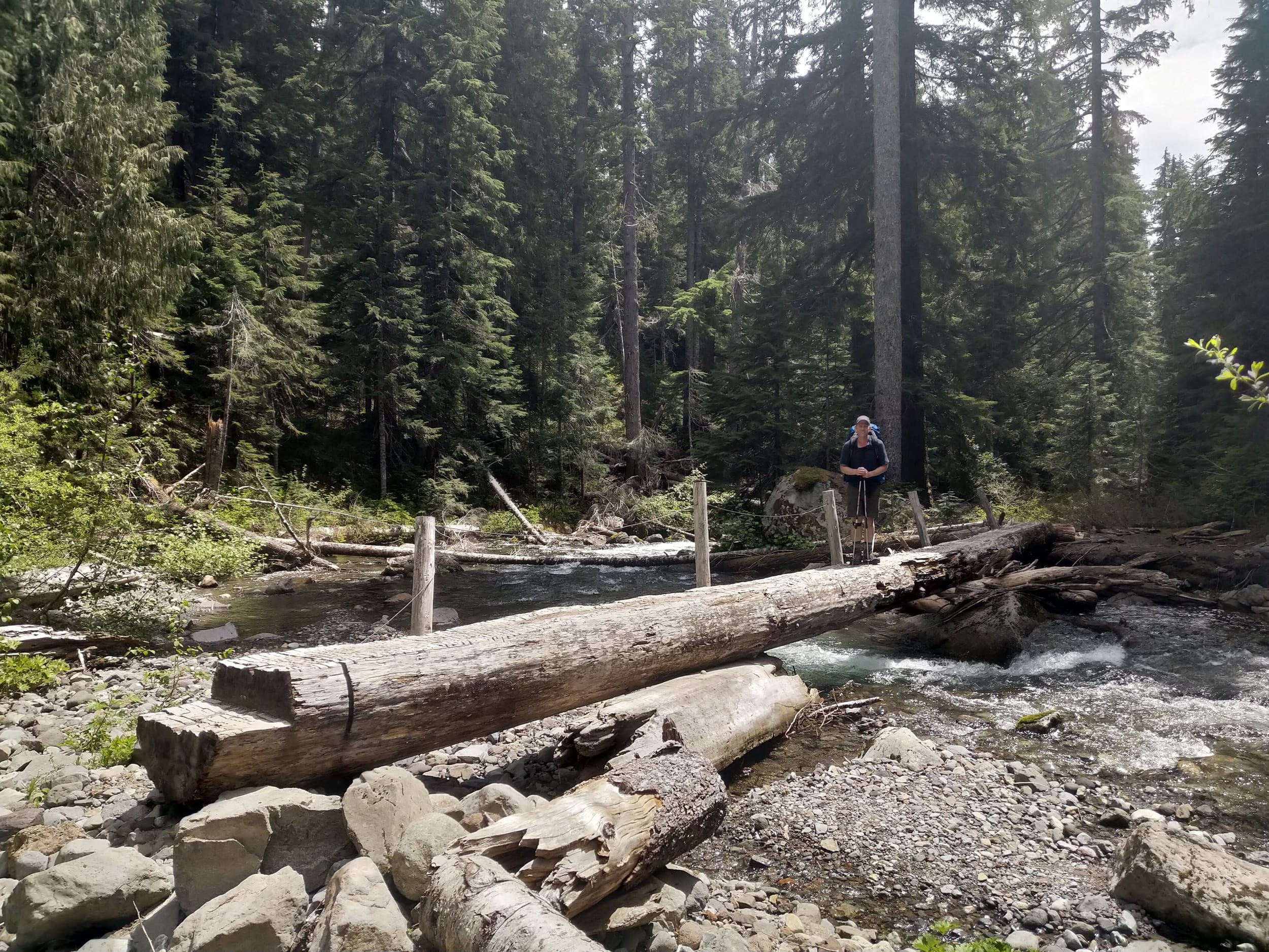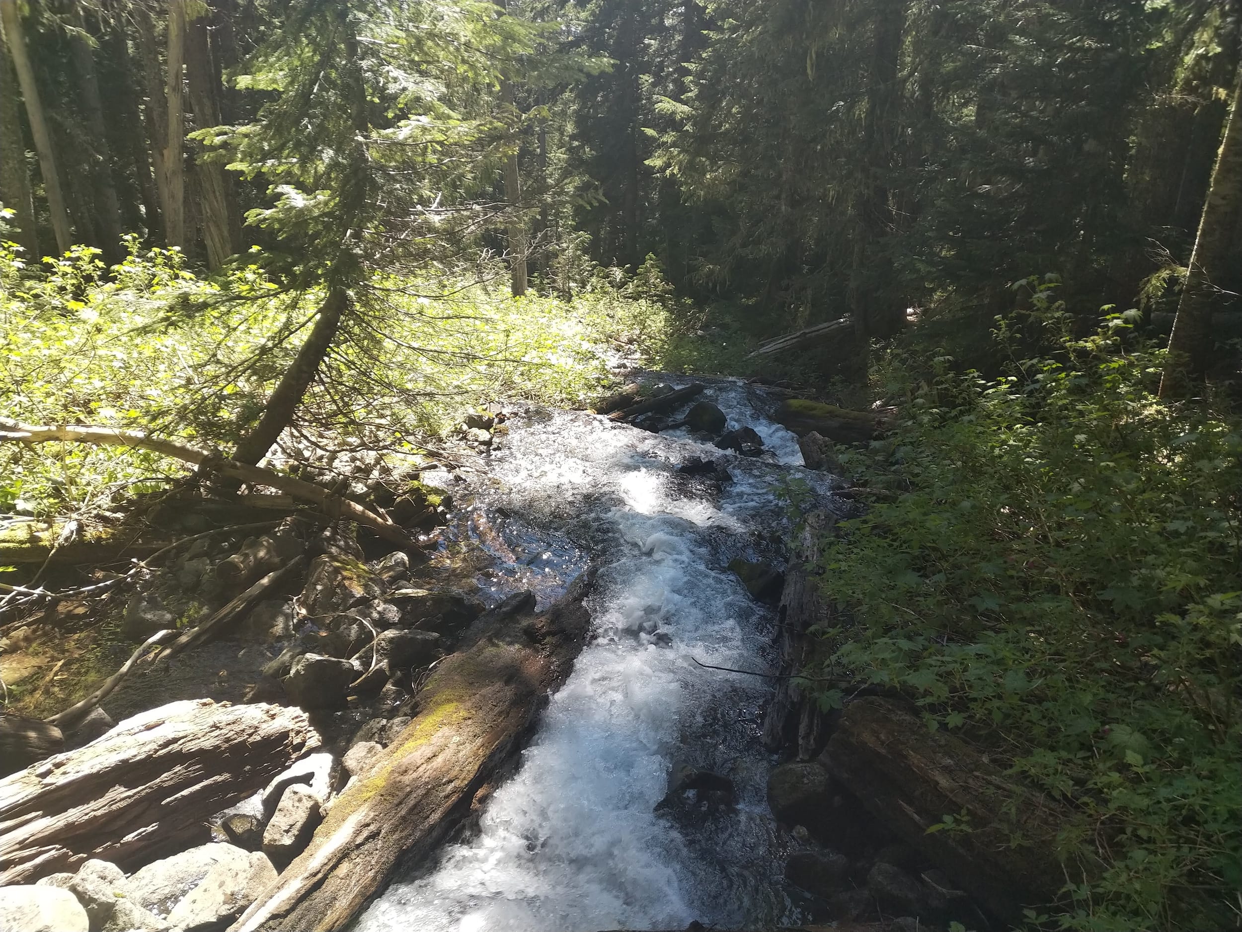 The S Mowich River was a crossing we had heard about before starting. It’s a big stream, but it’s really spread out where the crossing occurs. You basicaly scramble across logs/fallen trees to get to the other side. We ran into some folks at camp that night that did it without any wading, but we were not so lucky and ended up crossing up to our ankles in a couple of places. Thankfully, the rain had stopped at this point and we were able to lay our stuff (and ourselves) on a couple of logs to dry things out before continuing. It was a glorious break - sunny, warm, and refreshing after the rain. This break was certainly one of the highlights of the trip.