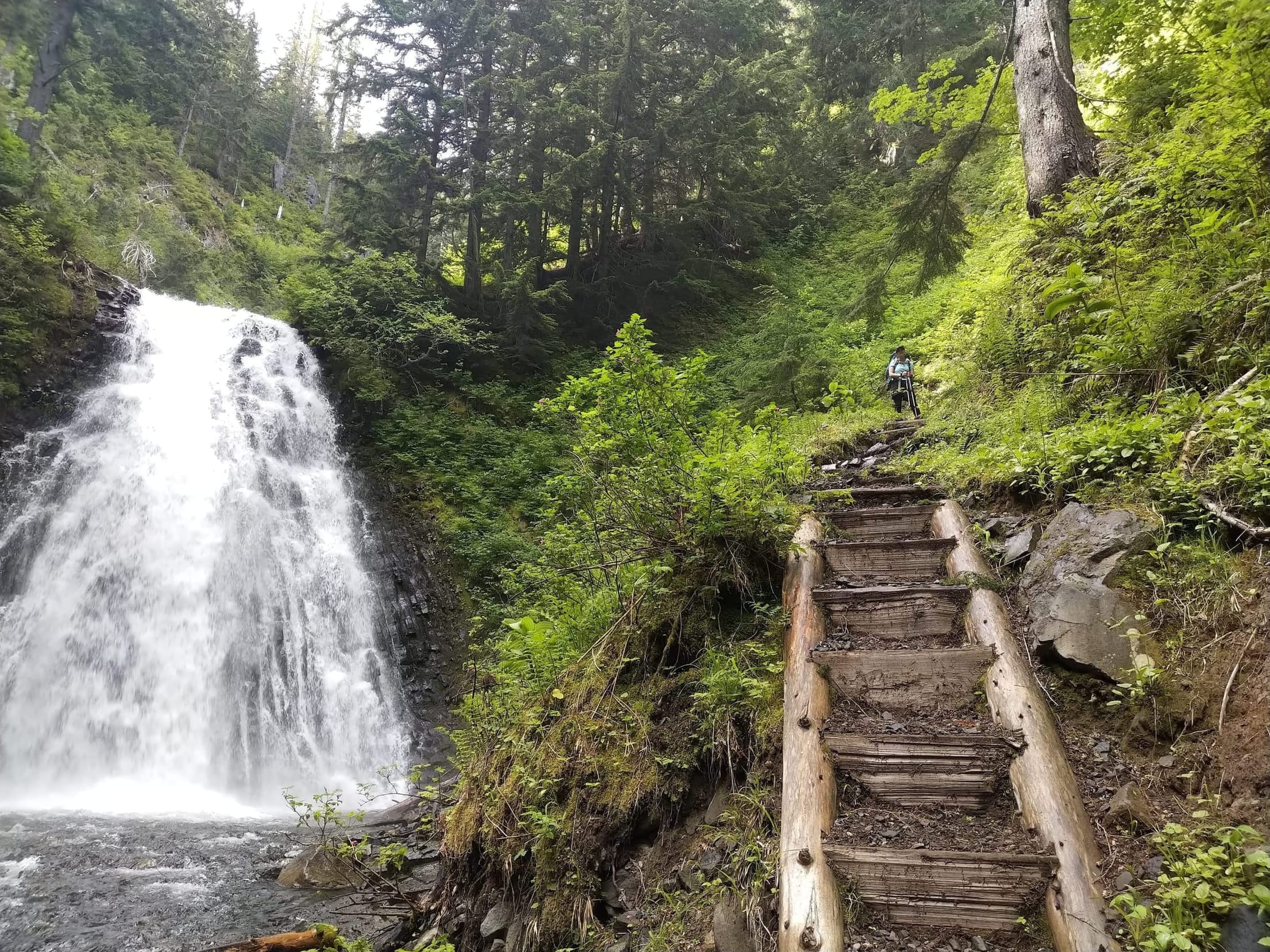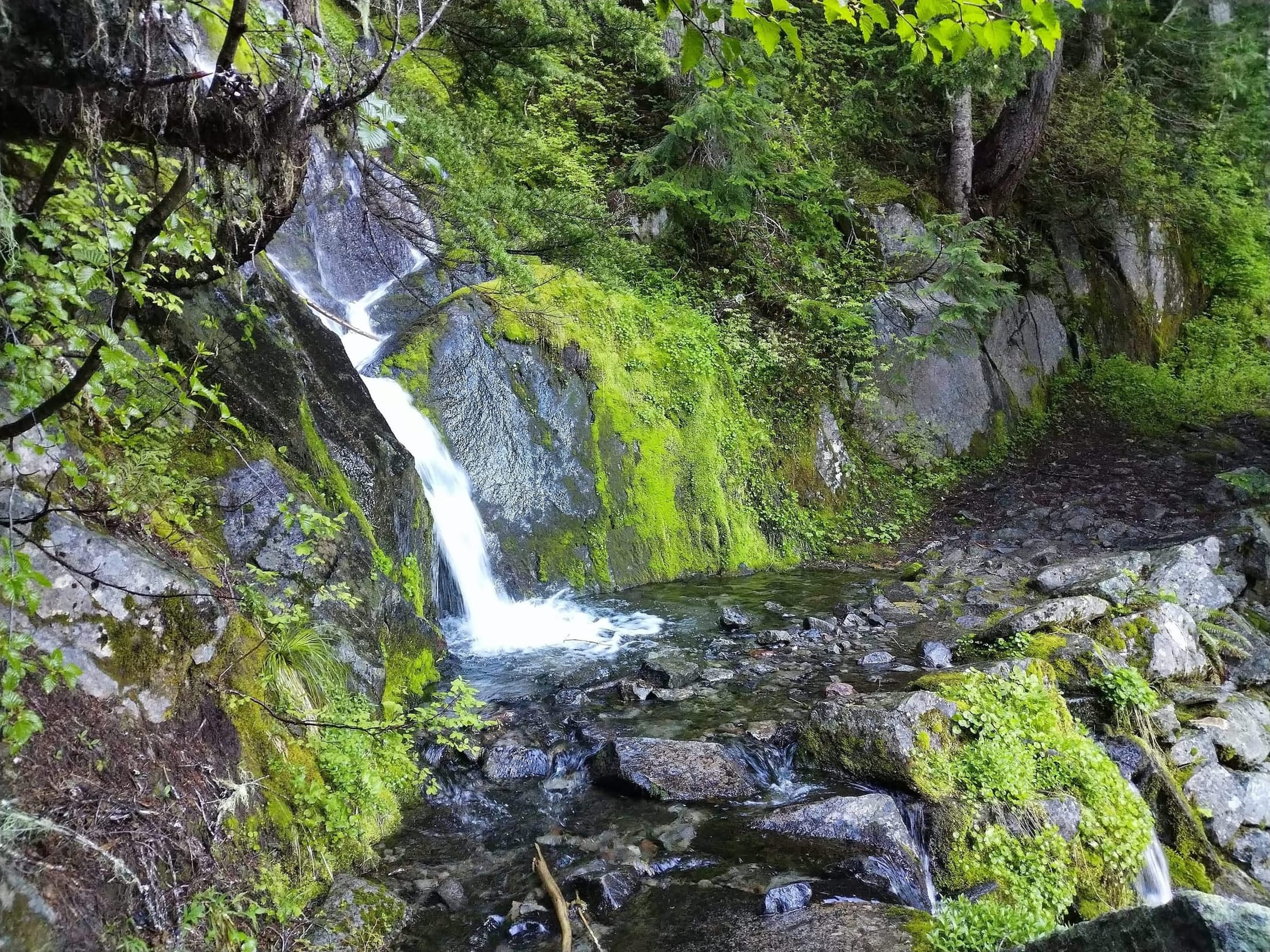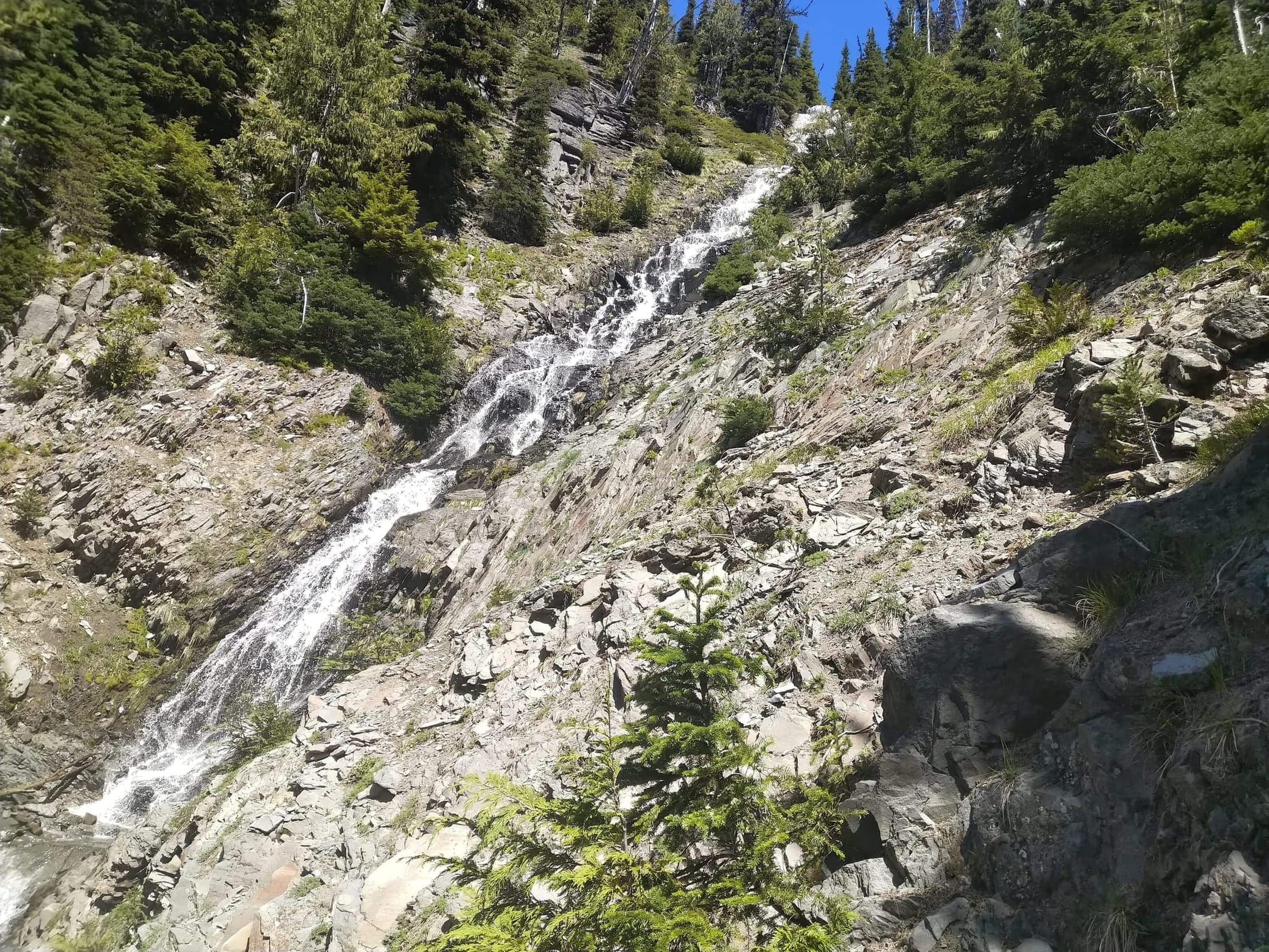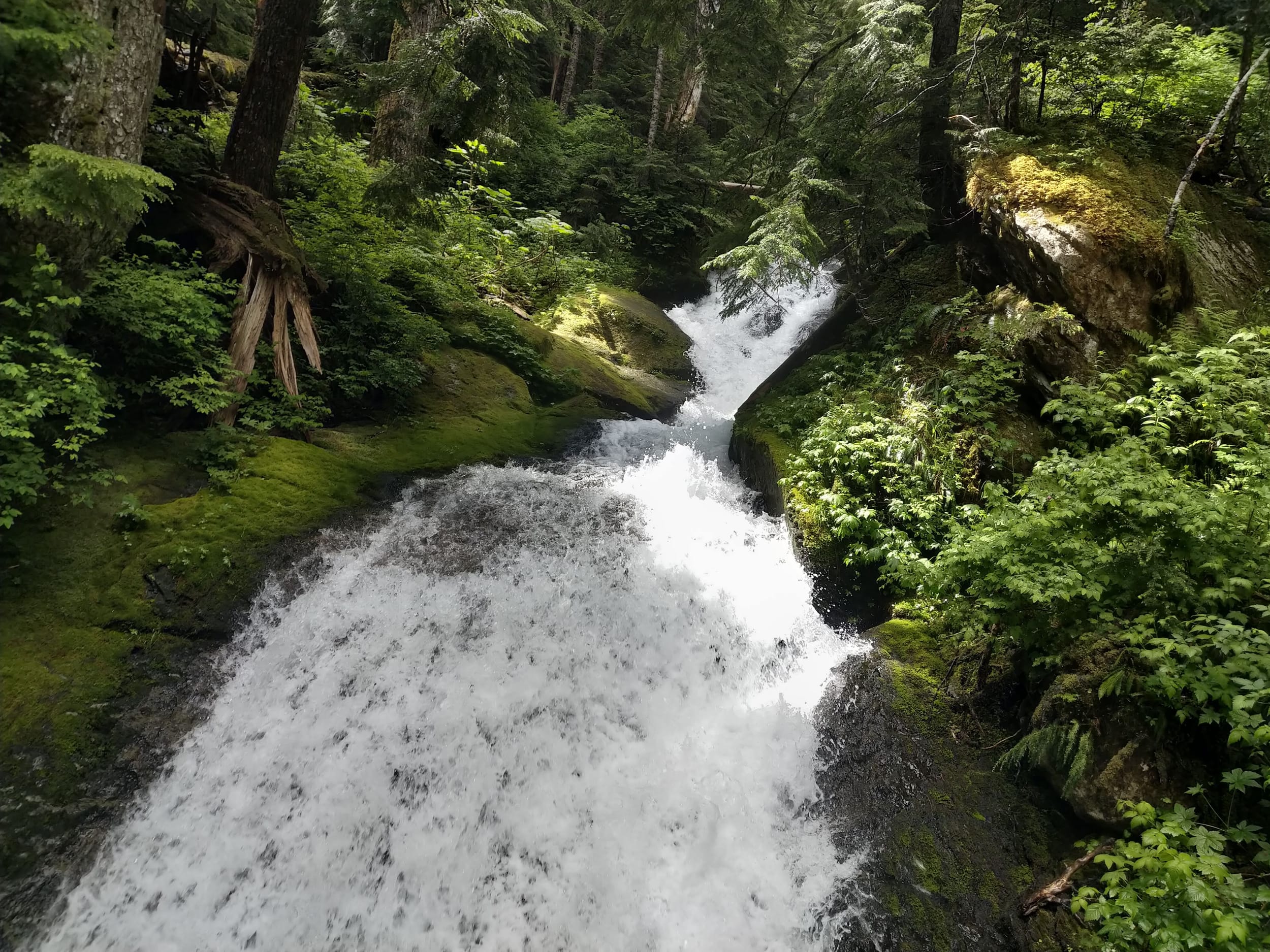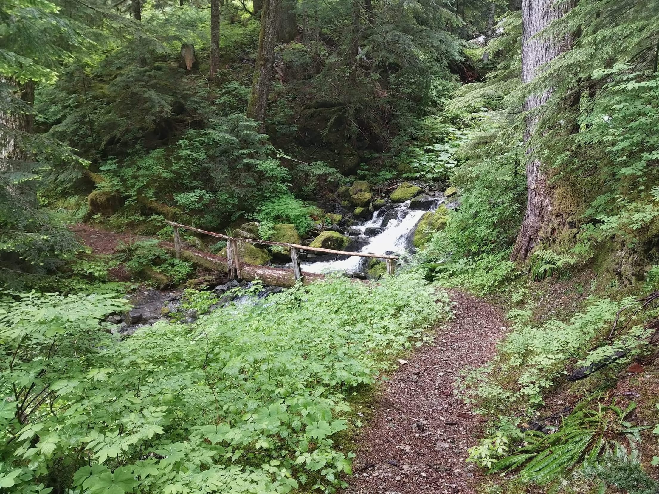 We continued our steady climb over a couple of smaller streams and bridges - and one cool water fall - all the way up to Reflection lake.