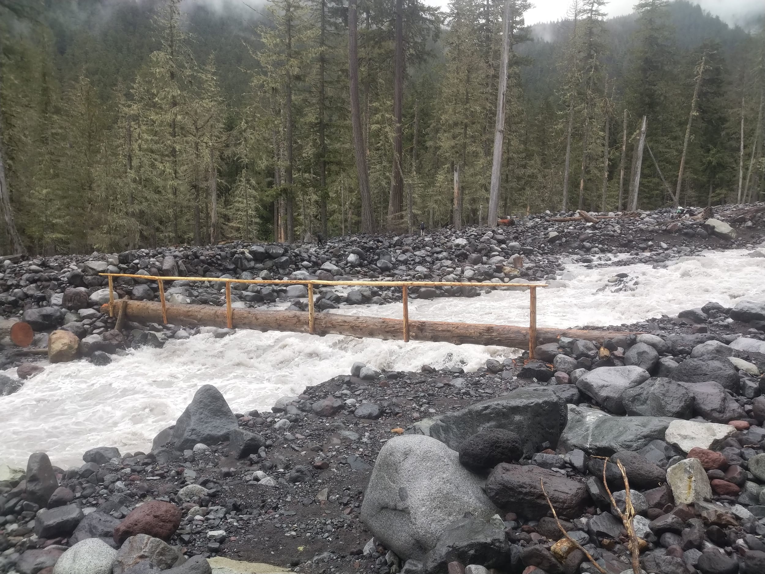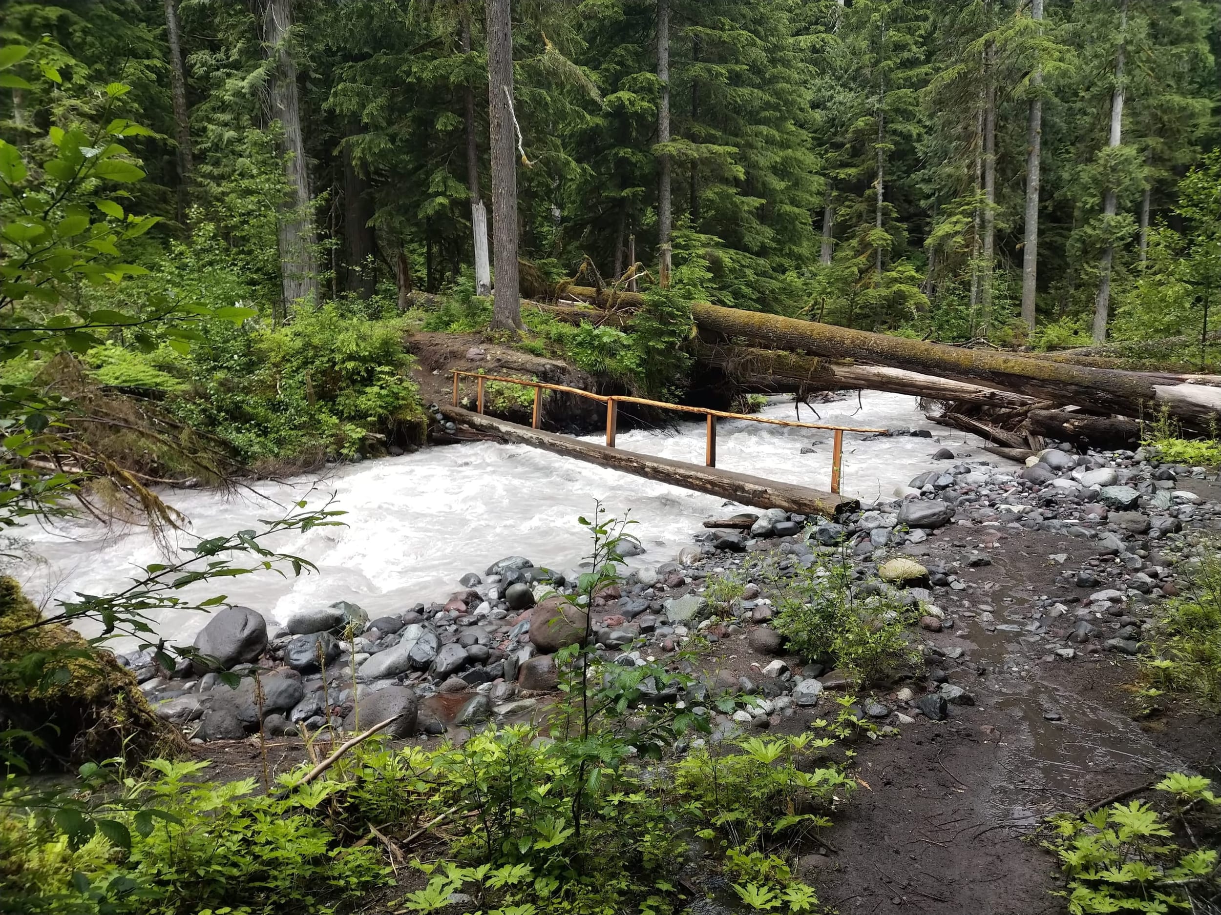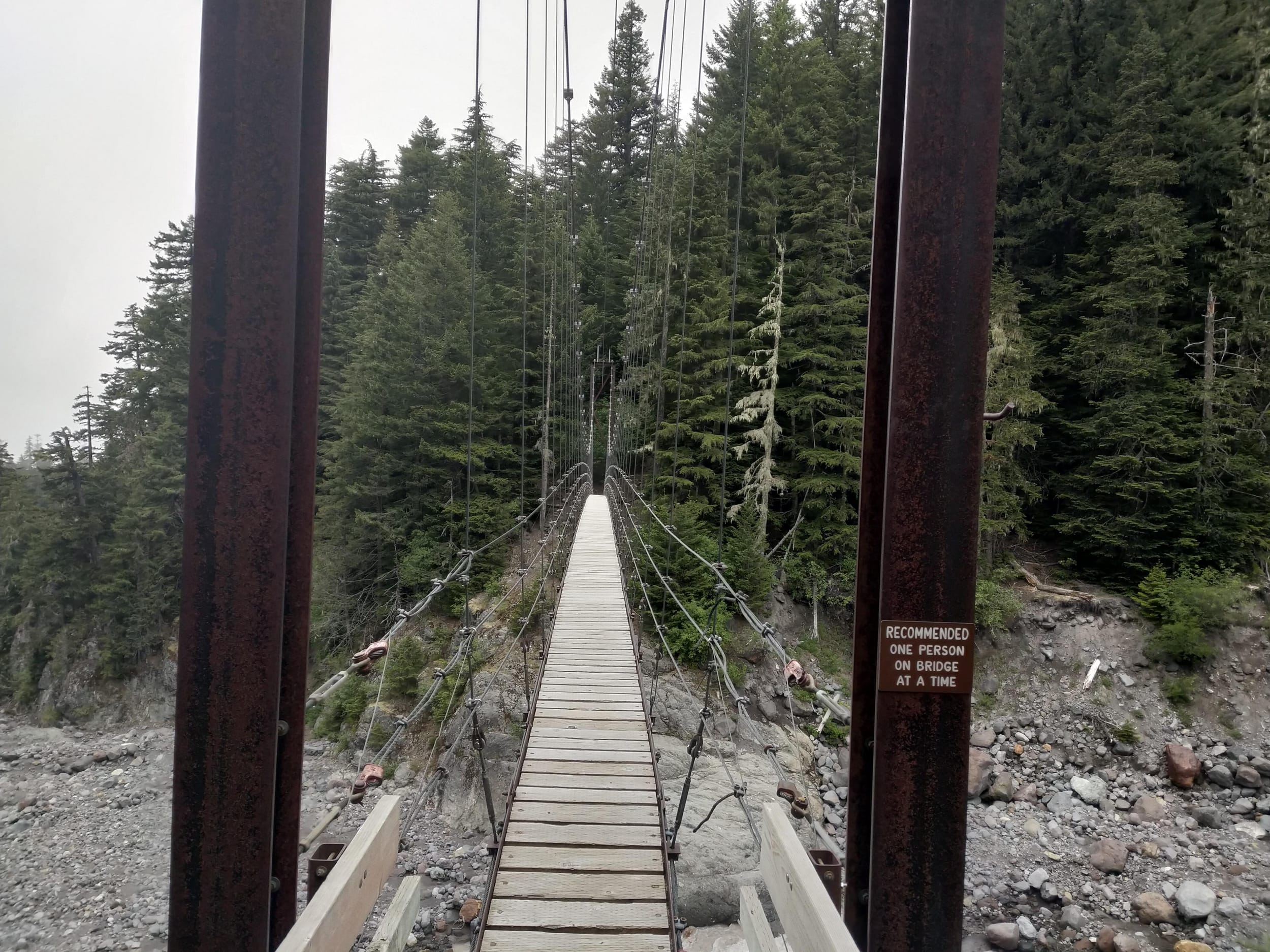 The next leg of our trip was to hike up the carbon river (crossing several offshoots and tributaries before crossing the carbon river suspension bridge. The ranger we met a couple of days earlier mentioned that this was a challening crossing and still needed to be fixed up before the season really started. There was also a detour that pushed us a little out of the way to take the suspension bridge instead of a bridge lower down the valley.