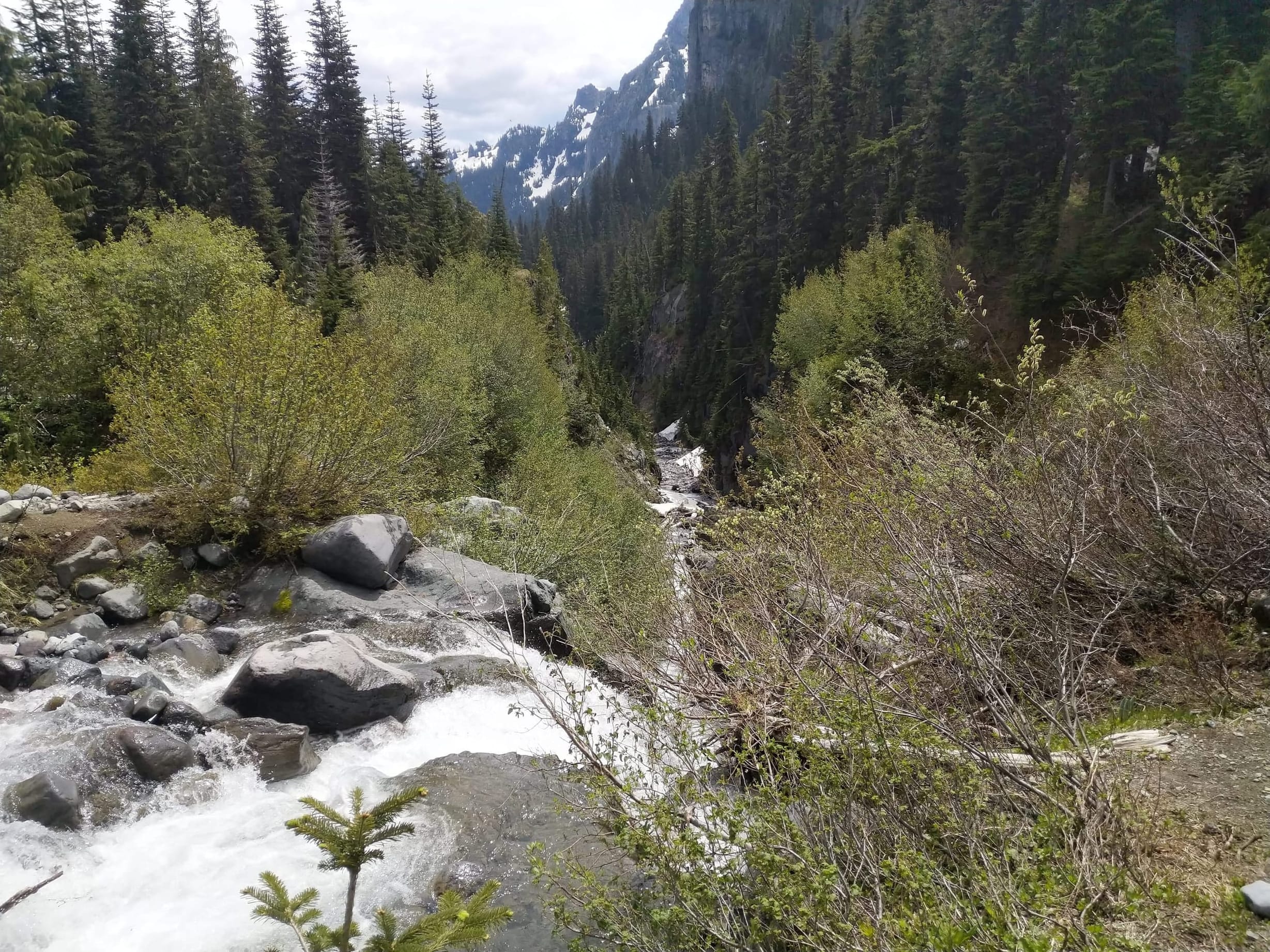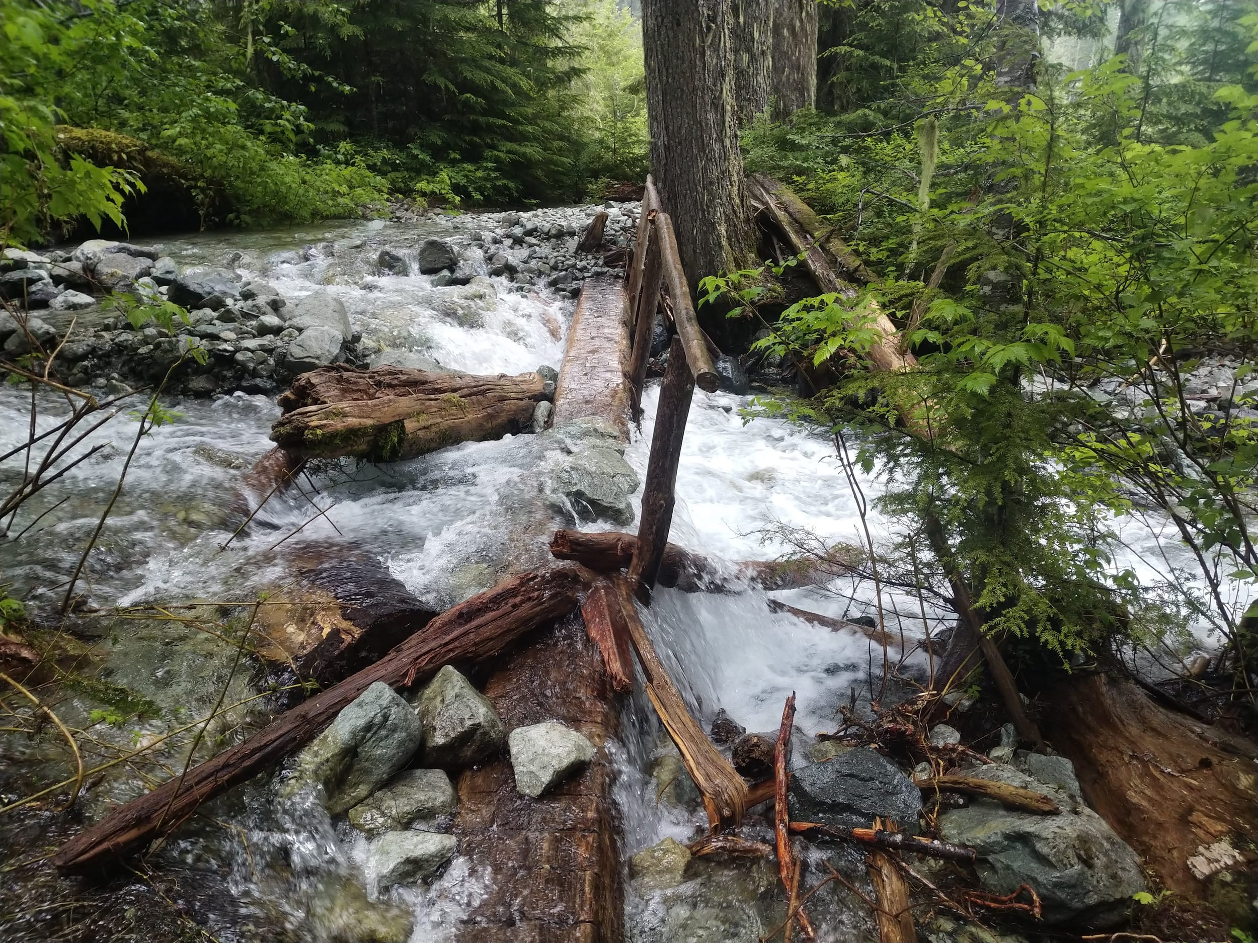 We continued up the carbon river valley crossing several more sections of the carbon river before begining the climb up the side of the Carbon river valley. This area was definitely in early season and I expect a lot of these crossing were to be fixed by the time the hiking season was in full swing.