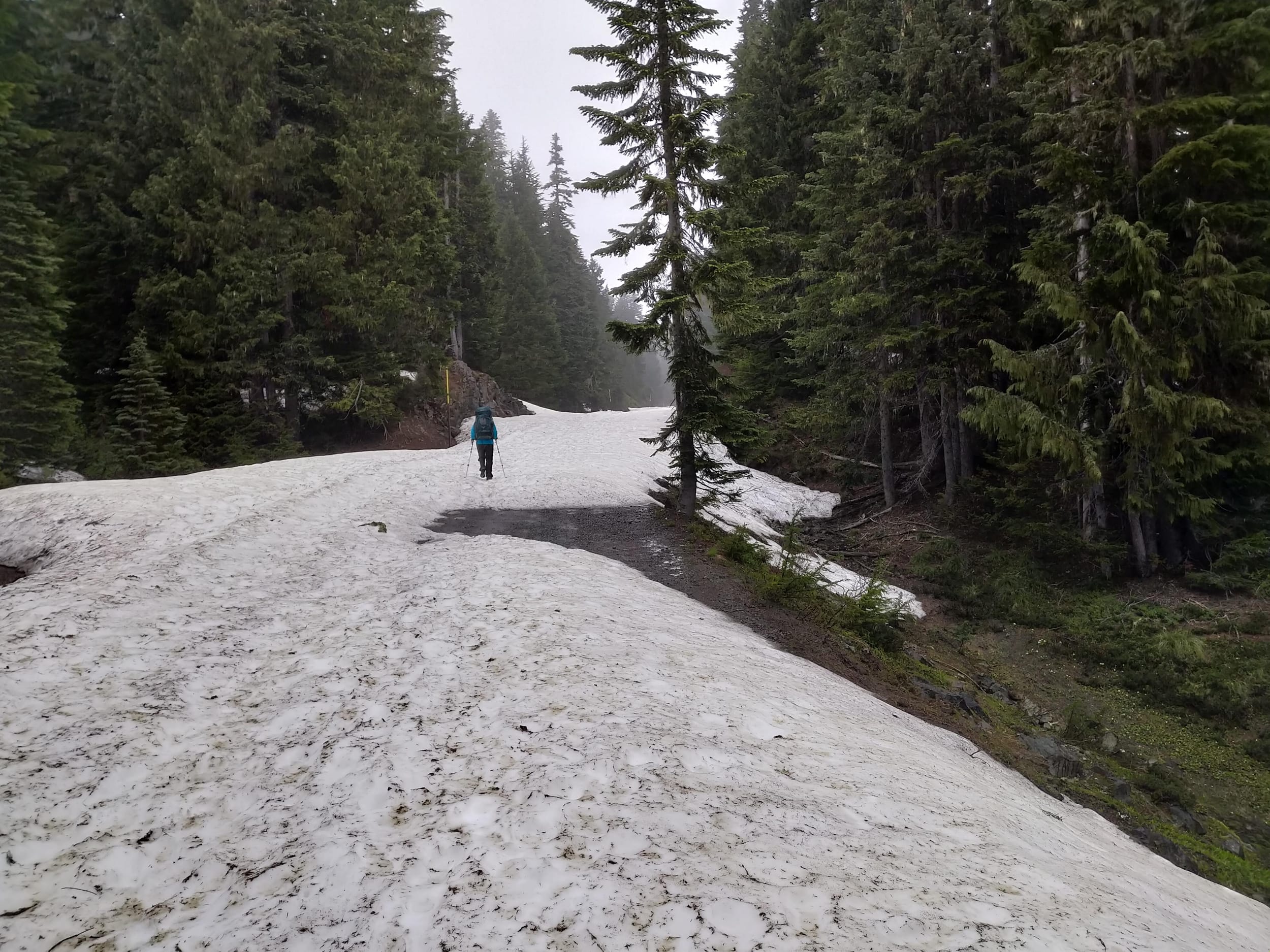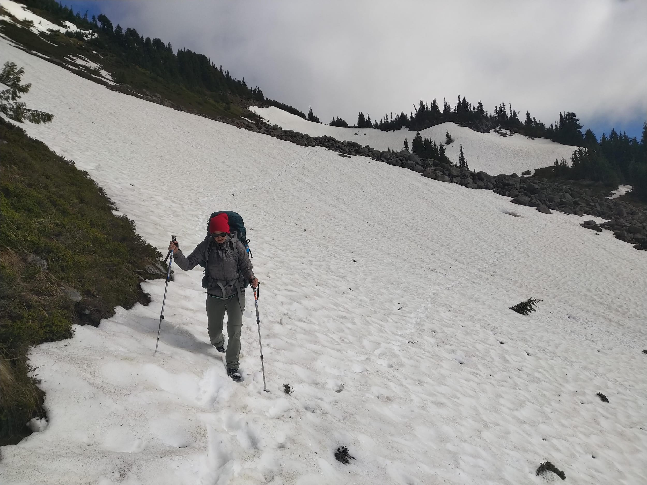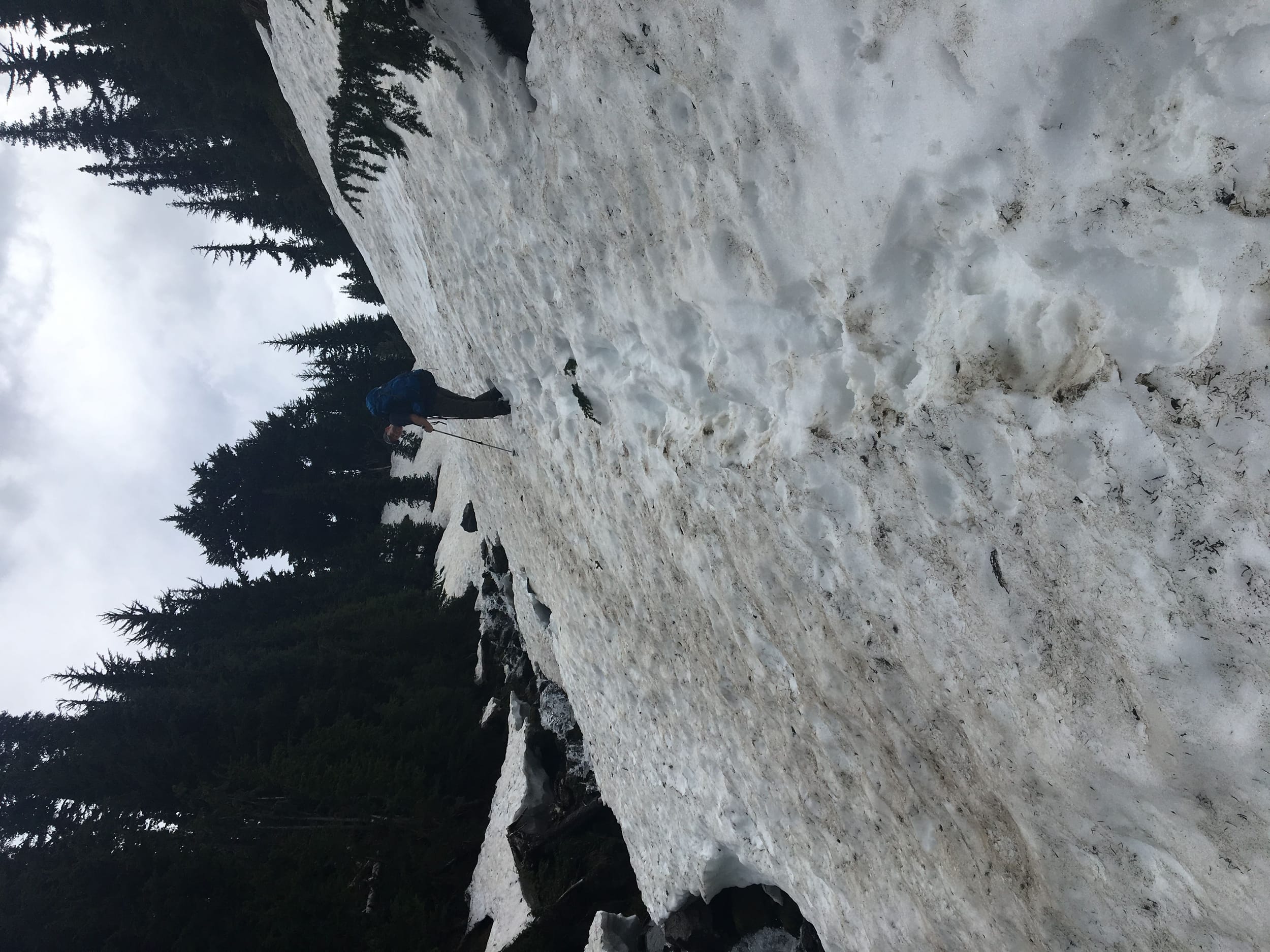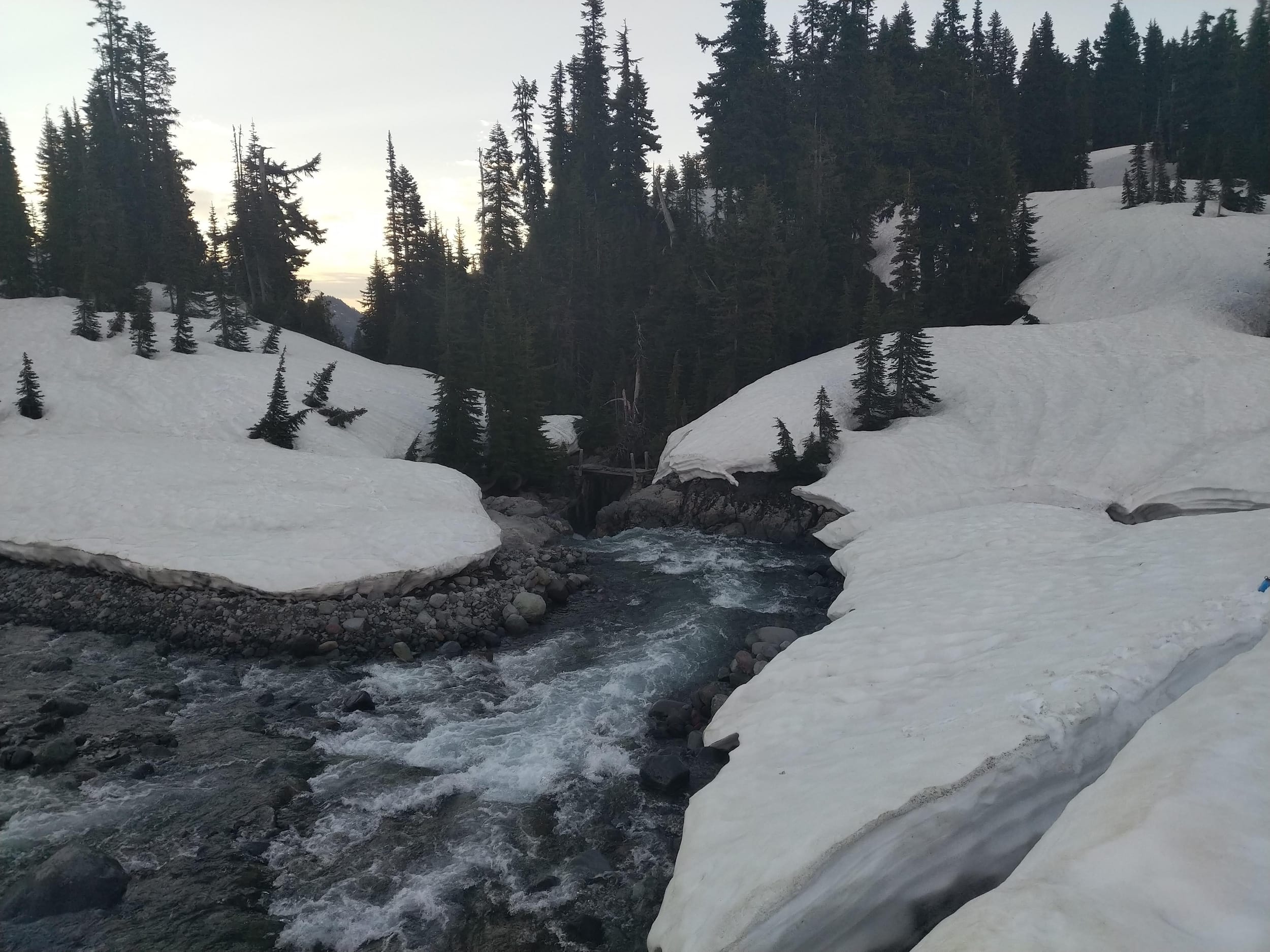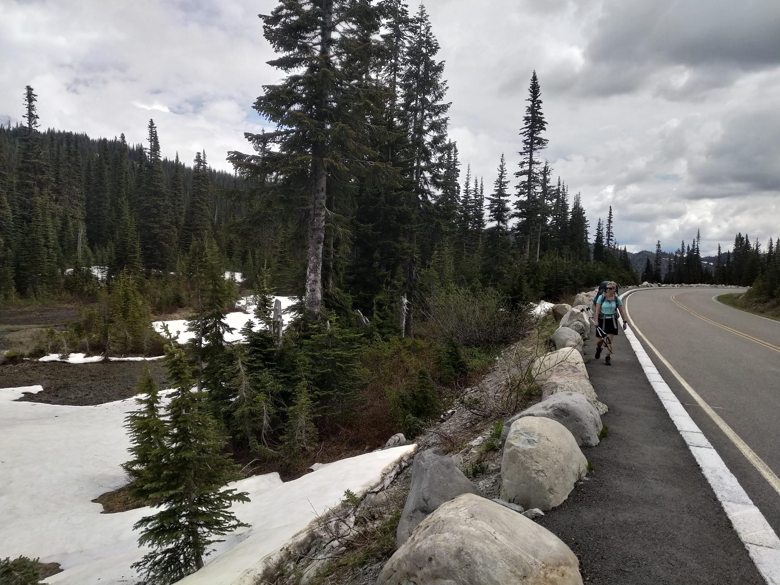 Day 6 was a bit of a lighter day at 8 miles starting off with a downhill and coming back up a long steady climb to our camp for the night. Some interesting sights like the N Puyallup brige and the approaching west-side road and some beautiful snow banks.