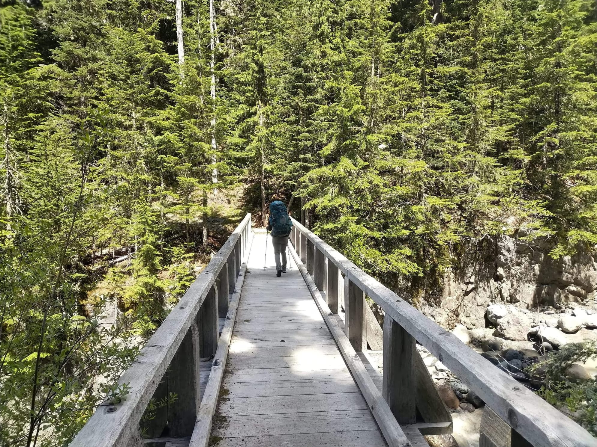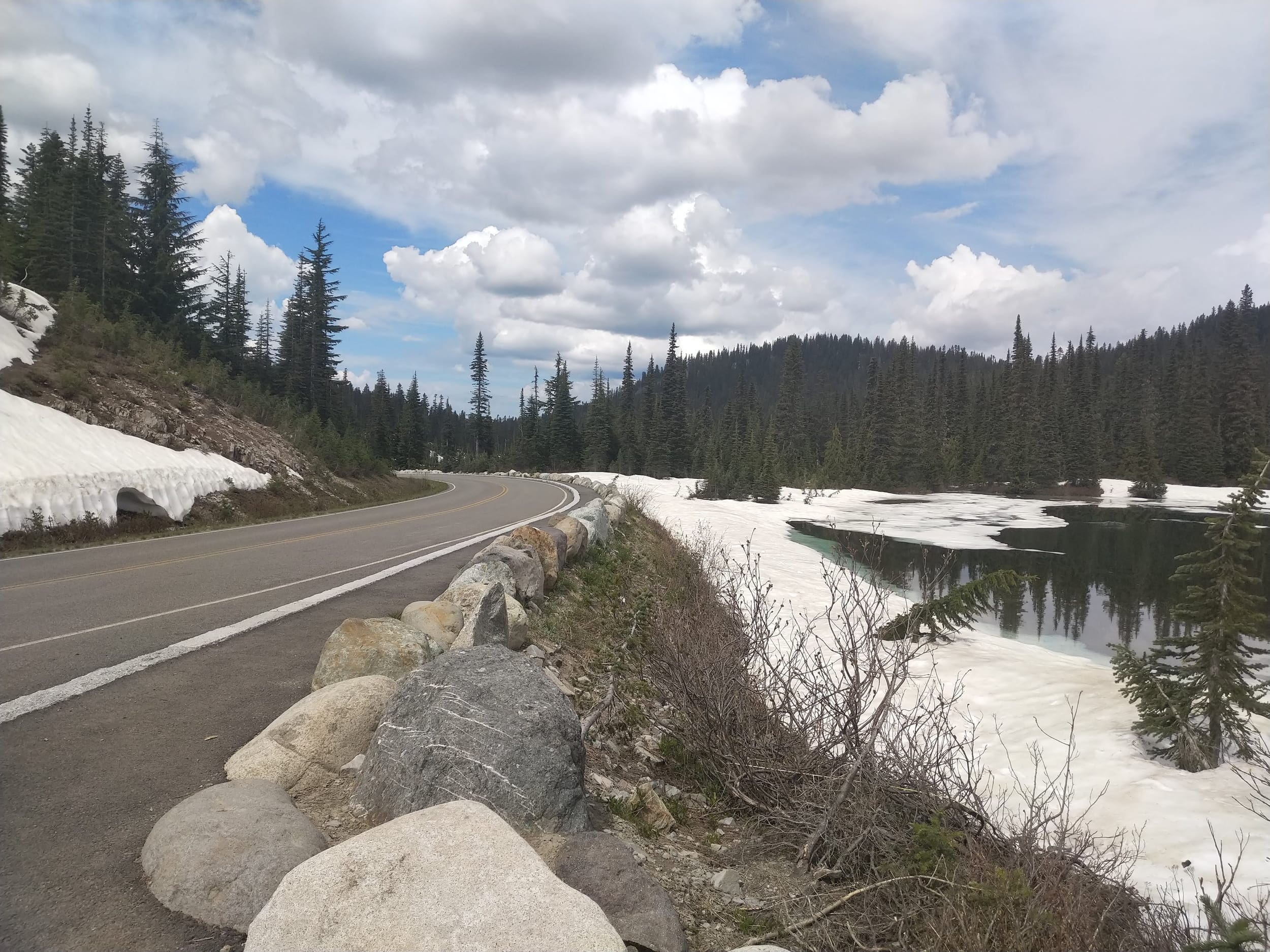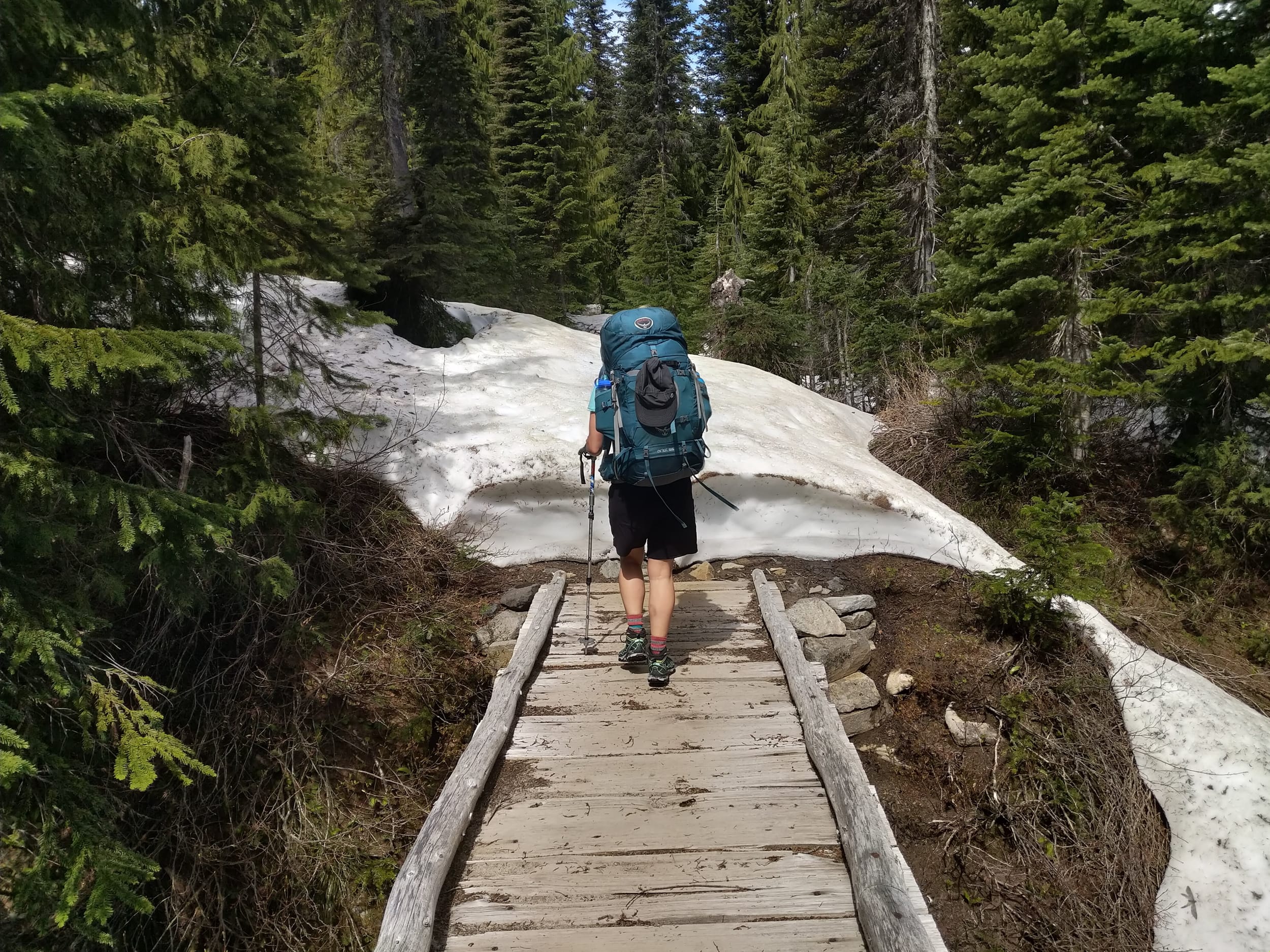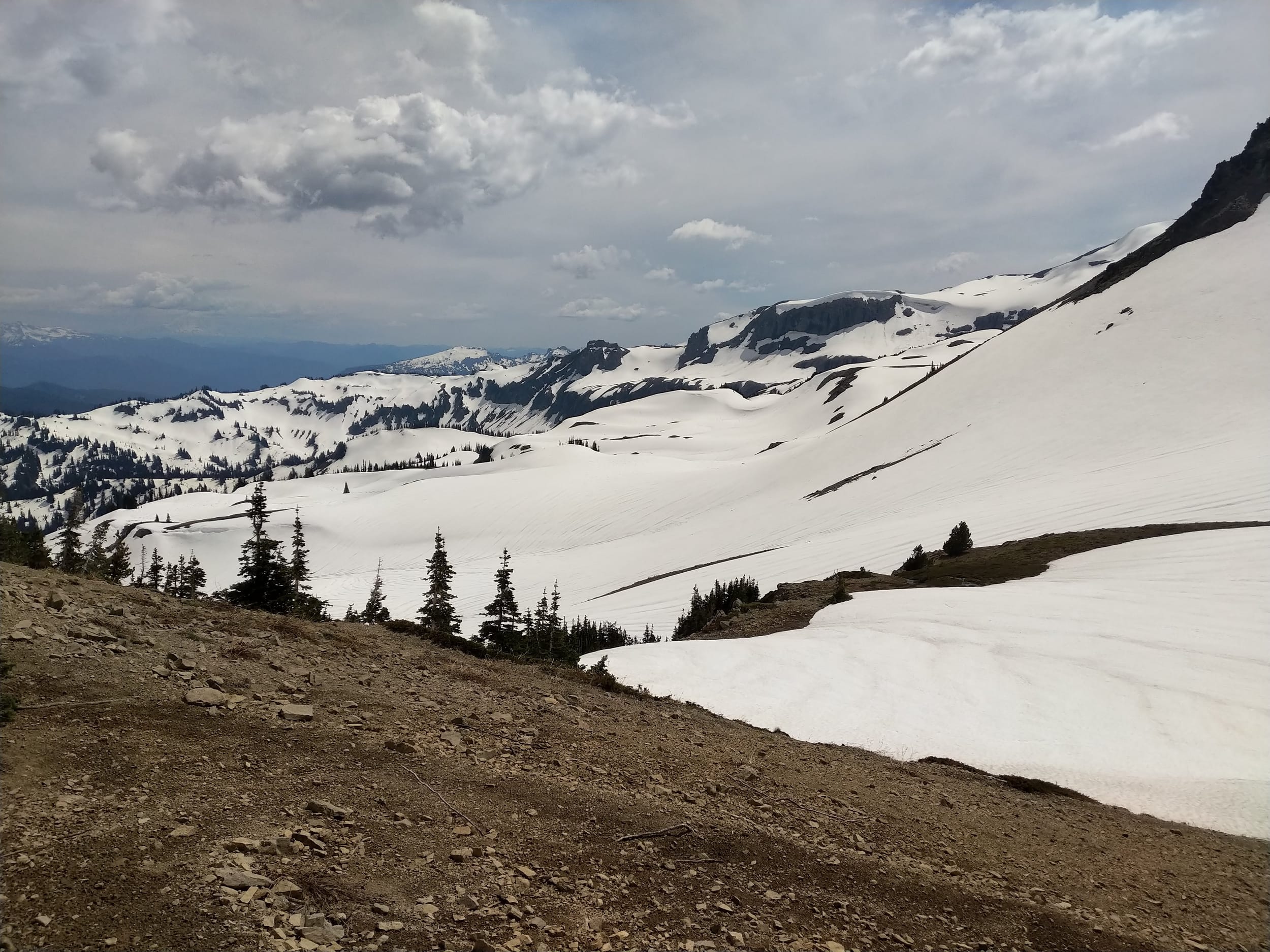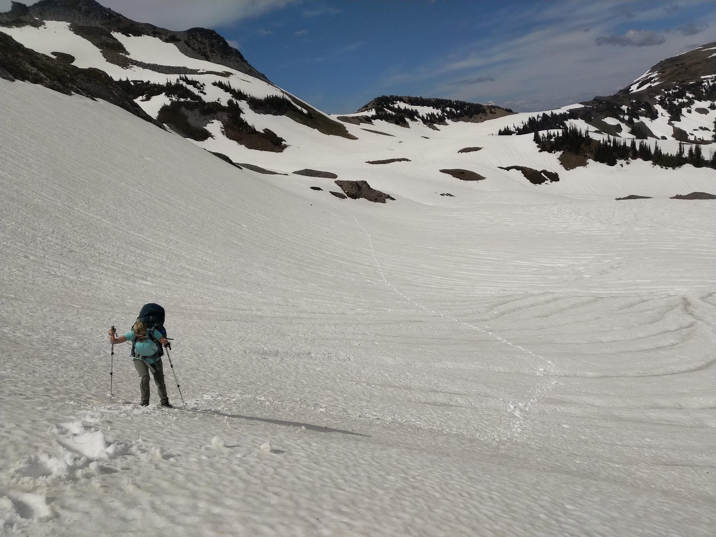 Day 6 was a bit of a lighter day at 8 miles starting off with a downhill and coming back up a long steady climb to our camp for the night. Some interesting sights like the N Puyallup brige and the approaching west-side road and some beautiful snow banks.