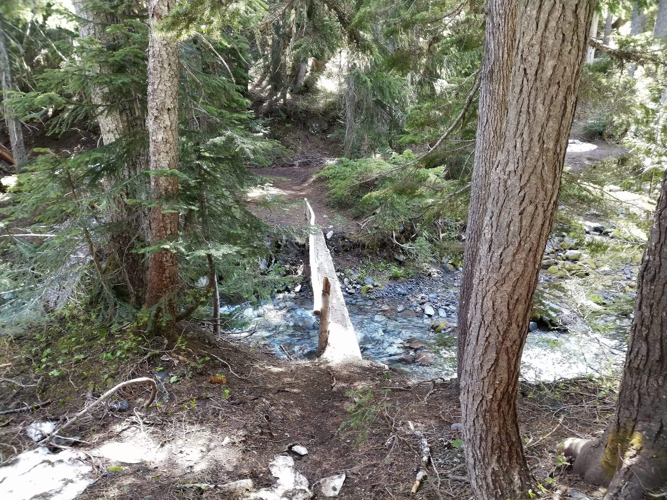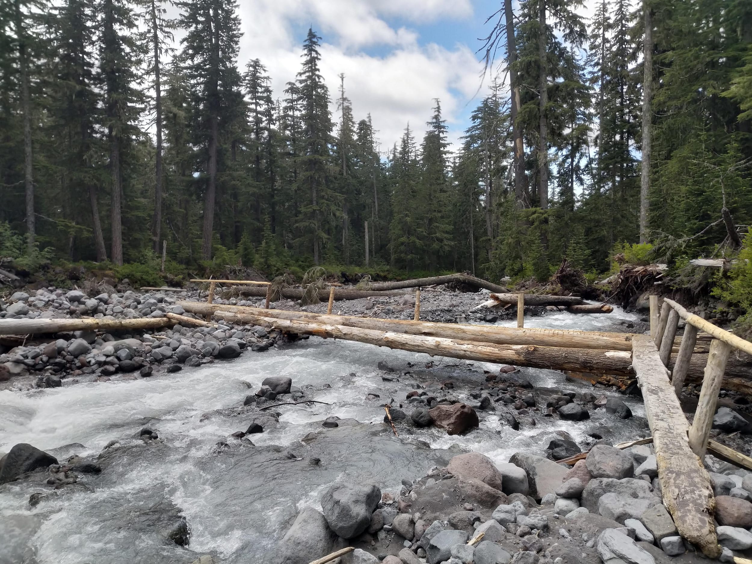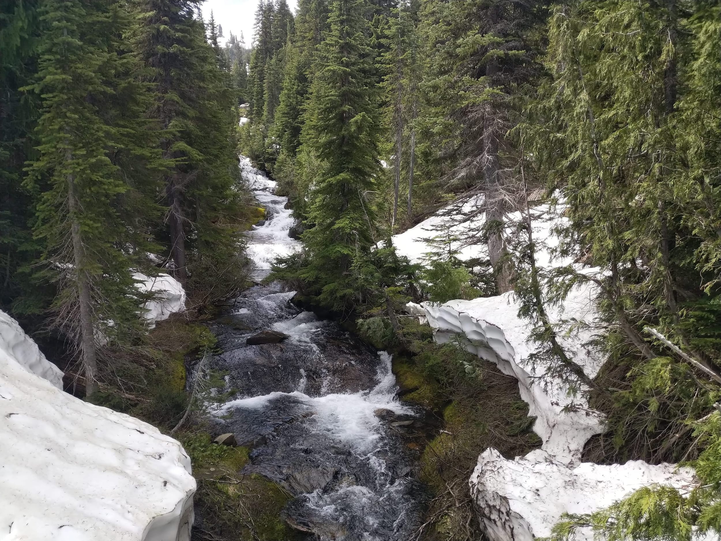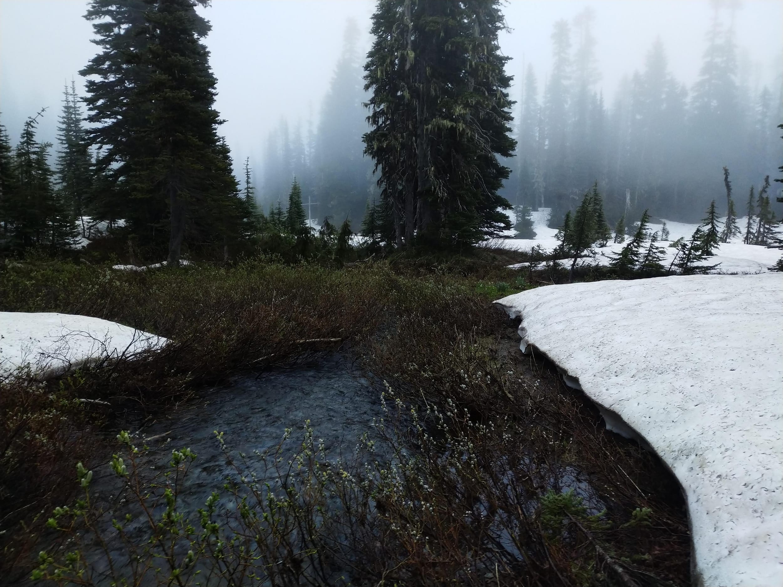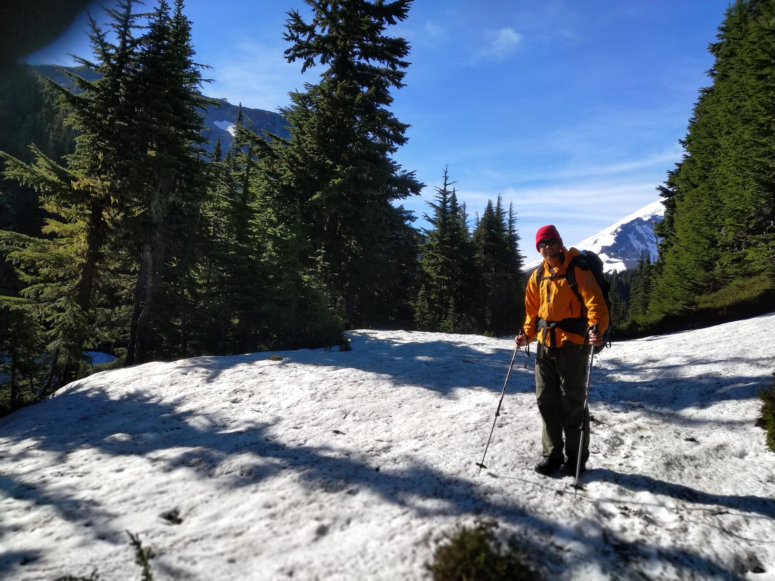 Day 6 was a bit of a lighter day at 8 miles starting off with a downhill and coming back up a long steady climb to our camp for the night. Some interesting sights like the N Puyallup brige and the approaching west-side road and some beautiful snow banks.