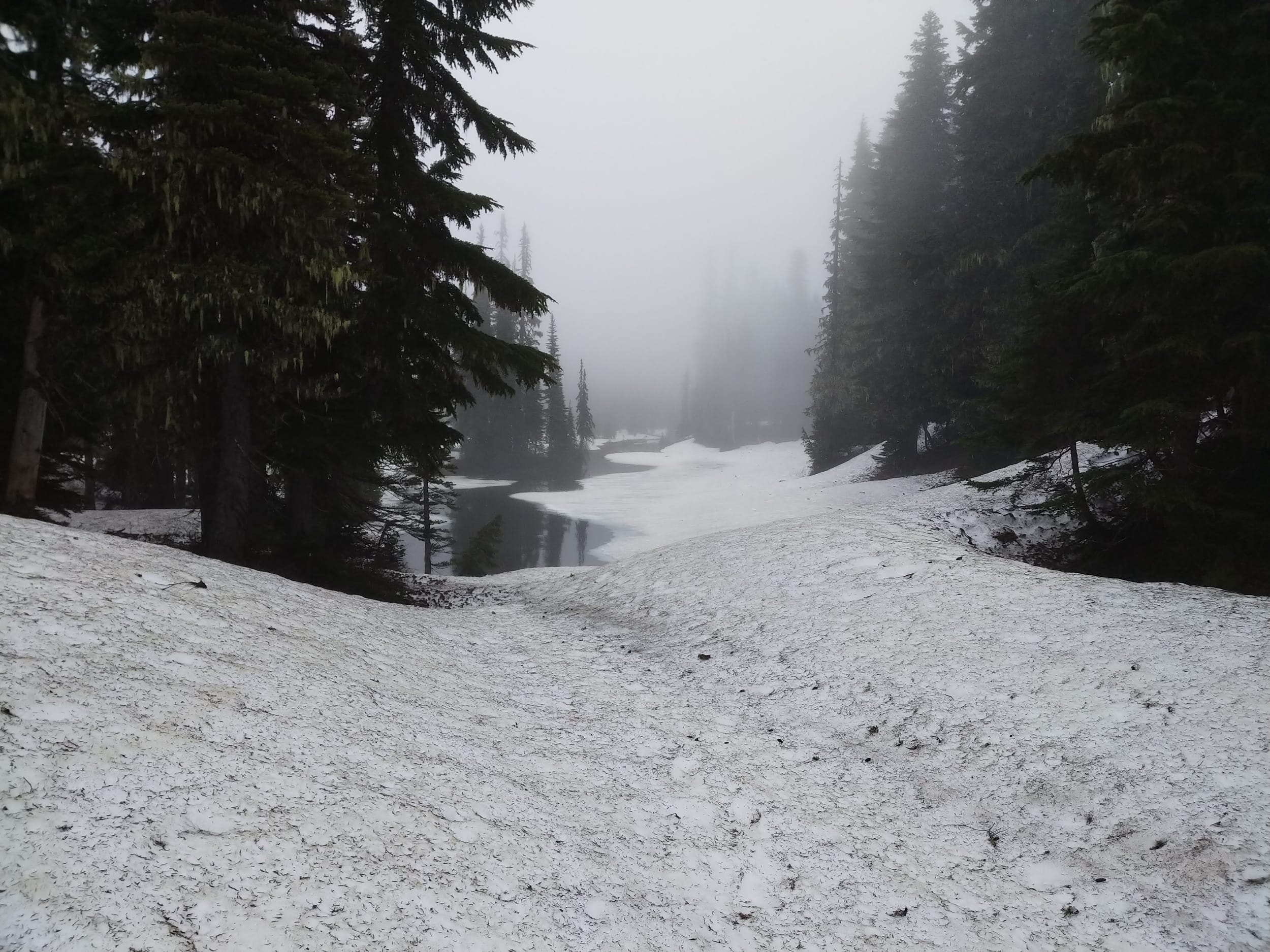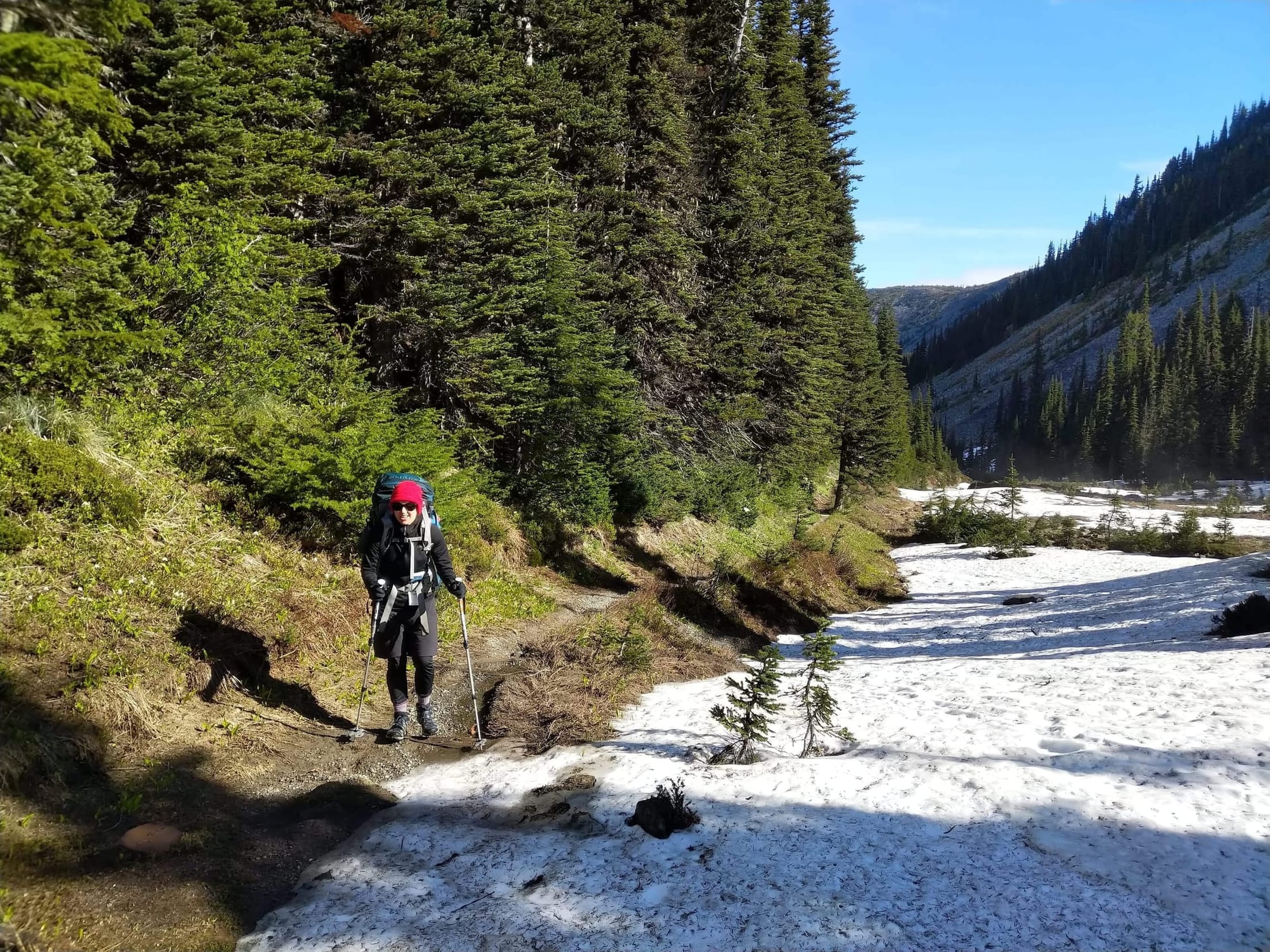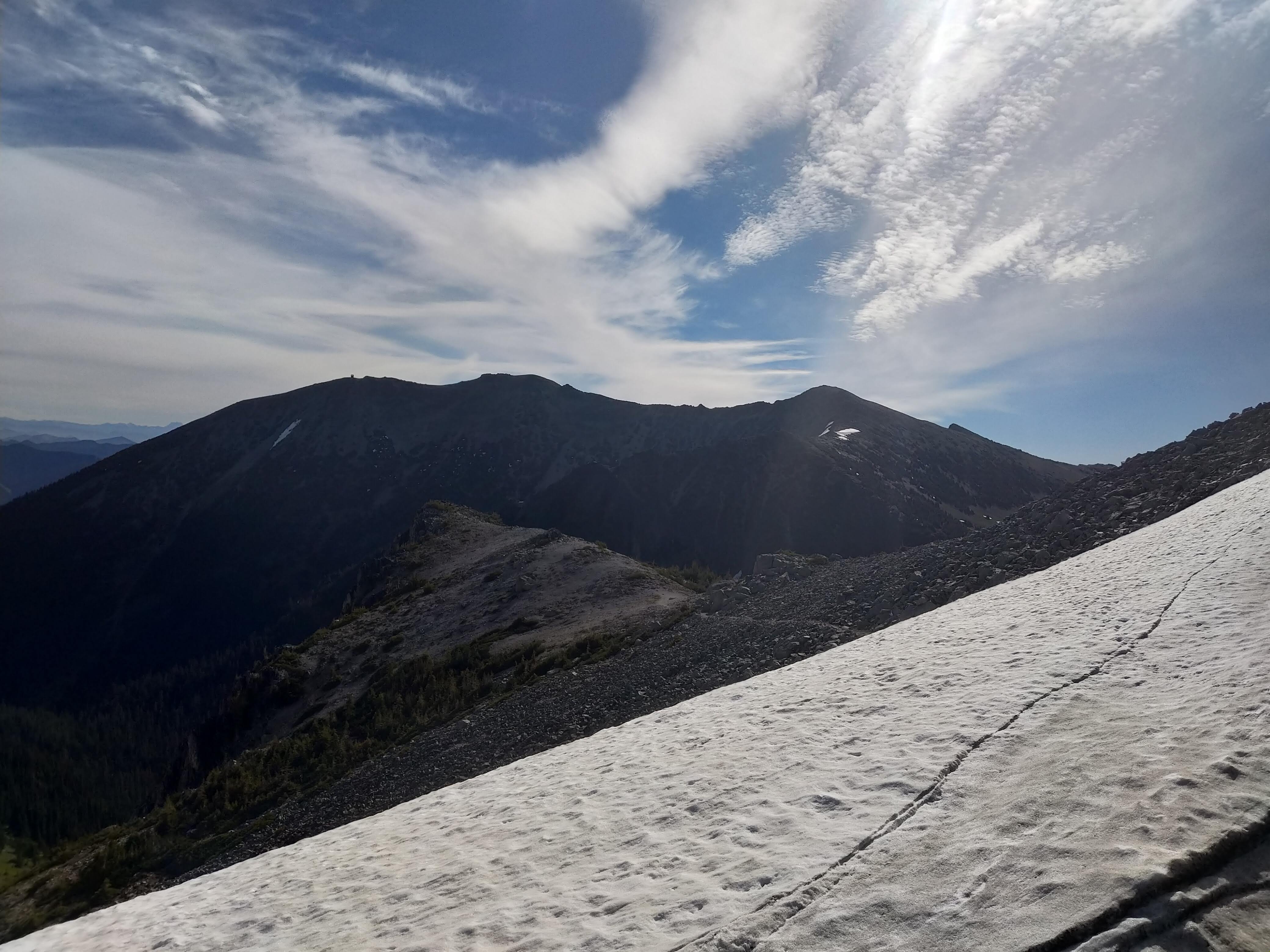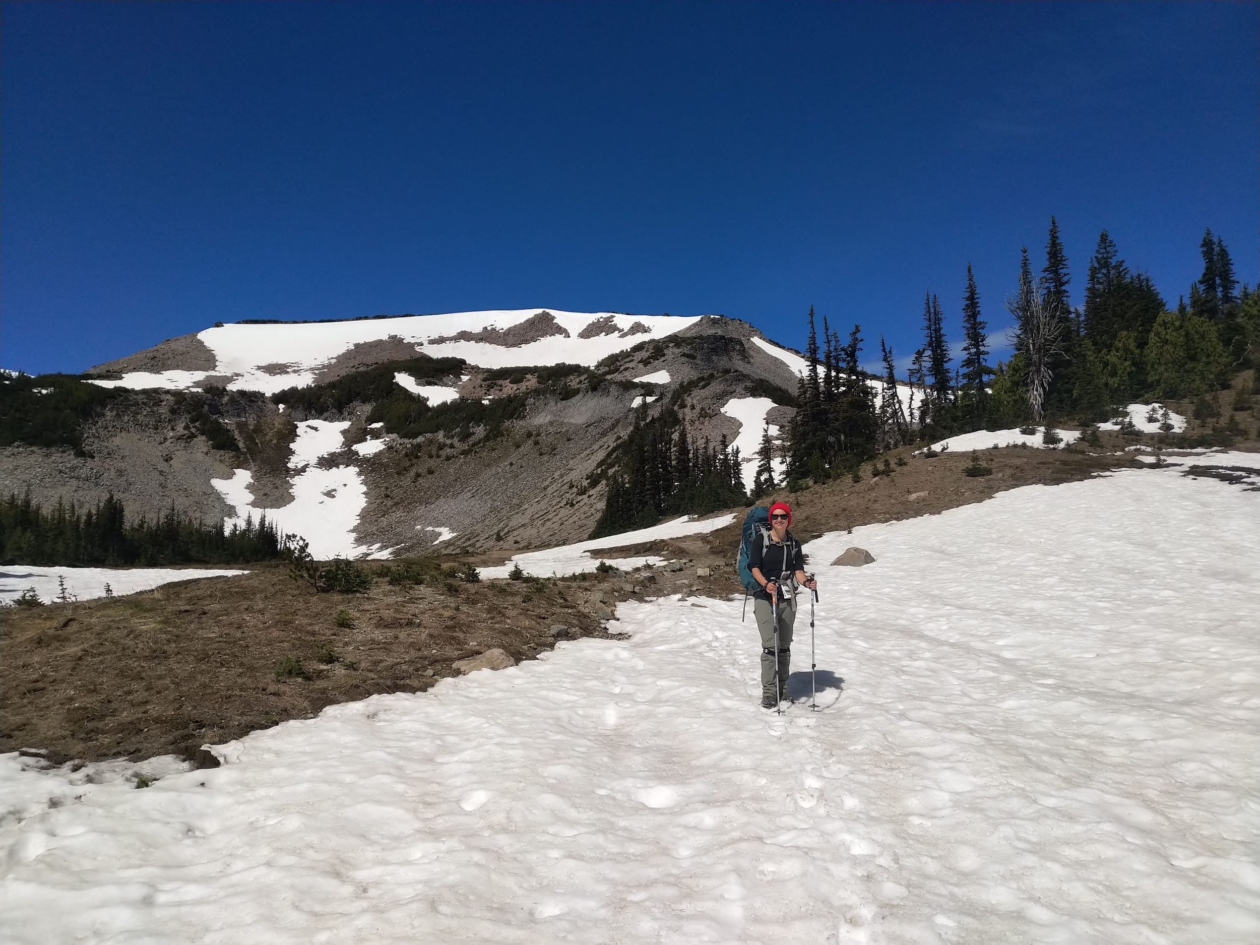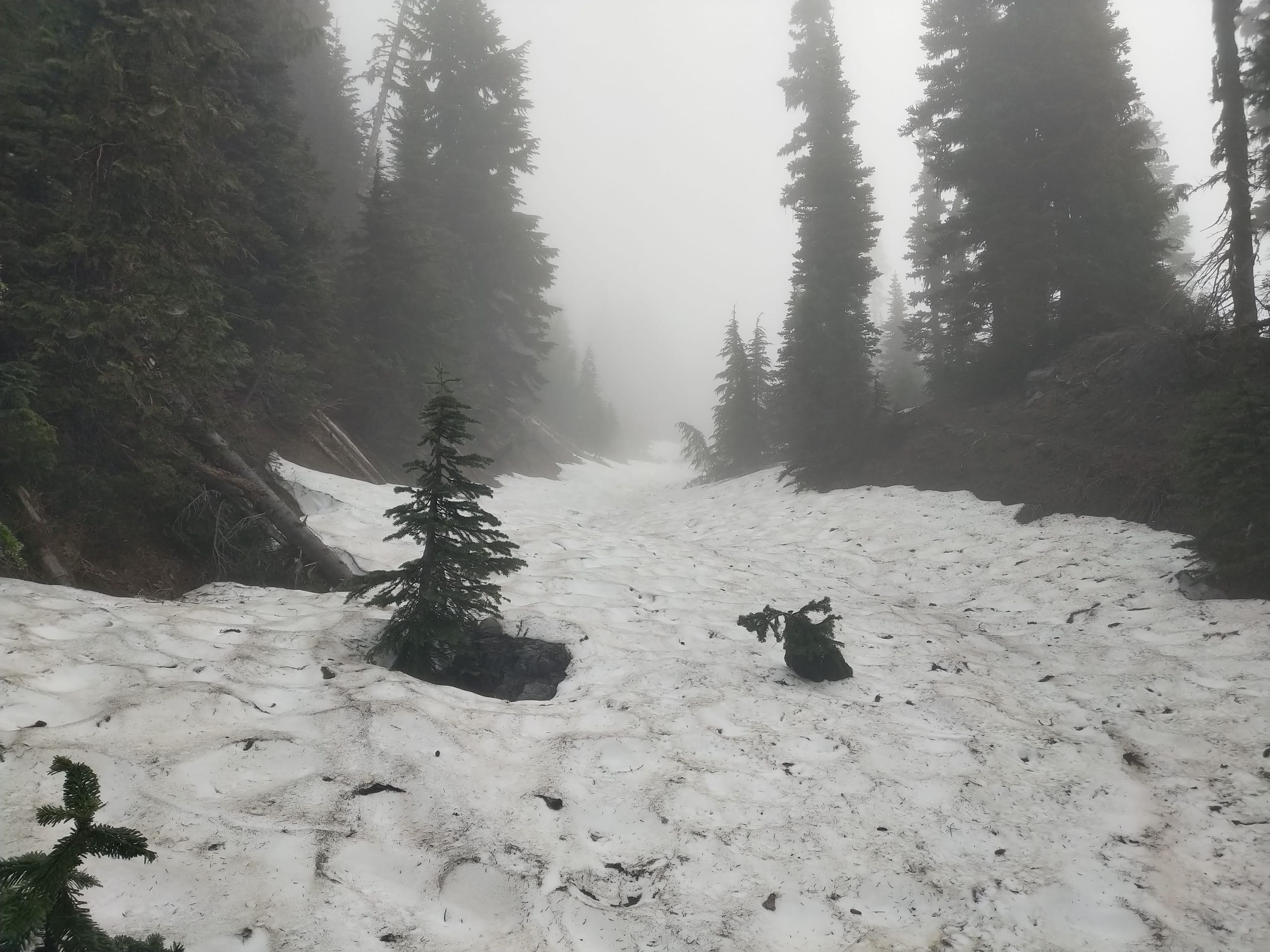 Day 6 was a bit of a lighter day at 8 miles starting off with a downhill and coming back up a long steady climb to our camp for the night. Some interesting sights like the N Puyallup brige and the approaching west-side road and some beautiful snow banks.