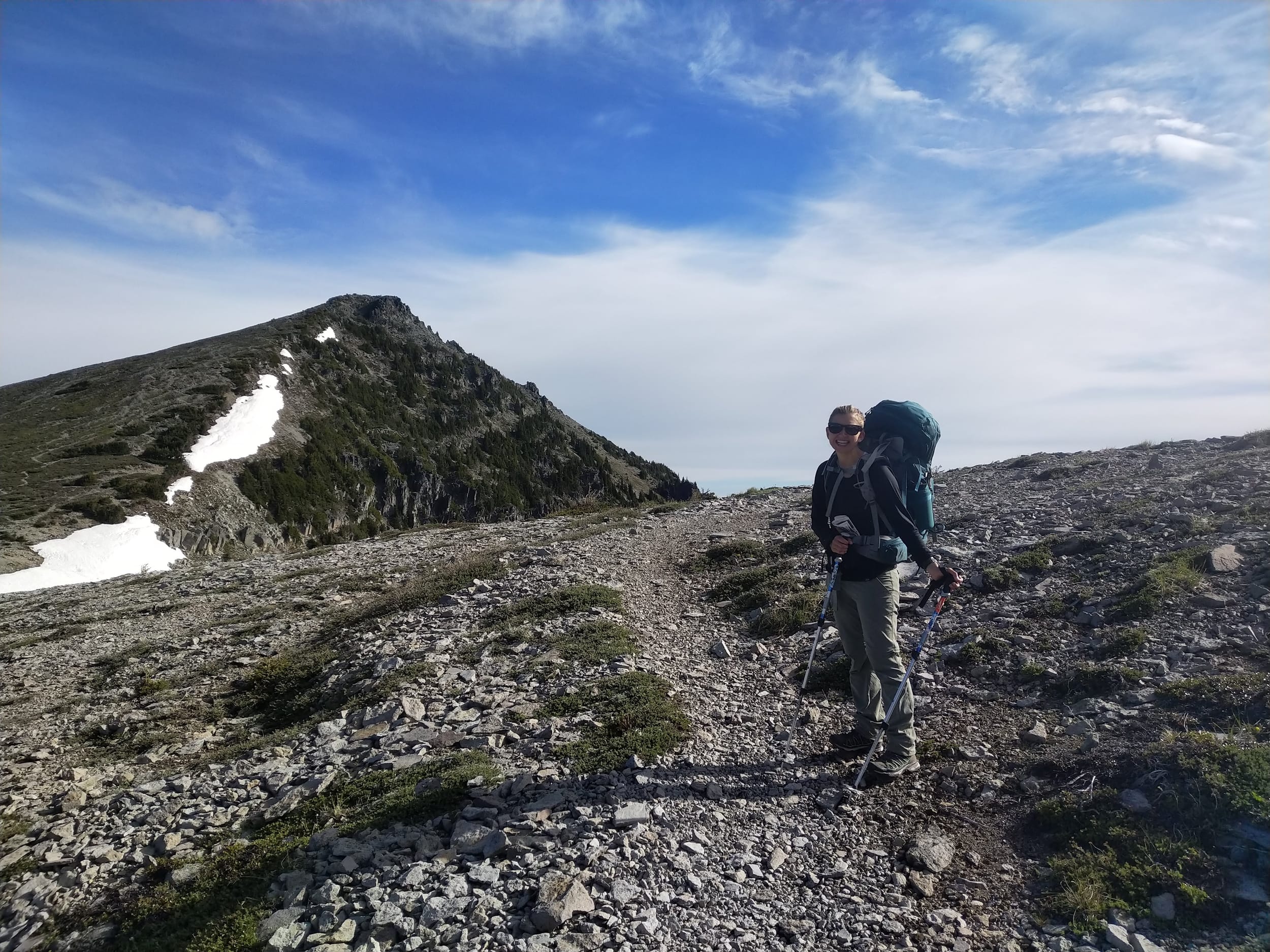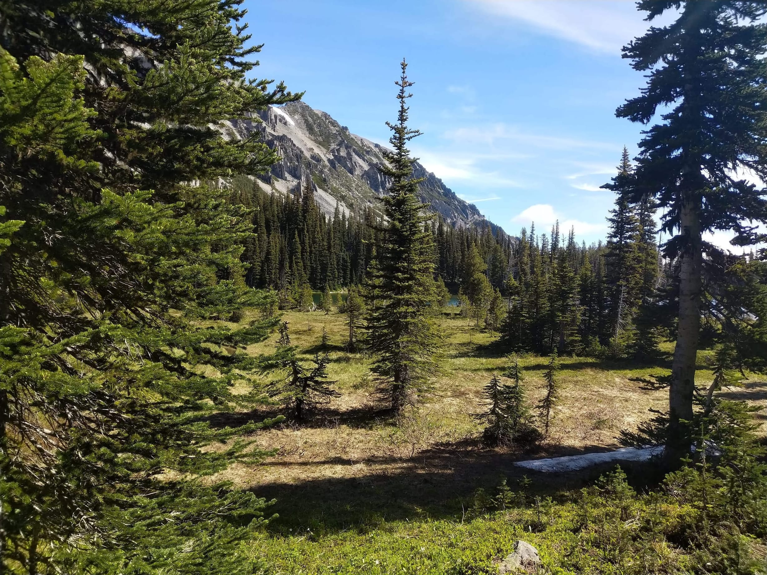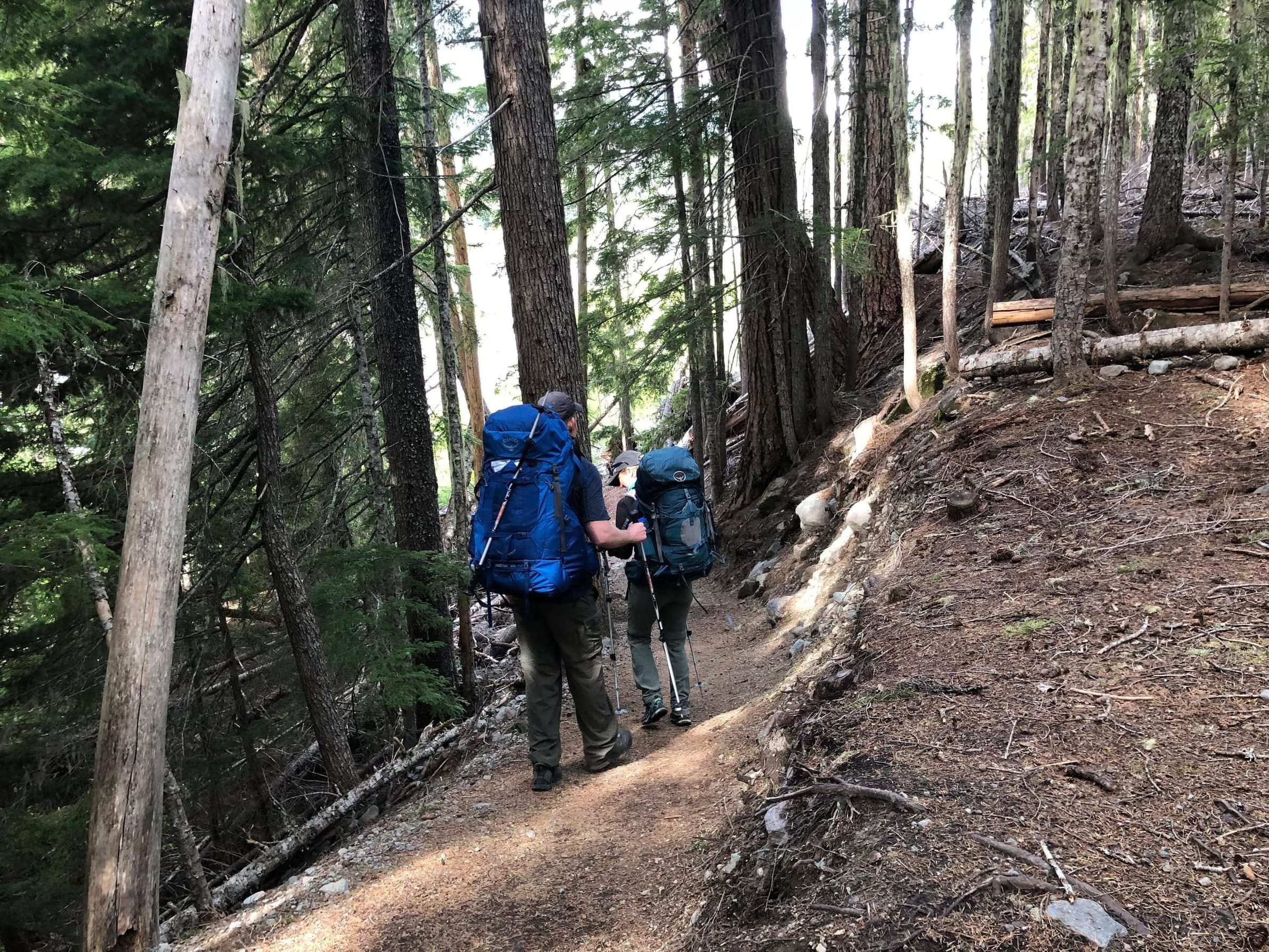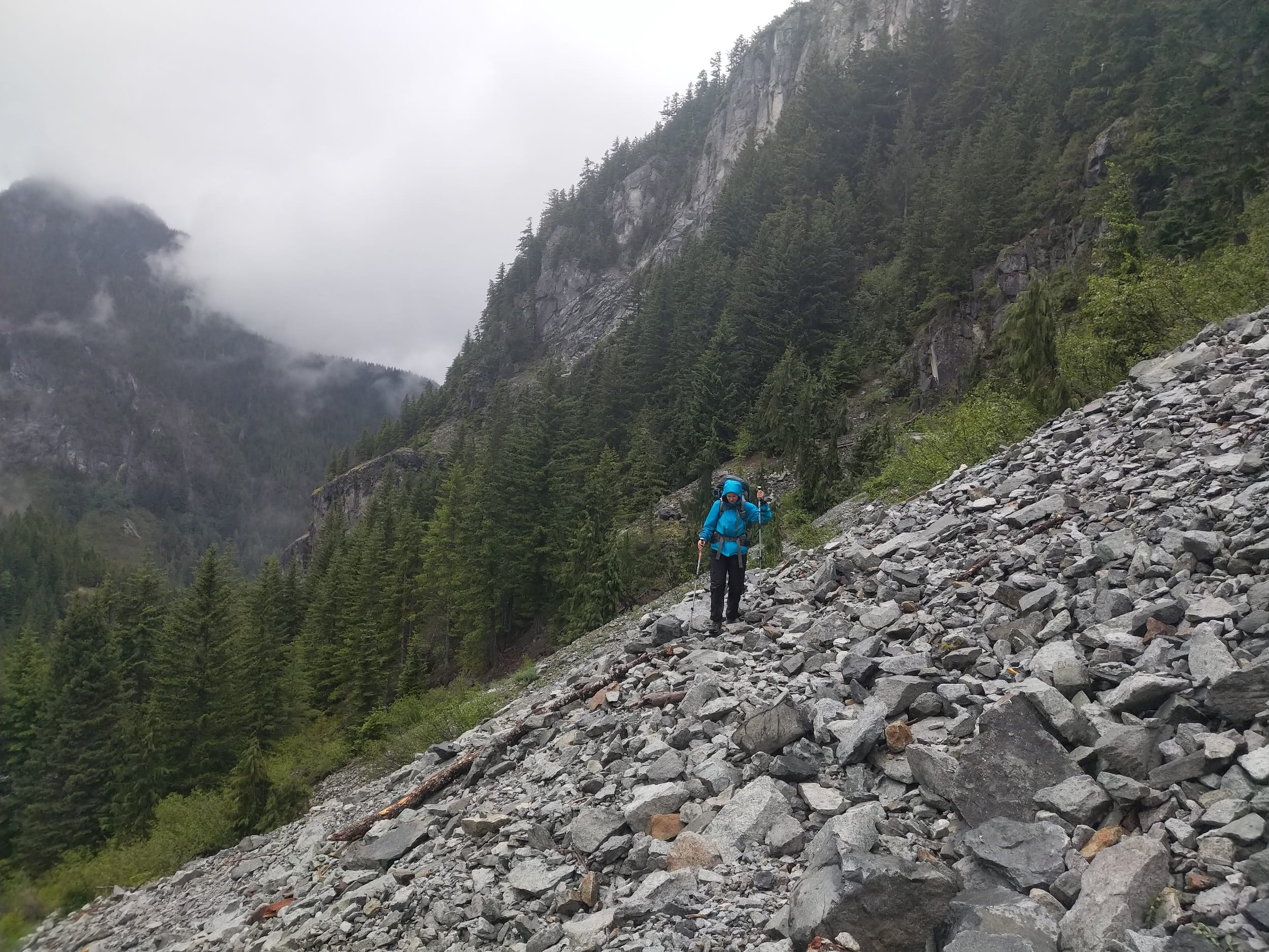 Our final day started much like the others, with a sparse forested hike crossing several streams. We hiked through a smaller glacial morraine before heading up to Skyscraper pass and into the Lodi creek meadow. There was a gentle climb that became a bit steeper the first part of the day before we crested the hill.