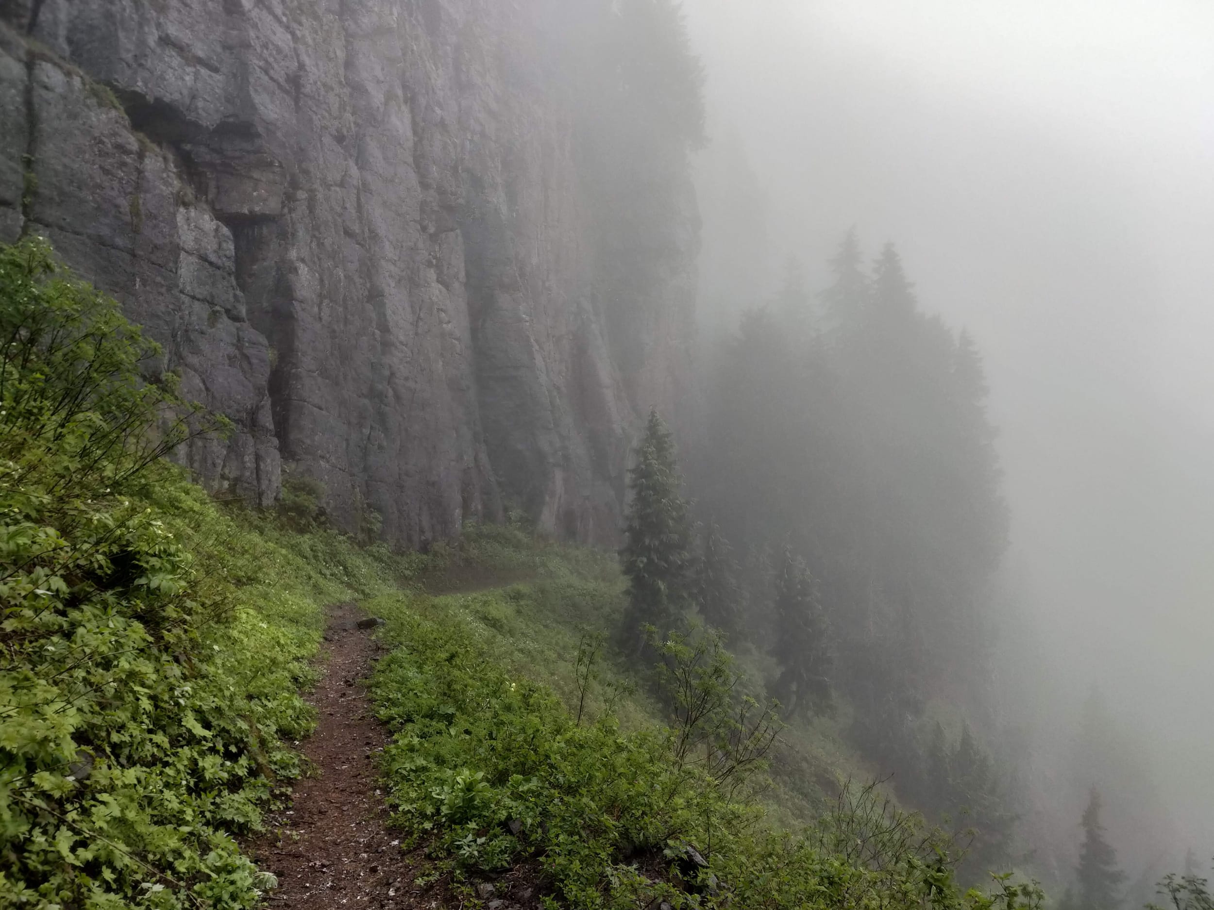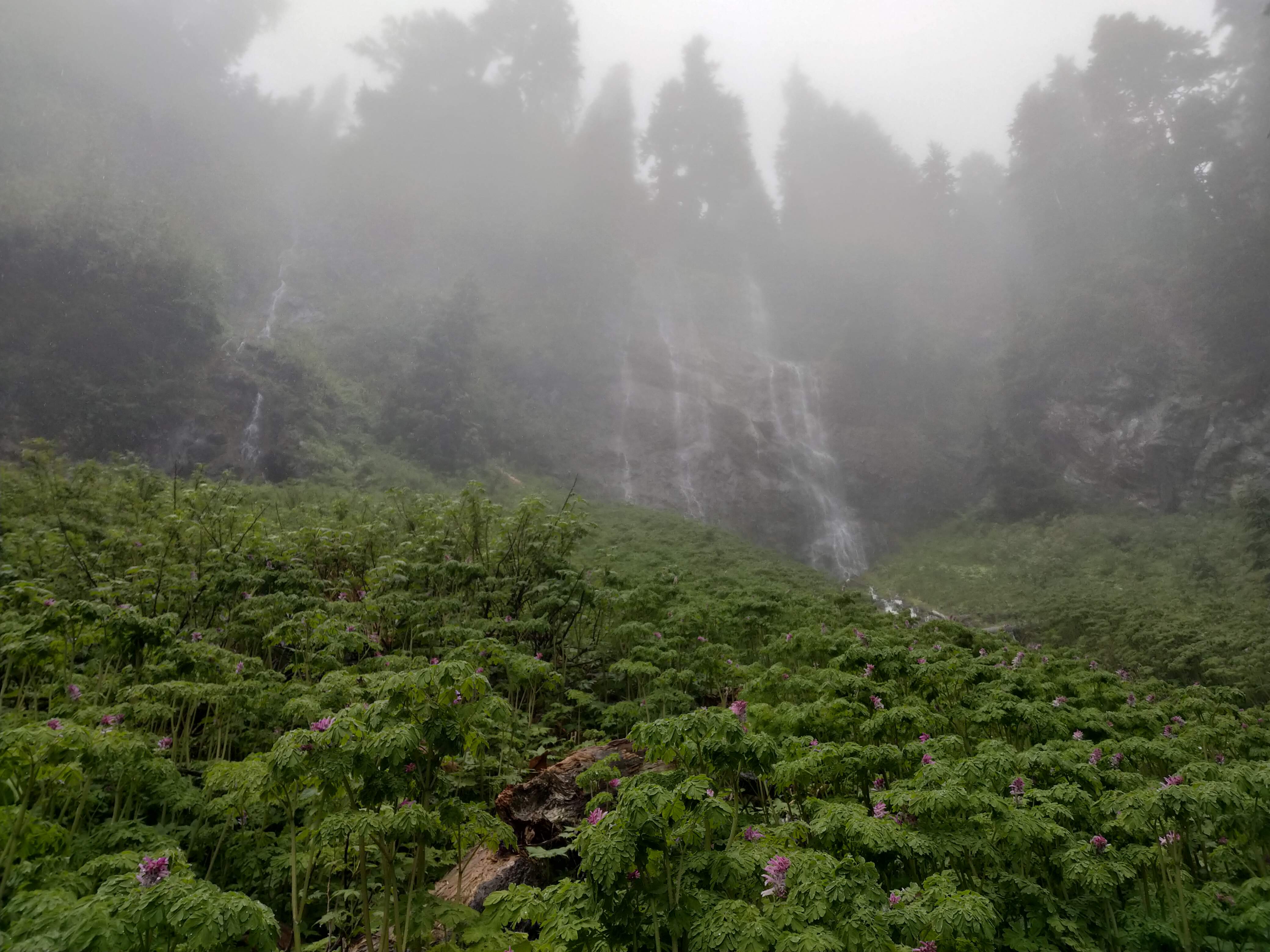 After Passing over the suspension bridge, we had a long hike up to Emerald ridge pass. This was a particularly stressful section as we pass over steep snow moving laterally to the face. We had to move away from the trail several times to find a better route that wasn’t as exposed as we crossed the often very slippery snow. When we arrived at the pass, we found marmots & high alpine flora for a totally different feeling that the bridge and lowlands that we just crossed. There was a big fog rolling in just as we walked over the ridge, making for an erie experience.