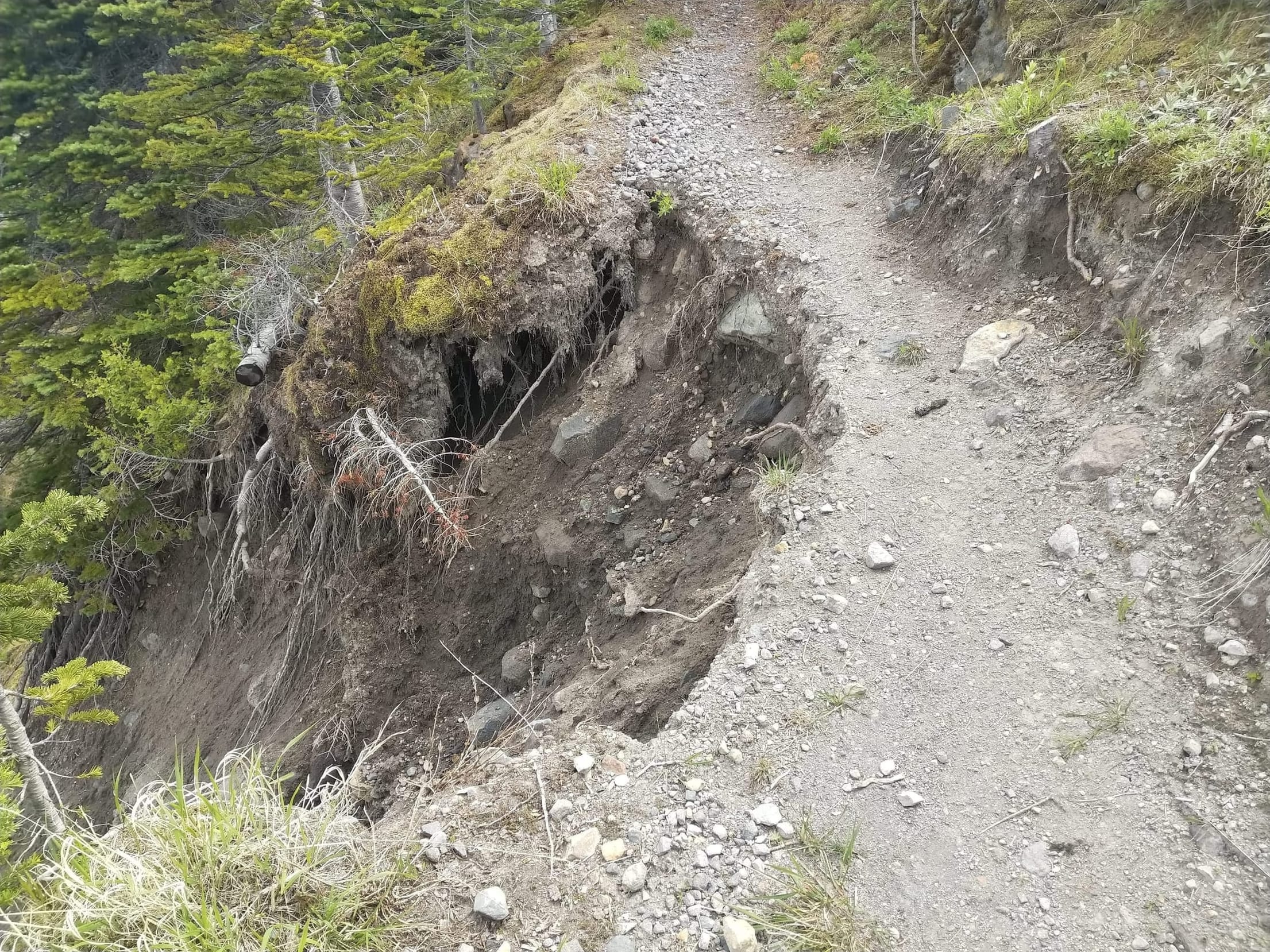 Day 10 finished up our hike through the Sunrise area and back down into White river. Aside from some gentle uphill to start the day, the trail was mostly flat acros a gentle plateau before dropping steeply into white river. We took a slight detour to the sunrise tourist site (and buildings) and saw workers getting the buildings ready for the season.