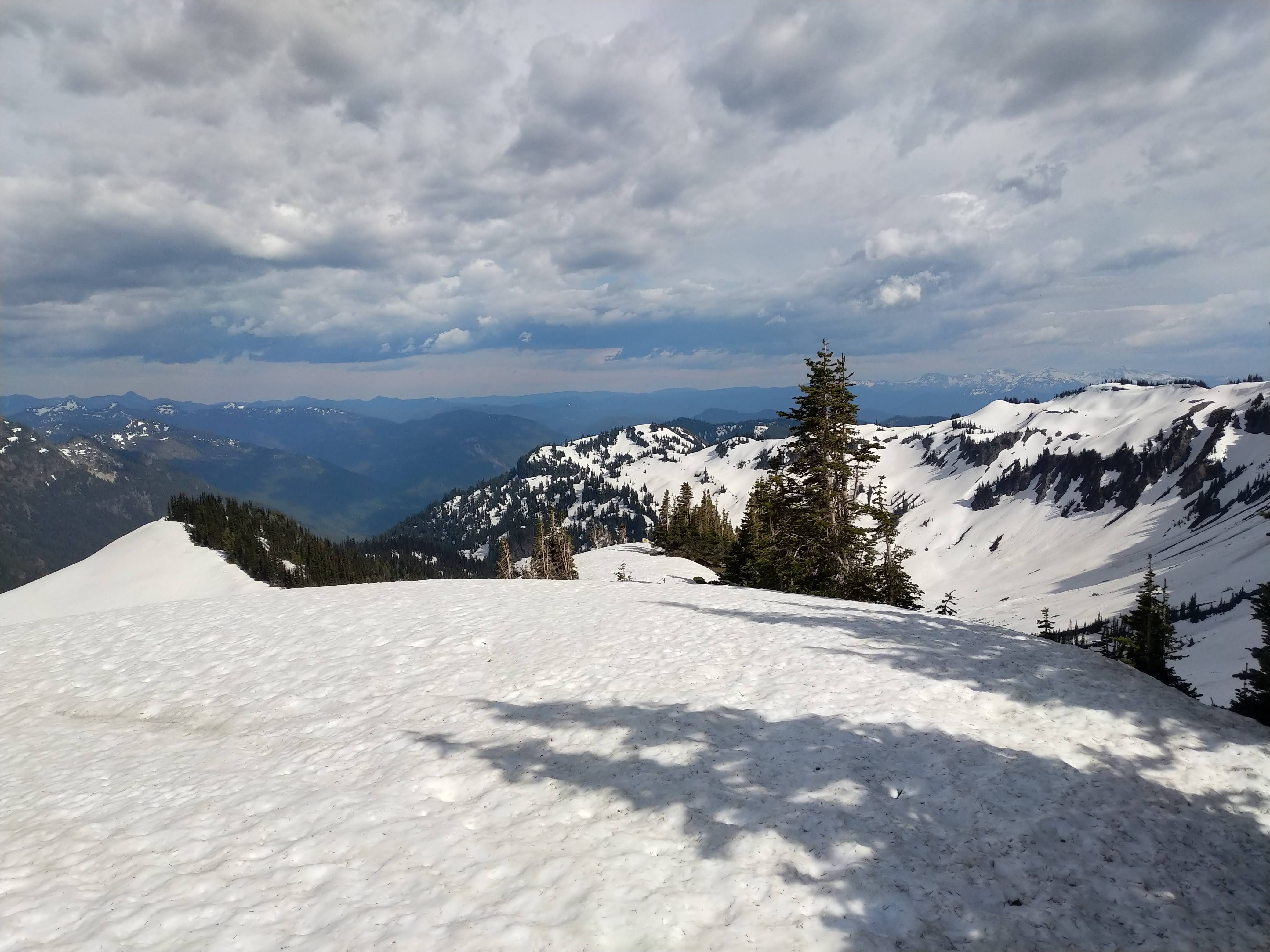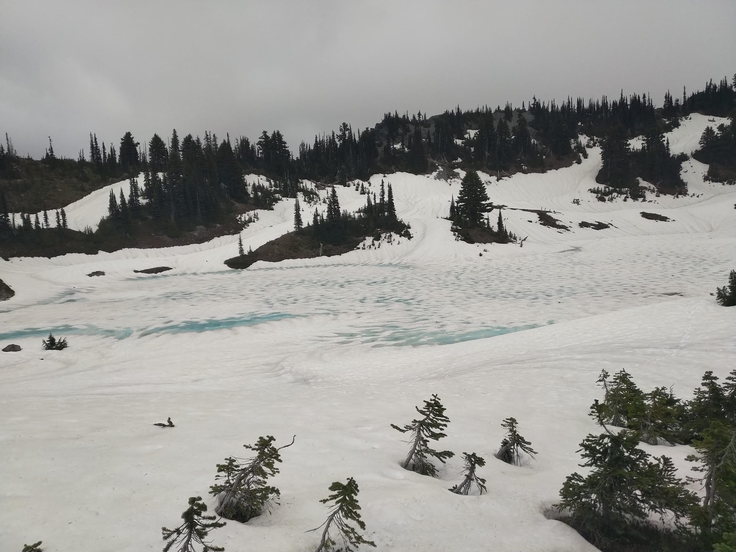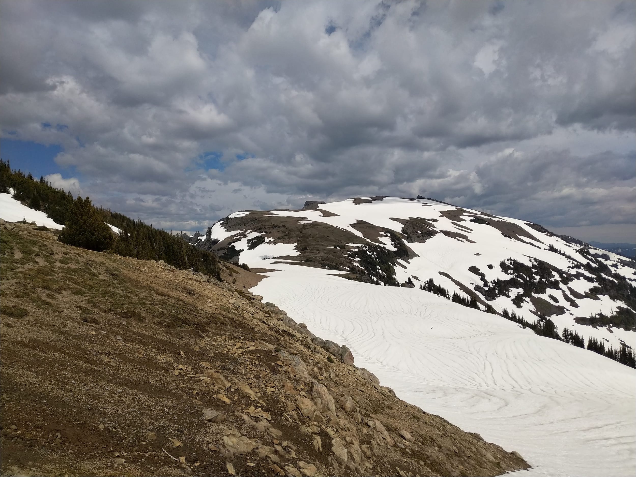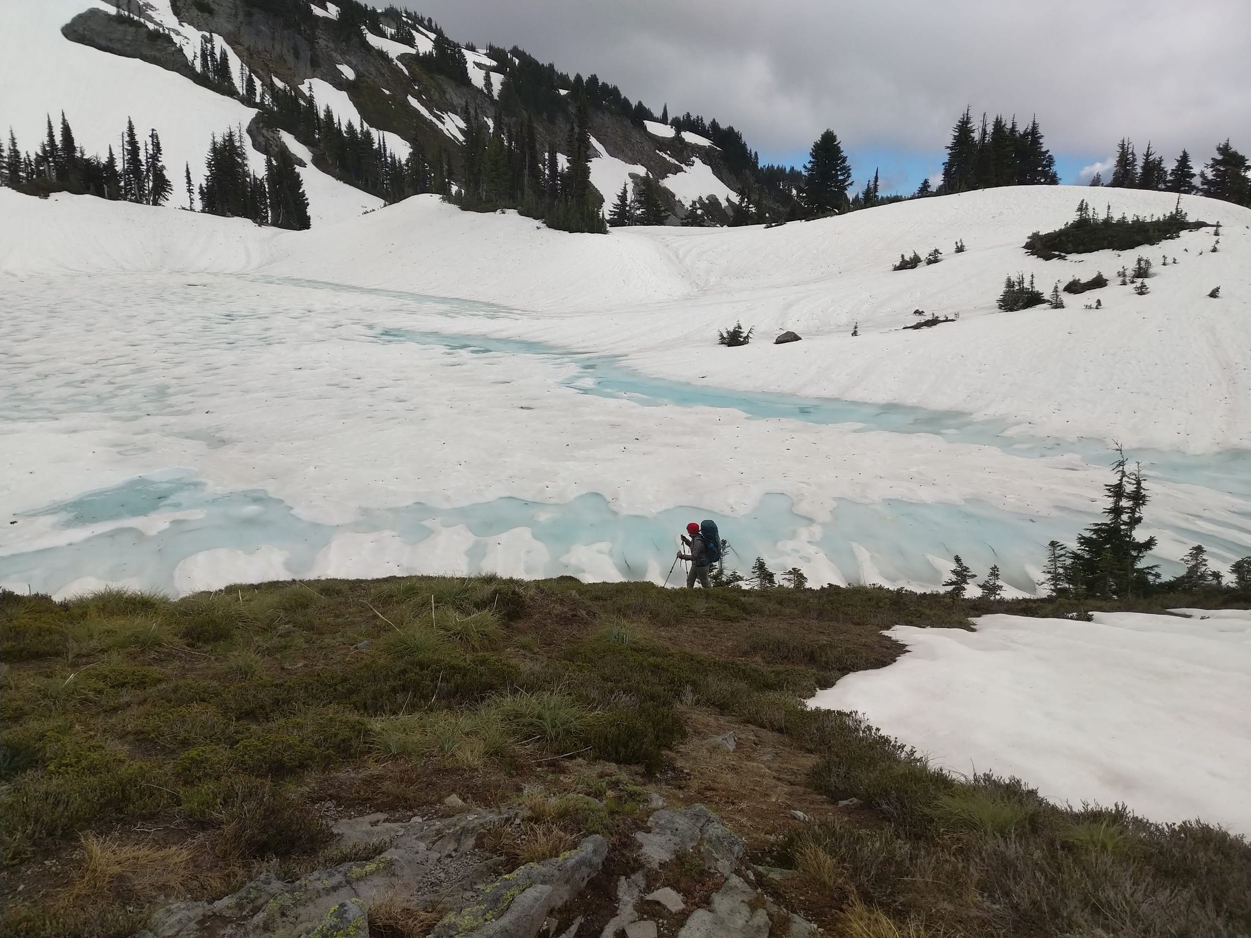Continuing from frozen lake, we headed down to sunrise lake - where we were slowing introduced back into society, seeing more and more people and more infrastructure (flushing toilets!?!). We continued along the ridge until we found the sunrise overlook - with some larger buildings, helicopter, and maintenance people getting ready for the summer. From here, we dropped down some steep switchbacks into white river - our final (and starting) destination.