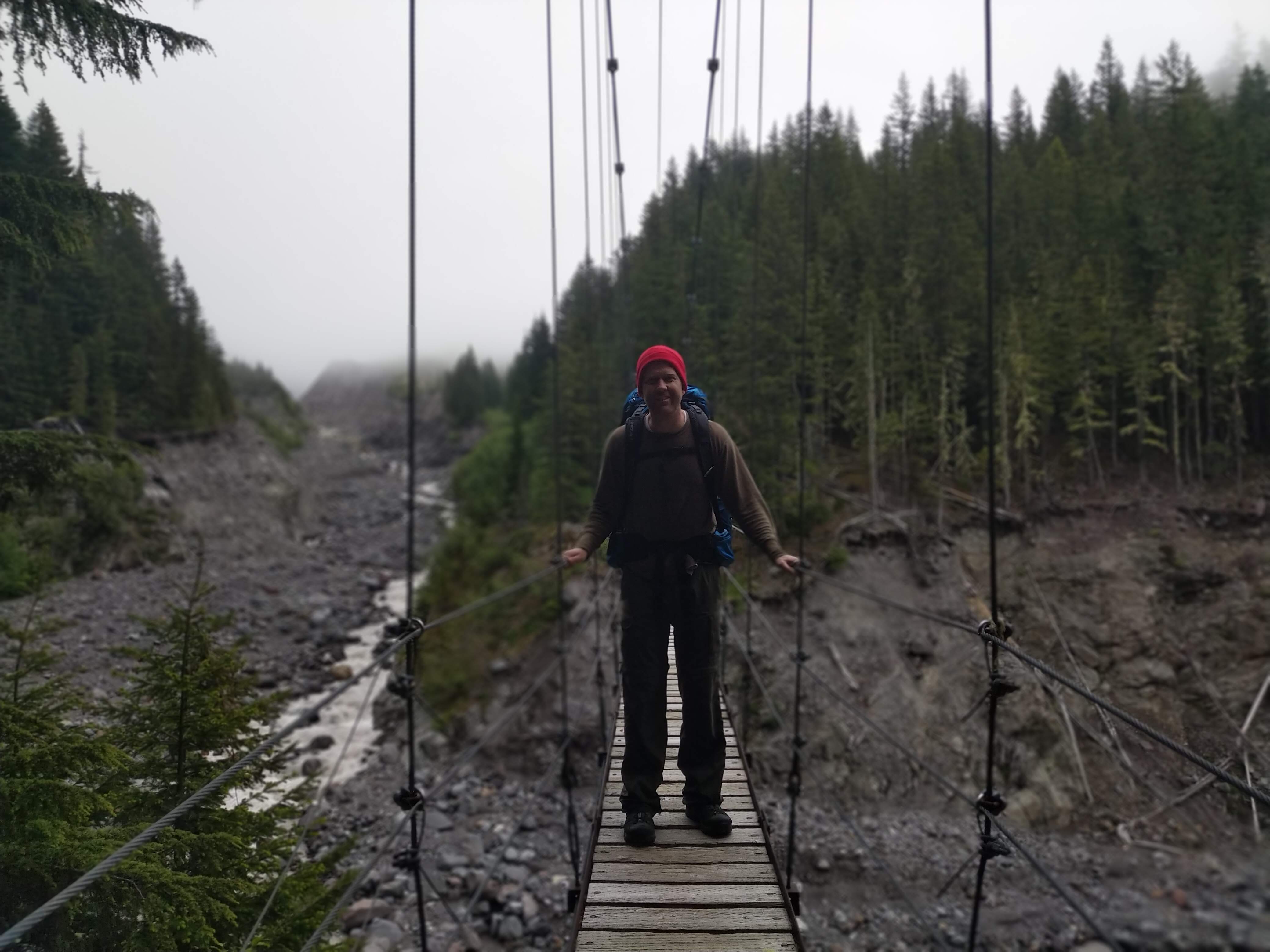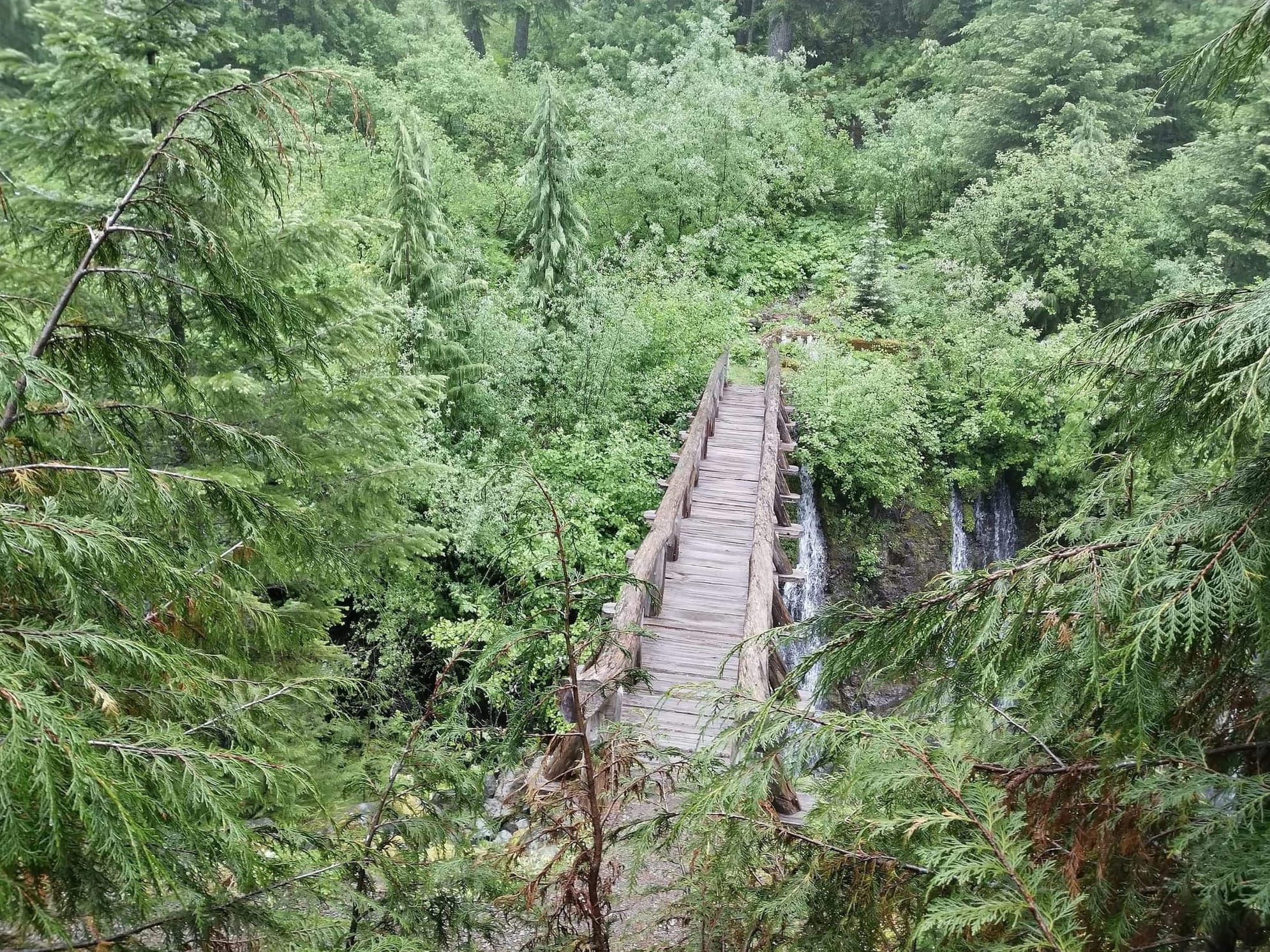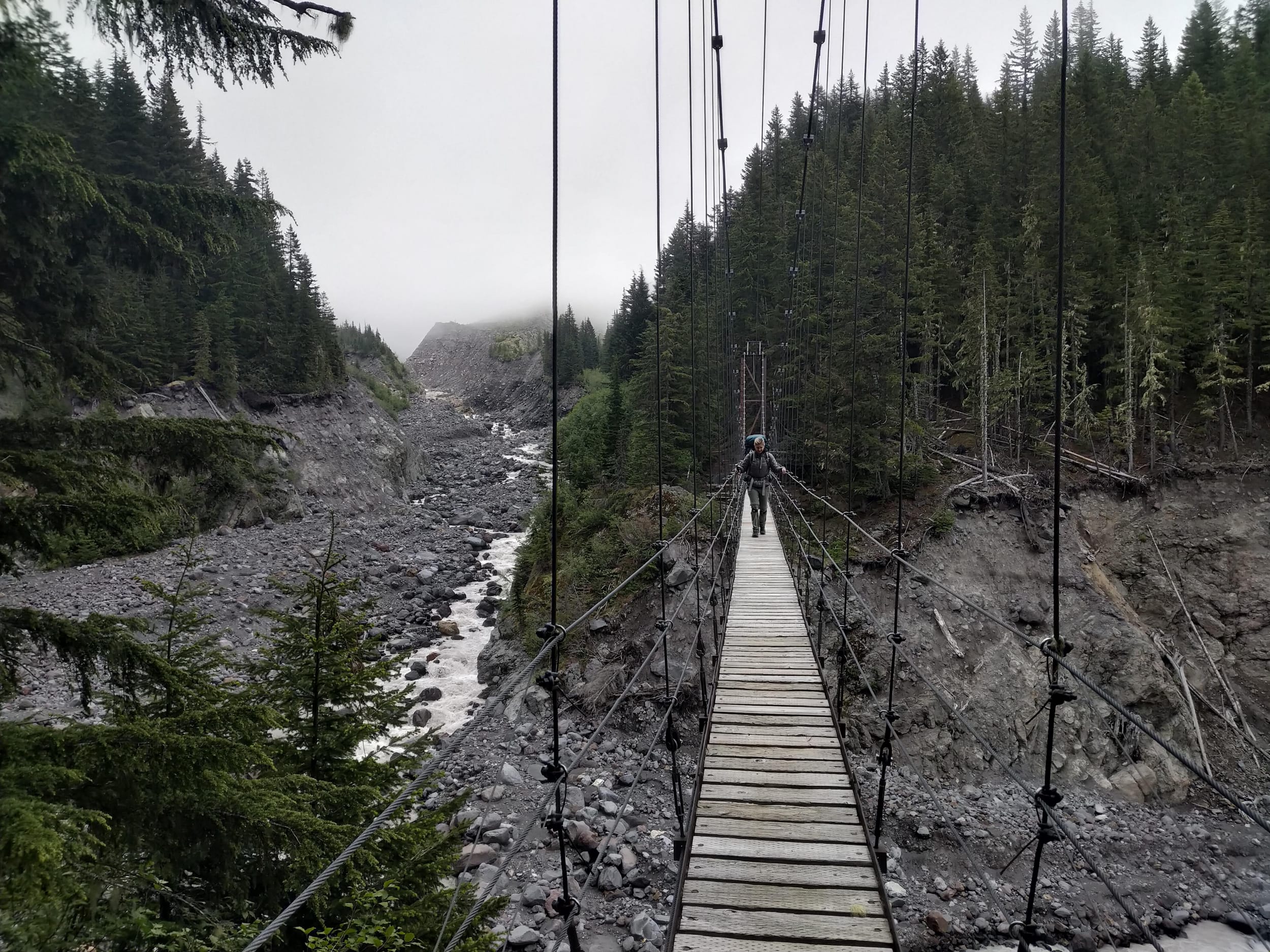 The Tahoma suspension bridge is a foot bridge that extends over Tahoma Creek. It’s quite impressive given it’s location - at over 200 feet long and 165 feet high, it’s the largest of the two suspension bridges along the wonderland trail. The closest road is 6.5 miles away - so quite a hike just to get to it (even if you aren’t doing the wonderland trail). I’ve looked all over to see if I could find the history of the bridge, but I haven’t found much. It sounds like it was built around 1995 and it replaced a drooping catwalk-style suspension bridge that was anchored on different foundations (which we didn’t see, but apparently are still there further down the canyon).