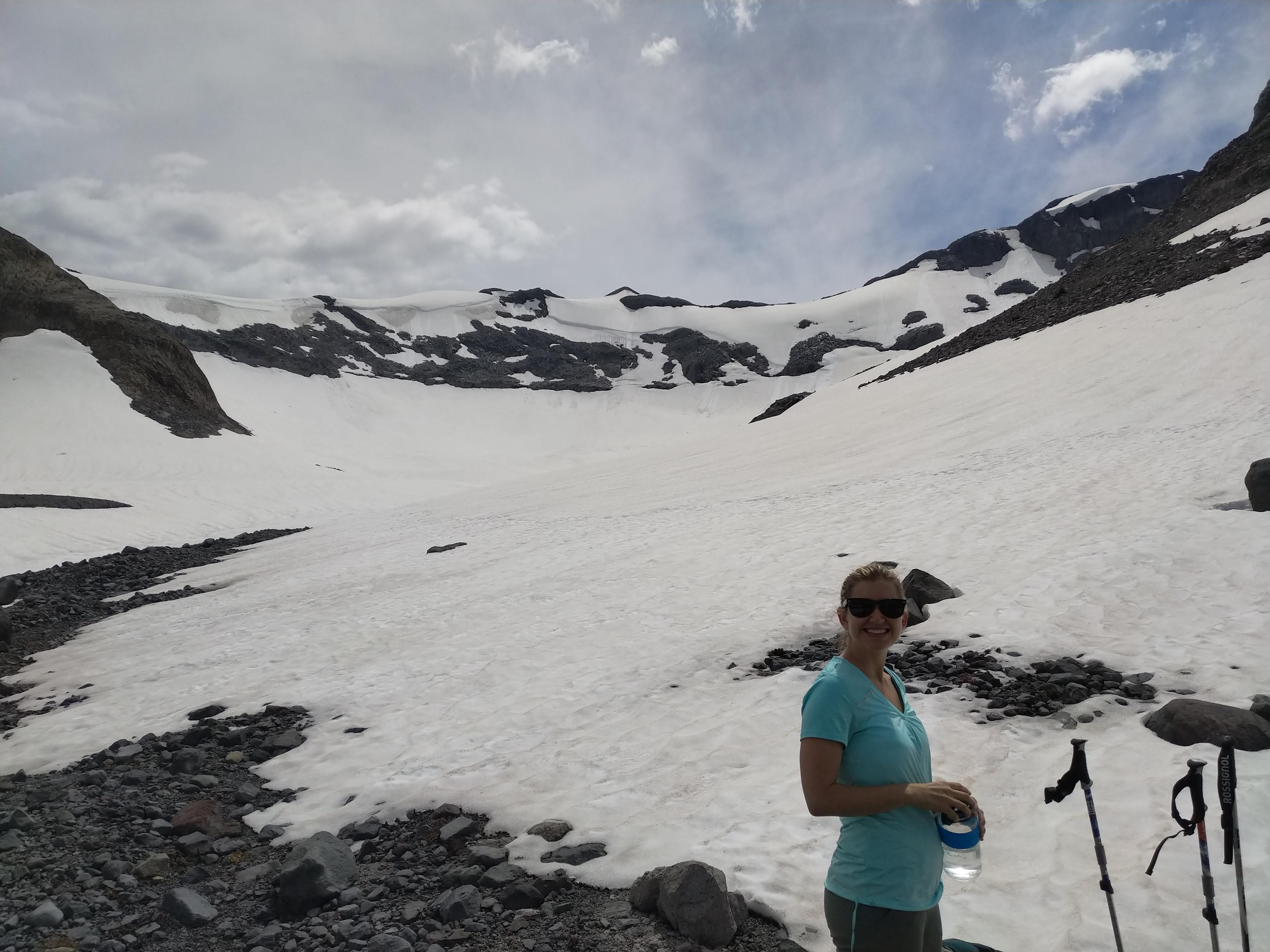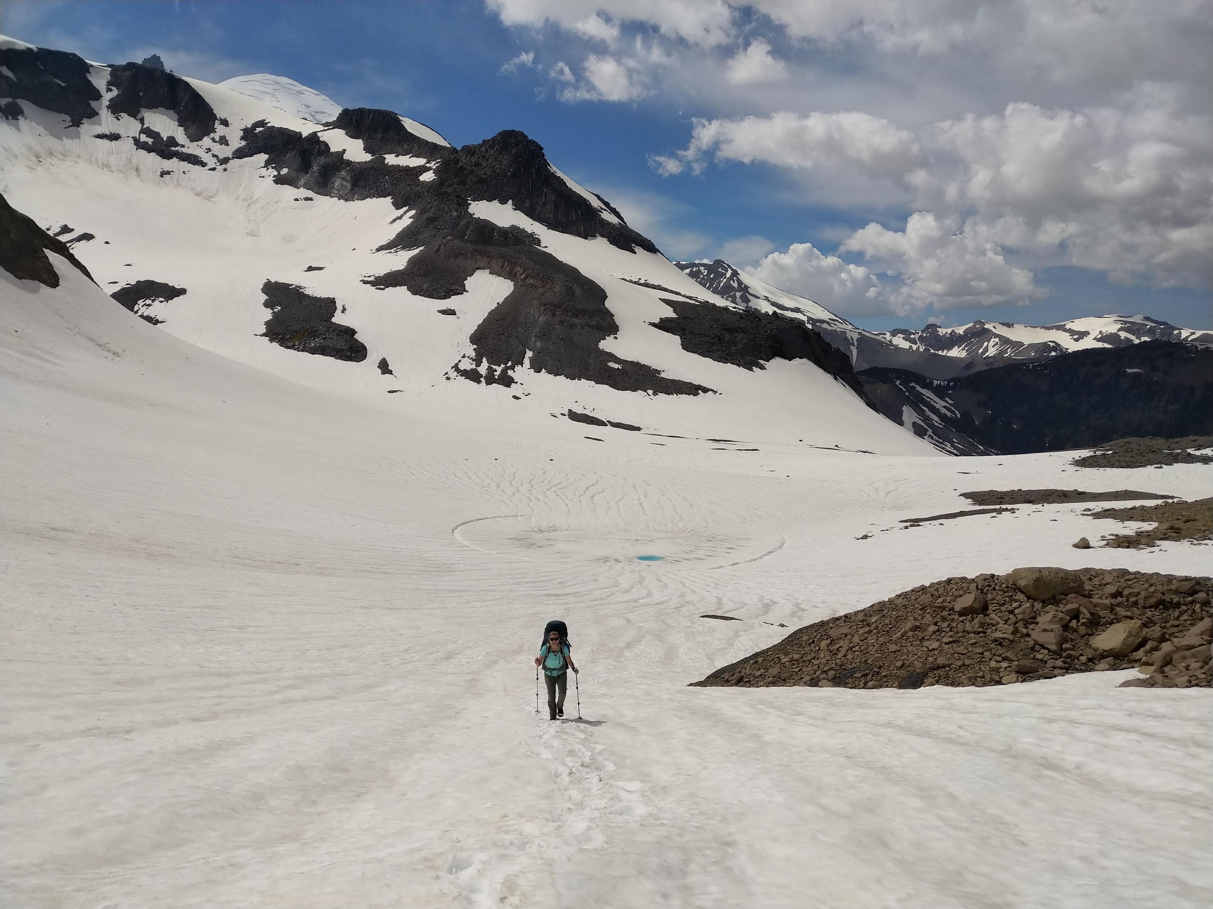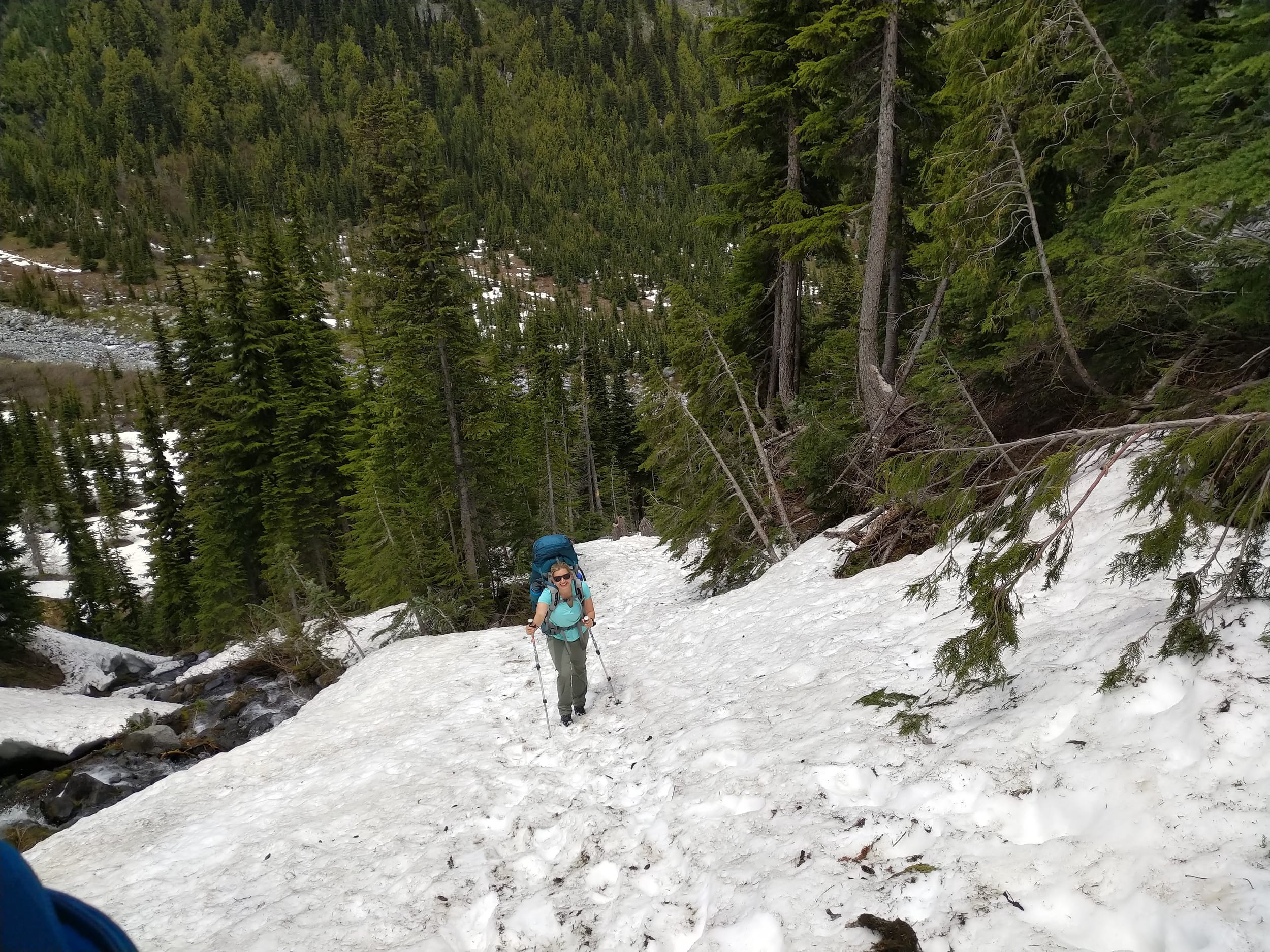 We started off the day hiking through some large snow backs - I got a great picture of Angela hiking across just below a massive snow field. The first quarter of the day was a steep downhill out of the snow and down into the N Puyallup river valley.